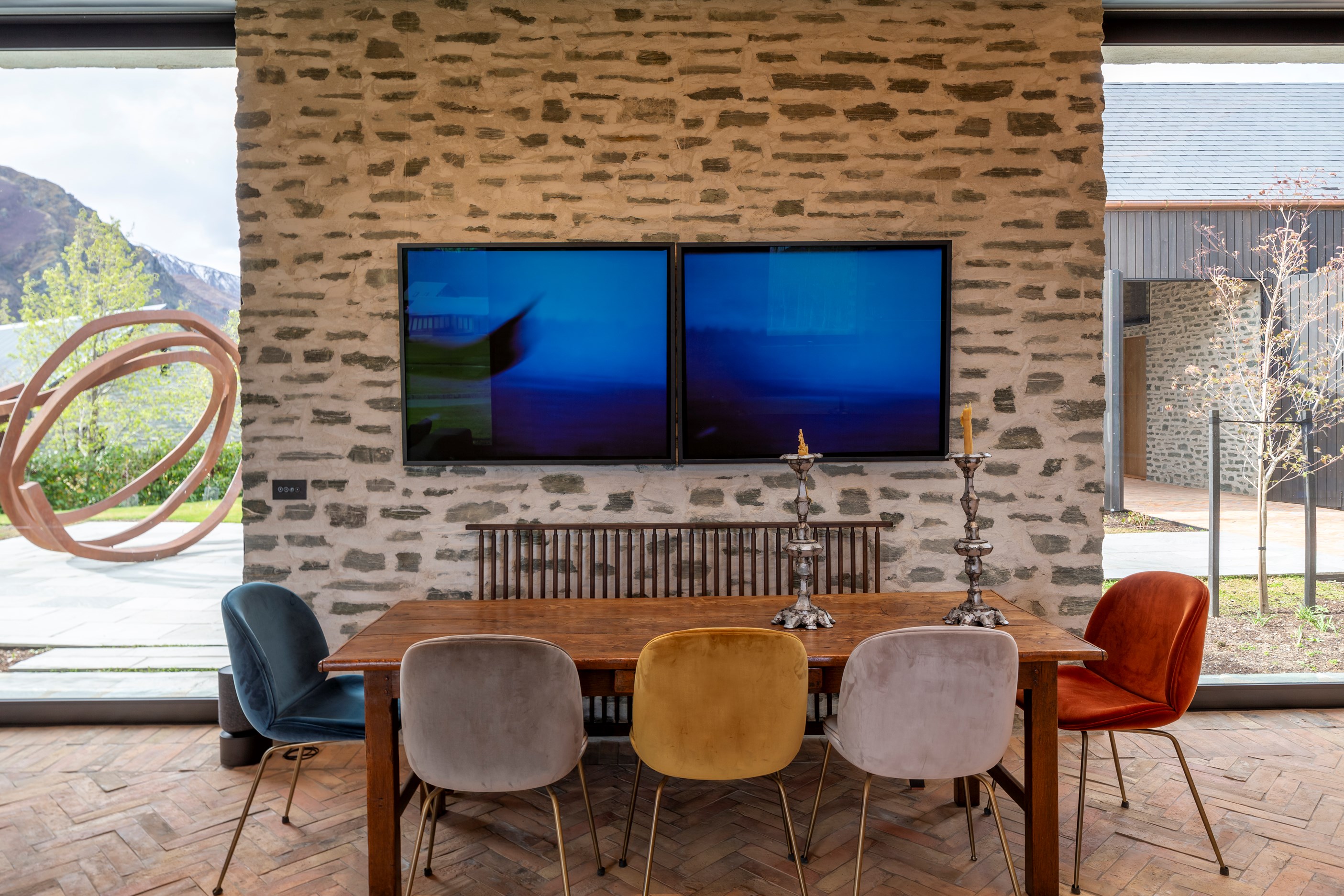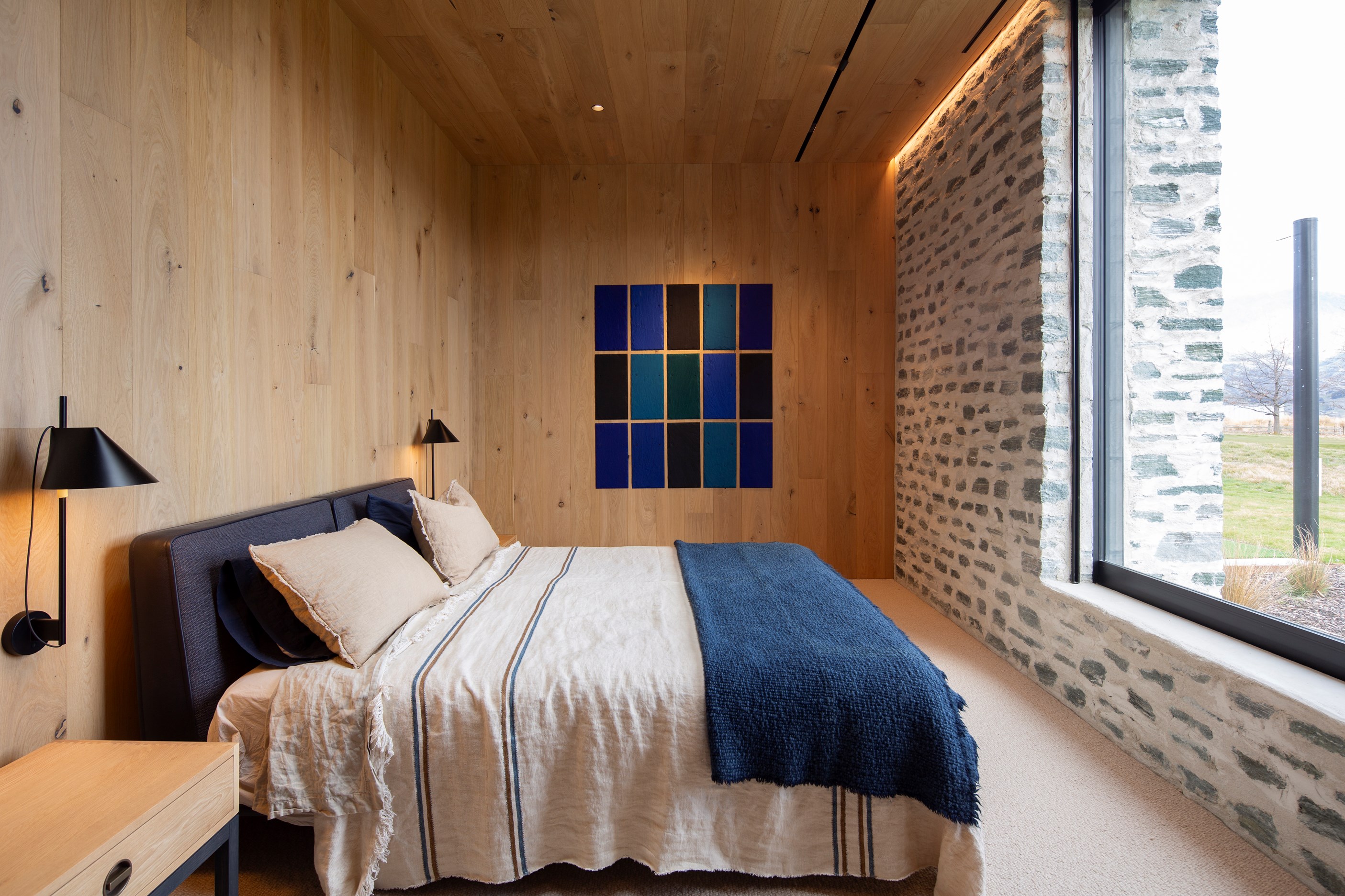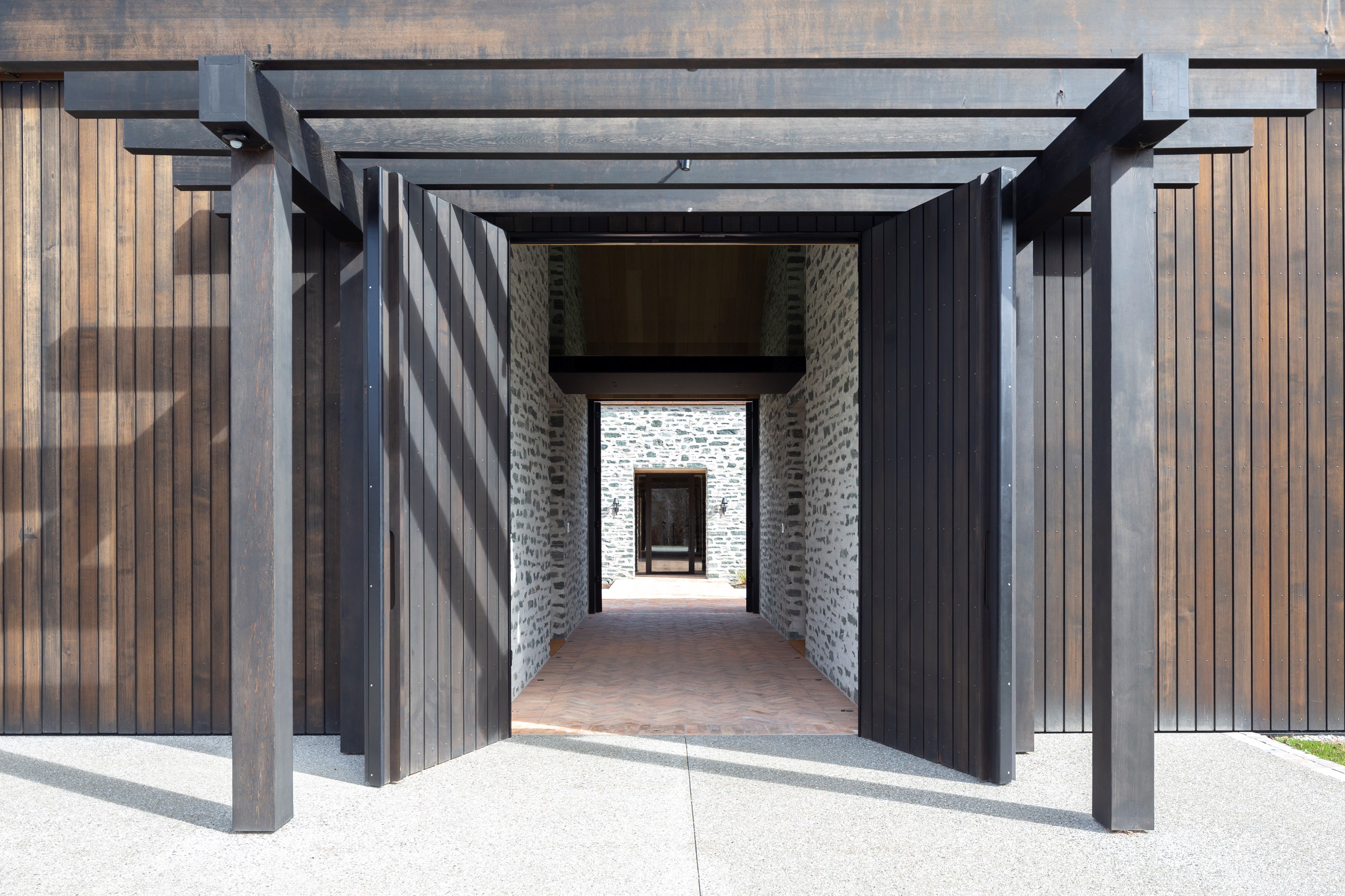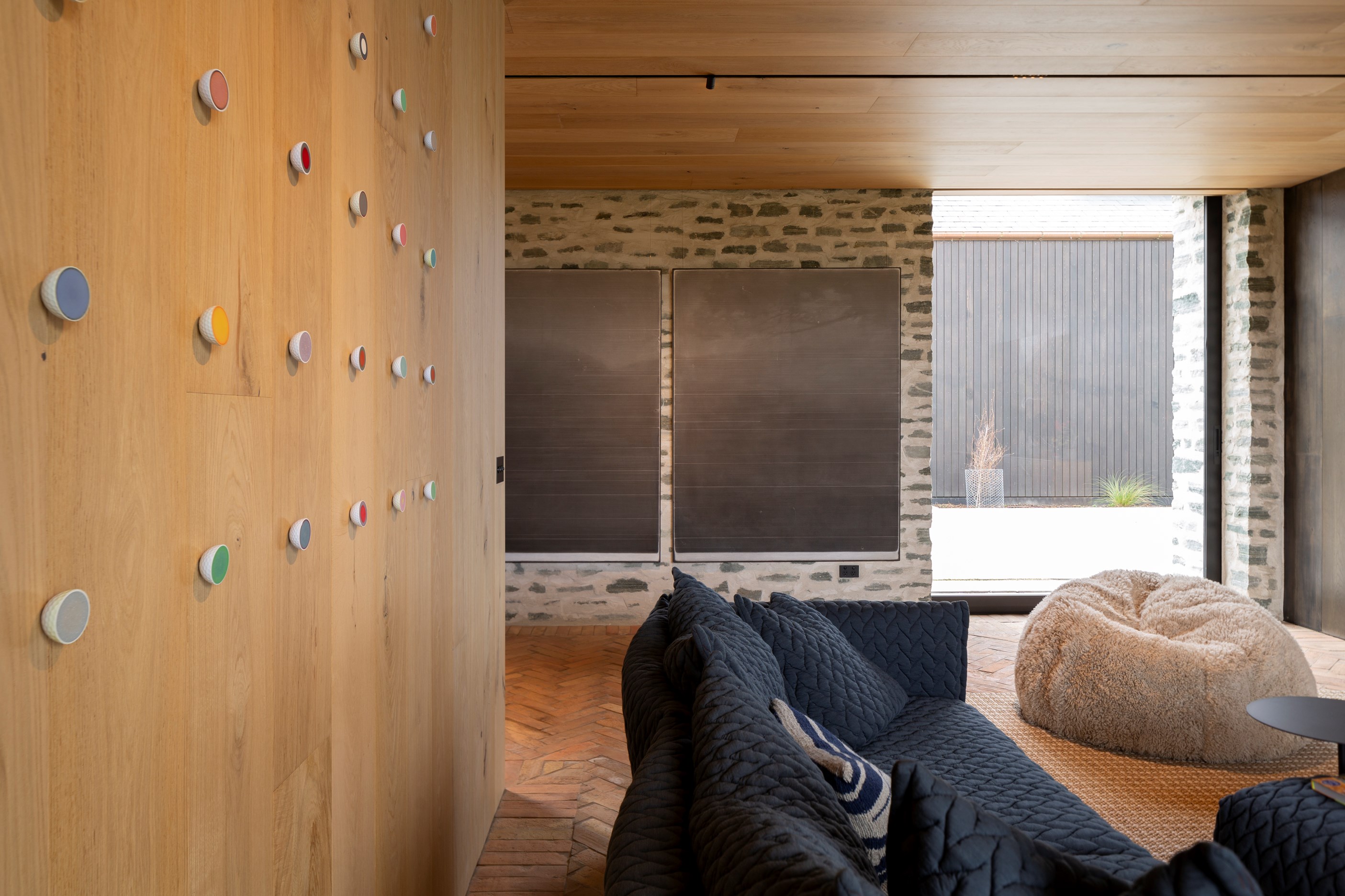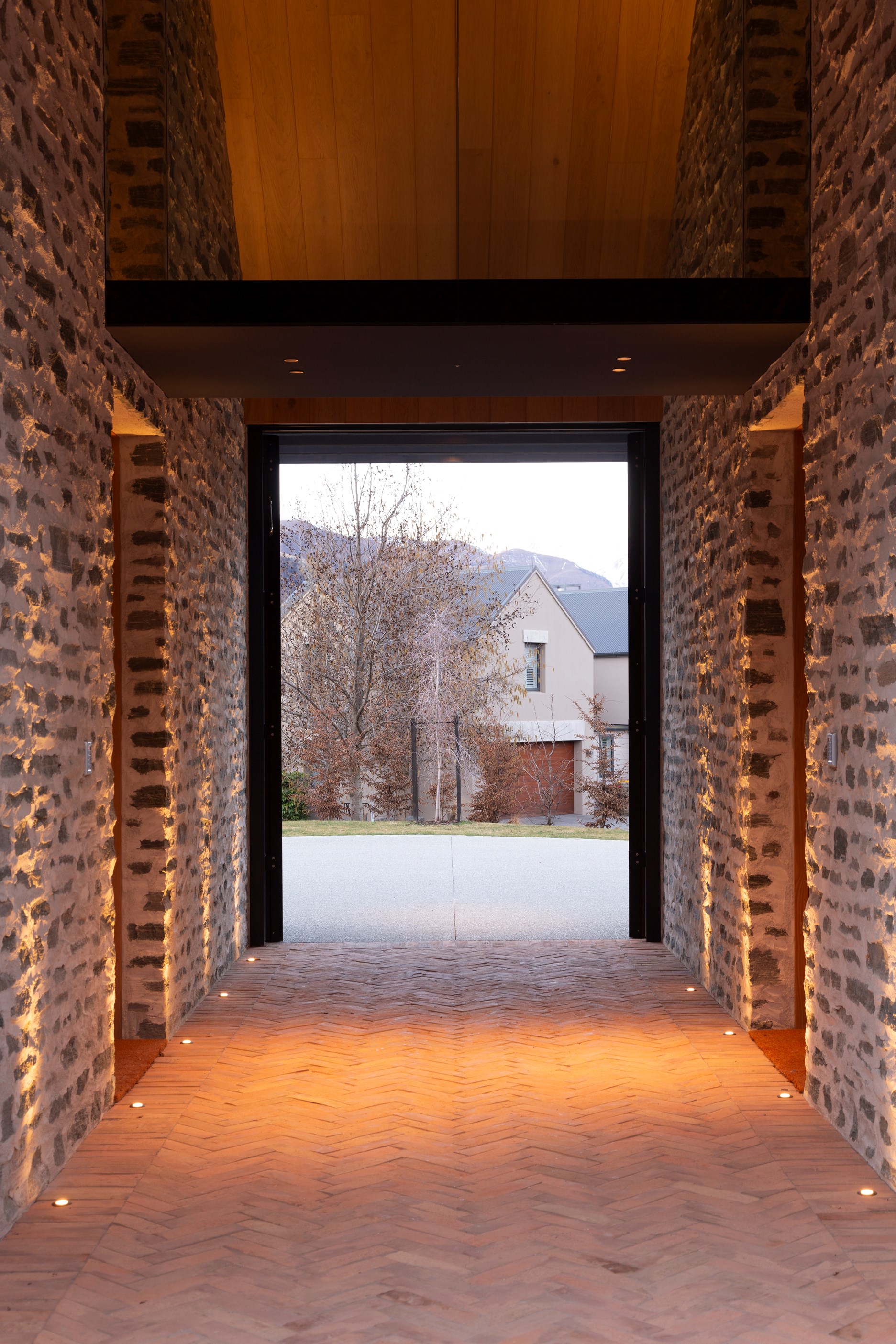 The simple barn form never looked so good. This Patterson Associates Architects-designed holiday home speaks the Central Otago language of stone and timber. The vernacular of The Gatehouse is expressed in two barn-like structures, one clad in local schist, the other in timber – wholly appropriate for a property on a former sheep station. The brief was to deliver a flexible home for family and guests, which is not as simple as it sounds. Sometimes it has to accommodate lots of people in various stages of their lives; at others, it has to be comfortable for just two. Flexibility was key to the configuration. Still,there was plenty of room to work with – 661sqm, in fact. The timber, slightly smaller of the two pavillions sits on the street side of the site and has bedrooms, bathrooms, a kitchen, living spaces and a garage. Across the courtyard and linked by a gallery is the stone pavillion, with bedrooms, a large open-plan kitchen, dining and living area.
