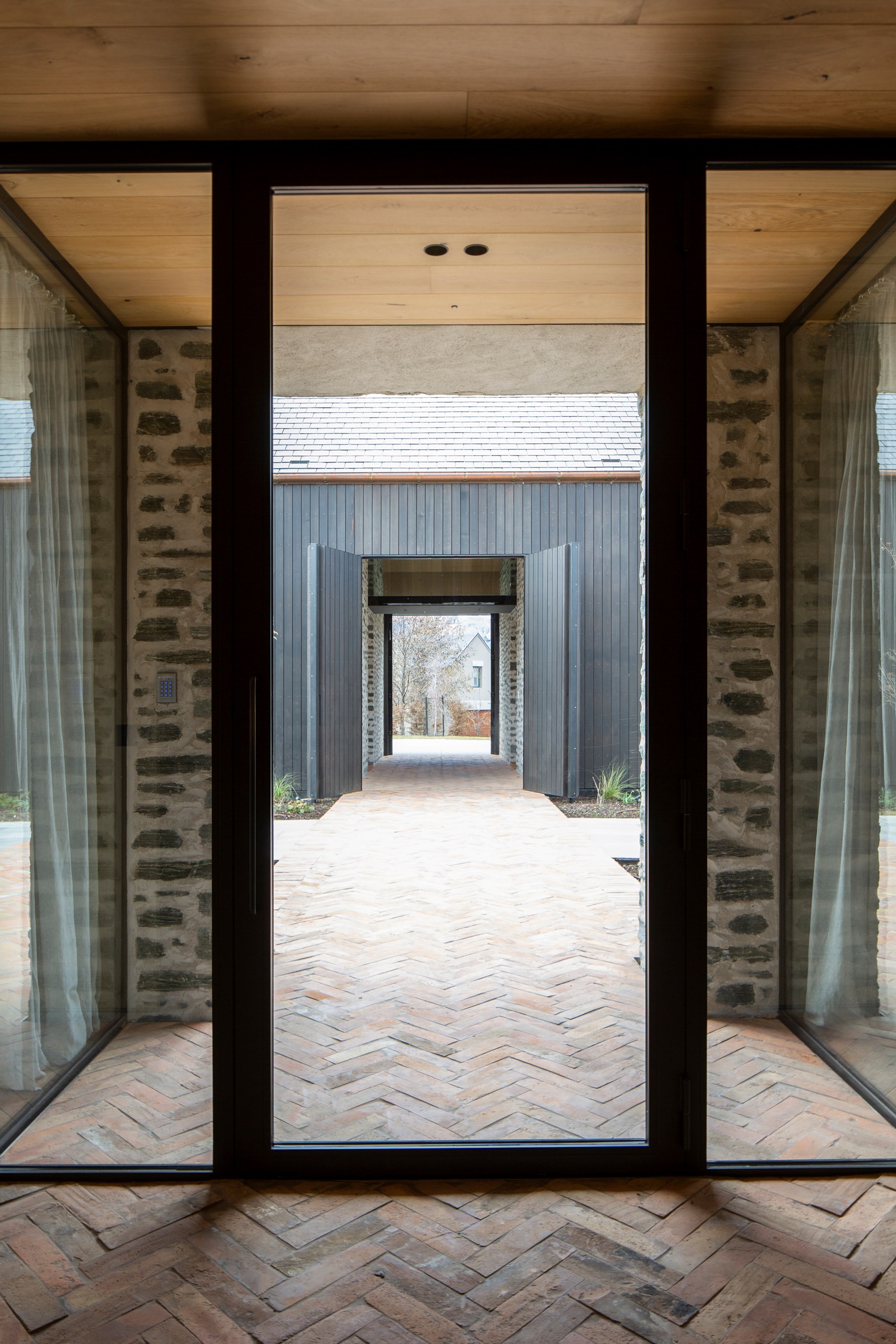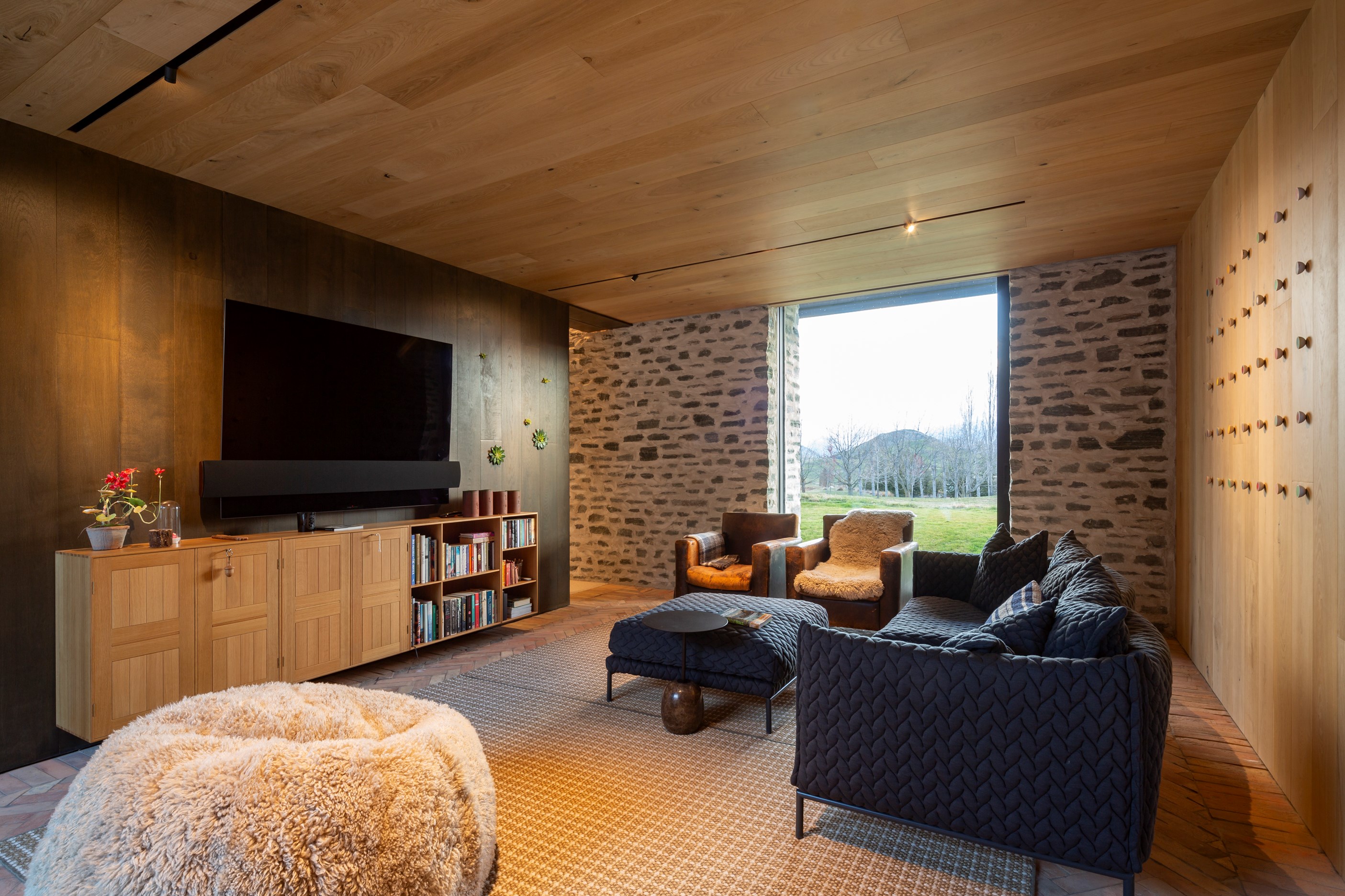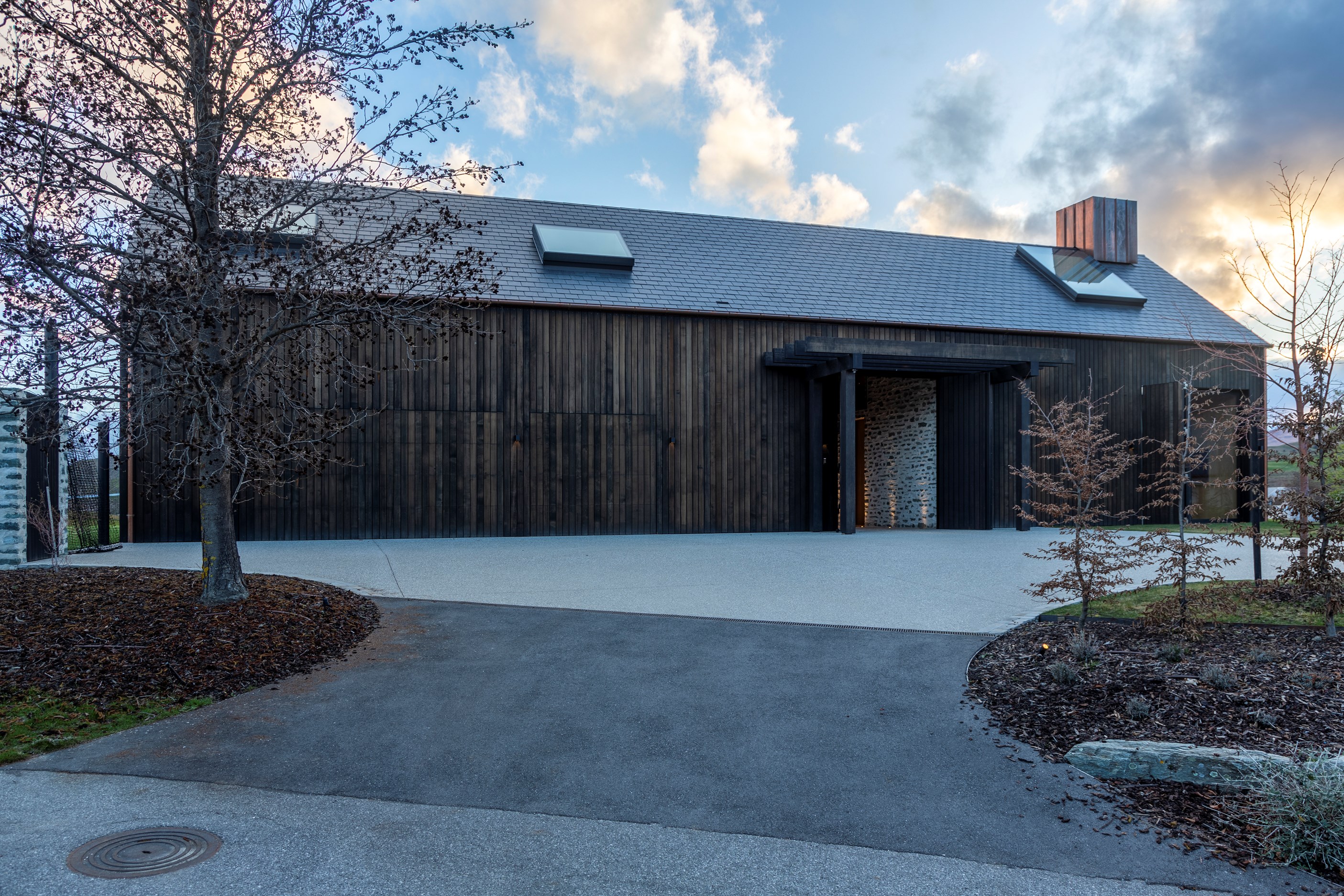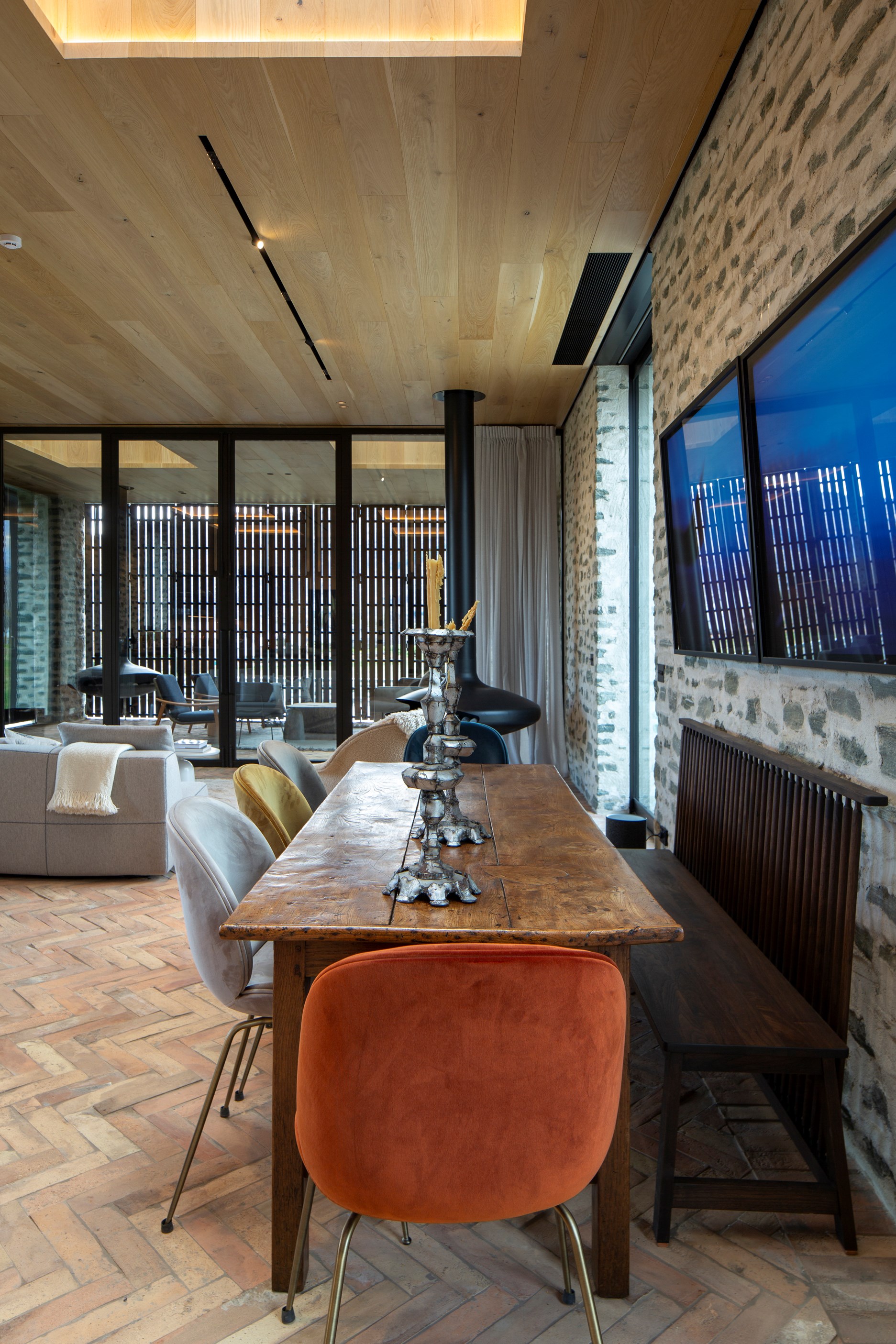 The simple barn form never looked so good. This Patterson Associates Architects-designed holiday home speaks the Central Otago language of stone and timber. The vernacular of The Gatehouse is expressed in two barn-like structures, one clad in local schist, the other in timber – wholly appropriate for a property on a former sheep station. The brief was to deliver a flexible home for family and guests, which is not as simple as it sounds. Sometimes it has to accommodate lots of people in various stages of their lives; at others, it has to be comfortable for just two. Flexibility was key to the configuration. Still,there was plenty of room to work with – 661sqm, in fact. The timber, slightly smaller of the two pavillions sits on the street side of the site and has bedrooms, bathrooms, a kitchen, living spaces and a garage. Across the courtyard and linked by a gallery is the stone pavillion, with bedrooms, a large open-plan kitchen, dining and living area.