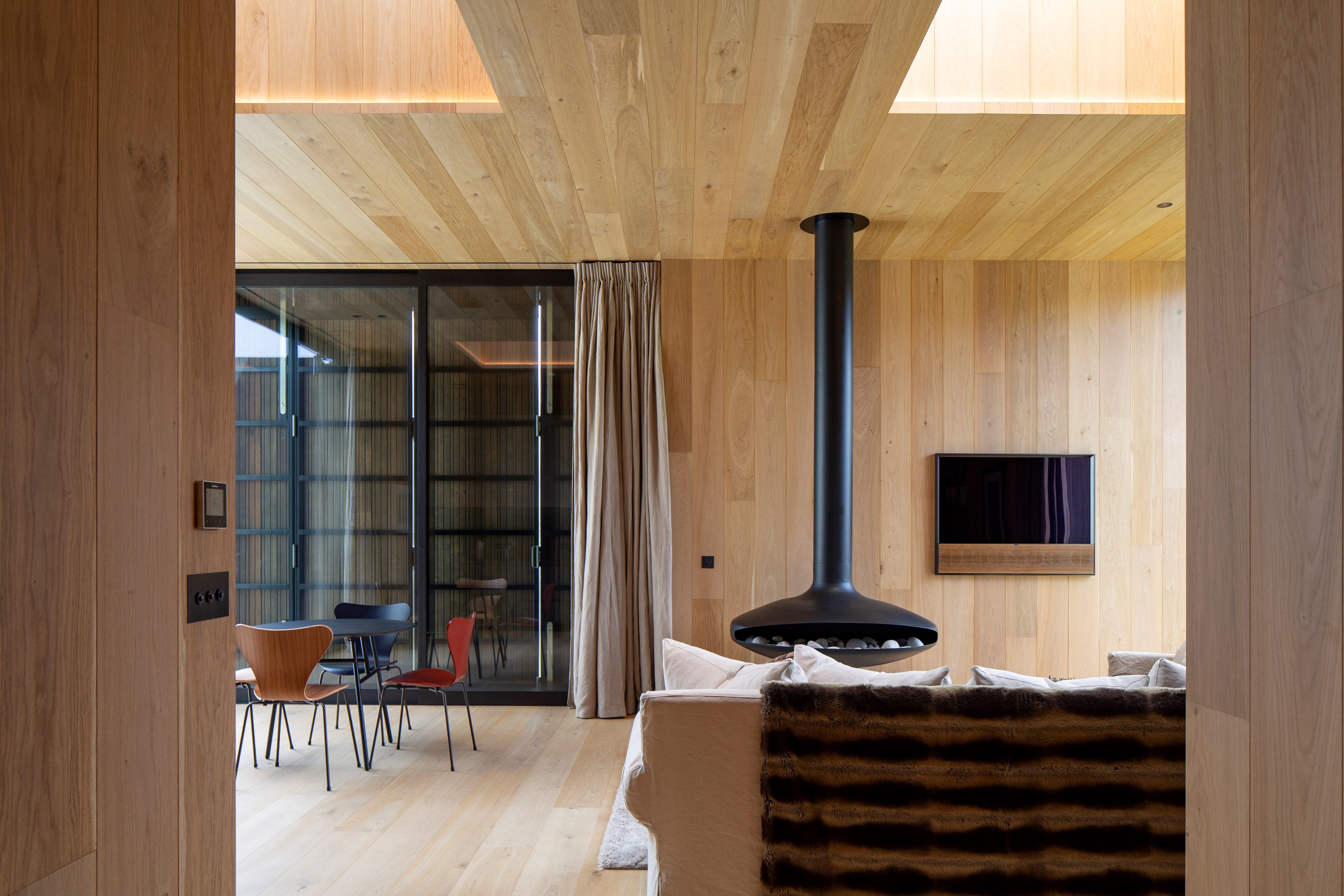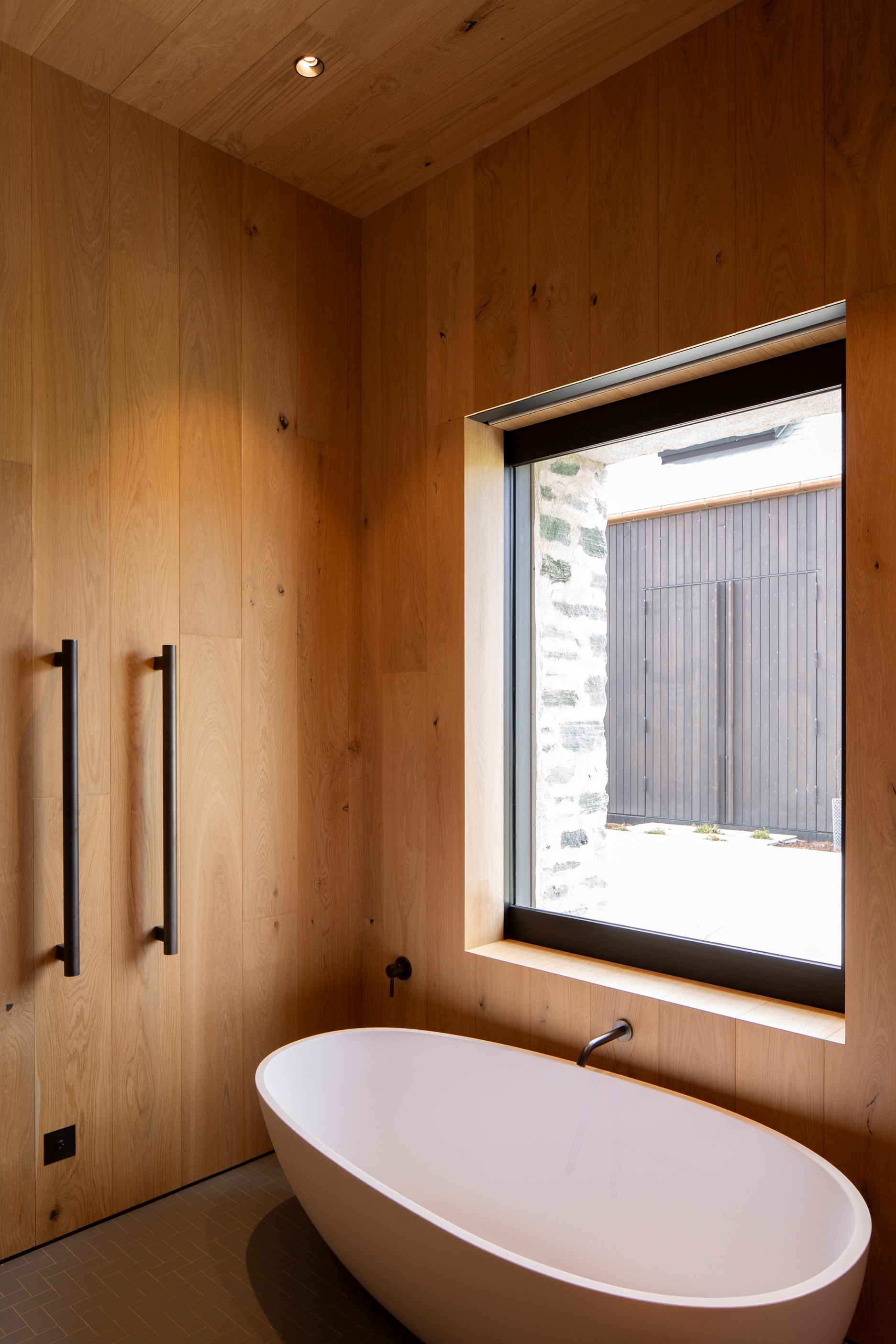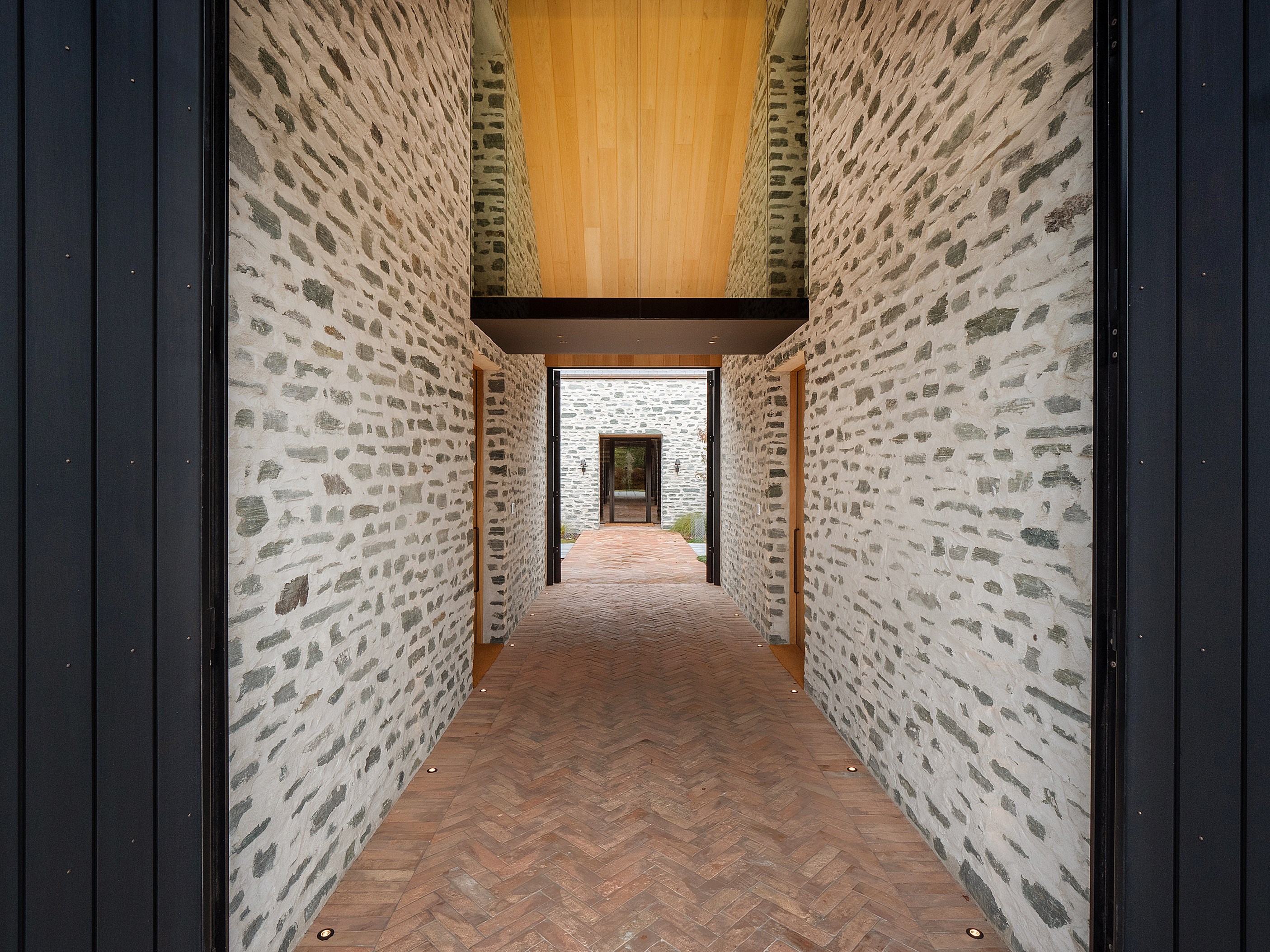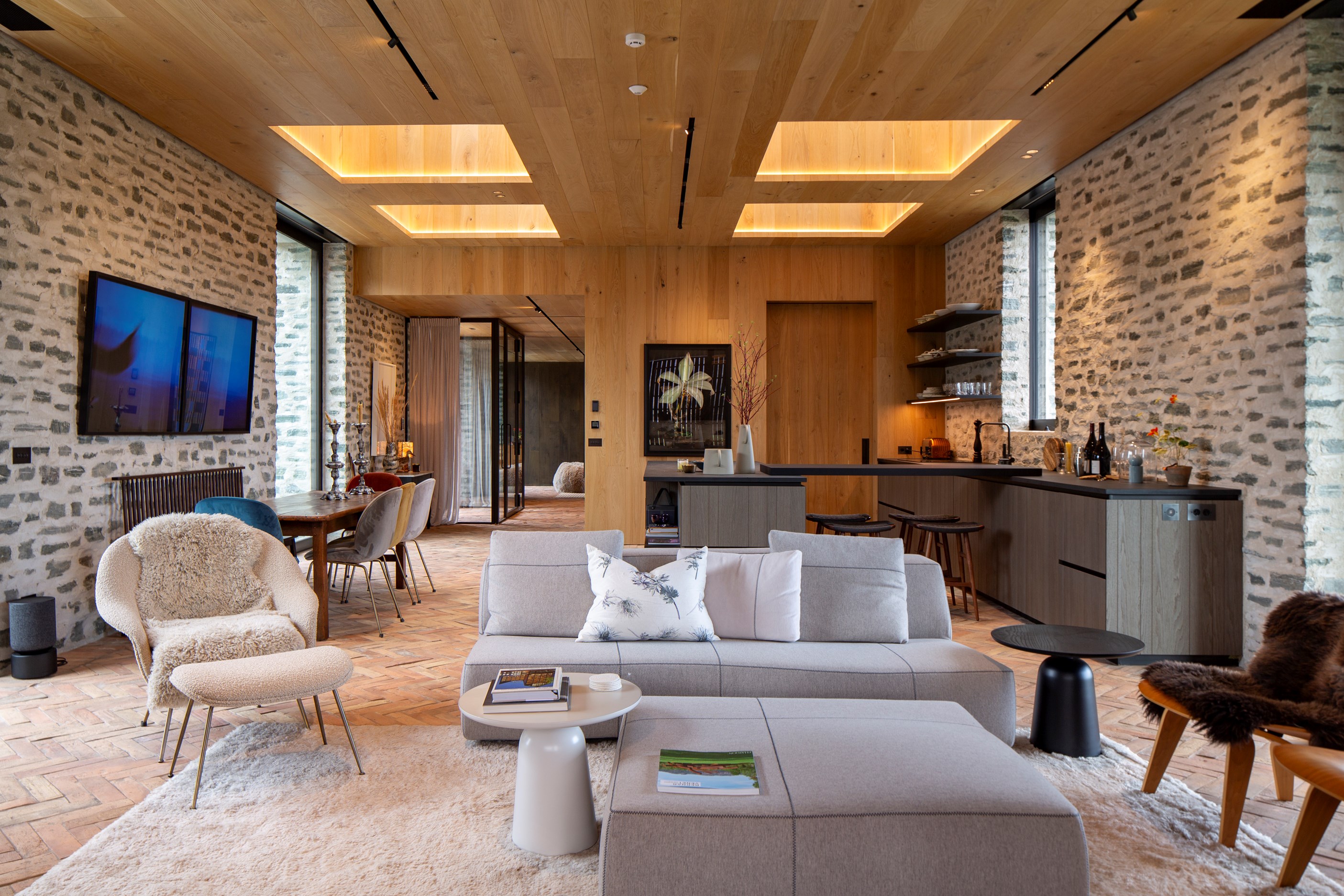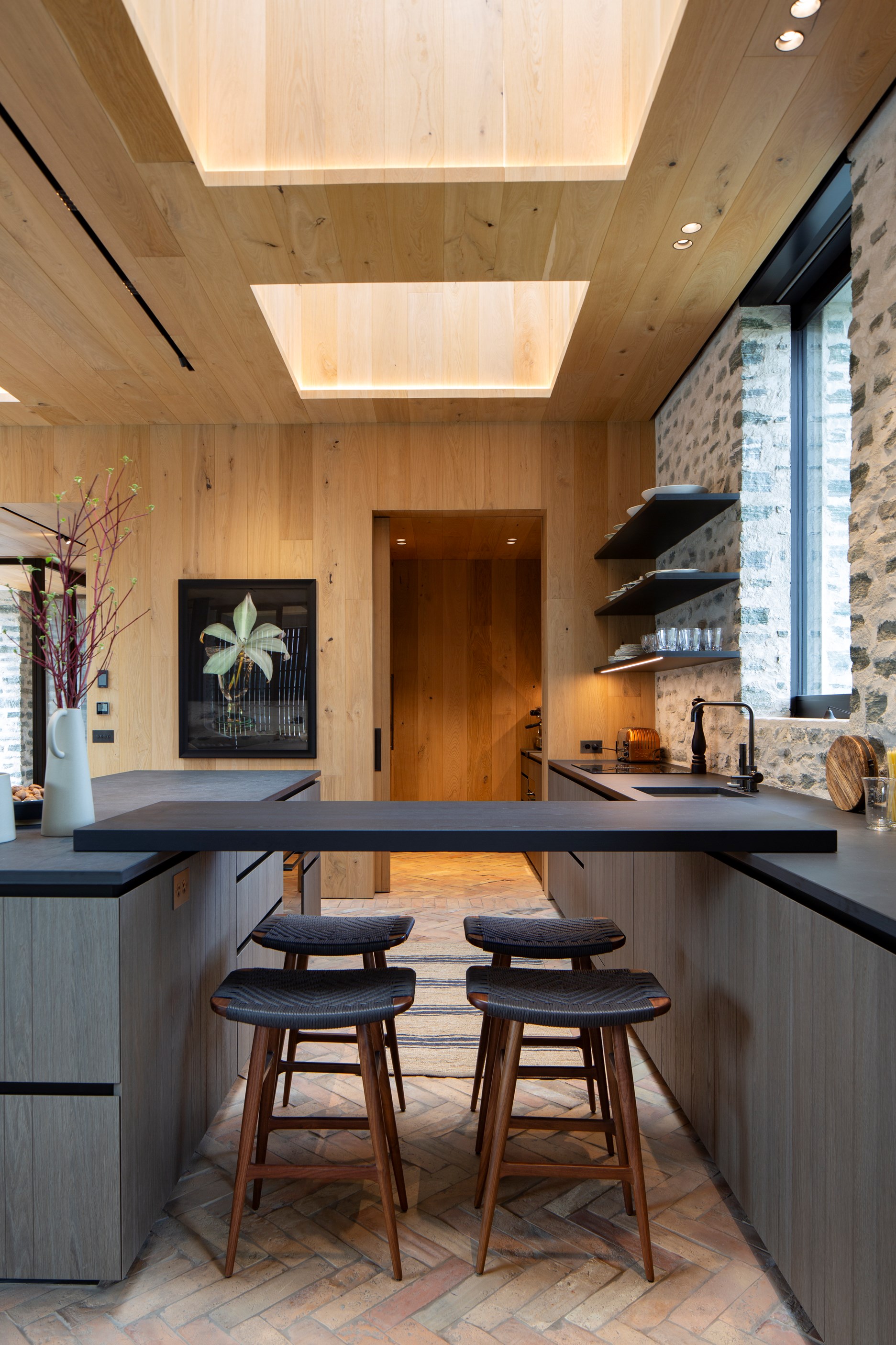 The simple barn form never looked so good. This Patterson Associates Architects-designed holiday home speaks the Central Otago language of stone and timber. The vernacular of The Gatehouse is expressed in two barn-like structures, one clad in local schist, the other in timber – wholly appropriate for a property on a former sheep station. The brief was to deliver a flexible home for family and guests, which is not as simple as it sounds. Sometimes it has to accommodate lots of people in various stages of their lives; at others, it has to be comfortable for just two. Flexibility was key to the configuration. Still,there was plenty of room to work with – 661sqm, in fact. The timber, slightly smaller of the two pavillions sits on the street side of the site and has bedrooms, bathrooms, a kitchen, living spaces and a garage. Across the courtyard and linked by a gallery is the stone pavillion, with bedrooms, a large open-plan kitchen, dining and living area.