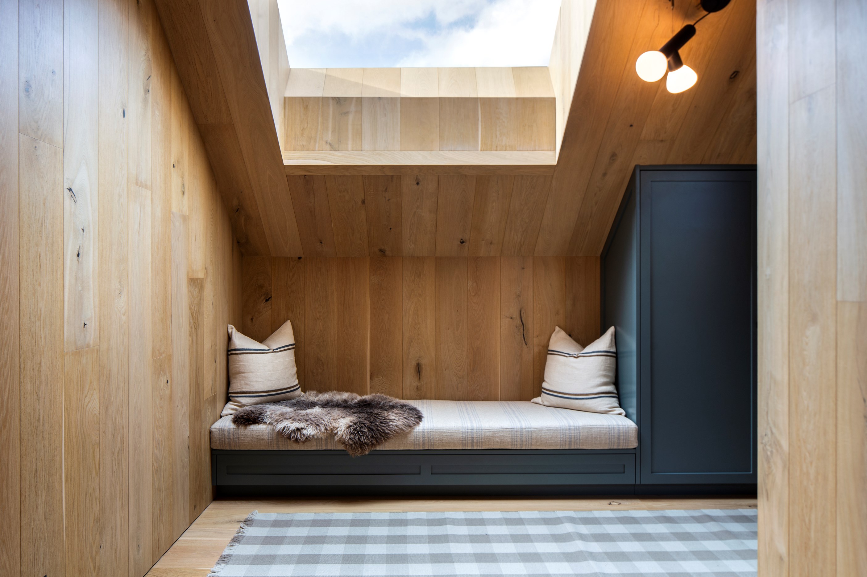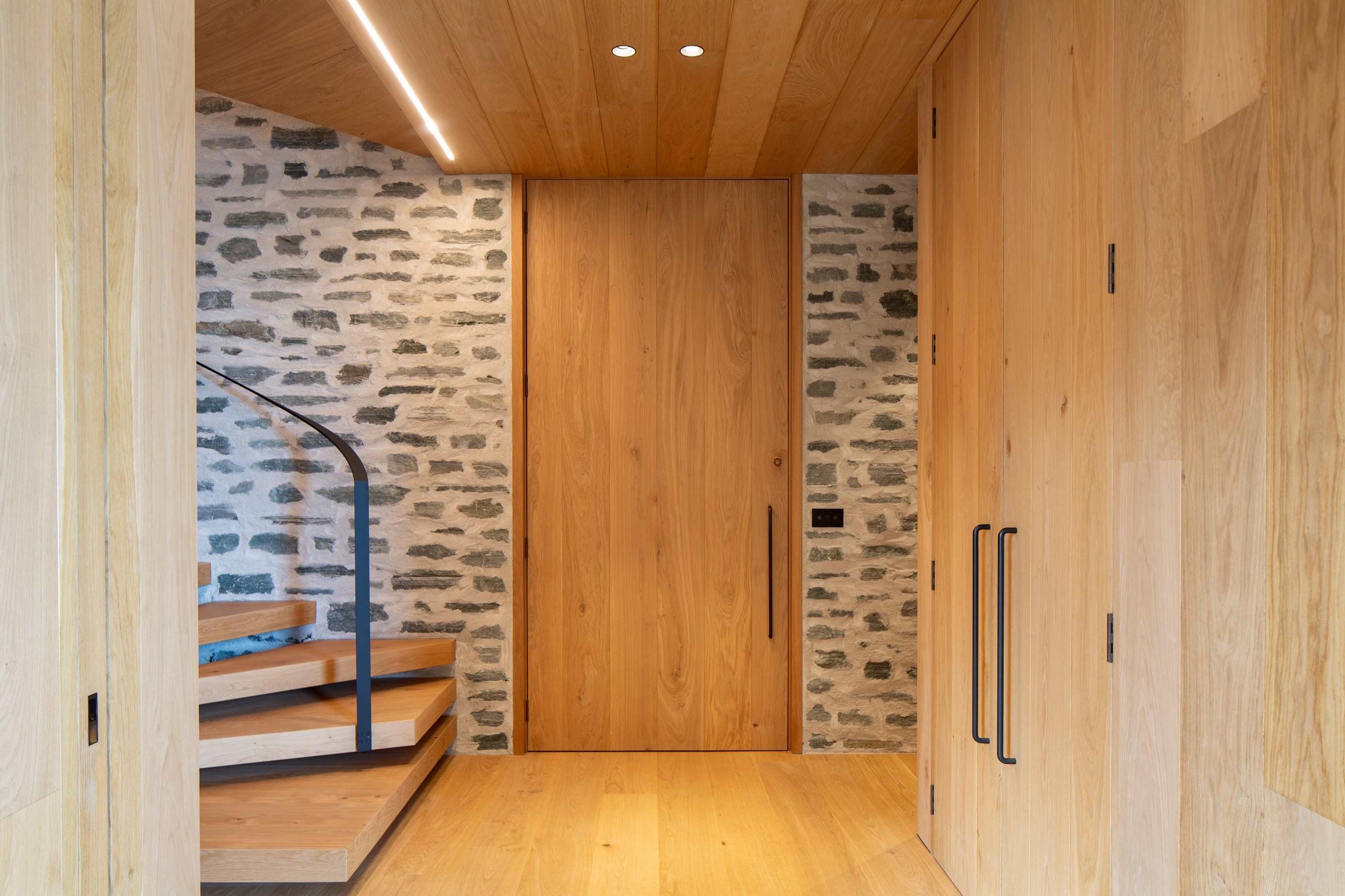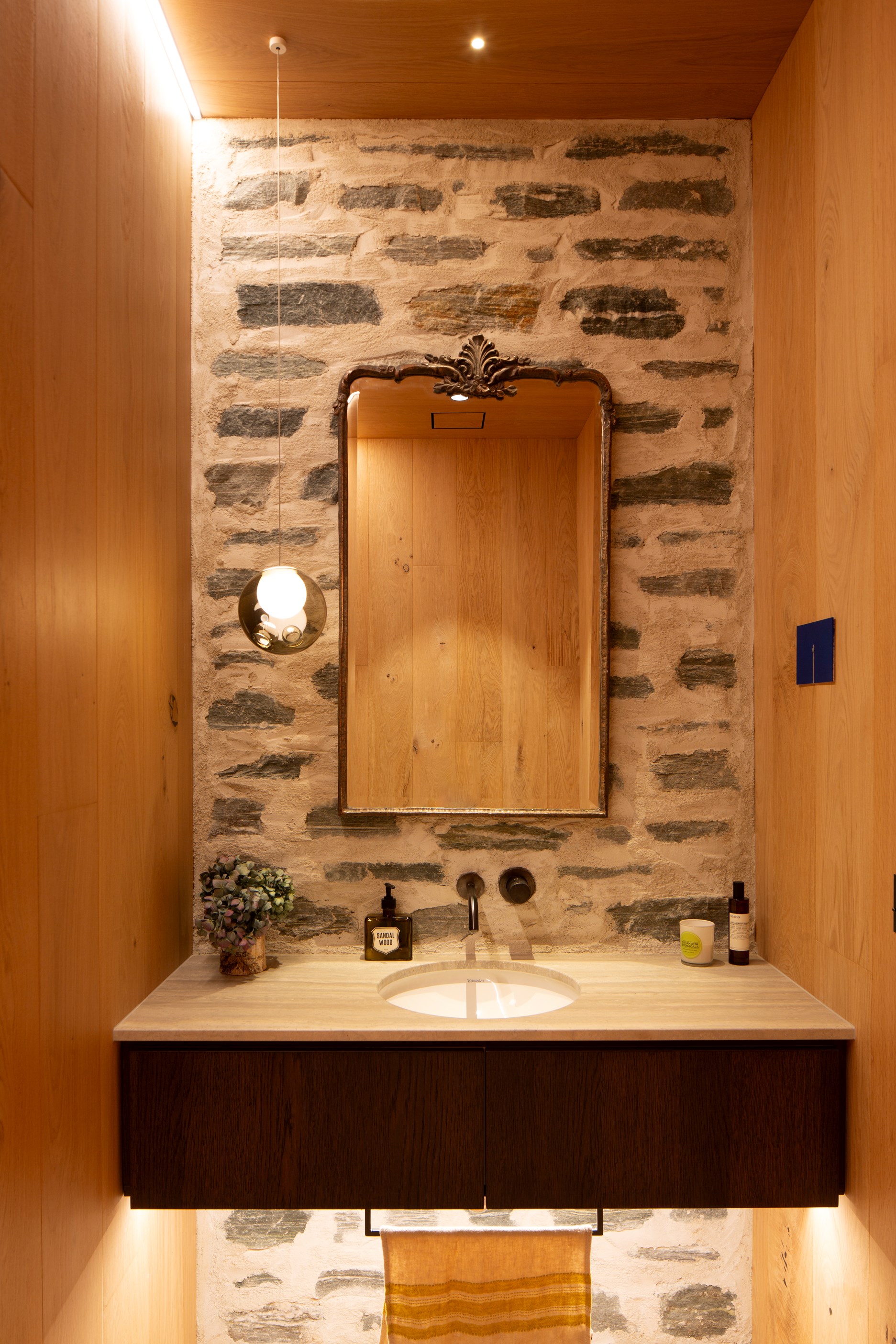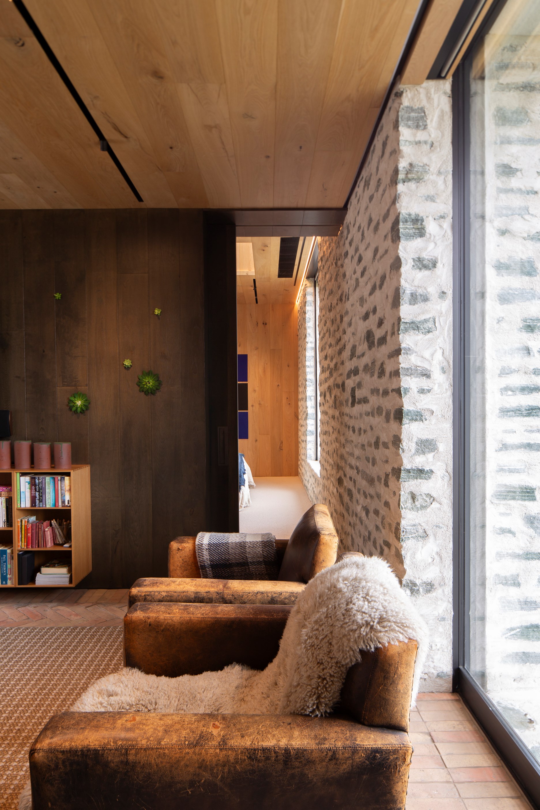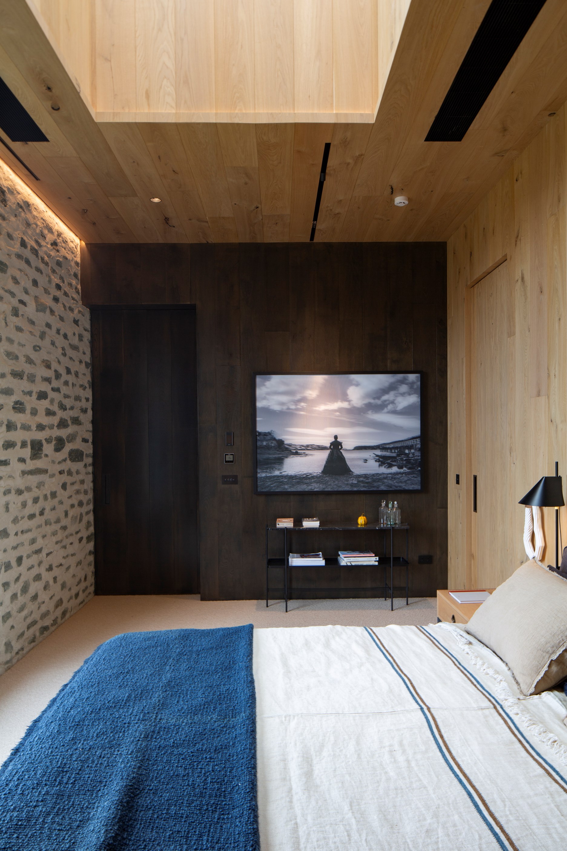 The simple barn form never looked so good. This Patterson Associates Architects-designed holiday home speaks the Central Otago language of stone and timber. The vernacular of The Gatehouse is expressed in two barn-like structures, one clad in local schist, the other in timber – wholly appropriate for a property on a former sheep station. The brief was to deliver a flexible home for family and guests, which is not as simple as it sounds. Sometimes it has to accommodate lots of people in various stages of their lives; at others, it has to be comfortable for just two. Flexibility was key to the configuration. Still,there was plenty of room to work with – 661sqm, in fact. The timber, slightly smaller of the two pavillions sits on the street side of the site and has bedrooms, bathrooms, a kitchen, living spaces and a garage. Across the courtyard and linked by a gallery is the stone pavillion, with bedrooms, a large open-plan kitchen, dining and living area.