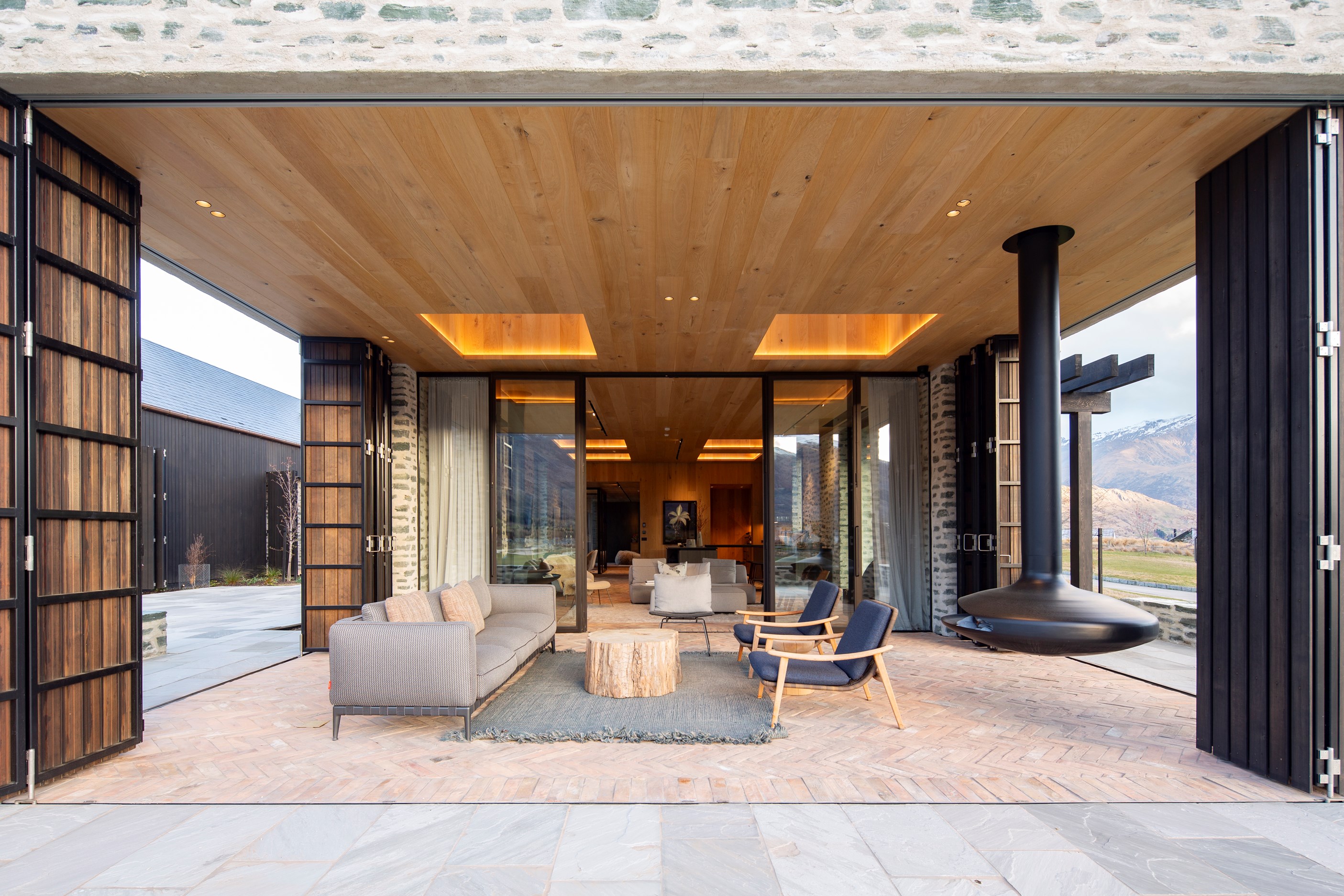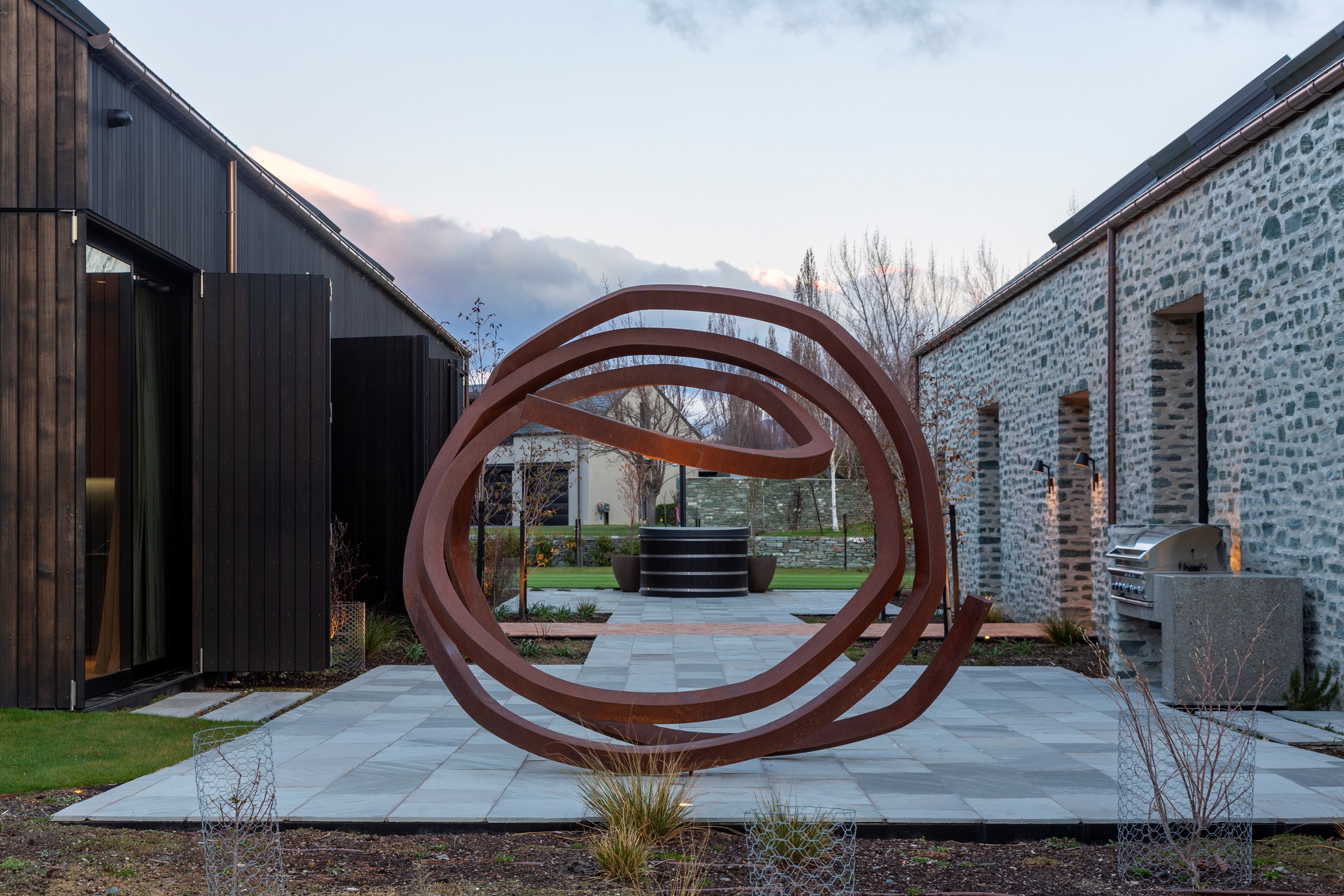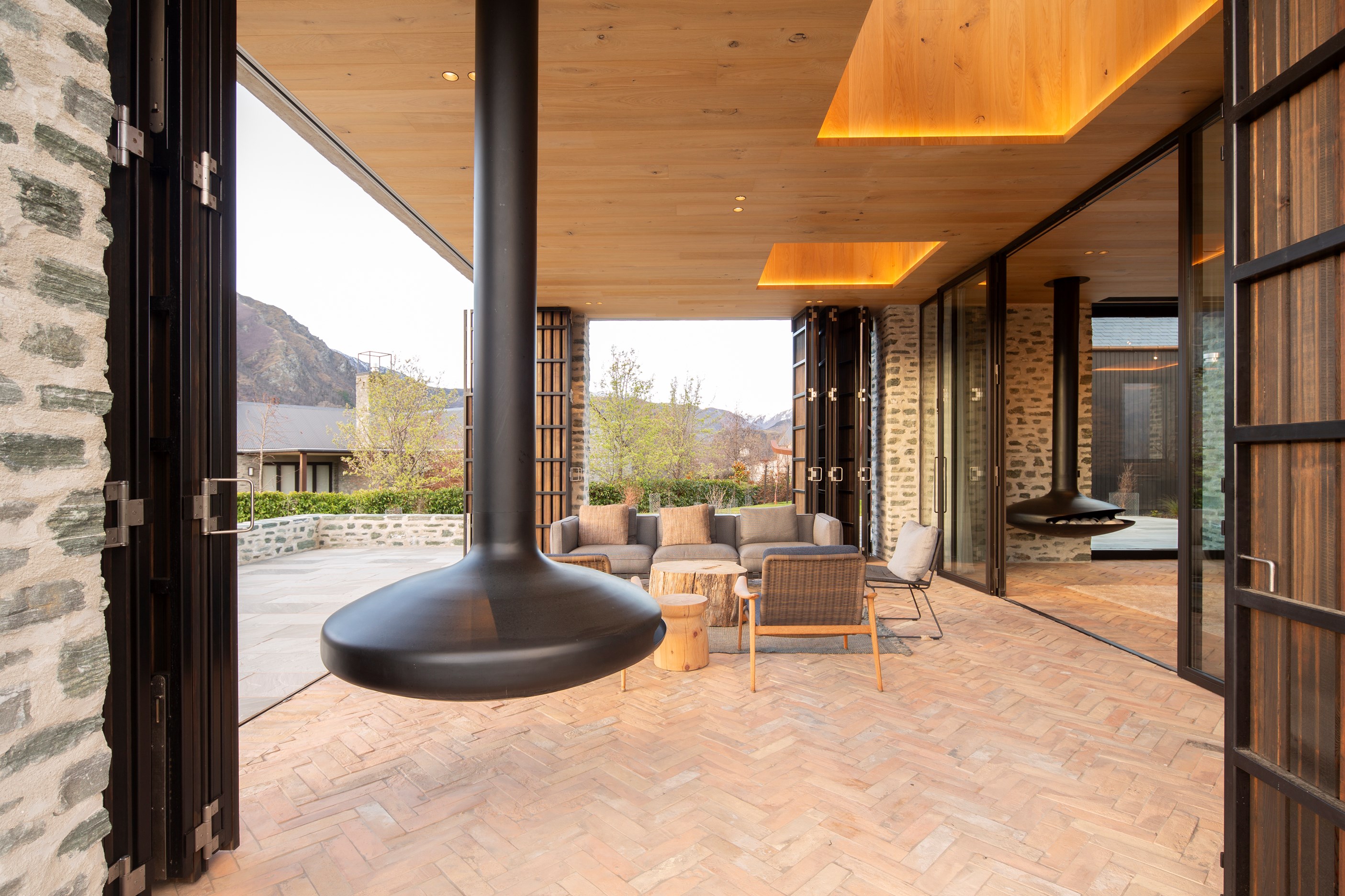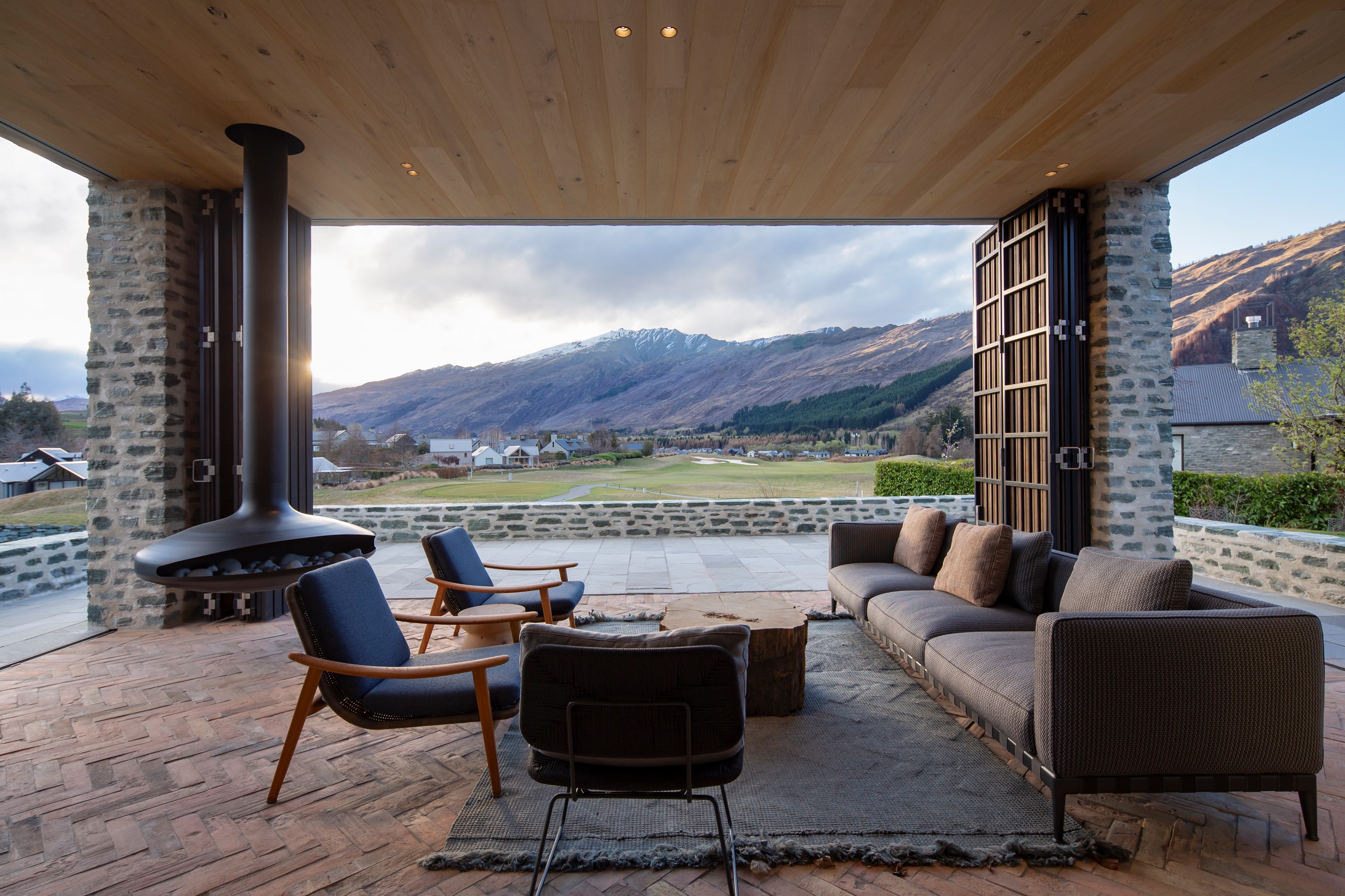 A key feature of the five-bedroom, four-bathroom home is a portcullis – an architectural feature enclosing an outdoor room typically found at the entry to castles. This is visually exciting but also brings a sense of protection and privacy. Meticulously crafted details abound, from the two curving timber staircases to floating fireplaces, a loggia with skylights, and internal schist and wood detailing. A tennis court simply adds to the luxury.