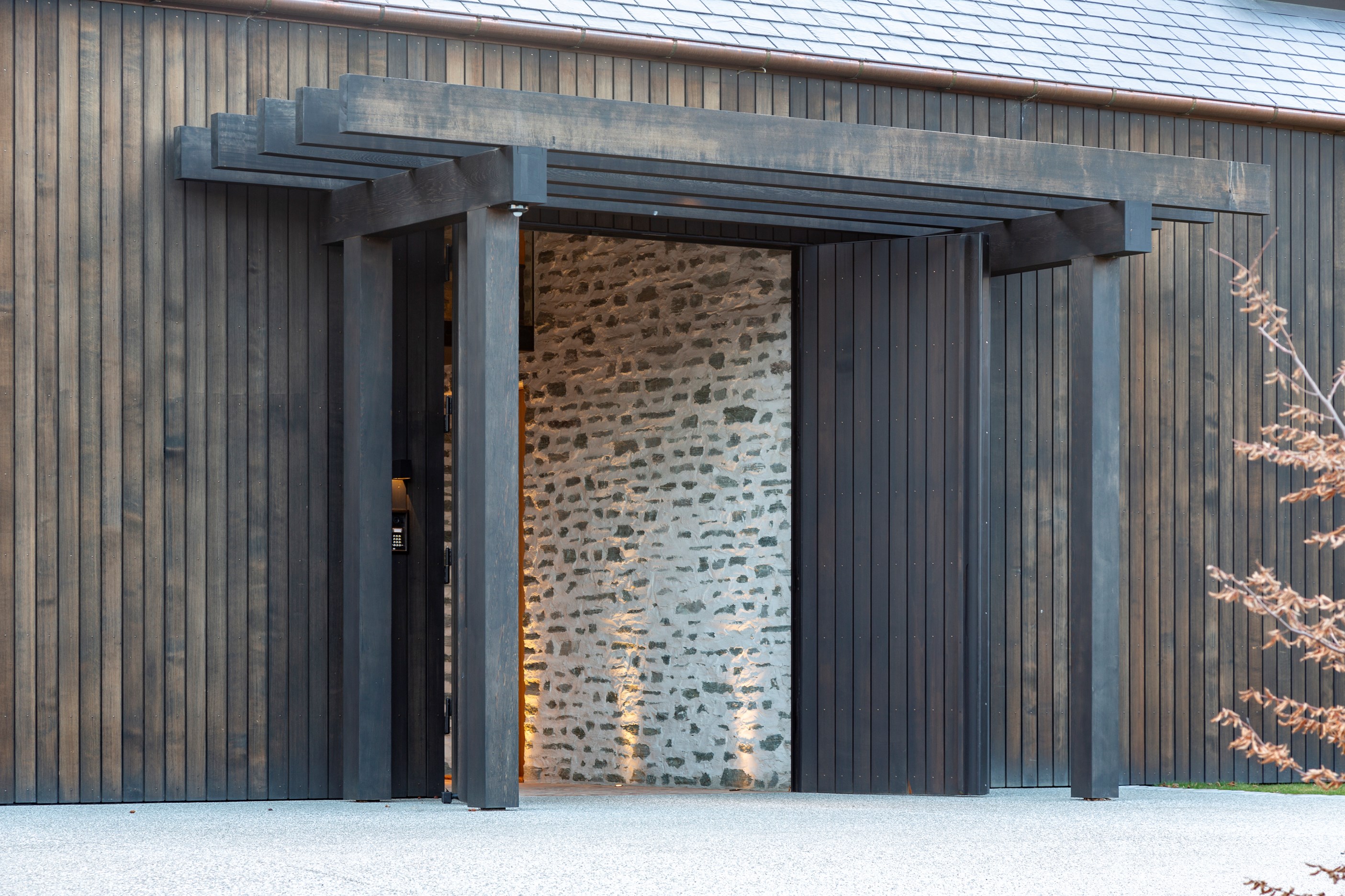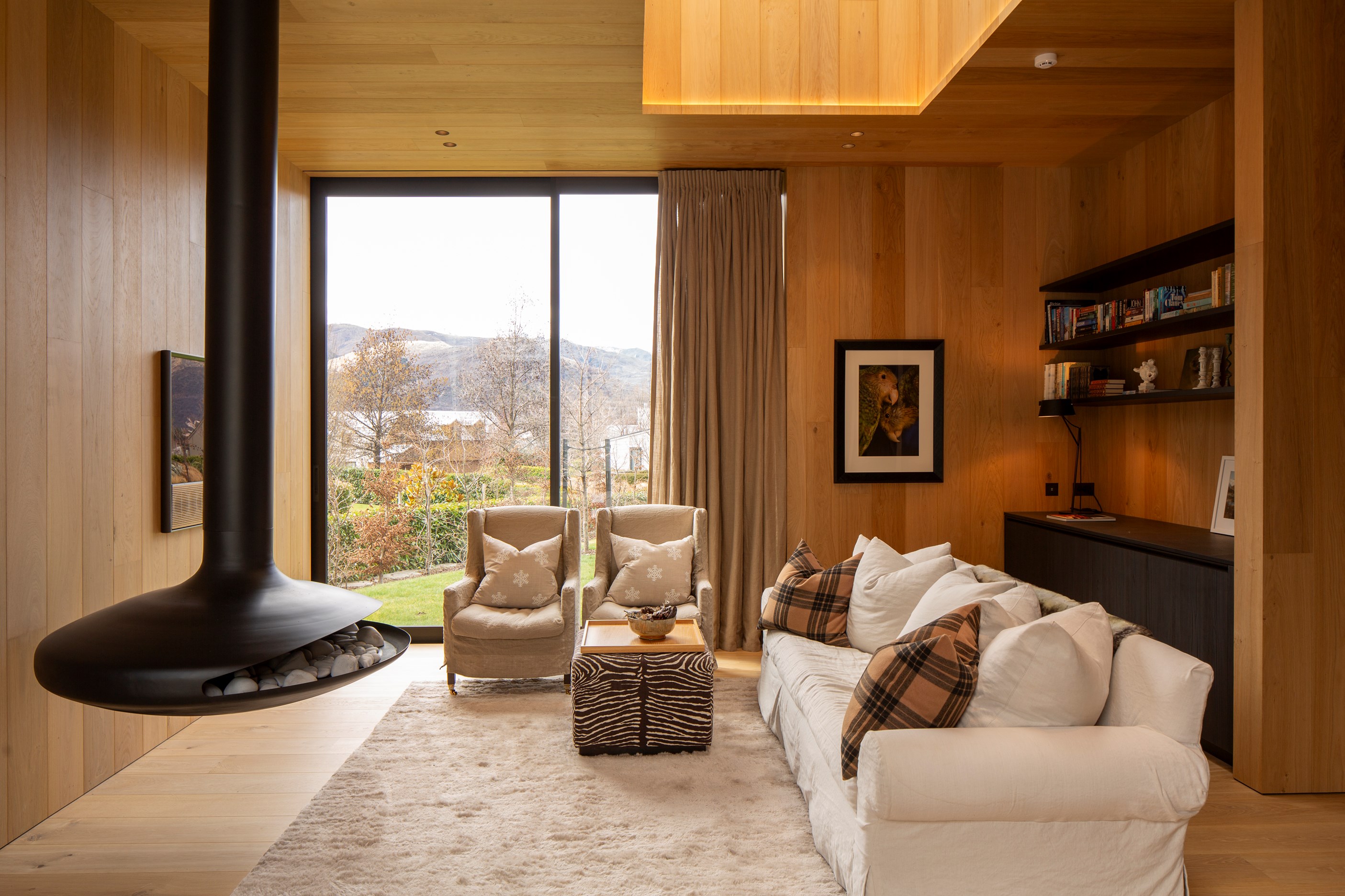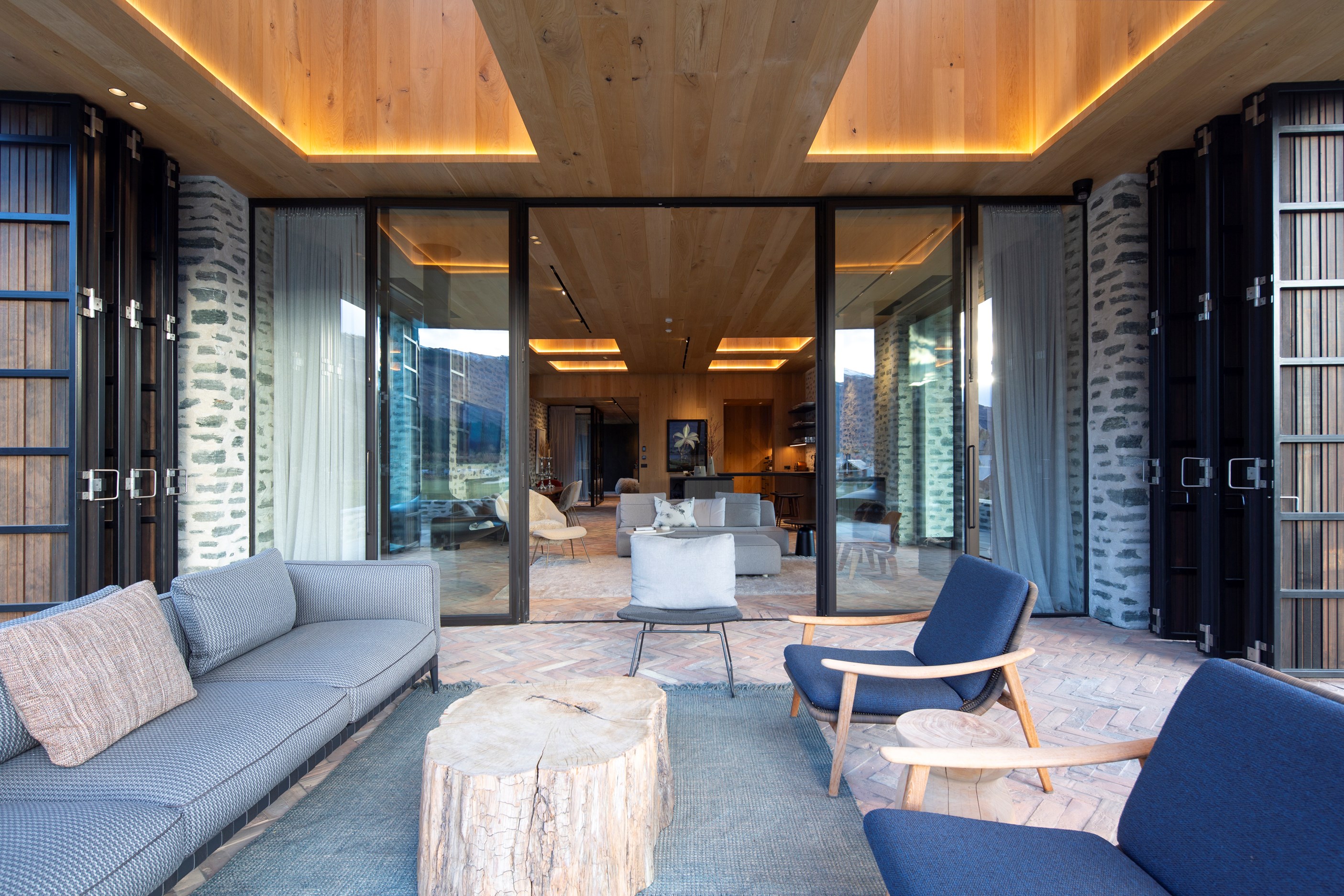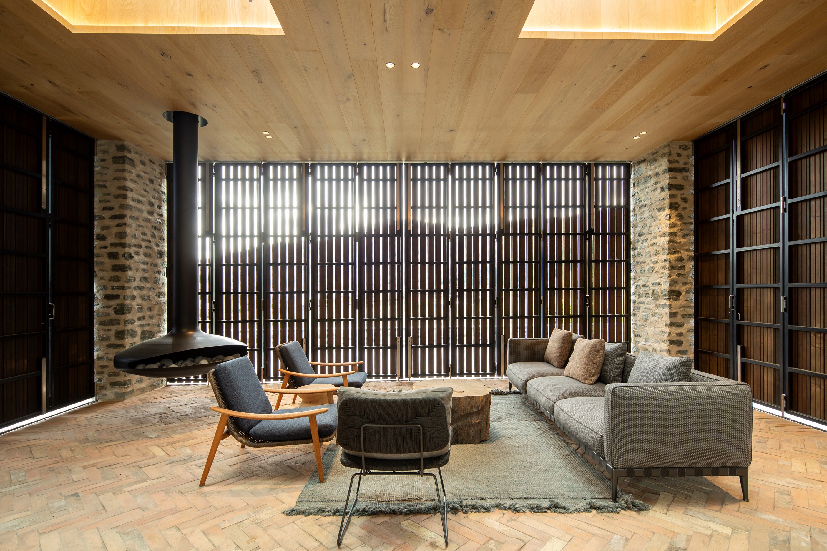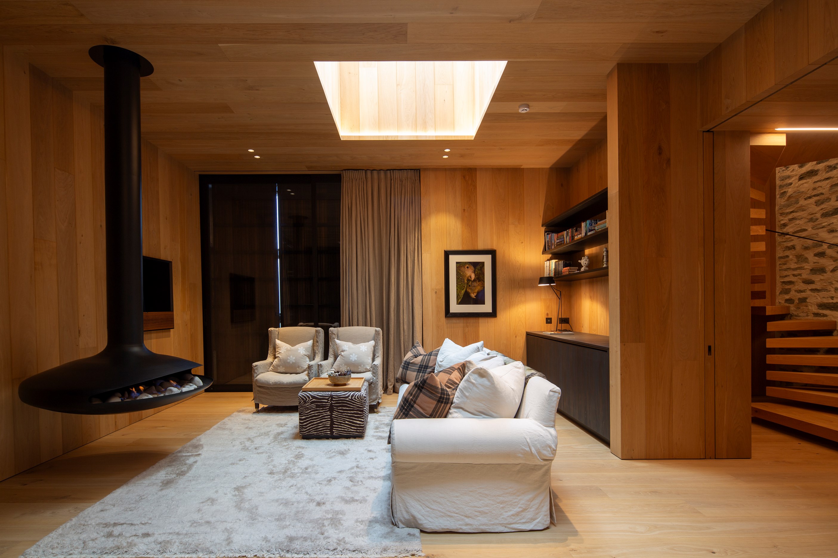 A key feature of the five-bedroom, four-bathroom home is a portcullis – an architectural feature enclosing an outdoor room typically found at the entry to castles. This is visually exciting but also brings a sense of protection and privacy. Meticulously crafted details abound, from the two curving timber staircases to floating fireplaces, a loggia with skylights, and internal schist and wood detailing. A tennis court simply adds to the luxury.