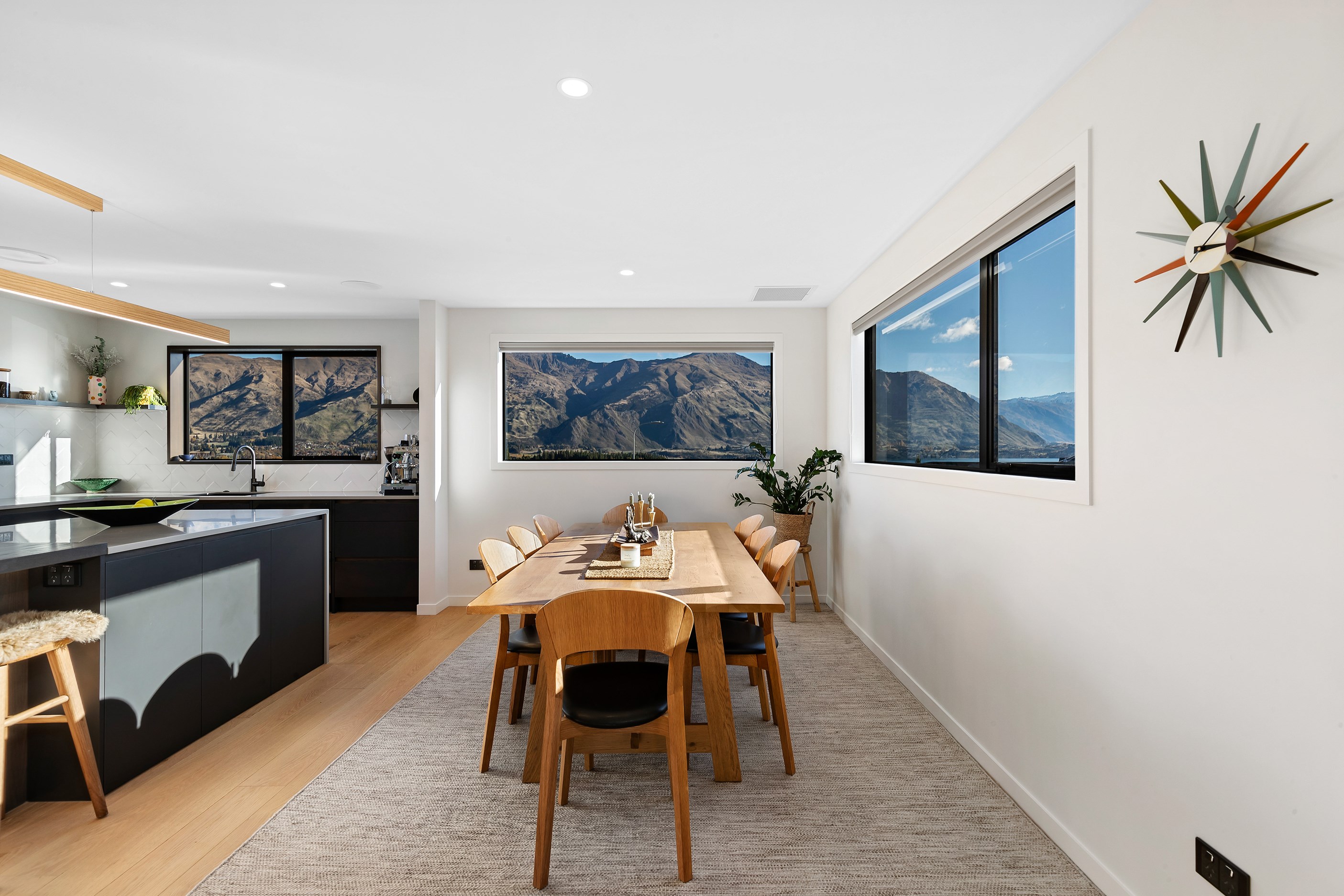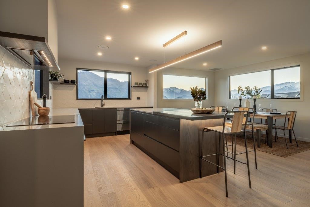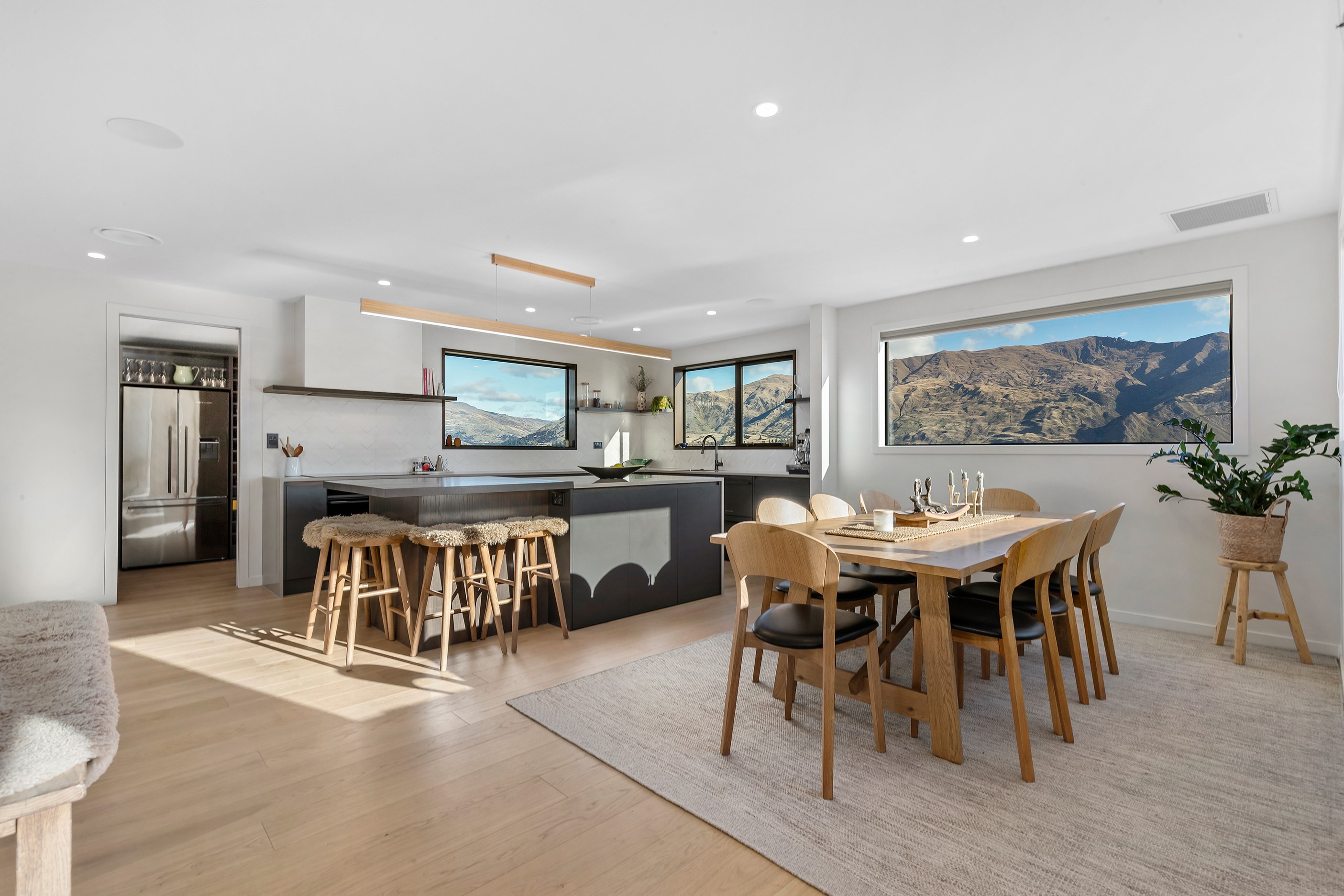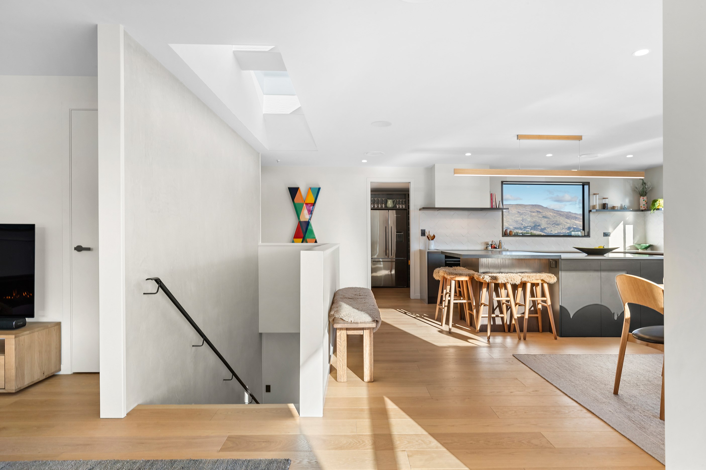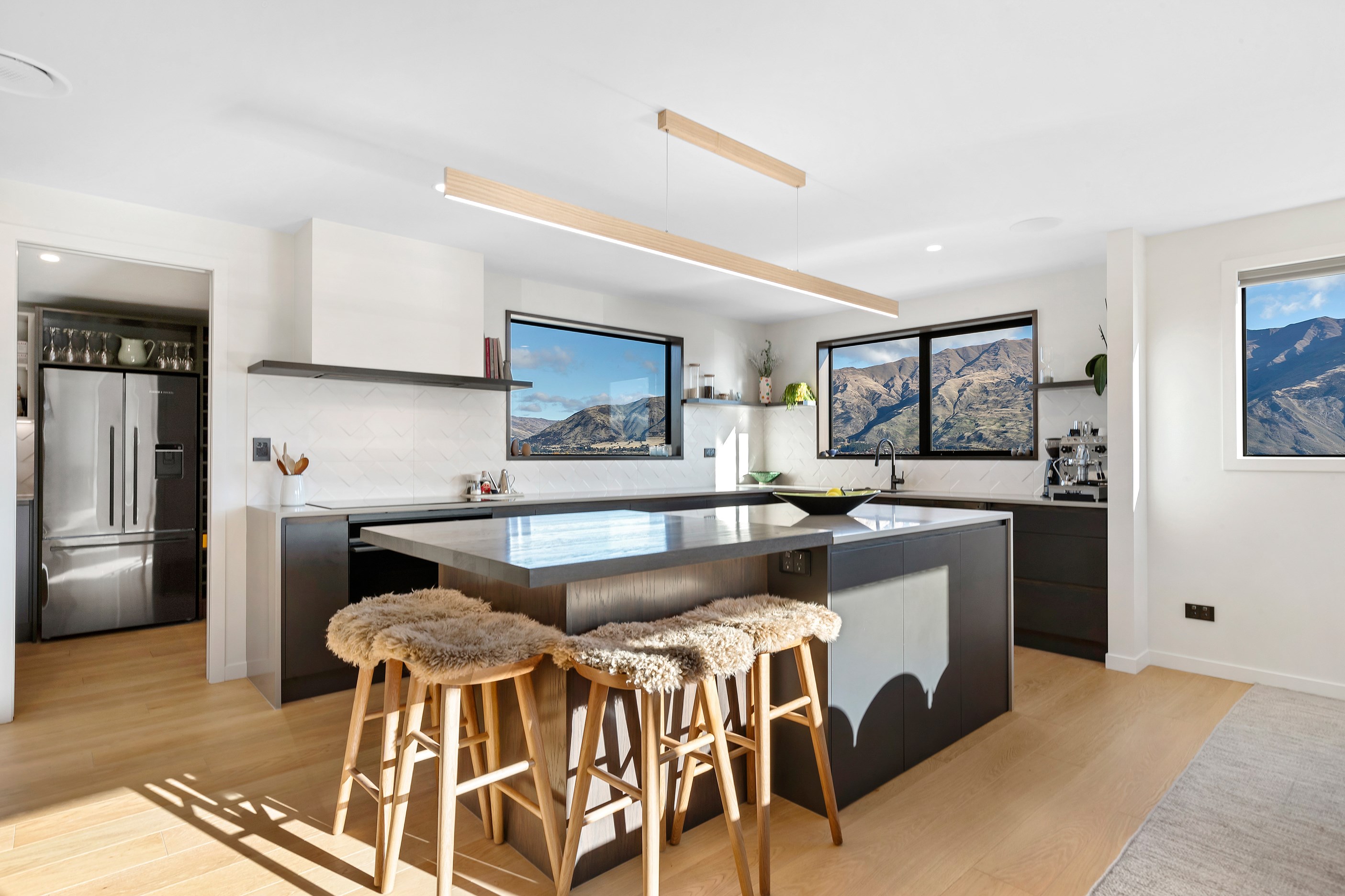 Upstairs, you’ll be greeted by panoramic lake and mountain views from the open-plan kitchen, dining area and living room, where a gas fireplace is seamlessly integrated. This room also opens to the northern balcony – a sheltered spot for alfresco dining year-round, thanks to an outdoor heater. The timeless kitchen has a broad island bench – perfect for hosting – plenty of storage, integrated bar fridge and a generous walk-in pantry. Finishing off the top floor is the luxurious main bedroom with a walk-in wardrobe and fully tiled ensuite bathroom. This home boasts quality finishes, including multiple appliances, underfloor heating, a ducted heat pump, generous skylights, local schist features and kwila decking – basically everything you need to live the good life.