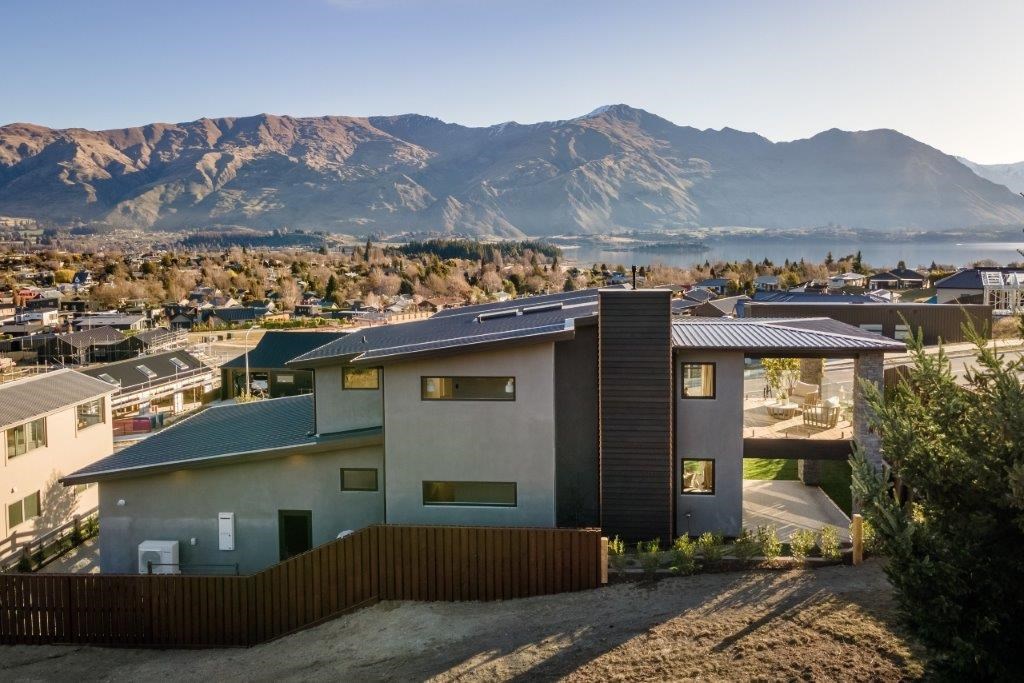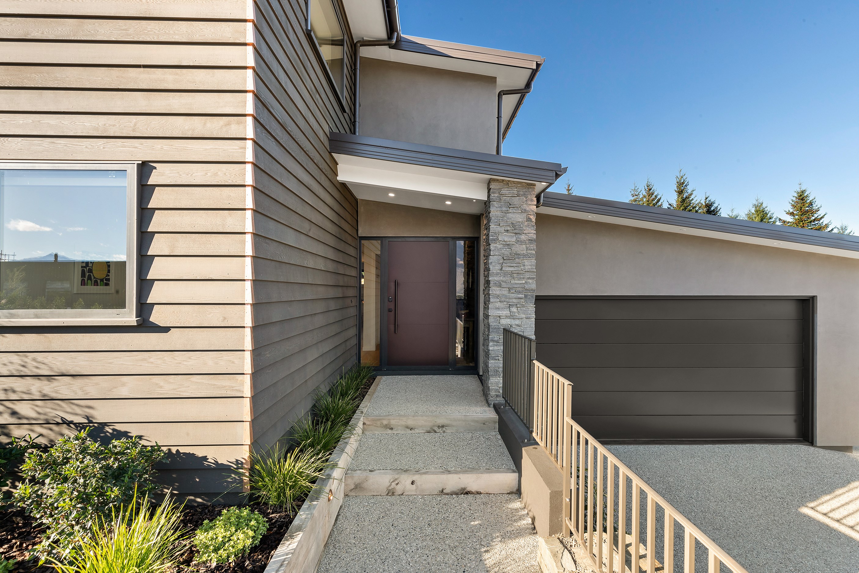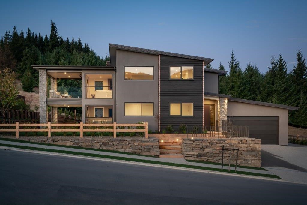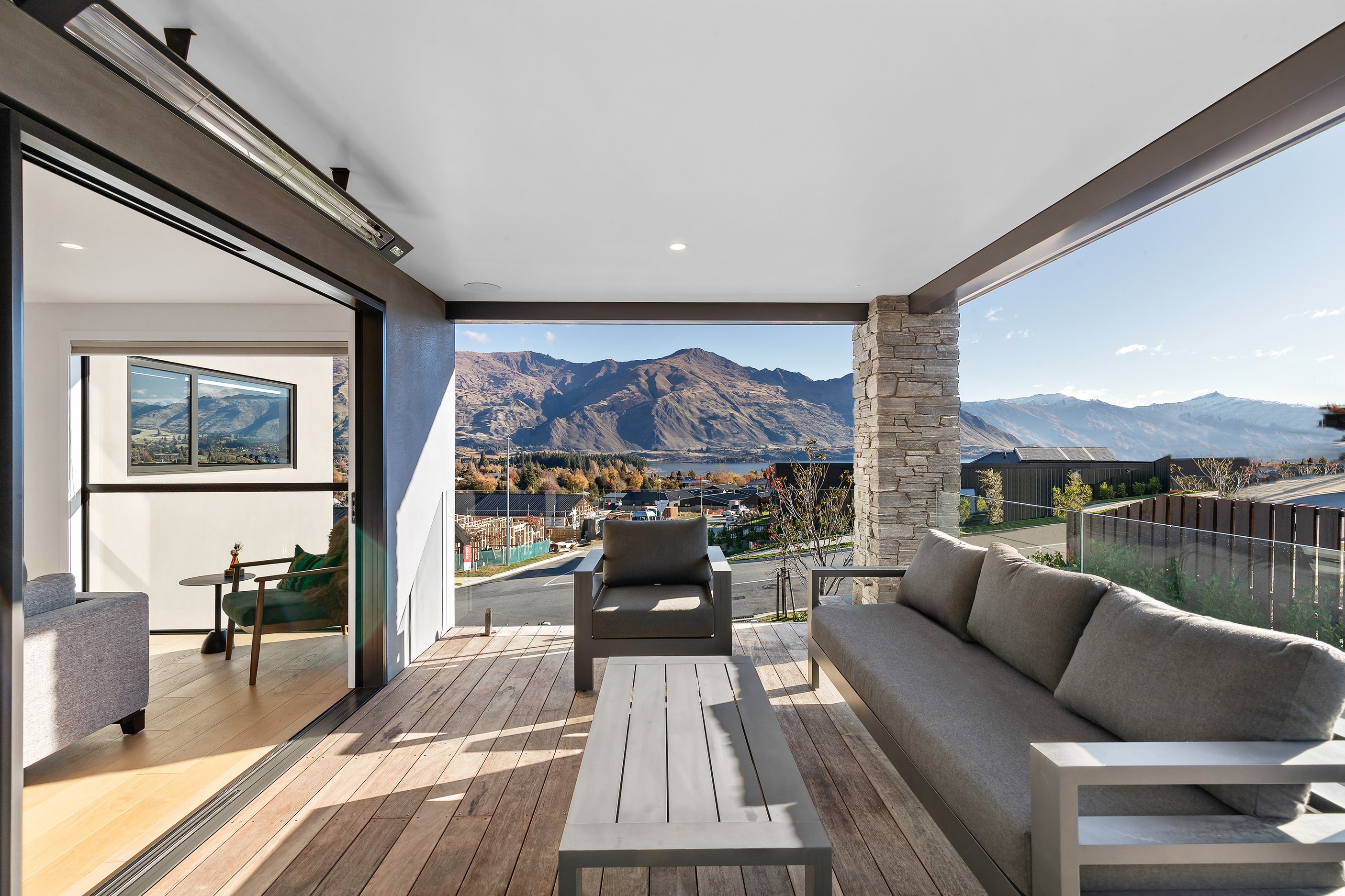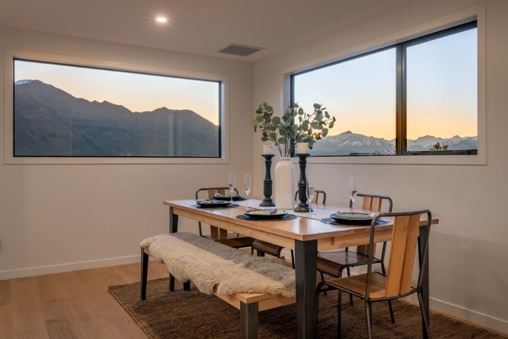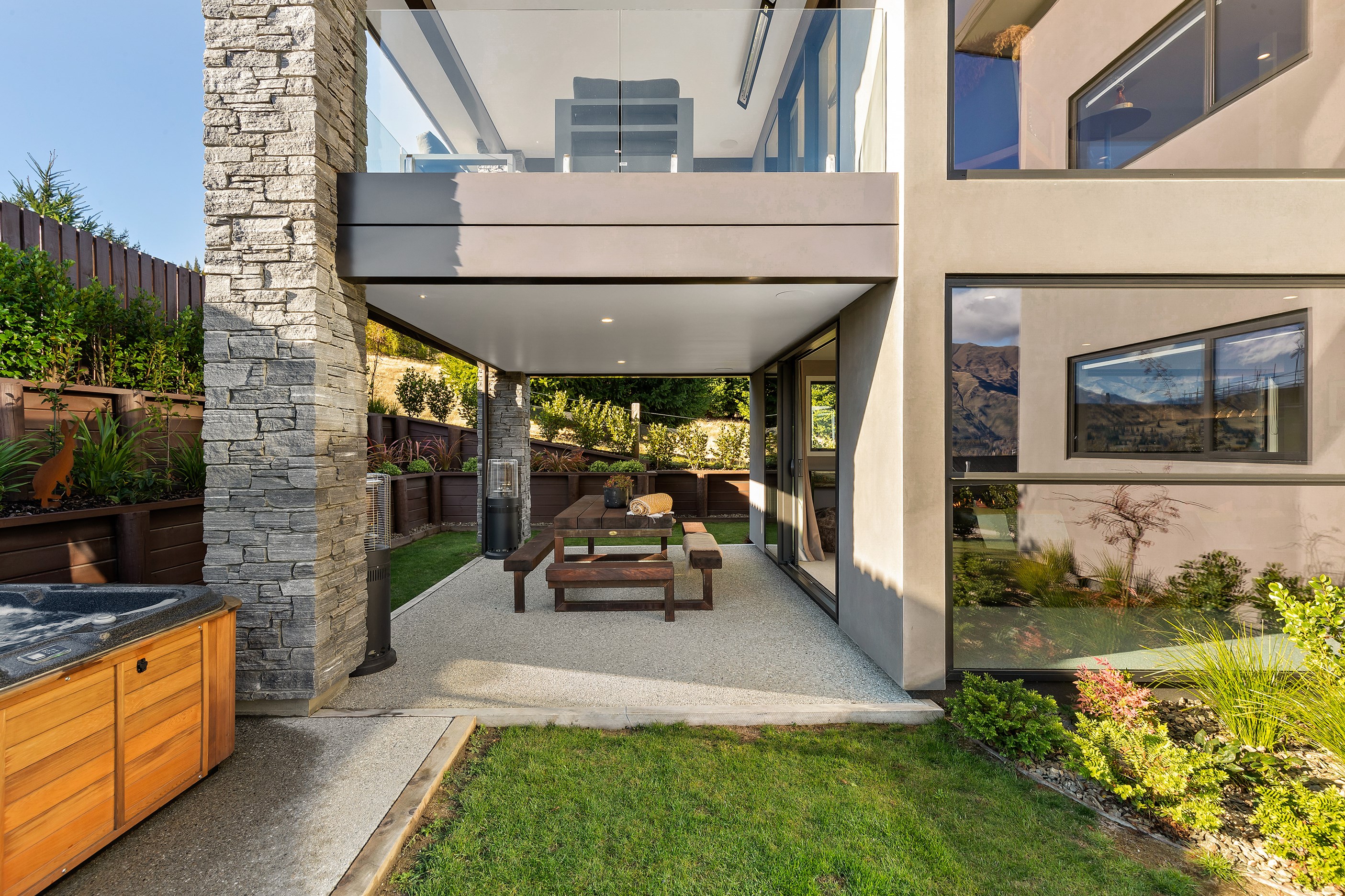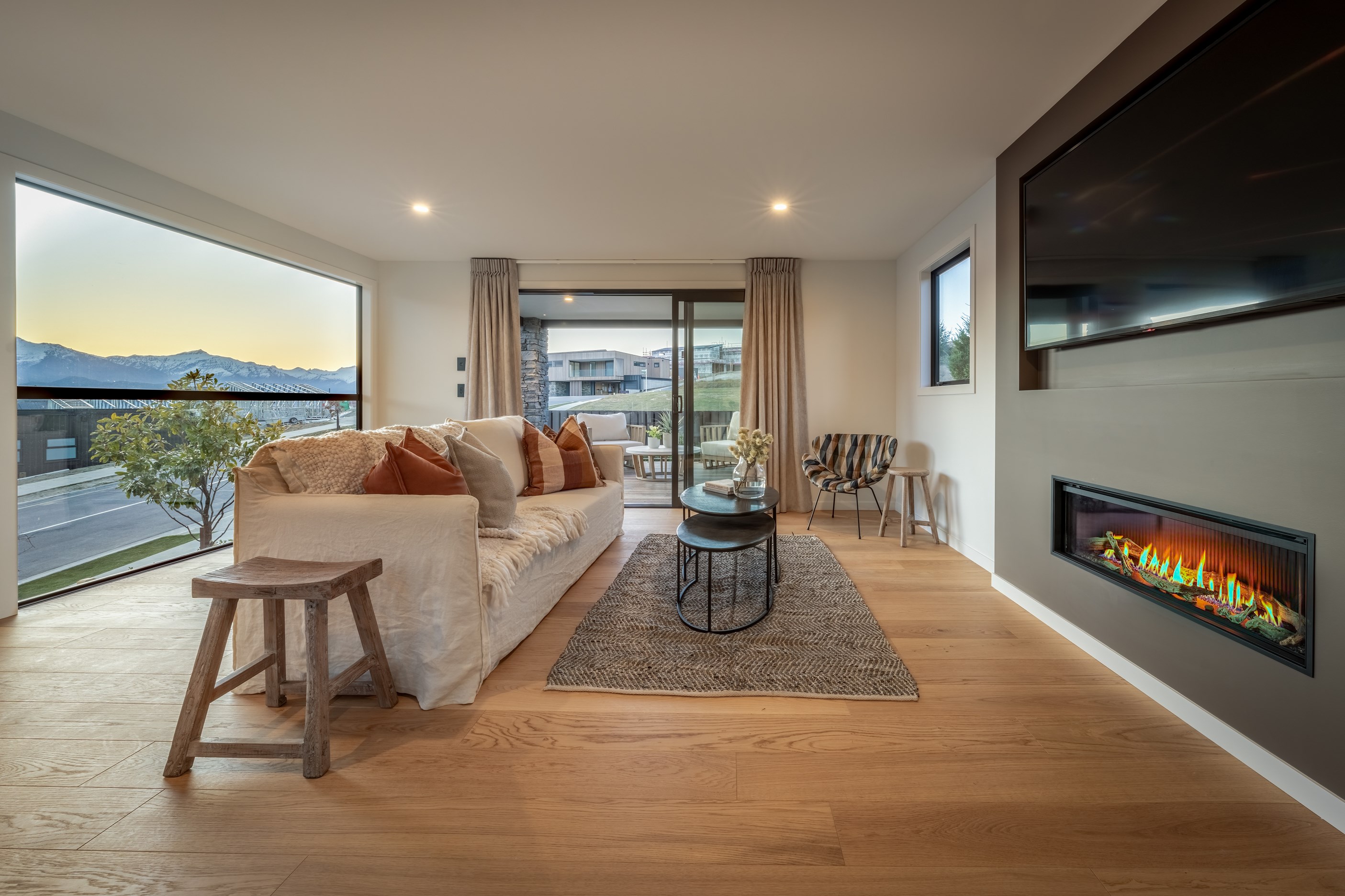 Upstairs, you’ll be greeted by panoramic lake and mountain views from the open-plan kitchen, dining area and living room, where a gas fireplace is seamlessly integrated. This room also opens to the northern balcony – a sheltered spot for alfresco dining year-round, thanks to an outdoor heater. The timeless kitchen has a broad island bench – perfect for hosting – plenty of storage, integrated bar fridge and a generous walk-in pantry. Finishing off the top floor is the luxurious main bedroom with a walk-in wardrobe and fully tiled ensuite bathroom. This home boasts quality finishes, including multiple appliances, underfloor heating, a ducted heat pump, generous skylights, local schist features and kwila decking – basically everything you need to live the good life.