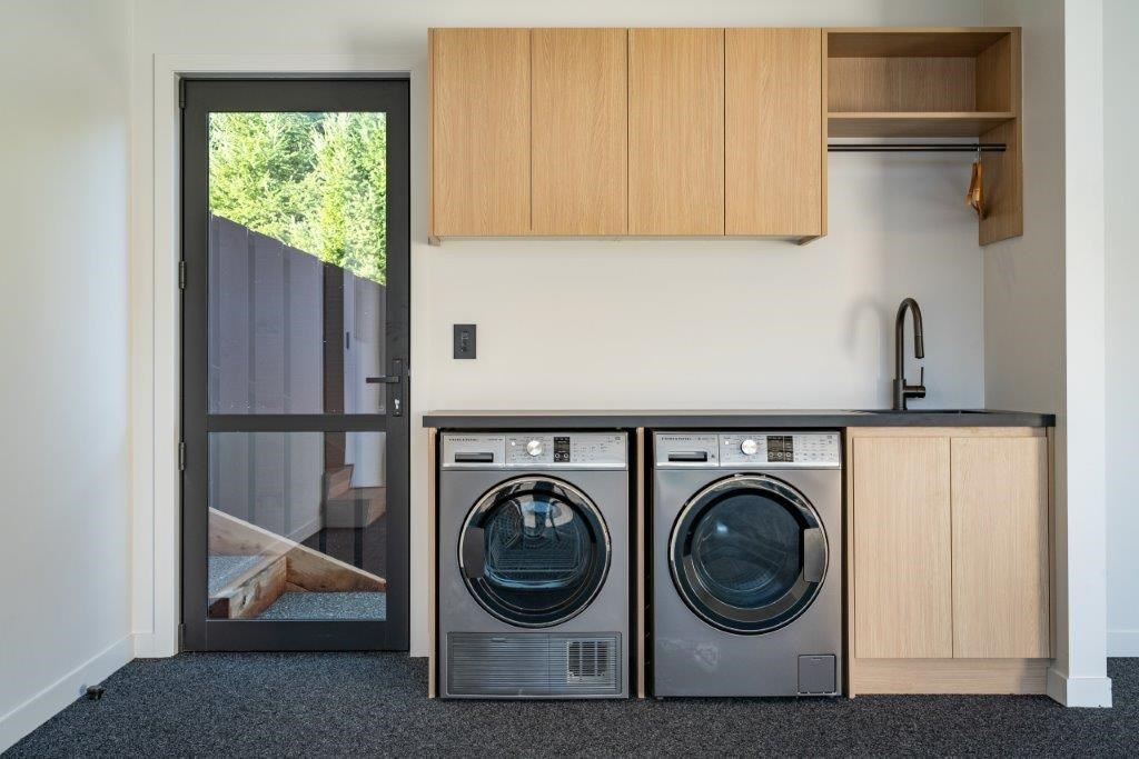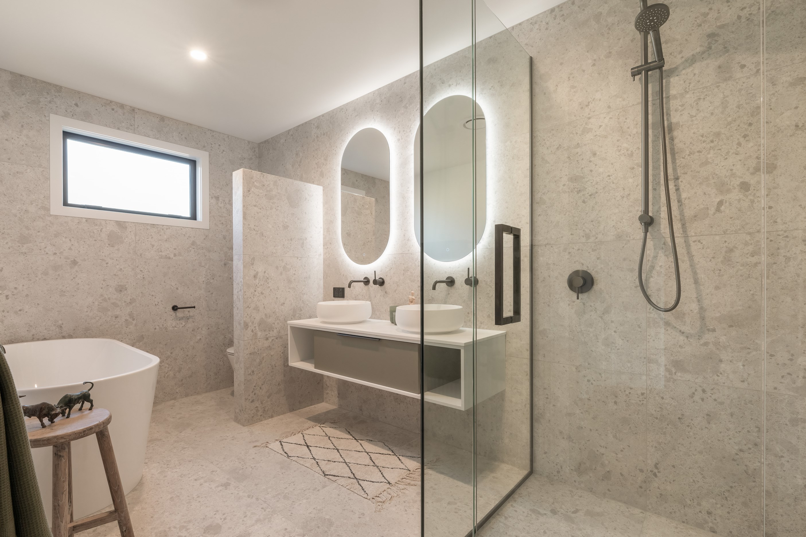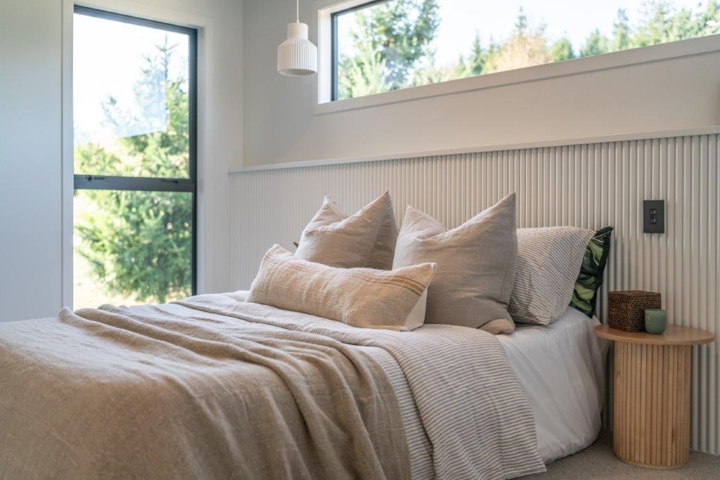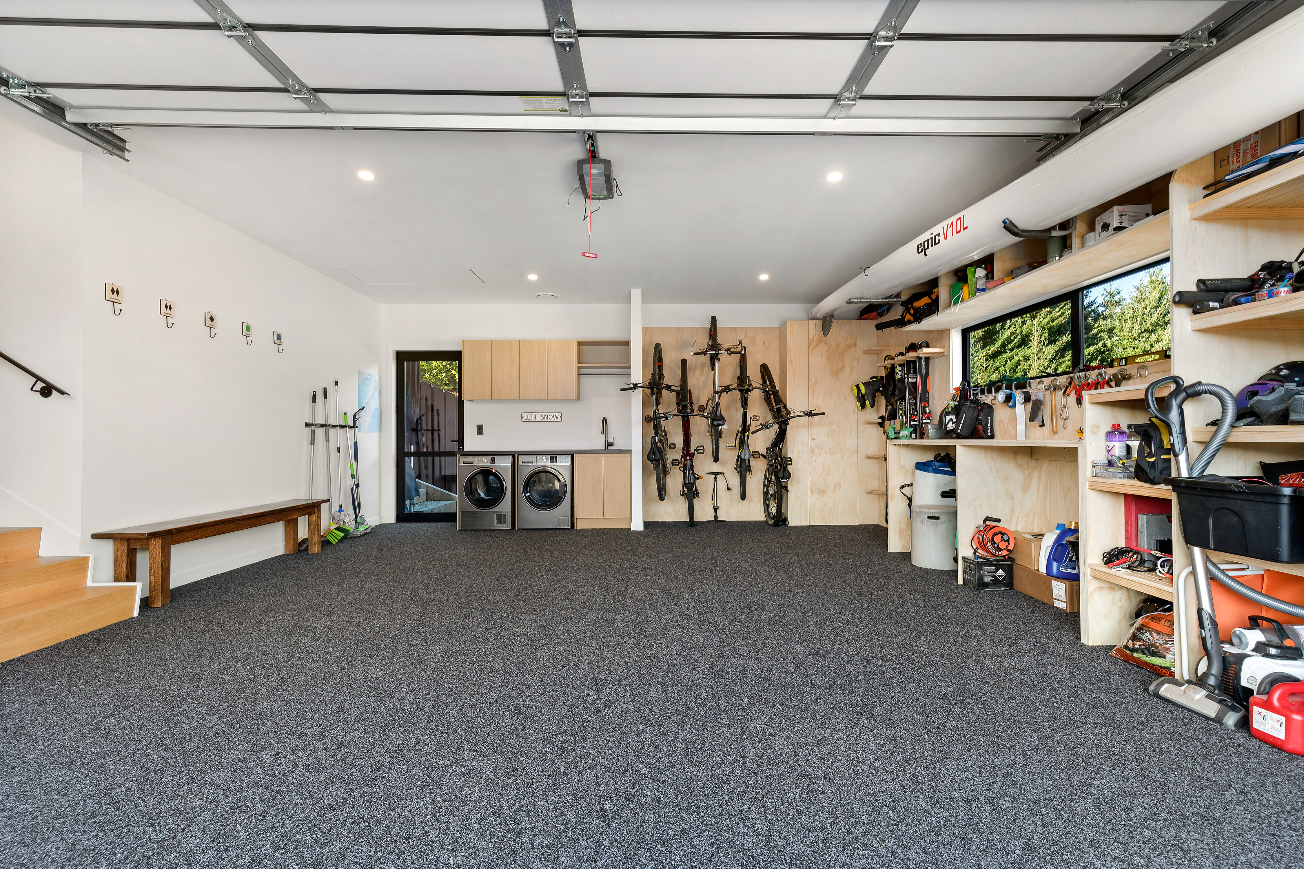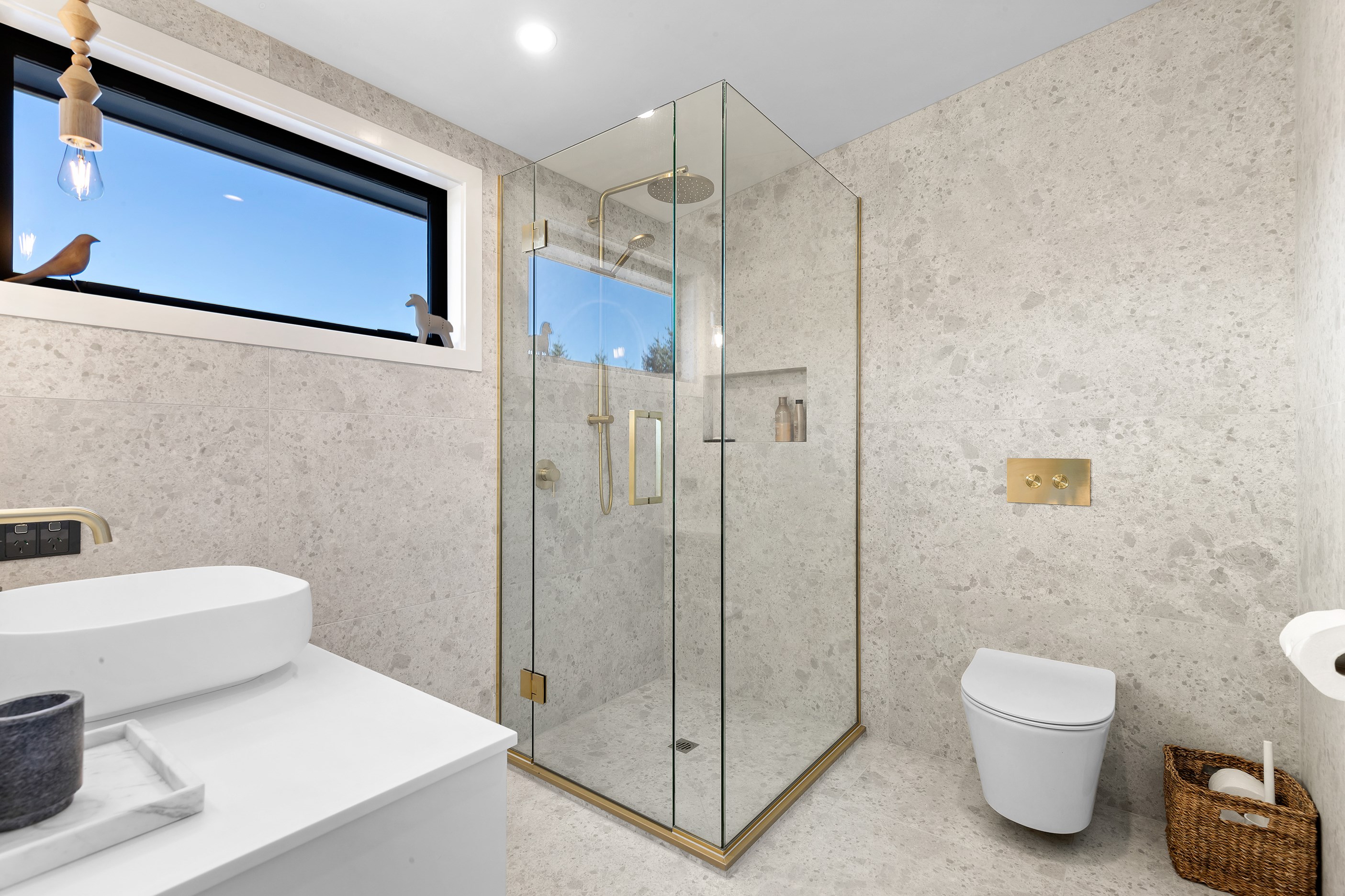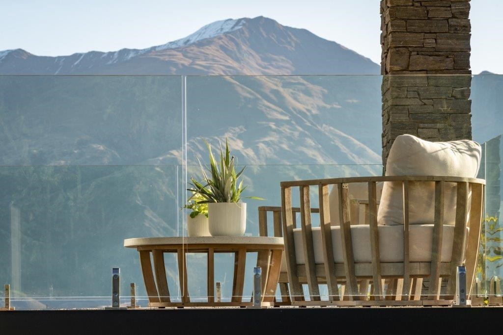 Upstairs, you’ll be greeted by panoramic lake and mountain views from the open-plan kitchen, dining area and living room, where a gas fireplace is seamlessly integrated. This room also opens to the northern balcony – a sheltered spot for alfresco dining year-round, thanks to an outdoor heater. The timeless kitchen has a broad island bench – perfect for hosting – plenty of storage, integrated bar fridge and a generous walk-in pantry. Finishing off the top floor is the luxurious main bedroom with a walk-in wardrobe and fully tiled ensuite bathroom. This home boasts quality finishes, including multiple appliances, underfloor heating, a ducted heat pump, generous skylights, local schist features and kwila decking – basically everything you need to live the good life.