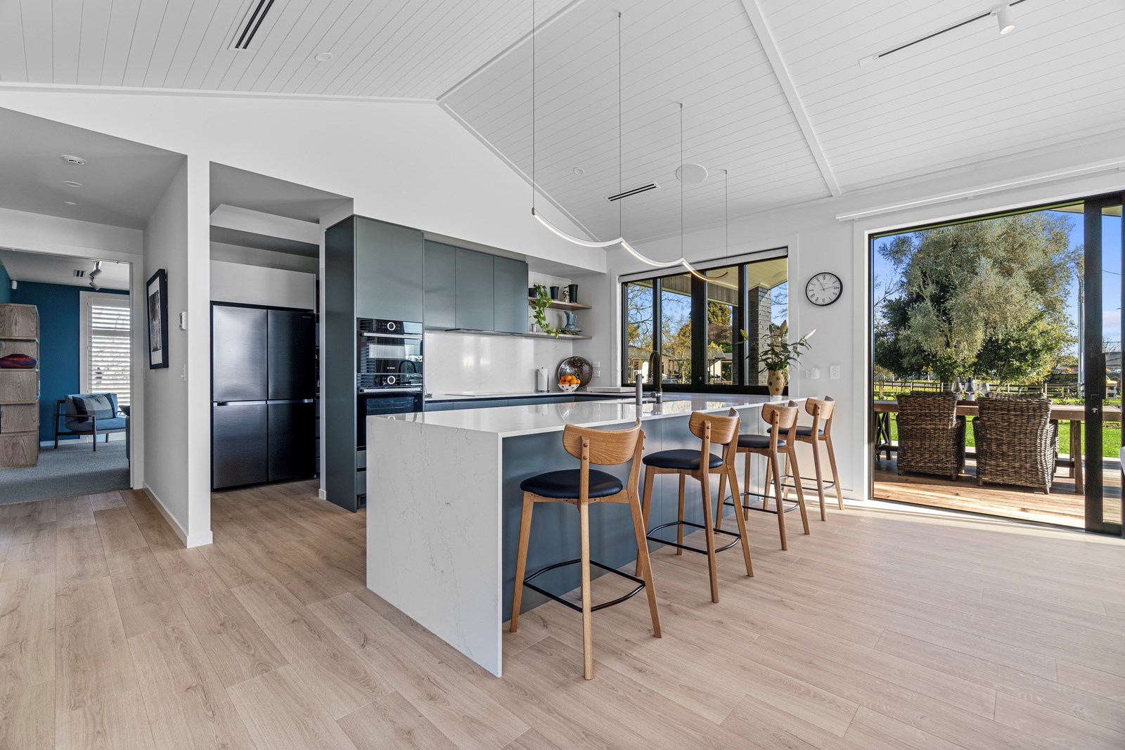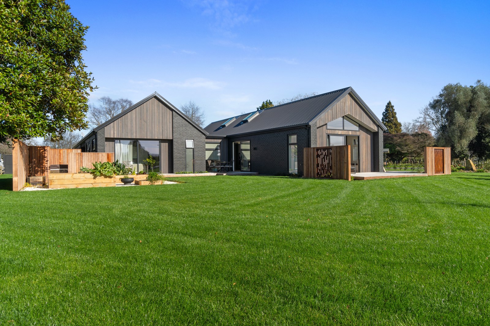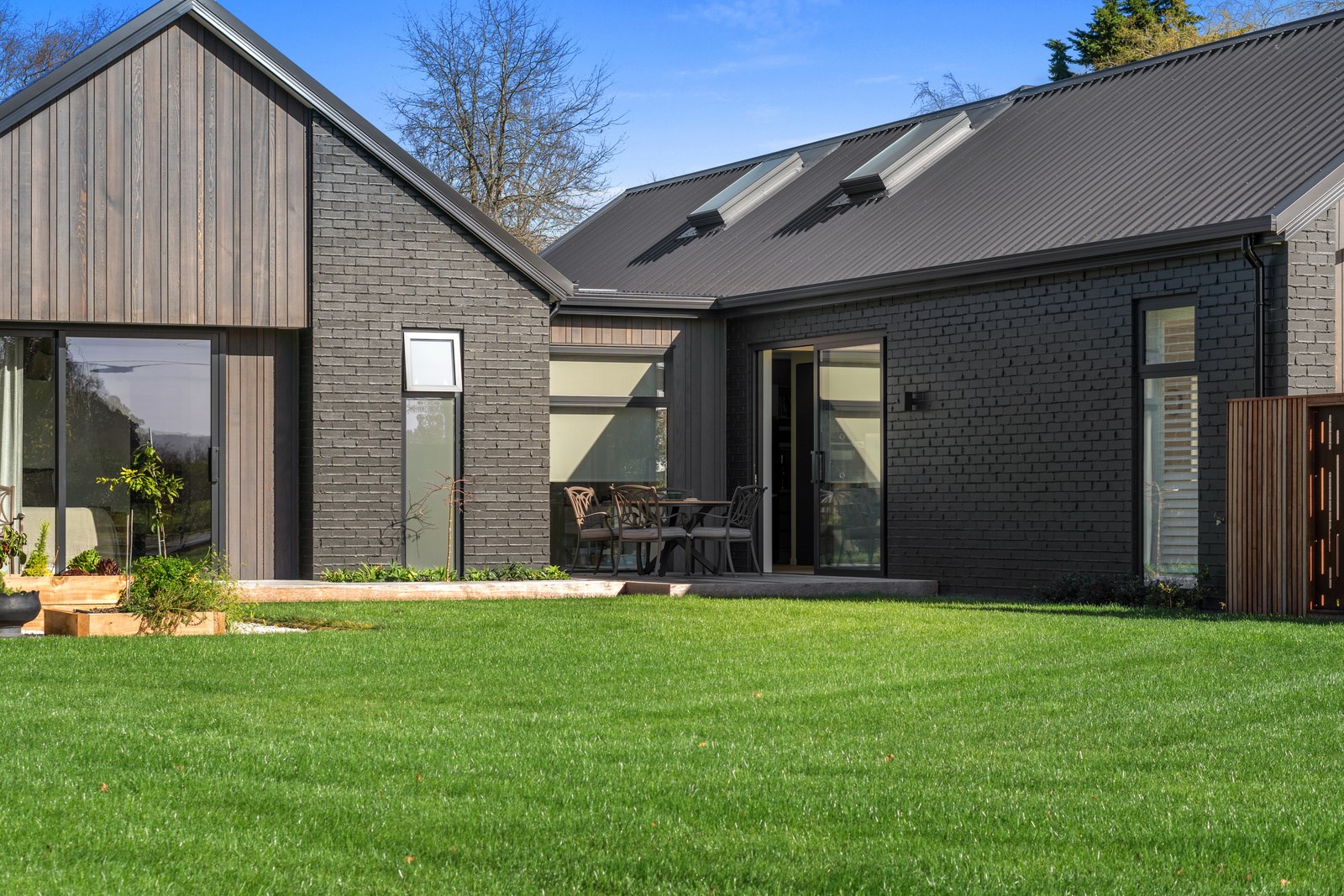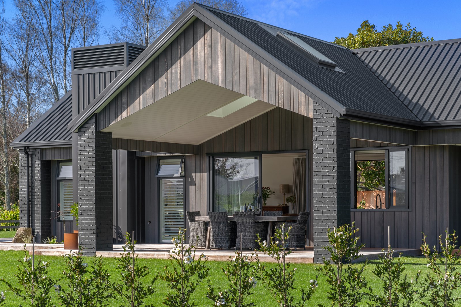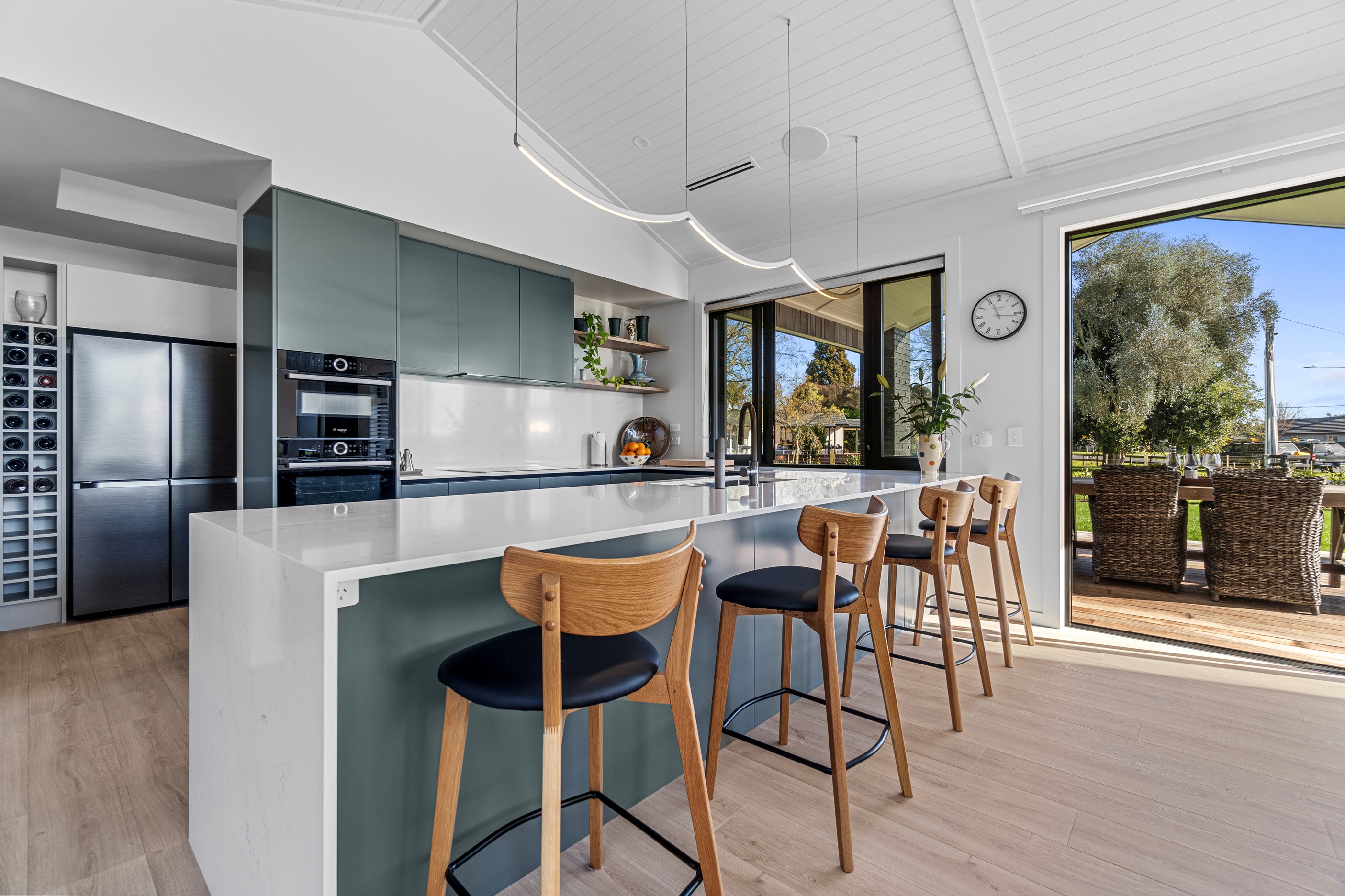 Relaxed retirement living doesn’t get any better than this. The three-bedroom home was custom designed for its owners who also wanted it be comfortable, practical and eco-friendly – without scrimping on style. It’s clear Linecrest Homes has delivered the lot with skill and care. It starts with the exterior of the two linked gabled wings, which are clad in combination of mixed-width vertical cedar and painted black brick with uneven mortar adding texture. It’s long, dark and handsome. A local interior designer helped shape the decor inside the 308sqm home. The cohesive palette was inspired by the blues and greens of nature. You’ll see this influence in bathroom tiles, kitchen cabinetry, wallpaper features, wall hues and more. Light pours in through skylights, clerestory windows and sliders that open to no fewer than three decks. One, a portico, flows from the open-plan kitchen, dining and living space so the owners can enjoy the home’s north-facing aspect year round.