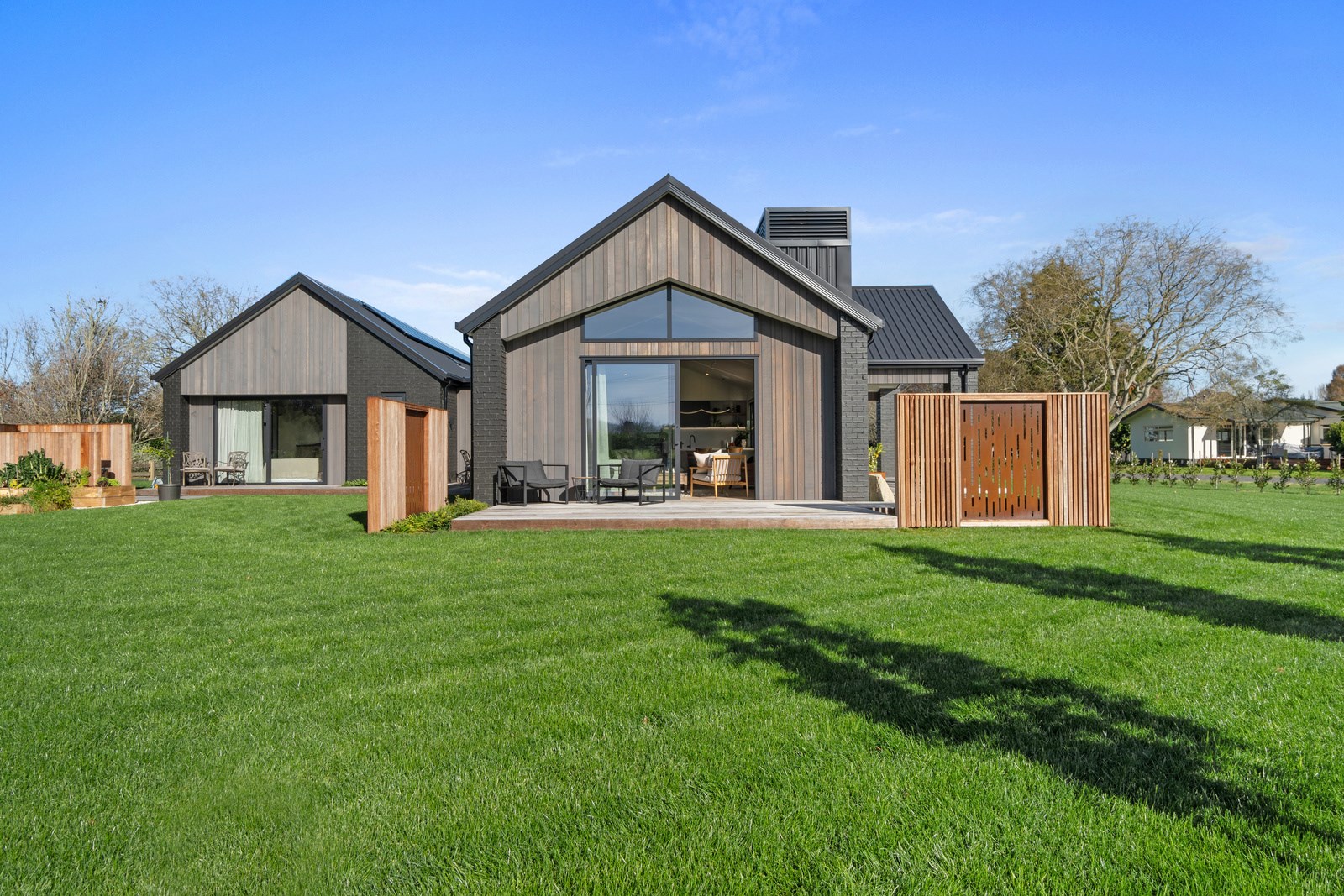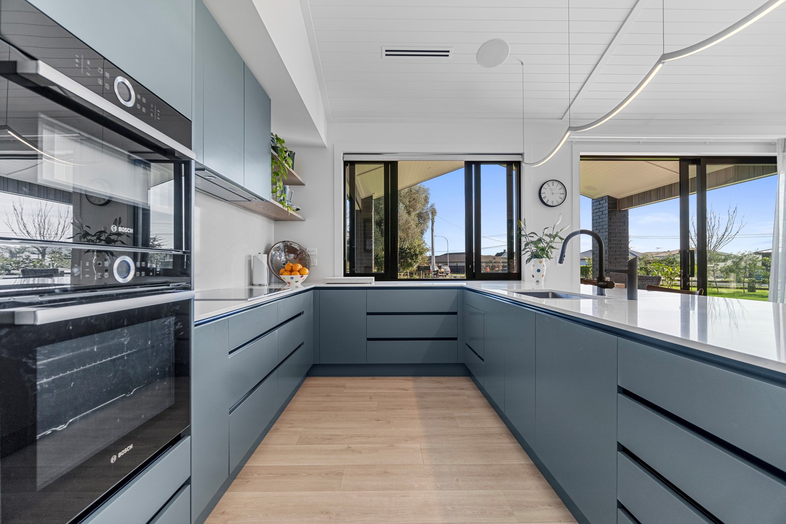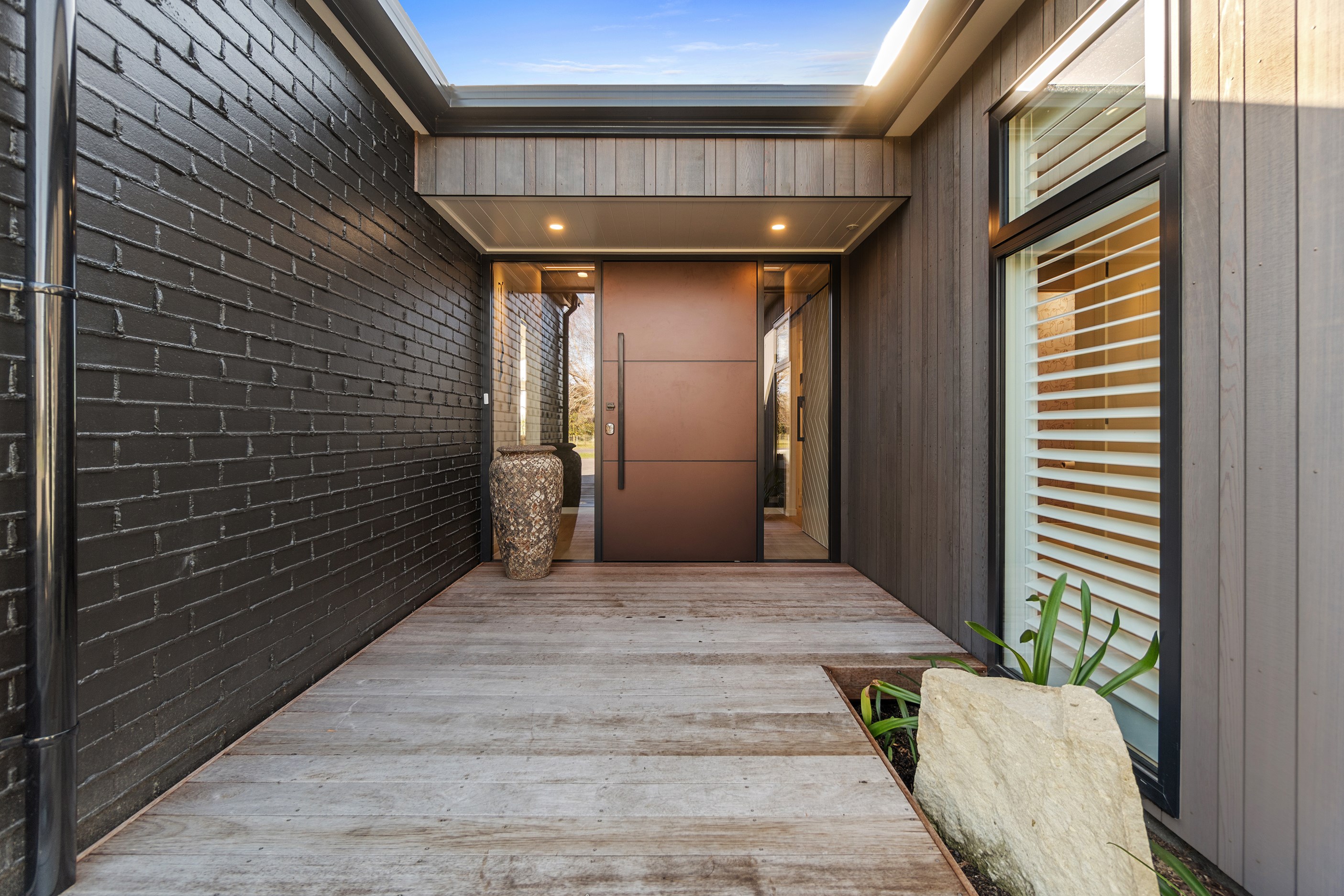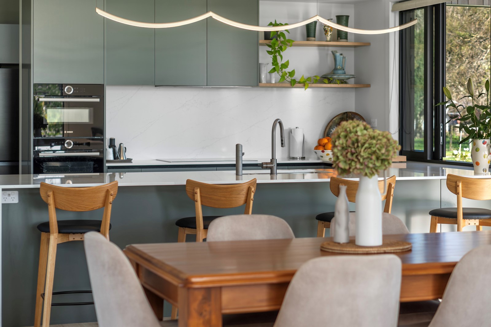 Relaxed retirement living doesn’t get any better than this. The three-bedroom home was custom designed for its owners who also wanted it be comfortable, practical and eco-friendly – without scrimping on style. It’s clear Linecrest Homes has delivered the lot with skill and care. It starts with the exterior of the two linked gabled wings, which are clad in combination of mixed-width vertical cedar and painted black brick with uneven mortar adding texture. It’s long, dark and handsome. A local interior designer helped shape the decor inside the 308sqm home. The cohesive palette was inspired by the blues and greens of nature. You’ll see this influence in bathroom tiles, kitchen cabinetry, wallpaper features, wall hues and more. Light pours in through skylights, clerestory windows and sliders that open to no fewer than three decks. One, a portico, flows from the open-plan kitchen, dining and living space so the owners can enjoy the home’s north-facing aspect year round.