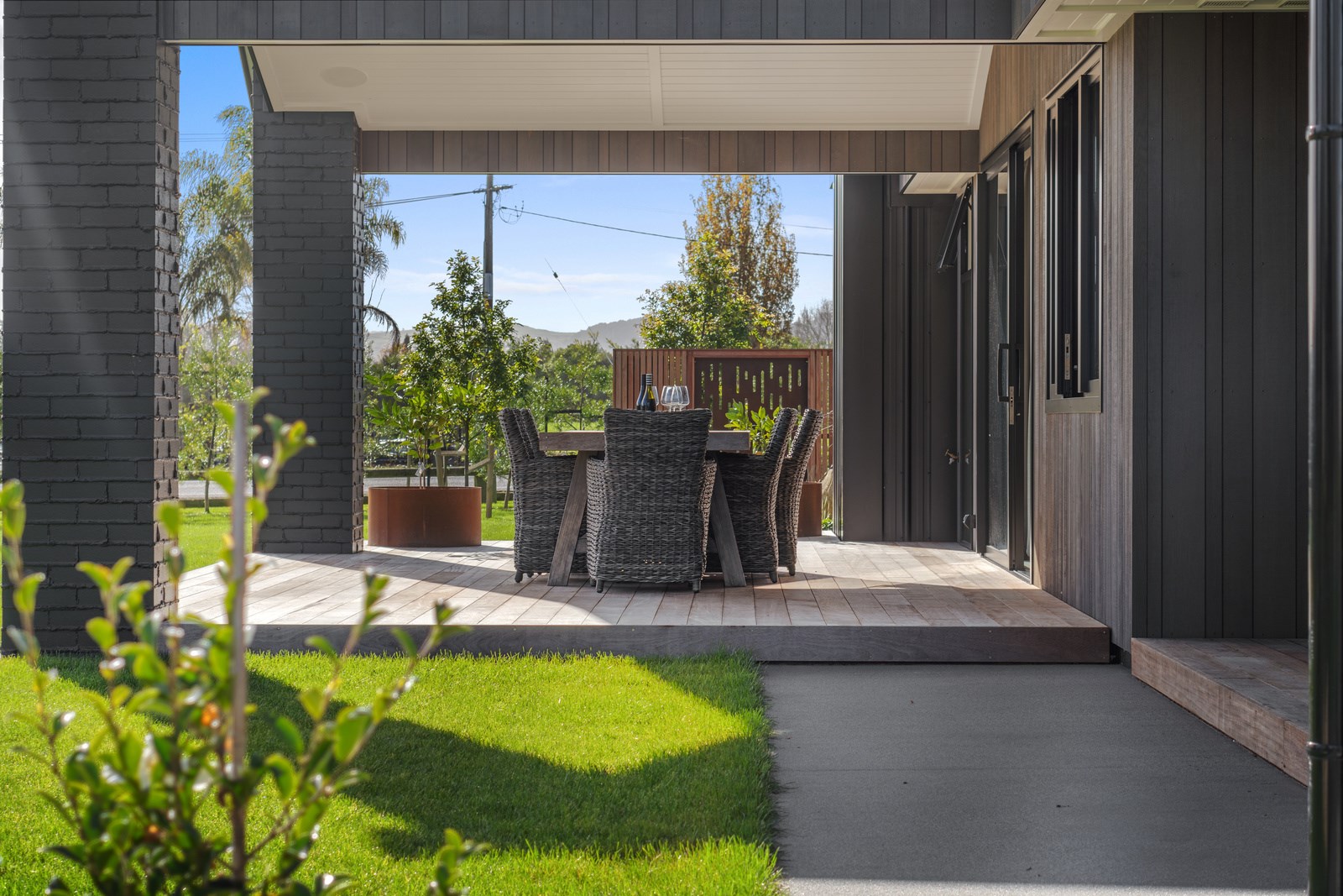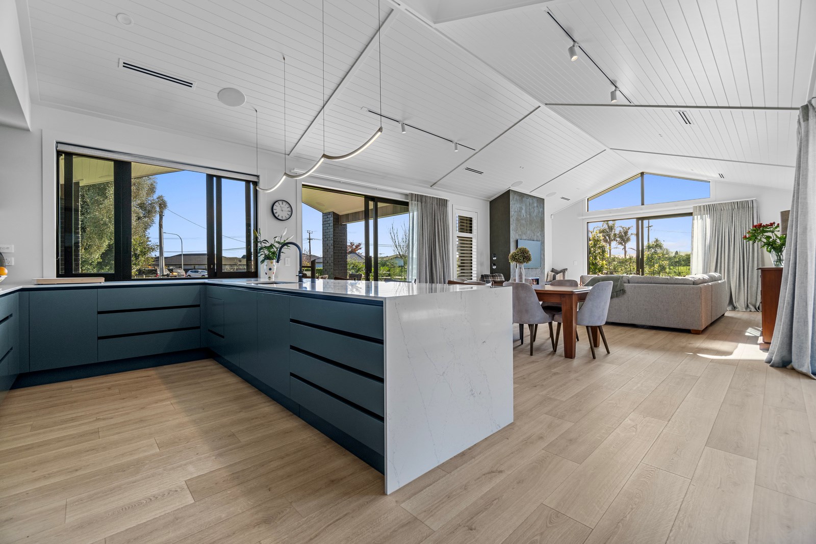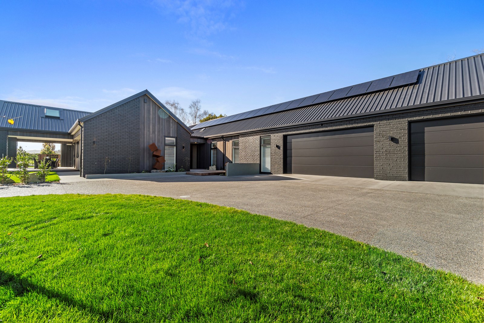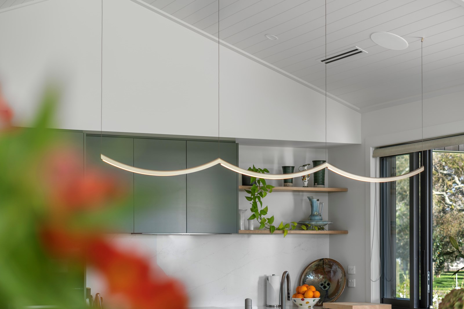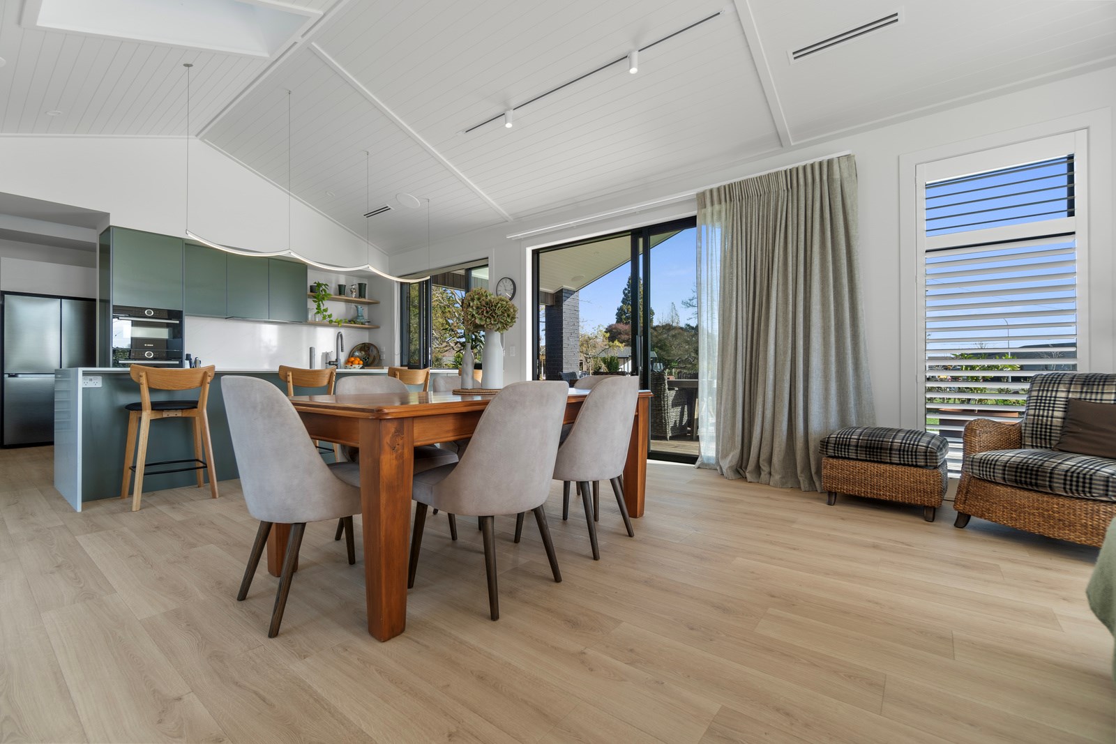 Relaxed retirement living doesn’t get any better than this. The three-bedroom home was custom designed for its owners who also wanted it be comfortable, practical and eco-friendly – without scrimping on style. It’s clear Linecrest Homes has delivered the lot with skill and care. It starts with the exterior of the two linked gabled wings, which are clad in combination of mixed-width vertical cedar and painted black brick with uneven mortar adding texture. It’s long, dark and handsome. A local interior designer helped shape the decor inside the 308sqm home. The cohesive palette was inspired by the blues and greens of nature. You’ll see this influence in bathroom tiles, kitchen cabinetry, wallpaper features, wall hues and more. Light pours in through skylights, clerestory windows and sliders that open to no fewer than three decks. One, a portico, flows from the open-plan kitchen, dining and living space so the owners can enjoy the home’s north-facing aspect year round.
