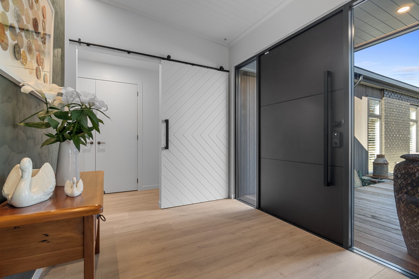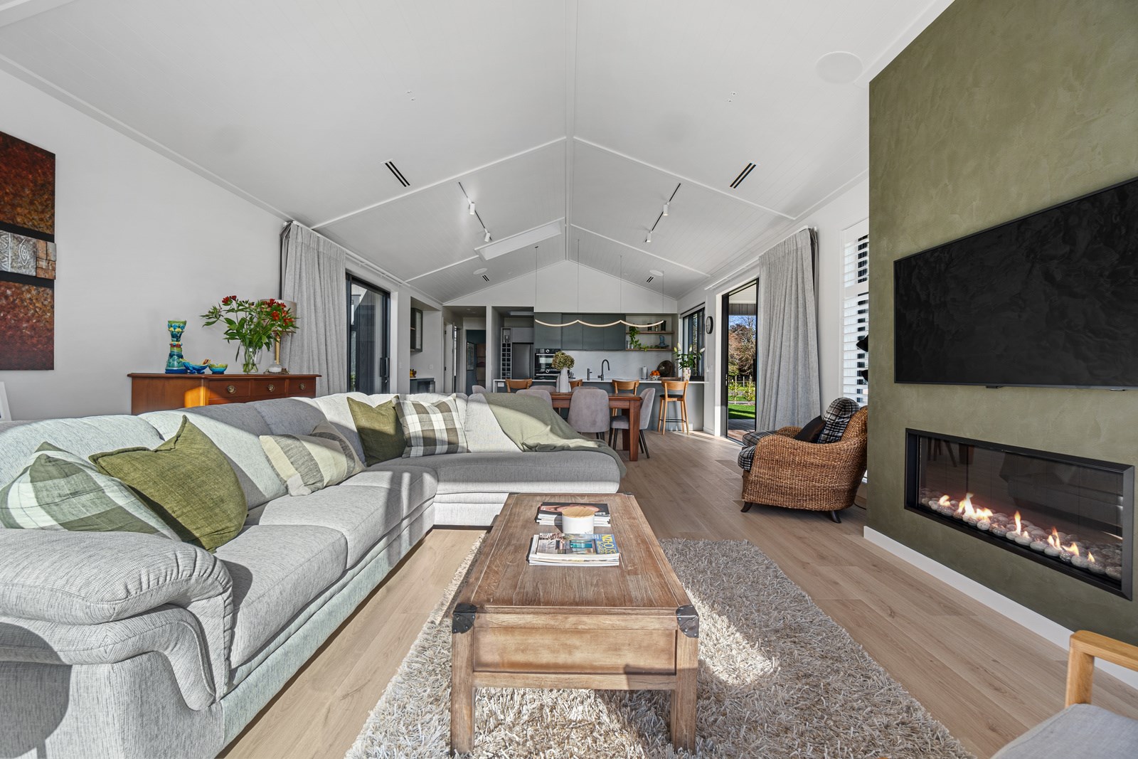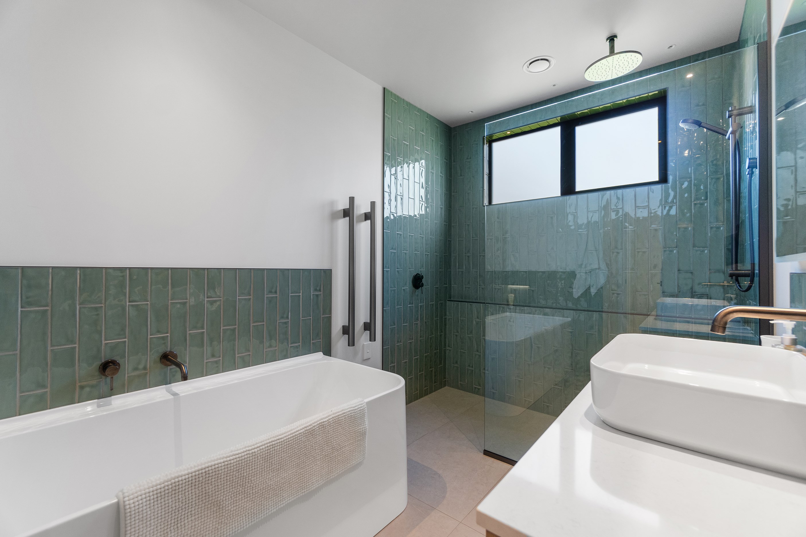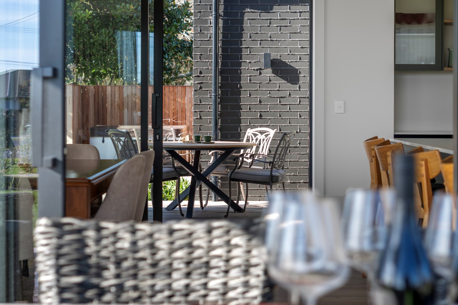 Relaxed retirement living doesn’t get any better than this. The three-bedroom home was custom designed for its owners who also wanted it be comfortable, practical and eco-friendly – without scrimping on style. It’s clear Linecrest Homes has delivered the lot with skill and care. It starts with the exterior of the two linked gabled wings, which are clad in combination of mixed-width vertical cedar and painted black brick with uneven mortar adding texture. It’s long, dark and handsome. A local interior designer helped shape the decor inside the 308sqm home. The cohesive palette was inspired by the blues and greens of nature. You’ll see this influence in bathroom tiles, kitchen cabinetry, wallpaper features, wall hues and more. Light pours in through skylights, clerestory windows and sliders that open to no fewer than three decks. One, a portico, flows from the open-plan kitchen, dining and living space so the owners can enjoy the home’s north-facing aspect year round.