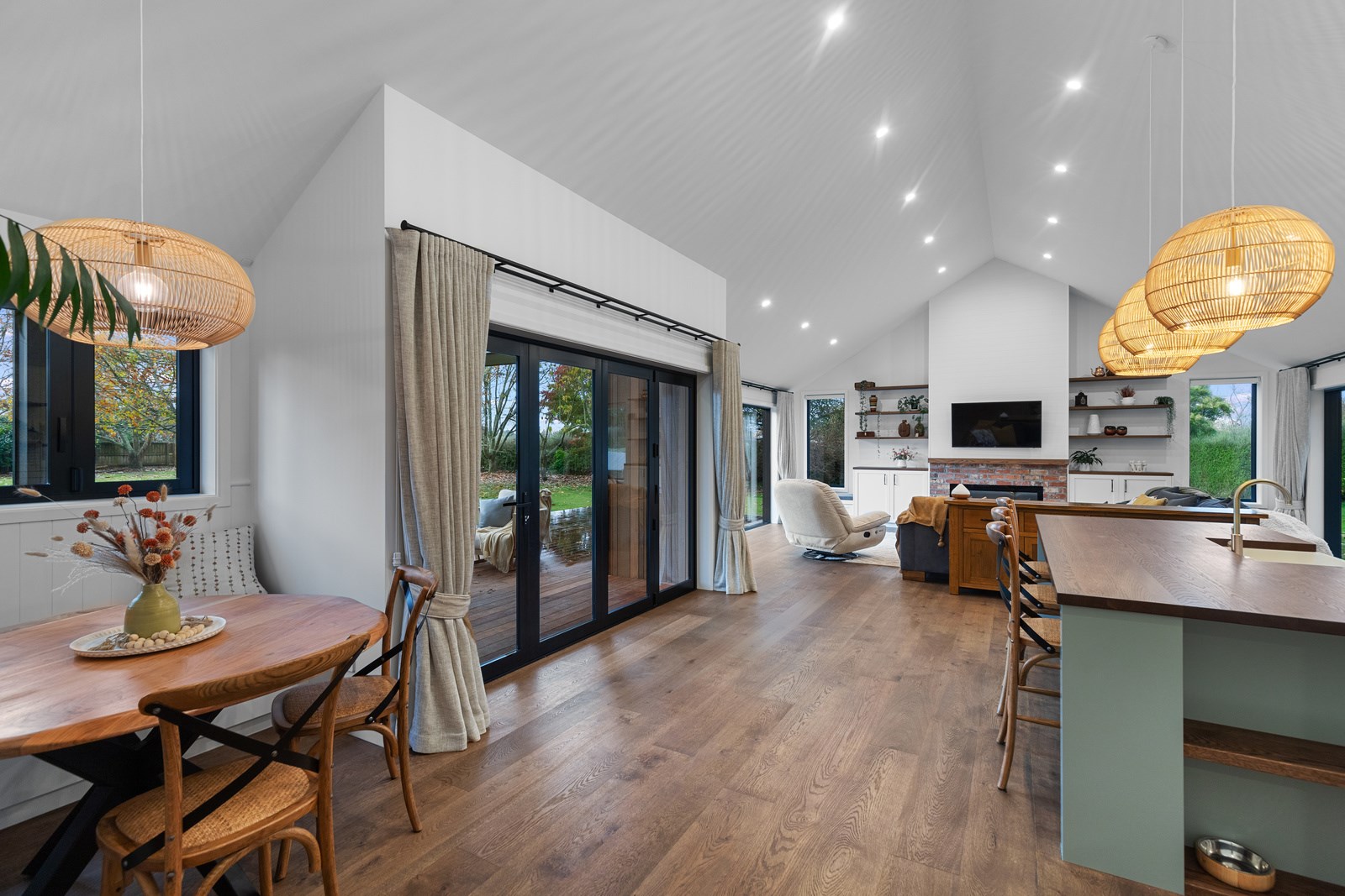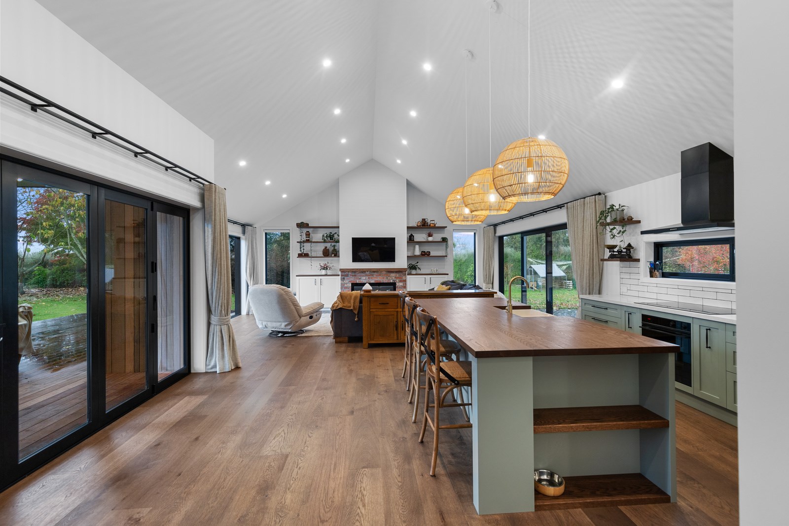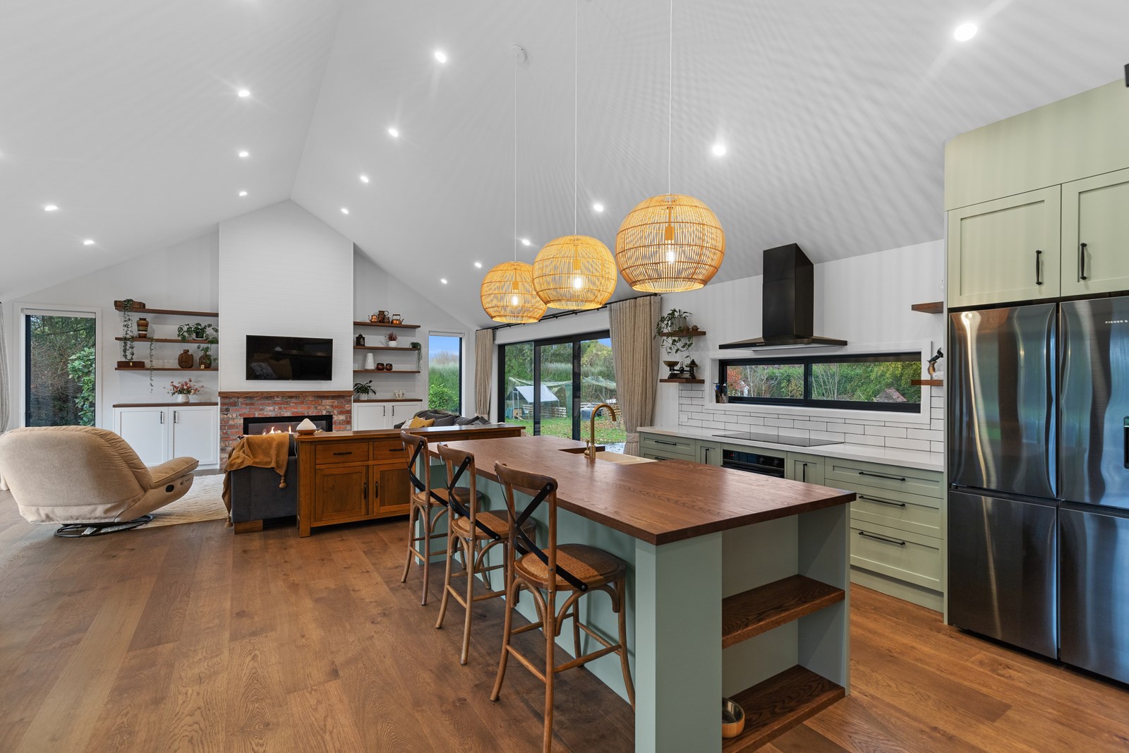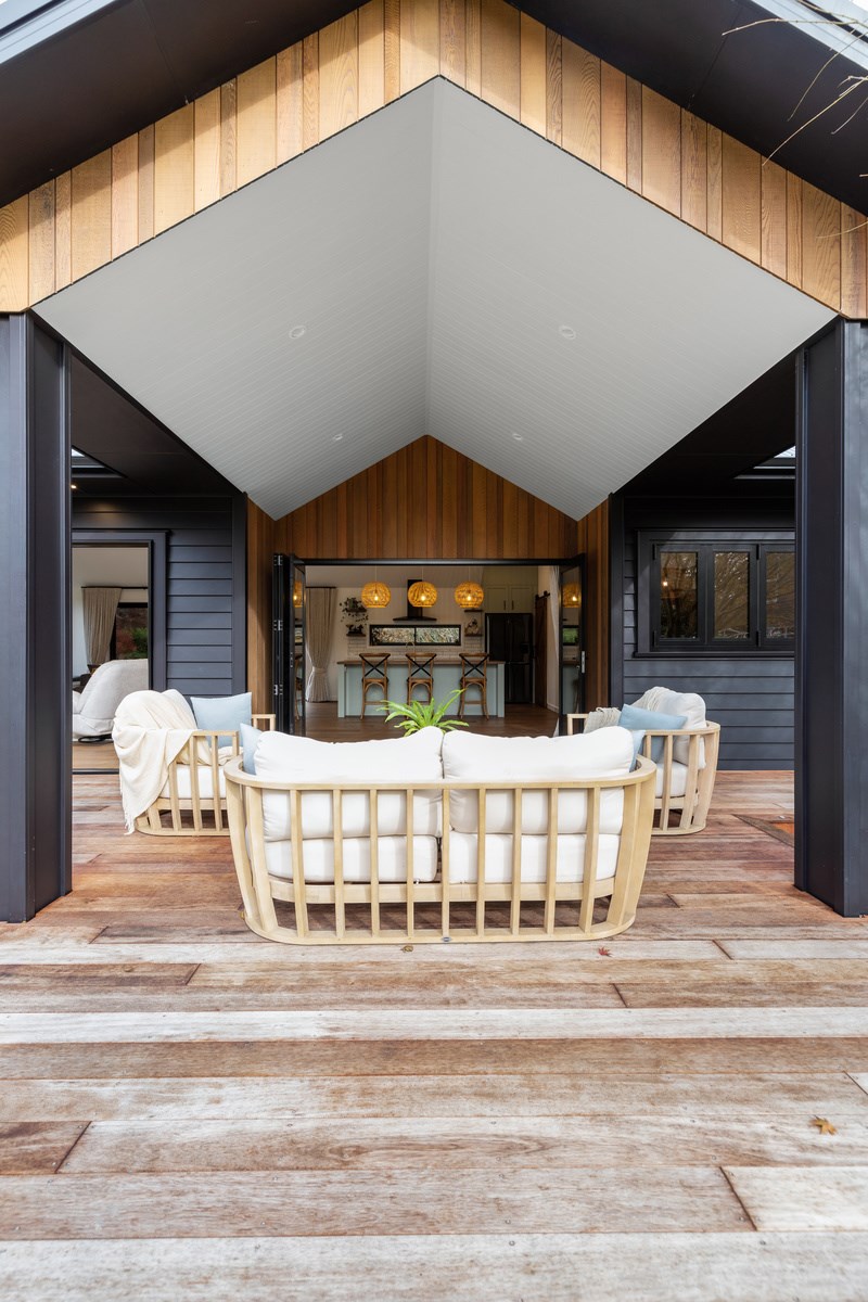Country boho meets contemporary cool in this 167sqm house full of natural light, sleek wood and plush furnishings. The tour of this lovely rural home clad in shiplap cedar and weatherboards, starts at a welcoming kwila boardwalk and entrance portico. Then to the practical: the mudroom is a place to dump schoolbags along with dirty clothes and boots. It has a macrocarpa bench, a large cupboard and walls painted a tasteful sage – a colour repeated in various shades throughout the property. Open the barn door, turn right and you’ll catch a glimpse of the 4.5m-high cathedral ceiling that required a crane to lift the frames into place. You’ll also notice custom shelving and a fireplace made with bricks salvaged from the demolished family home of the owner.