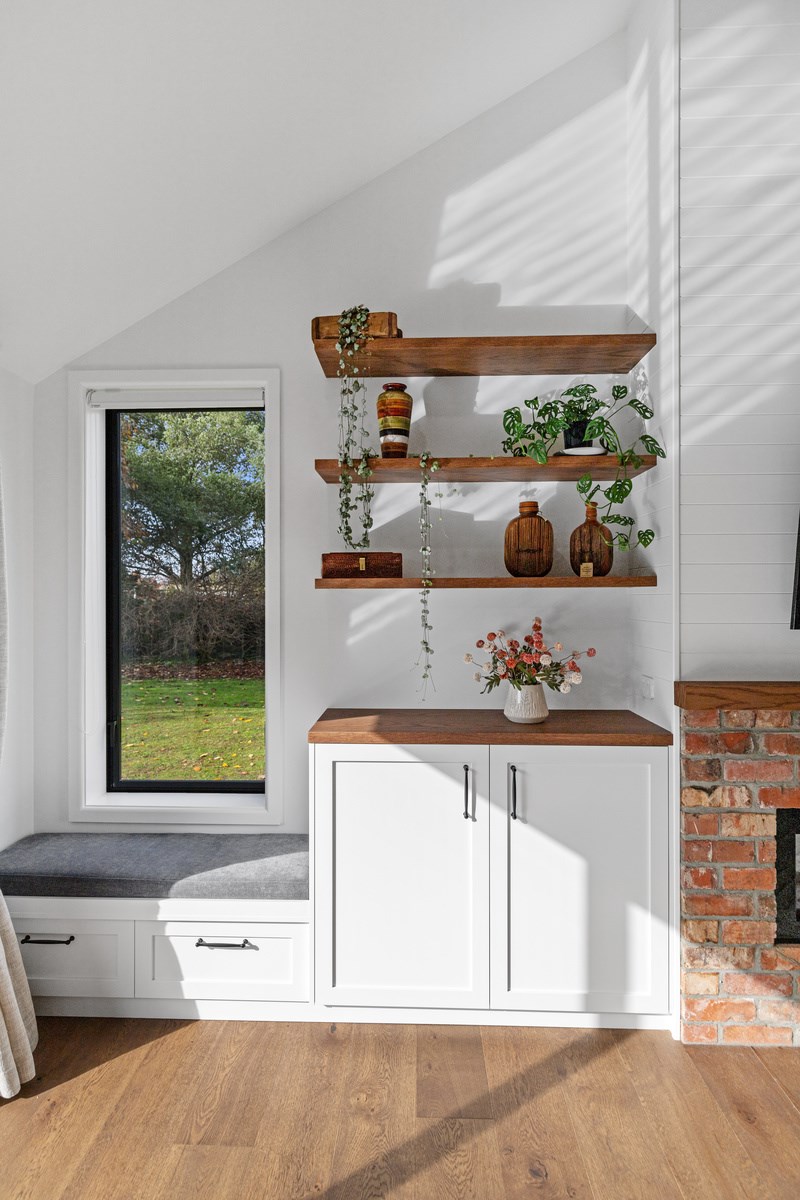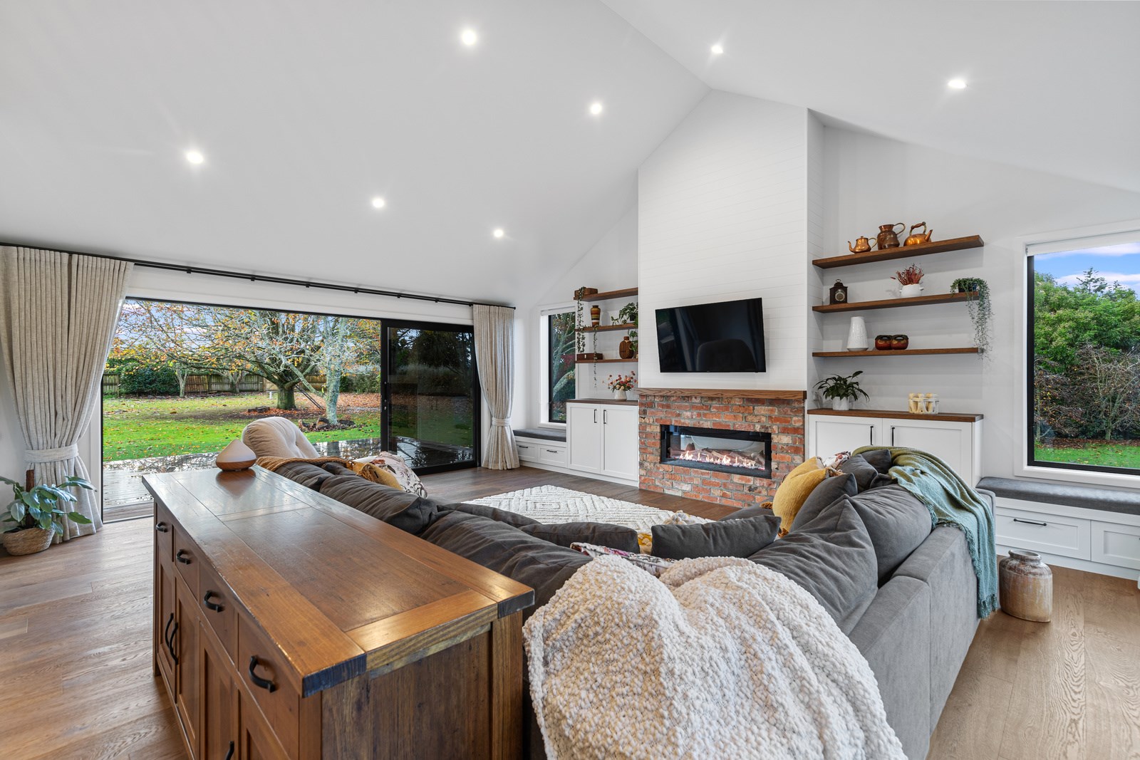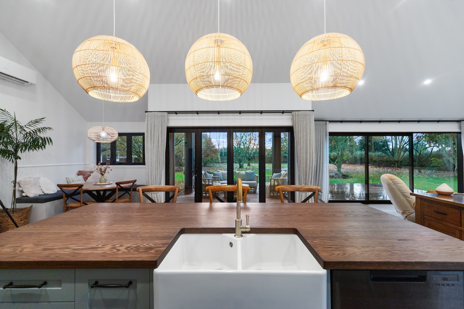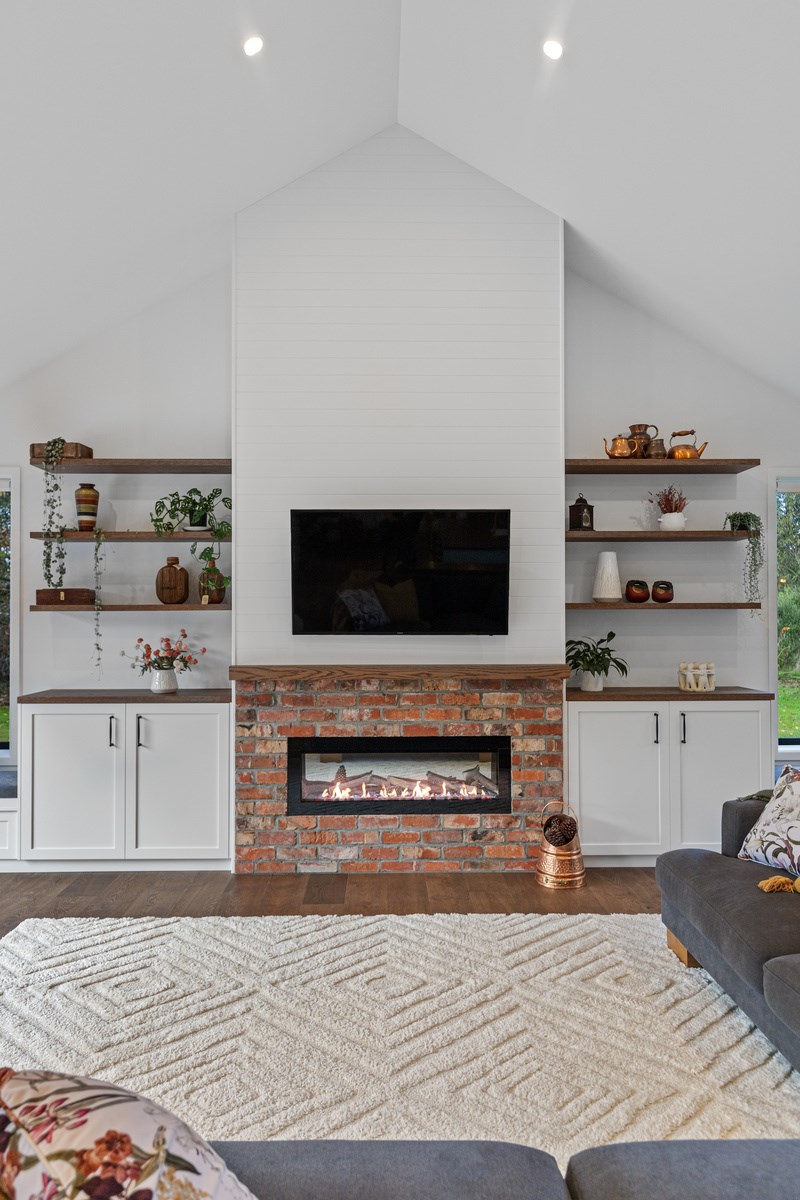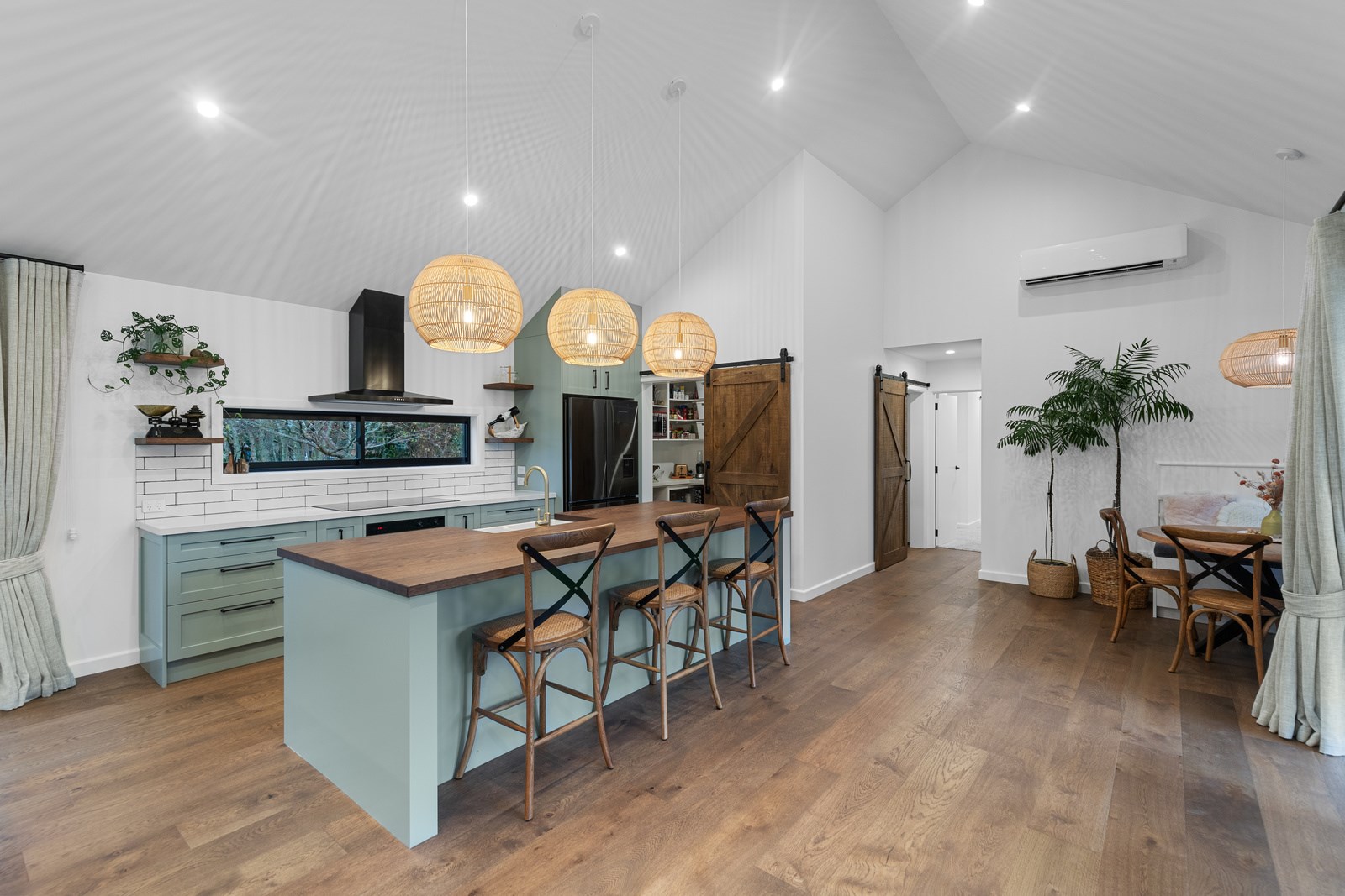 Country boho meets contemporary cool in this 167sqm house full of natural light, sleek wood and plush furnishings. The tour of this lovely rural home clad in shiplap cedar and weatherboards, starts at a welcoming kwila boardwalk and entrance portico. Then to the practical: the mudroom is a place to dump schoolbags along with dirty clothes and boots. It has a macrocarpa bench, a large cupboard and walls painted a tasteful sage – a colour repeated in various shades throughout the property. Open the barn door, turn right and you’ll catch a glimpse of the 4.5m-high cathedral ceiling that required a crane to lift the frames into place. You’ll also notice custom shelving and a fireplace made with bricks salvaged from the demolished family home of the owner.