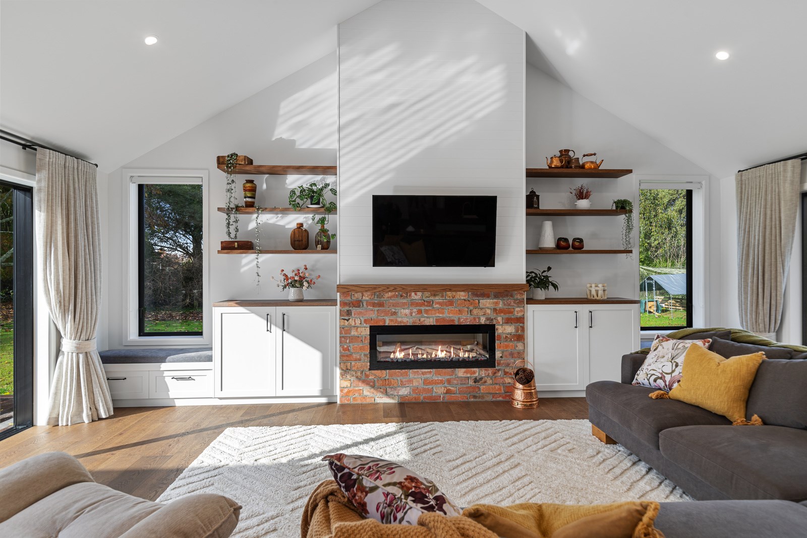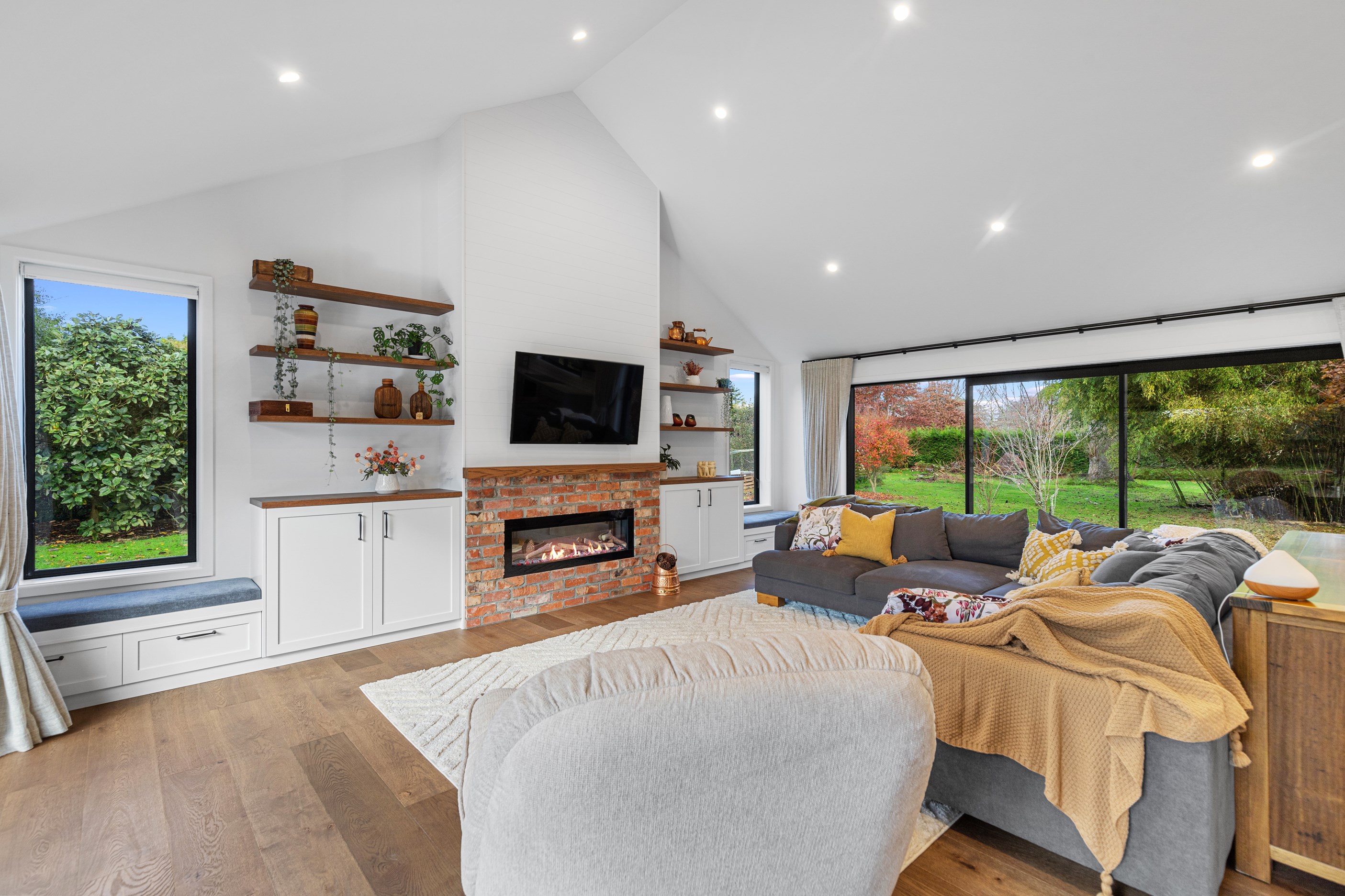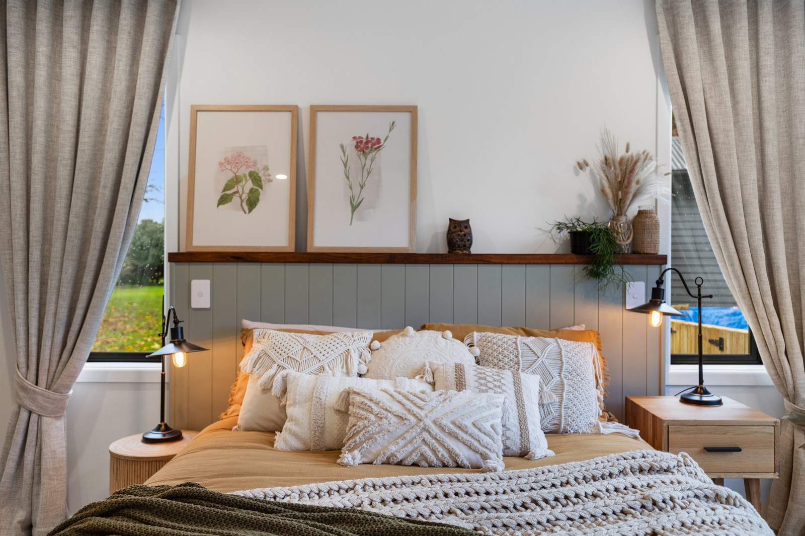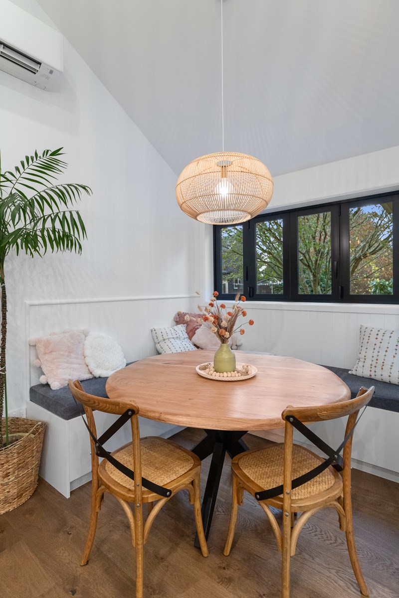 Country boho meets contemporary cool in this 167sqm house full of natural light, sleek wood and plush furnishings. The tour of this lovely rural home clad in shiplap cedar and weatherboards, starts at a welcoming kwila boardwalk and entrance portico. Then to the practical: the mudroom is a place to dump schoolbags along with dirty clothes and boots. It has a macrocarpa bench, a large cupboard and walls painted a tasteful sage – a colour repeated in various shades throughout the property. Open the barn door, turn right and you’ll catch a glimpse of the 4.5m-high cathedral ceiling that required a crane to lift the frames into place. You’ll also notice custom shelving and a fireplace made with bricks salvaged from the demolished family home of the owner.