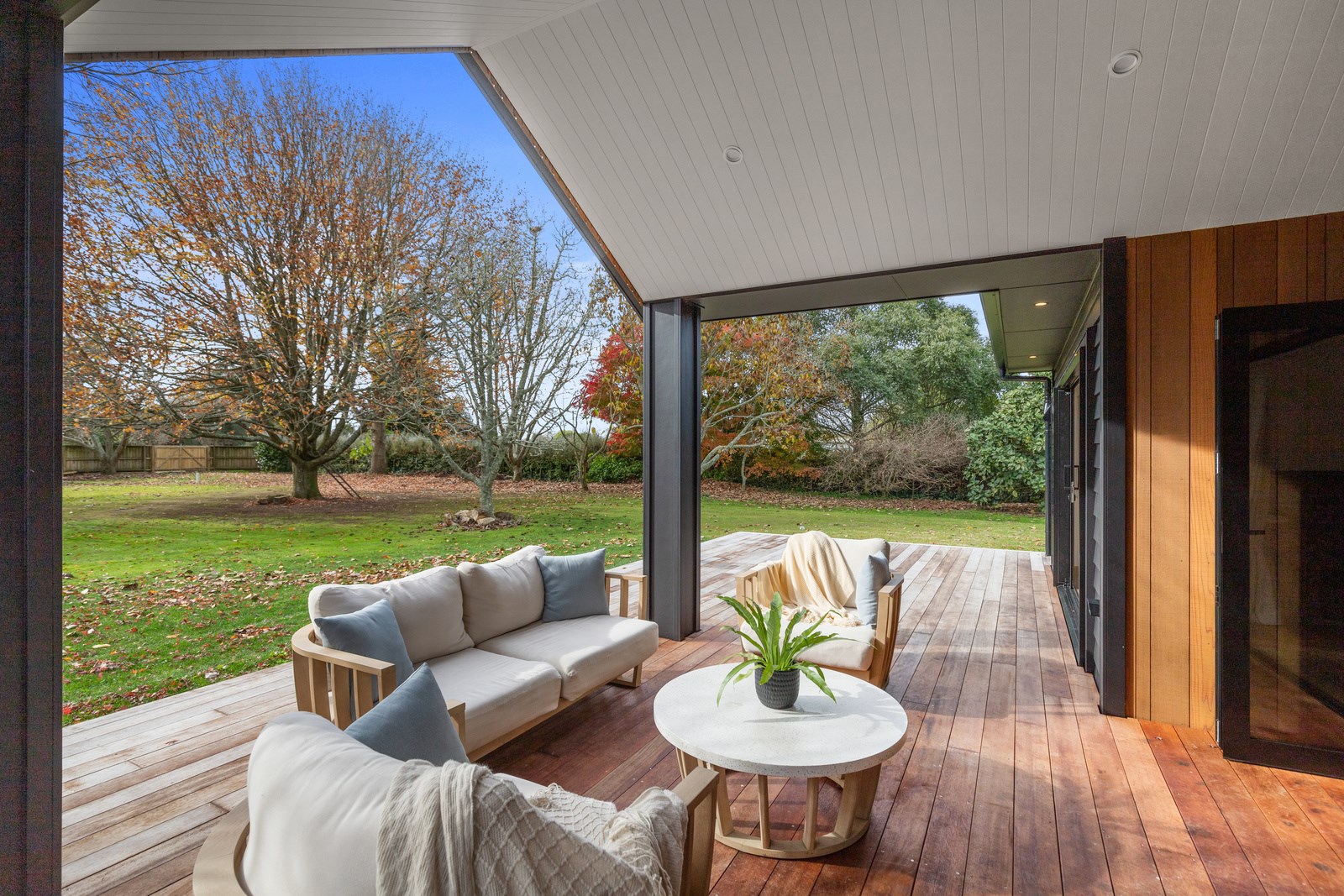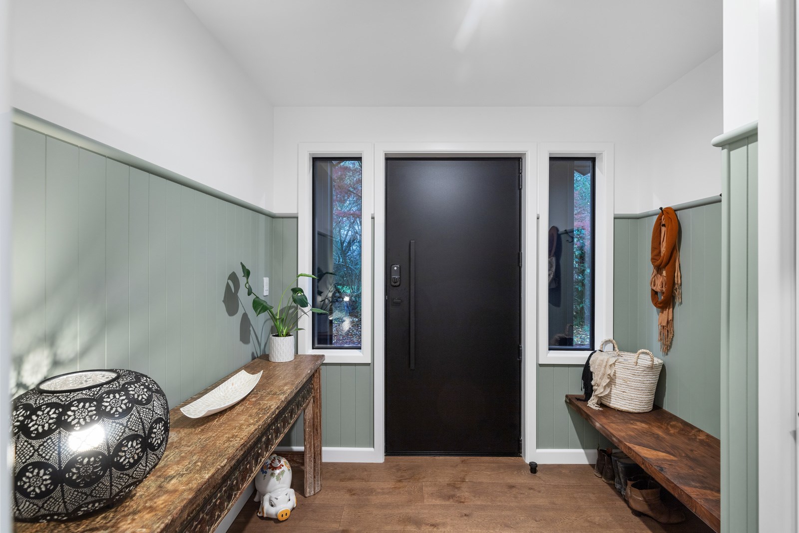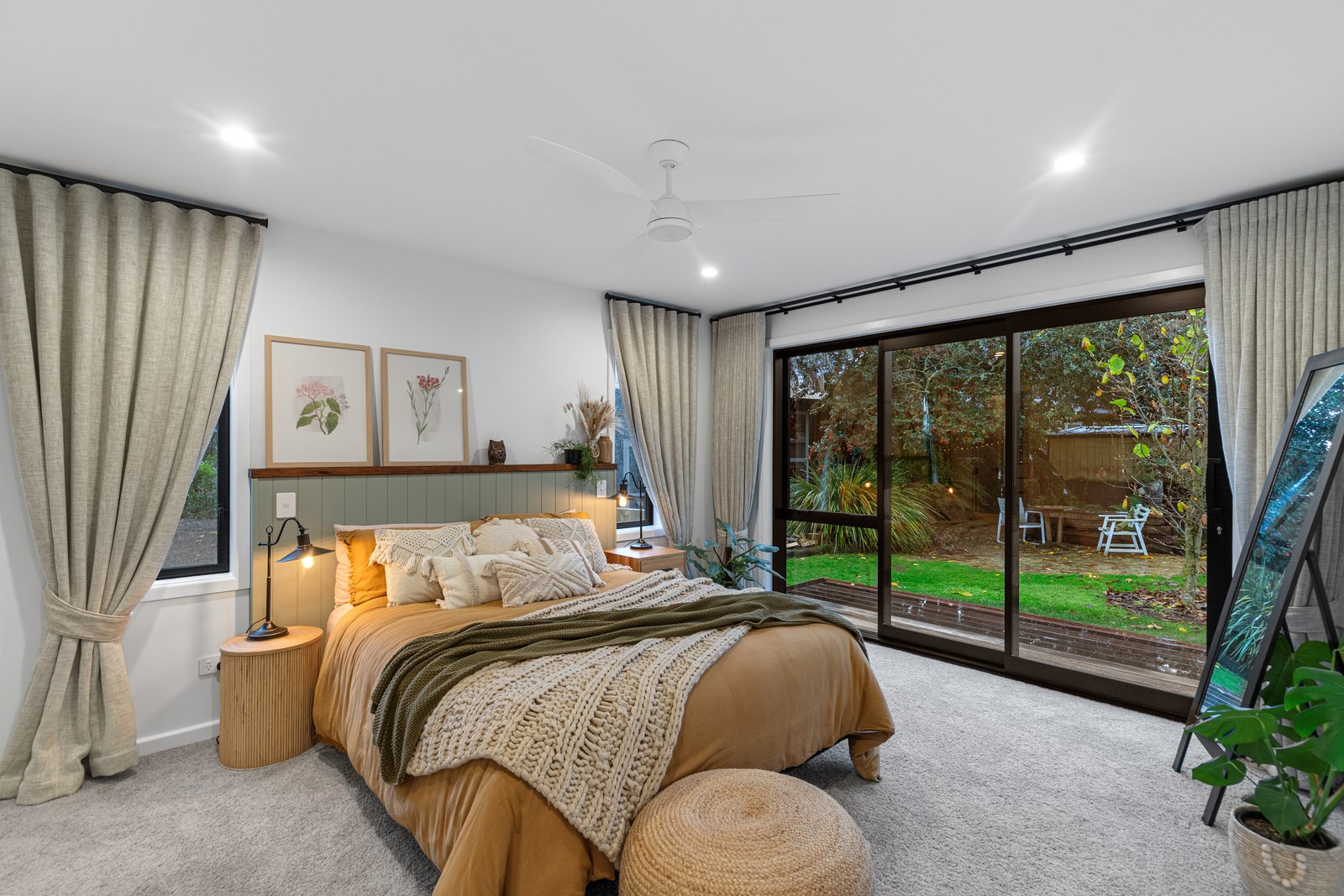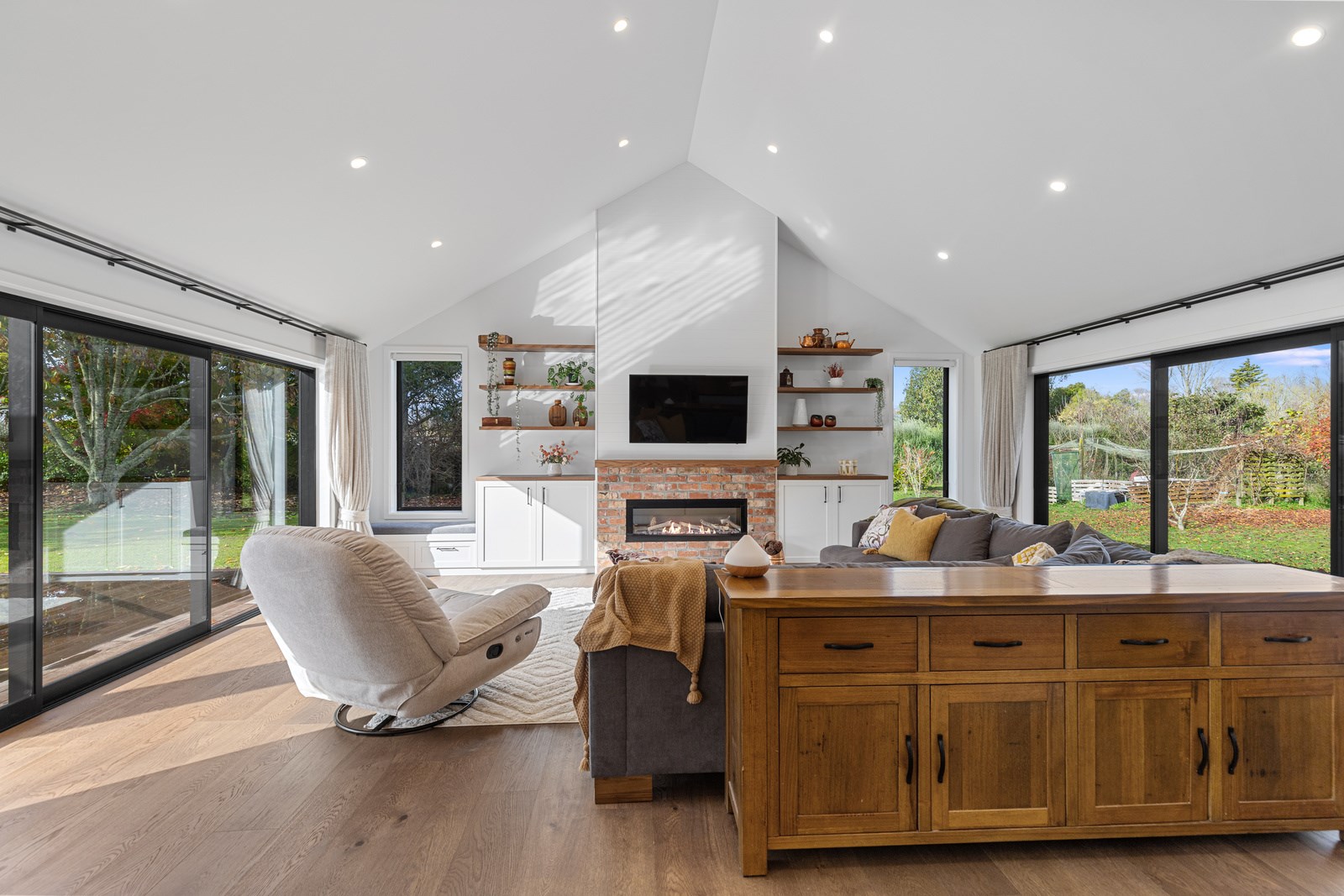 Country boho meets contemporary cool in this 167sqm house full of natural light, sleek wood and plush furnishings. The tour of this lovely rural home clad in shiplap cedar and weatherboards, starts at a welcoming kwila boardwalk and entrance portico. Then to the practical: the mudroom is a place to dump schoolbags along with dirty clothes and boots. It has a macrocarpa bench, a large cupboard and walls painted a tasteful sage – a colour repeated in various shades throughout the property. Open the barn door, turn right and you’ll catch a glimpse of the 4.5m-high cathedral ceiling that required a crane to lift the frames into place. You’ll also notice custom shelving and a fireplace made with bricks salvaged from the demolished family home of the owner.