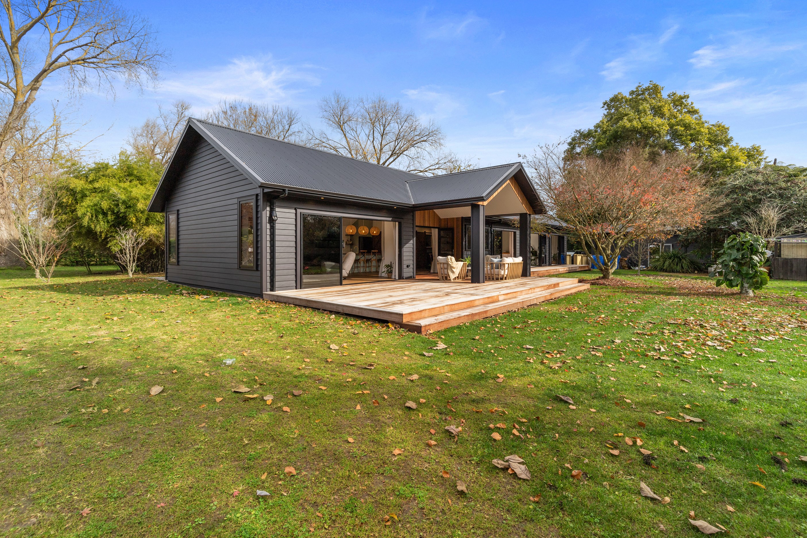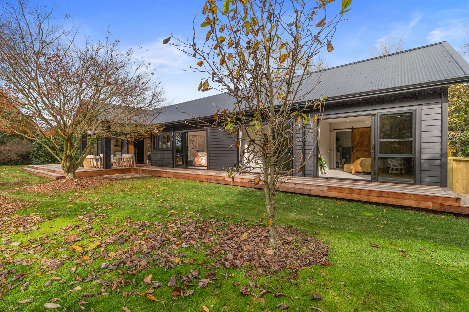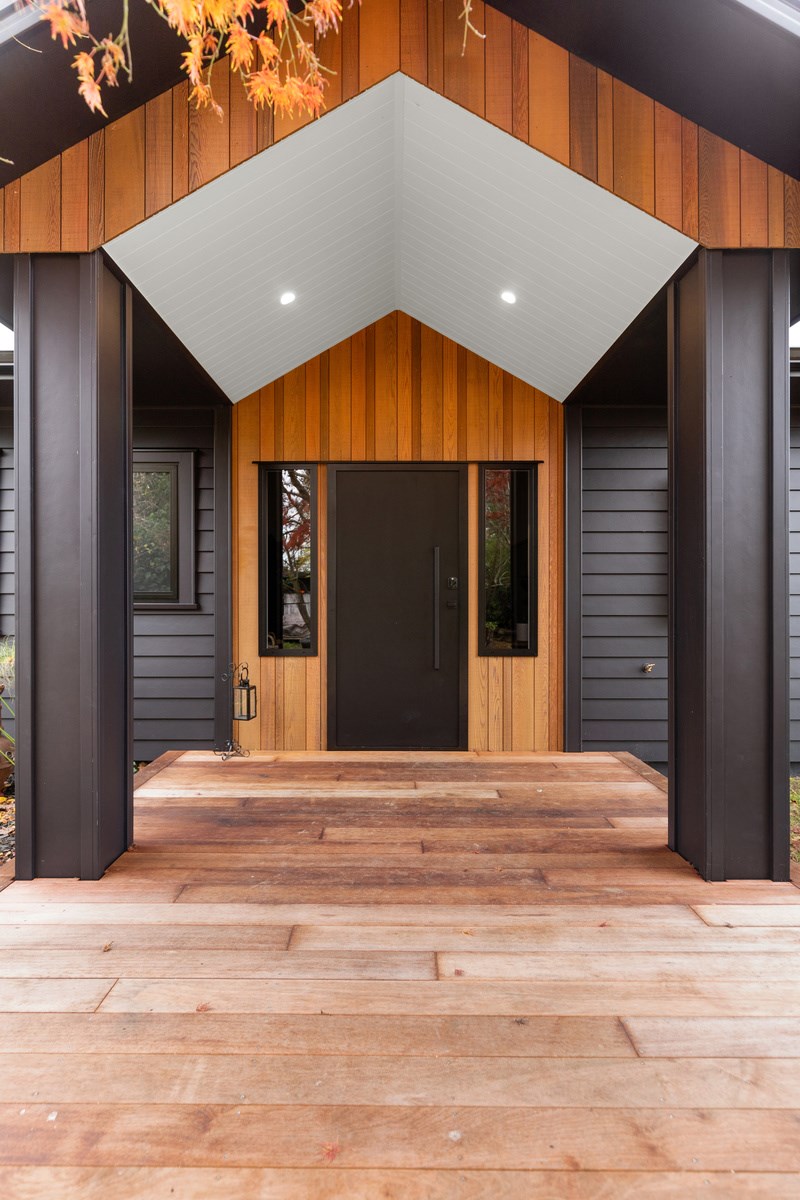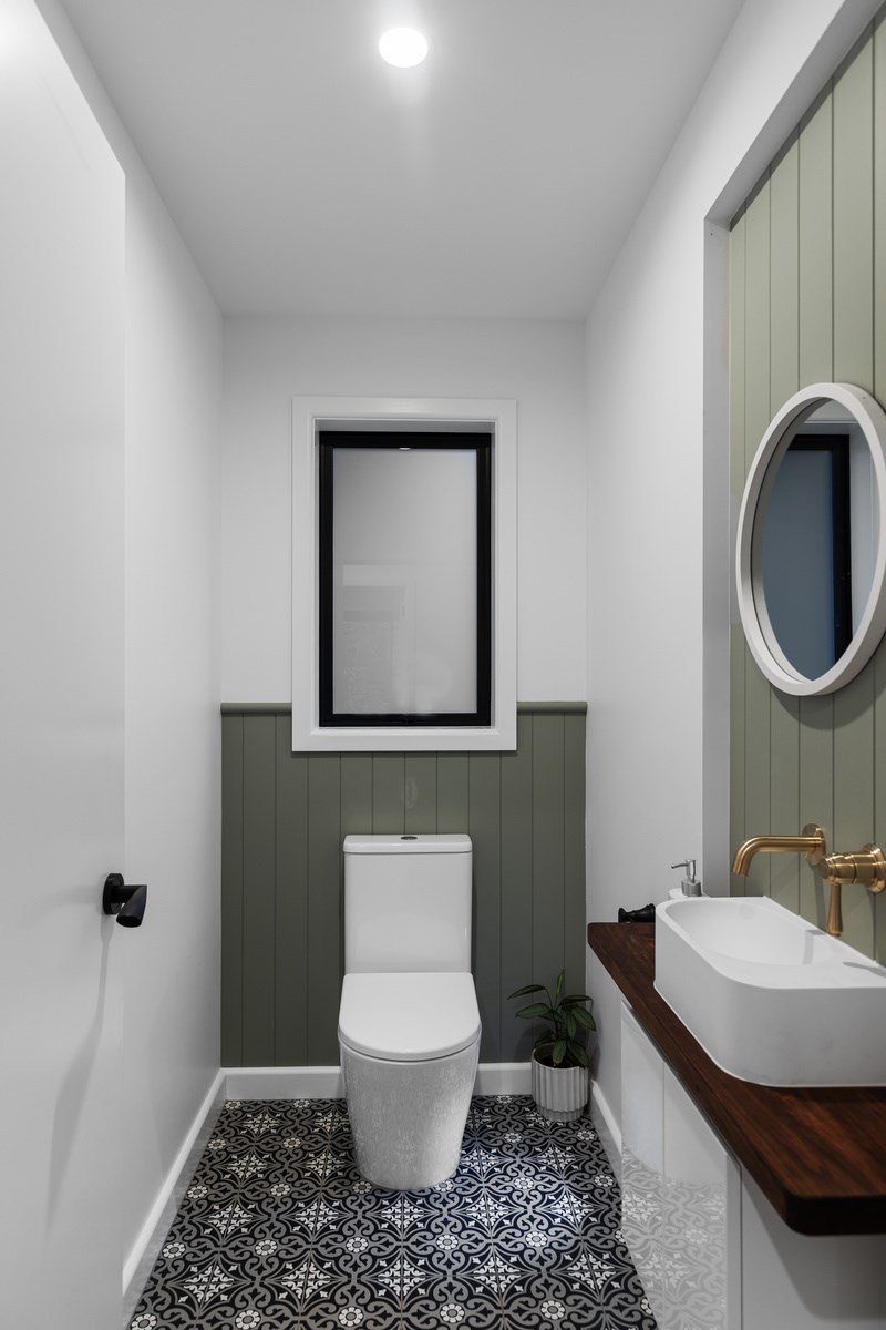 Macrocarpa in bedrooms and bathrooms came from the same source. The inviting open-plan living area has three sets of sliders that usher in light and views of the green surrounds. Flowing from these are 85sqm of kwila decks, including a portico. The kitchen, with more sage, has a walk-in pantry with light sensor. Among three bedrooms is the luxurious main suite featuring an ensuite where a floor-to-ceiling window allows garden views. Exterior screens offer privacy. The family bathroom and powder room repeat the sage which is complemented with brass and funky tiles. This forever home is also fitted with smart-vent technology to support healthy living.