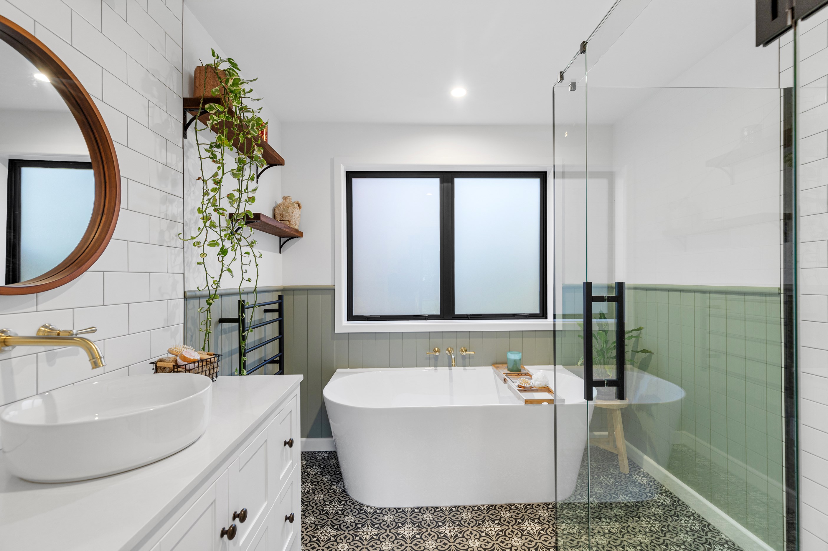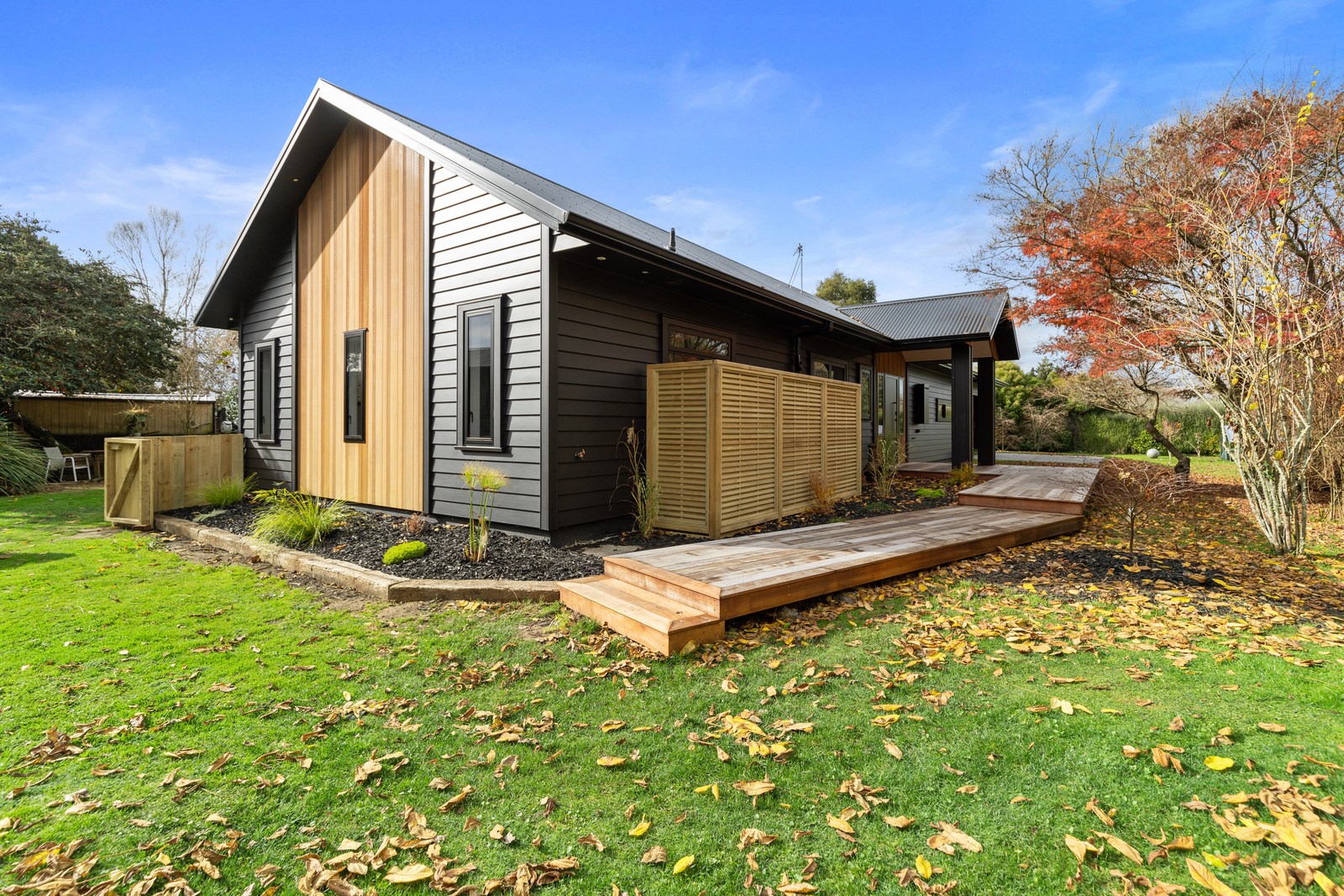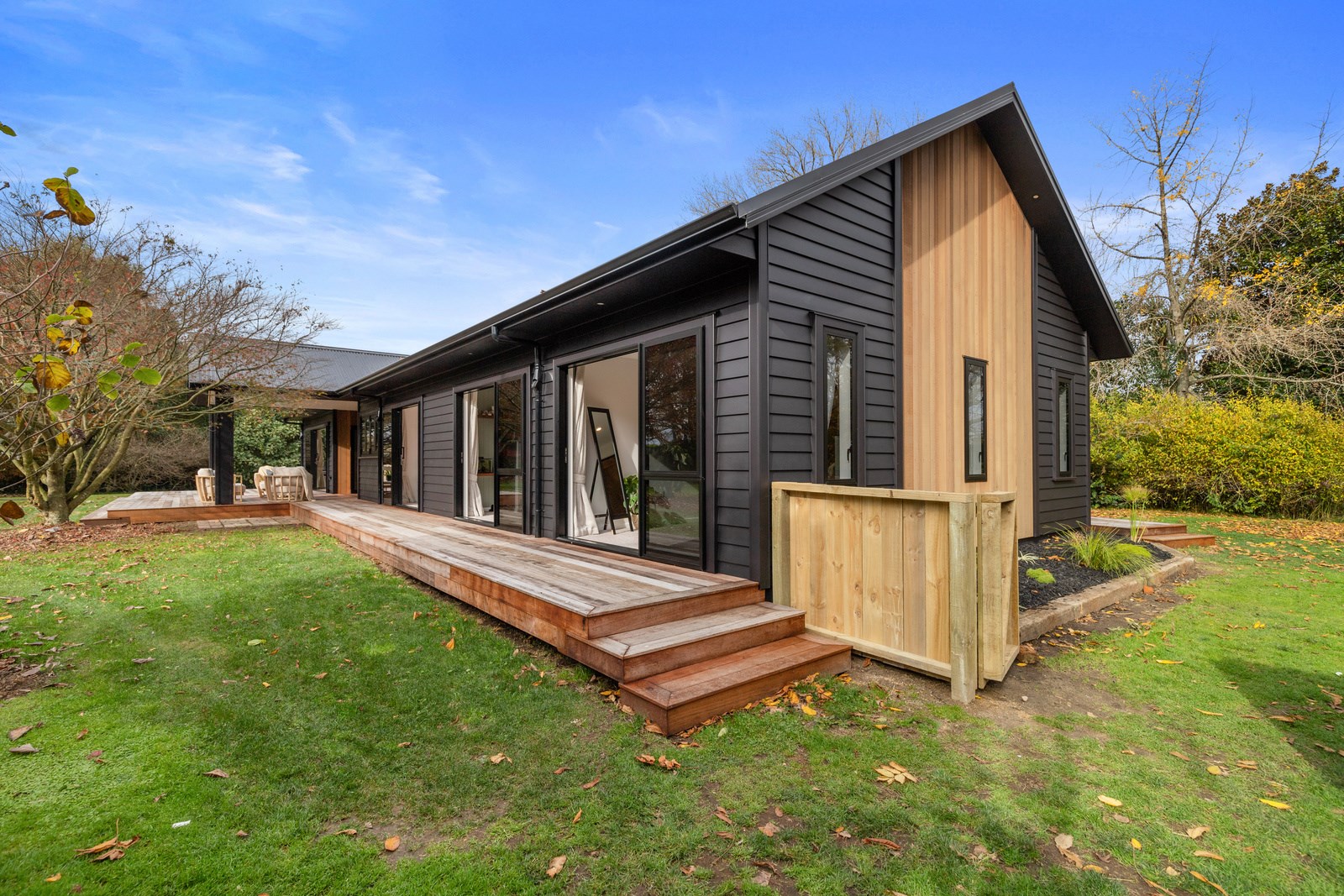 Macrocarpa in bedrooms and bathrooms came from the same source. The inviting open-plan living area has three sets of sliders that usher in light and views of the green surrounds. Flowing from these are 85sqm of kwila decks, including a portico. The kitchen, with more sage, has a walk-in pantry with light sensor. Among three bedrooms is the luxurious main suite featuring an ensuite where a floor-to-ceiling window allows garden views. Exterior screens offer privacy. The family bathroom and powder room repeat the sage which is complemented with brass and funky tiles. This forever home is also fitted with smart-vent technology to support healthy living.