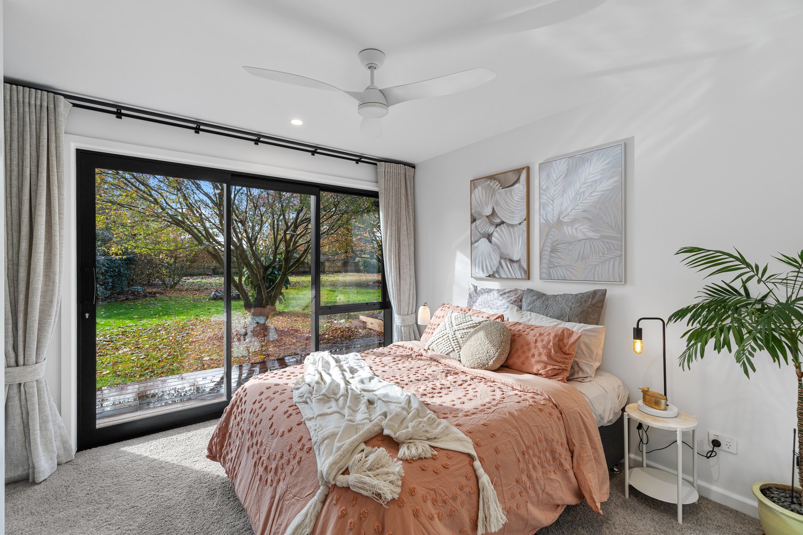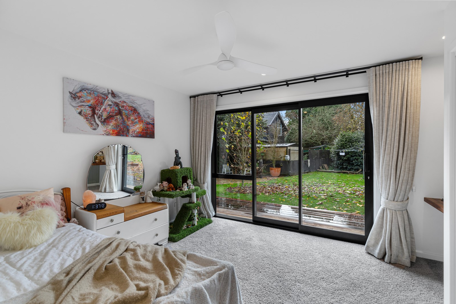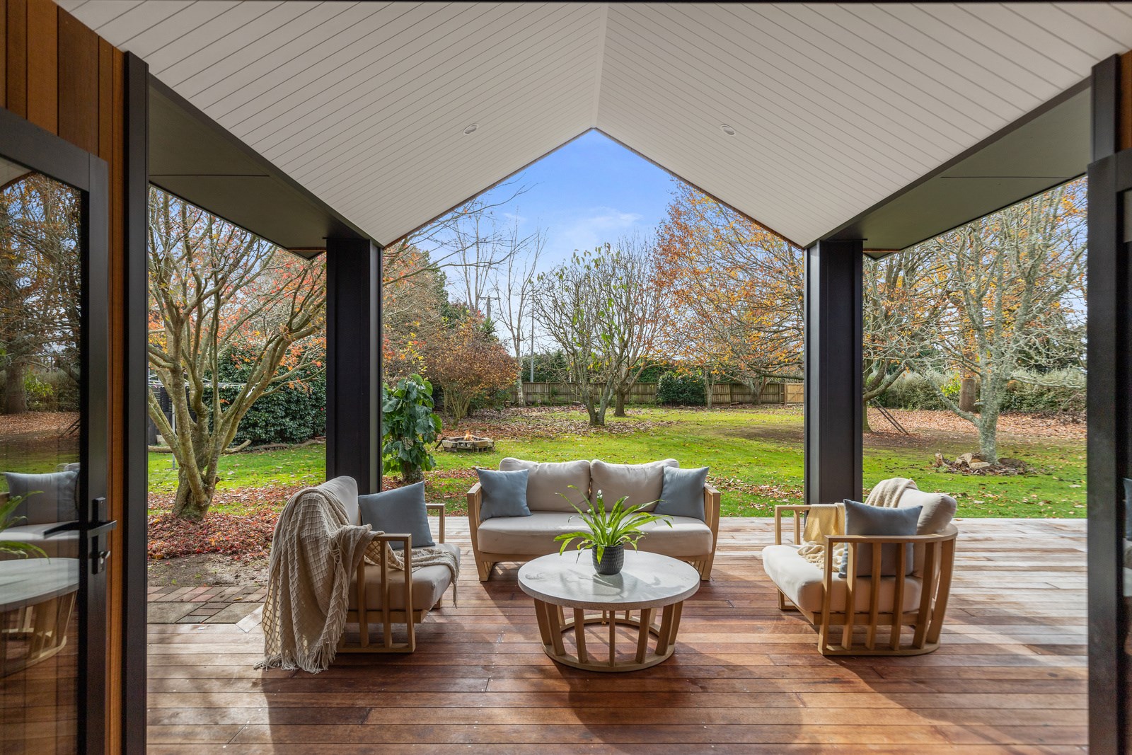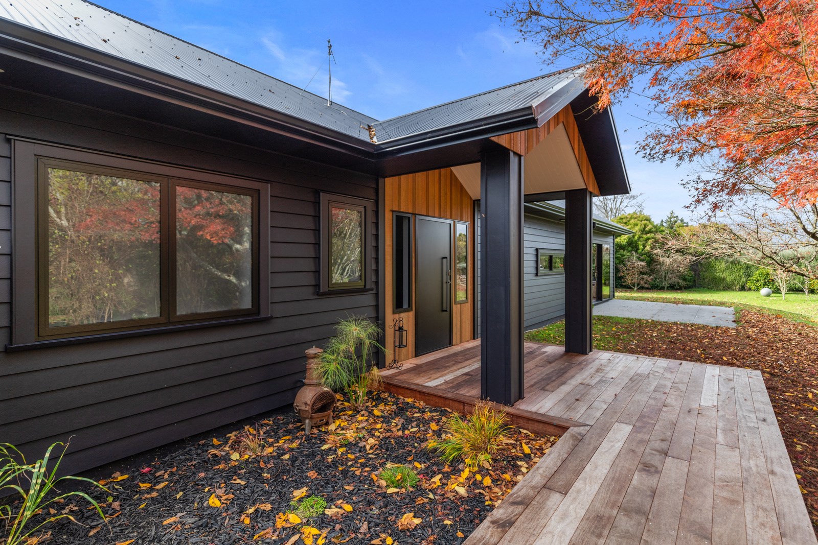 Macrocarpa in bedrooms and bathrooms came from the same source. The inviting open-plan living area has three sets of sliders that usher in light and views of the green surrounds. Flowing from these are 85sqm of kwila decks, including a portico. The kitchen, with more sage, has a walk-in pantry with light sensor. Among three bedrooms is the luxurious main suite featuring an ensuite where a floor-to-ceiling window allows garden views. Exterior screens offer privacy. The family bathroom and powder room repeat the sage which is complemented with brass and funky tiles. This forever home is also fitted with smart-vent technology to support healthy living.