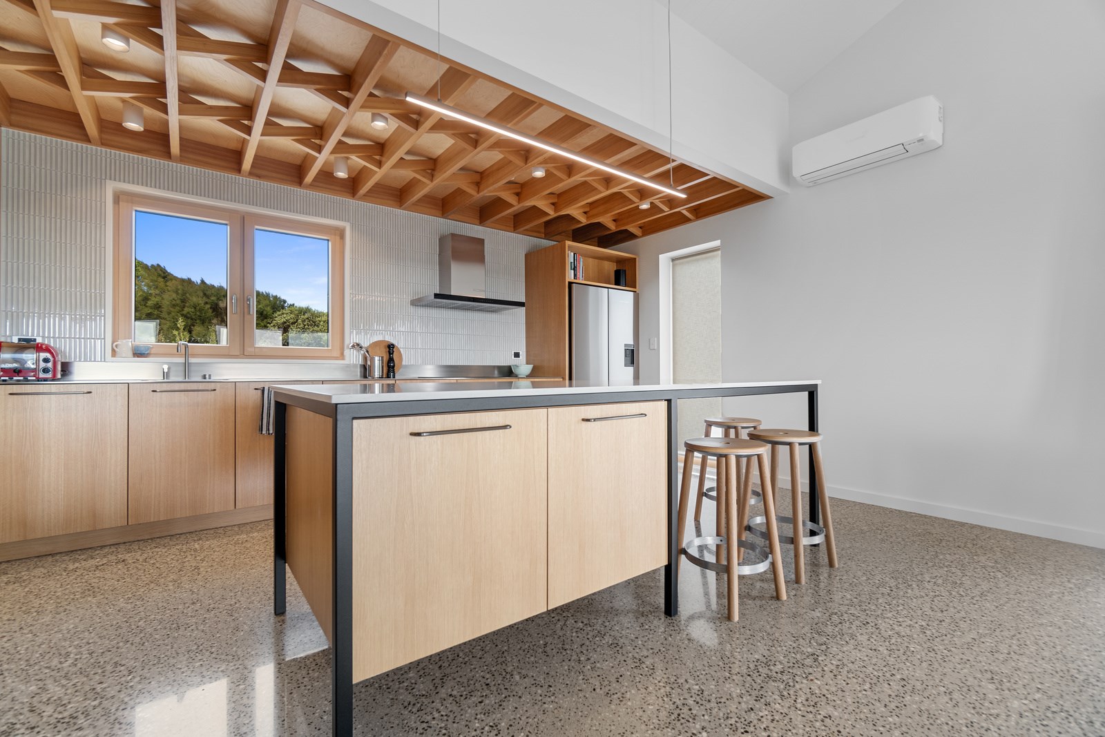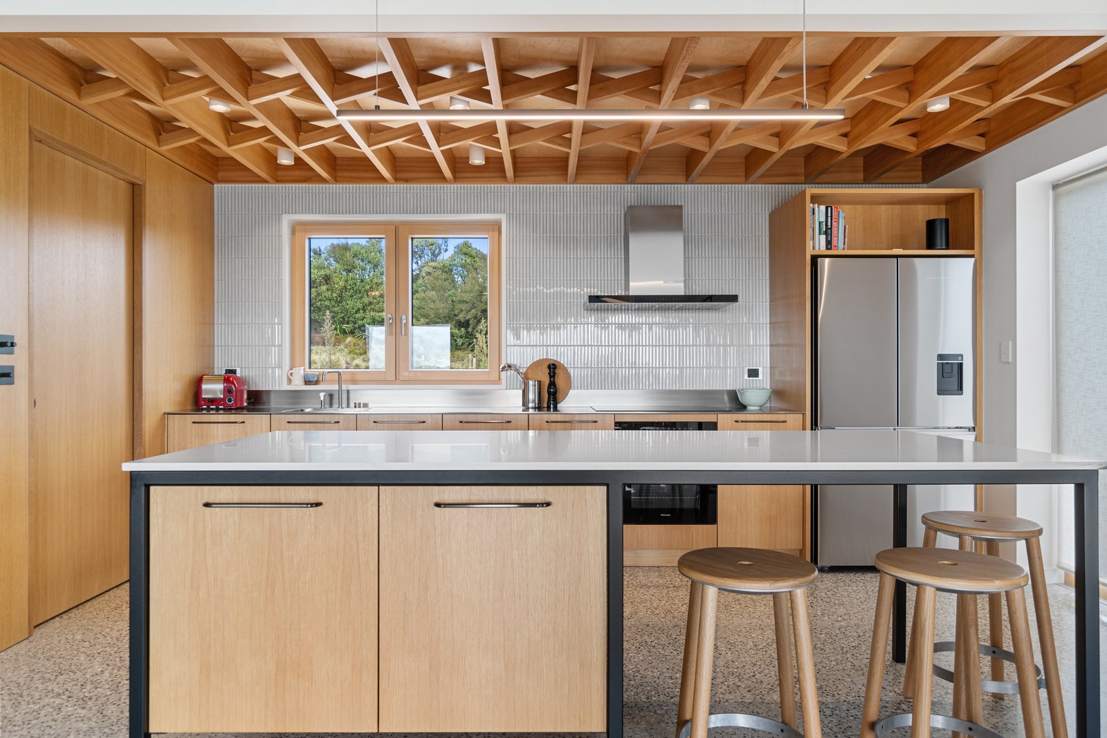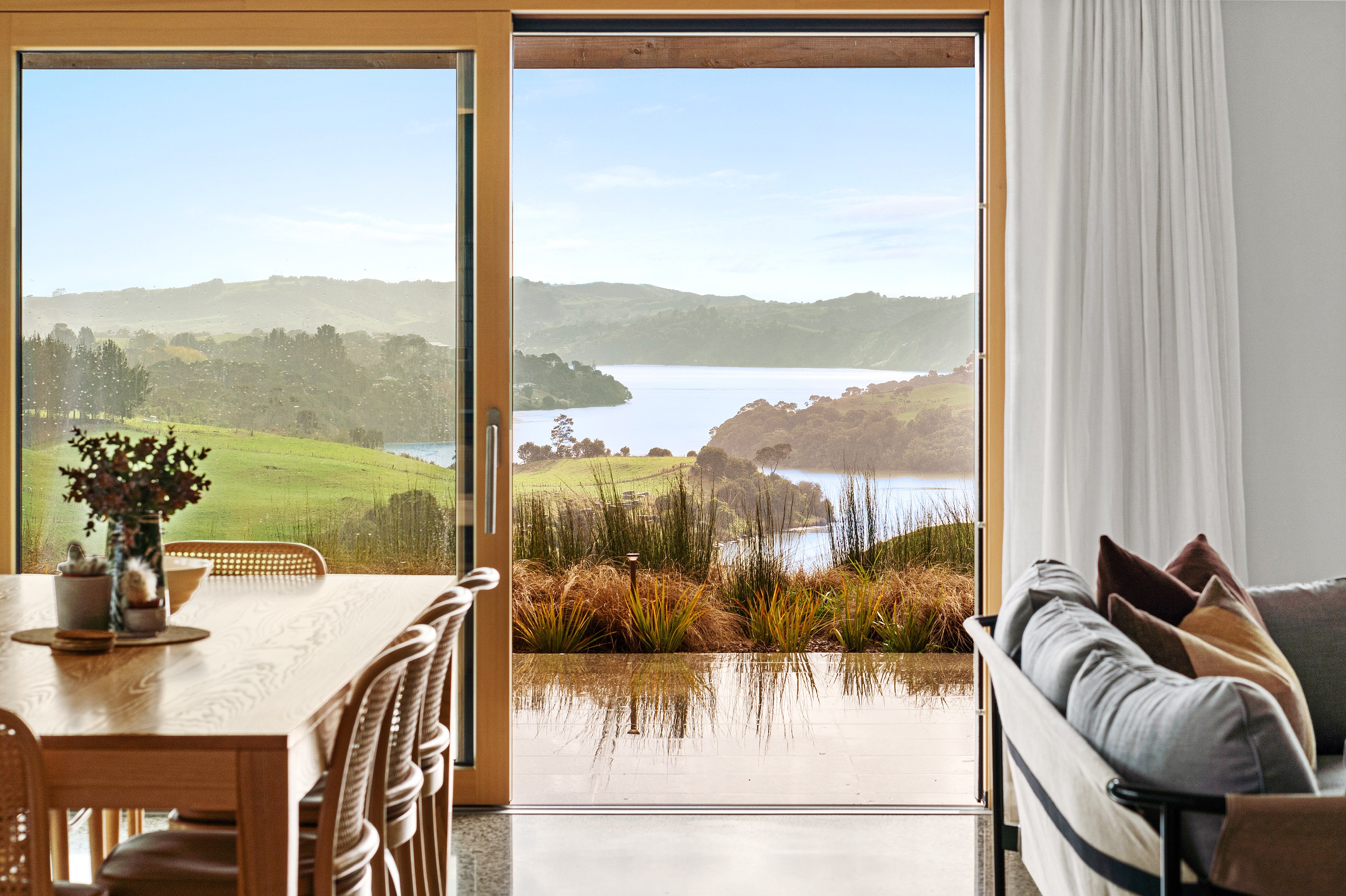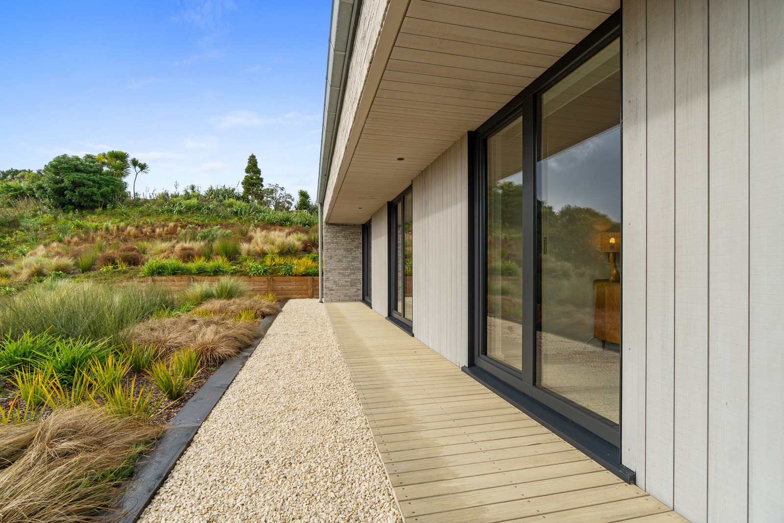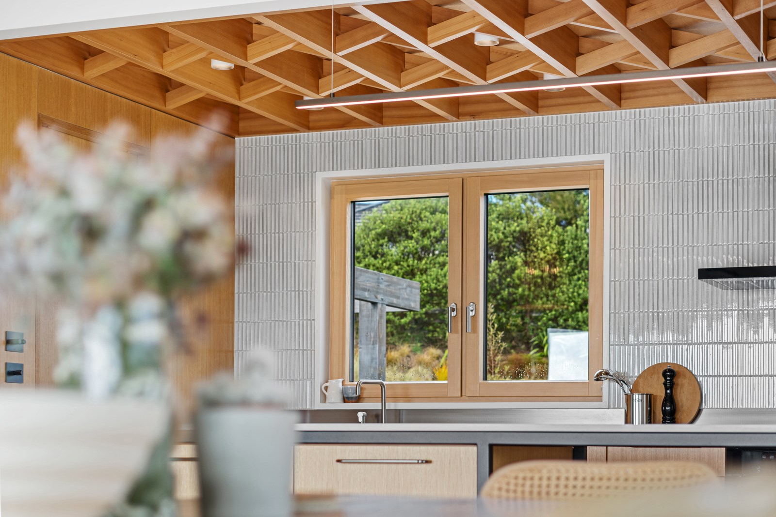 Years of planning went into this 221sqm three-bedroom home, named Āhuru, and it shows. The architect-designed, recently certified, Passive House above Raglan Harbour is a showcase of energy efficiency, sustainability, craftsmanship, bespoke details and fresh, pared-back style. Once the owners had decided on their plans, the project was put in the hands of Brown Construction, who have the regional eHaus licence. The team concentrate on high-performance builds that step lightly on the land. This project required detailed methods and adherence to Passive House design and building principles. Solar energy, gathered from 24 panels and stored by a Tesla Powerwall, runs energy-efficient appliances to assist in maintaining a constant indoor temperature.
