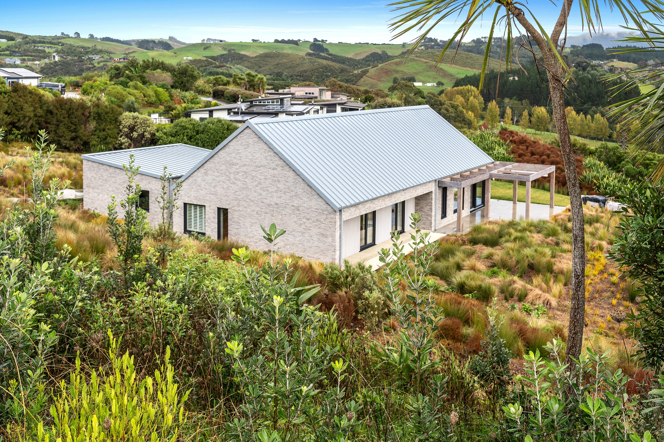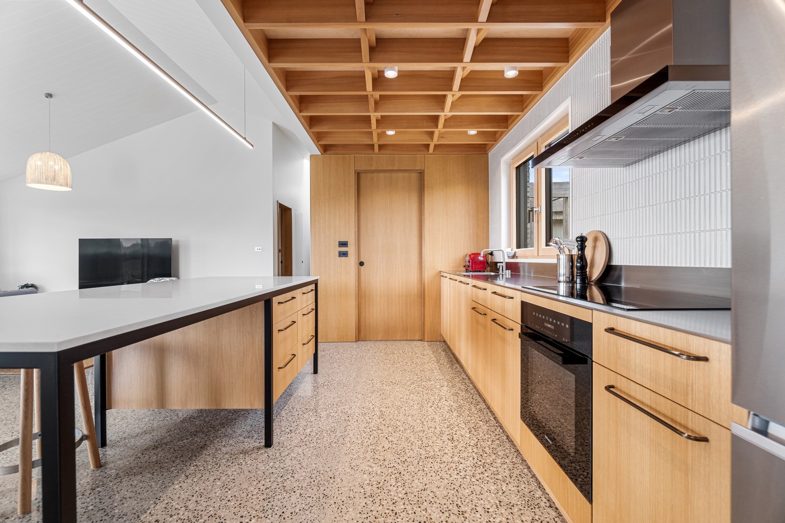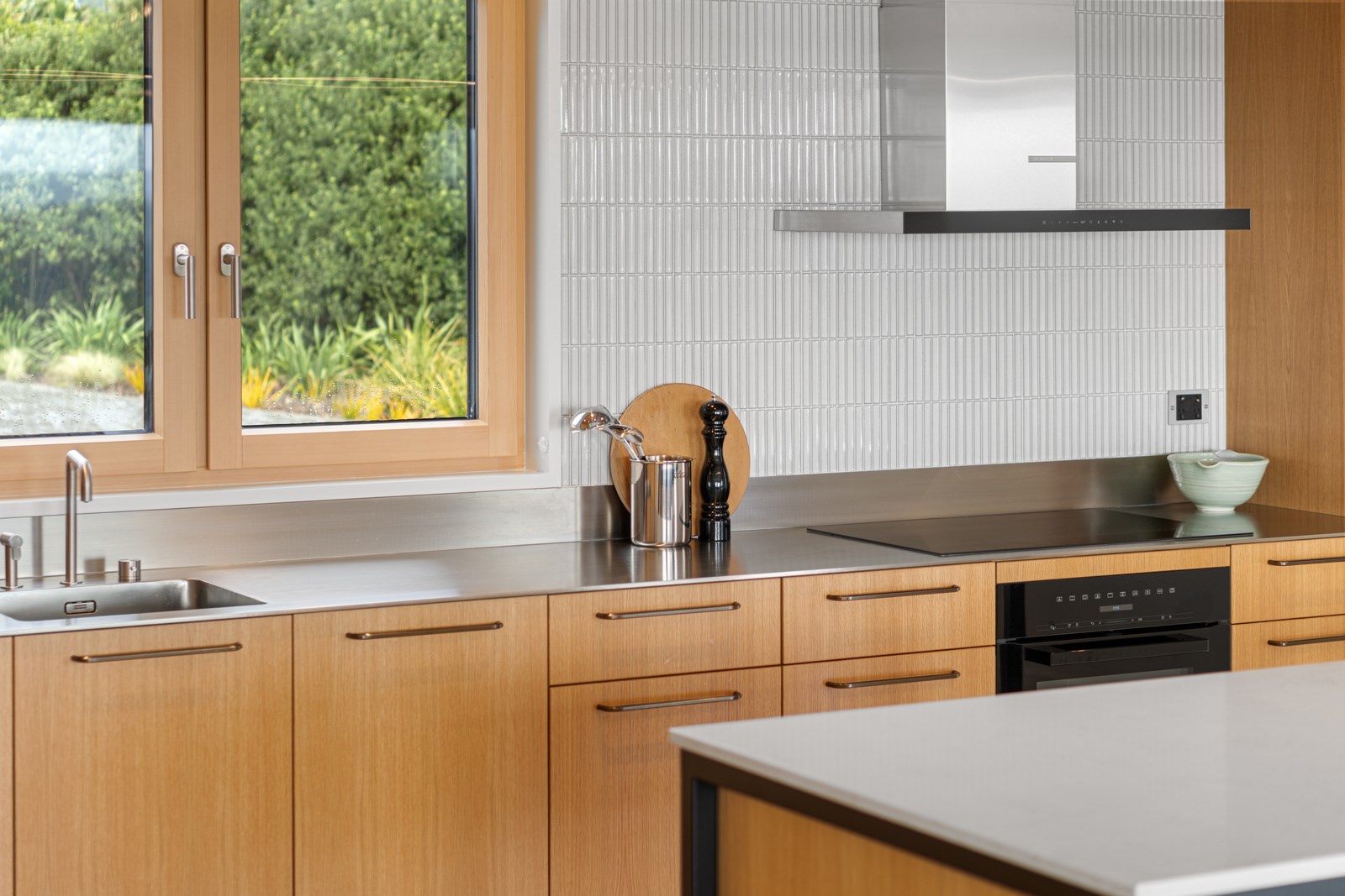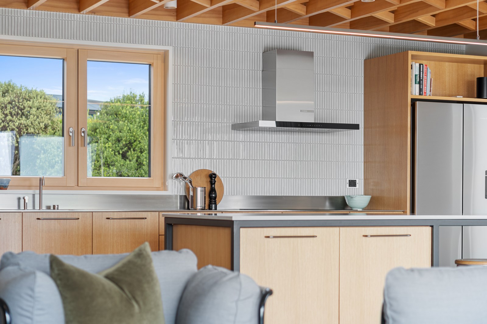 Years of planning went into this 221sqm three-bedroom home, named Āhuru, and it shows. The architect-designed, recently certified, Passive House above Raglan Harbour is a showcase of energy efficiency, sustainability, craftsmanship, bespoke details and fresh, pared-back style. Once the owners had decided on their plans, the project was put in the hands of Brown Construction, who have the regional eHaus licence. The team concentrate on high-performance builds that step lightly on the land. This project required detailed methods and adherence to Passive House design and building principles. Solar energy, gathered from 24 panels and stored by a Tesla Powerwall, runs energy-efficient appliances to assist in maintaining a constant indoor temperature.