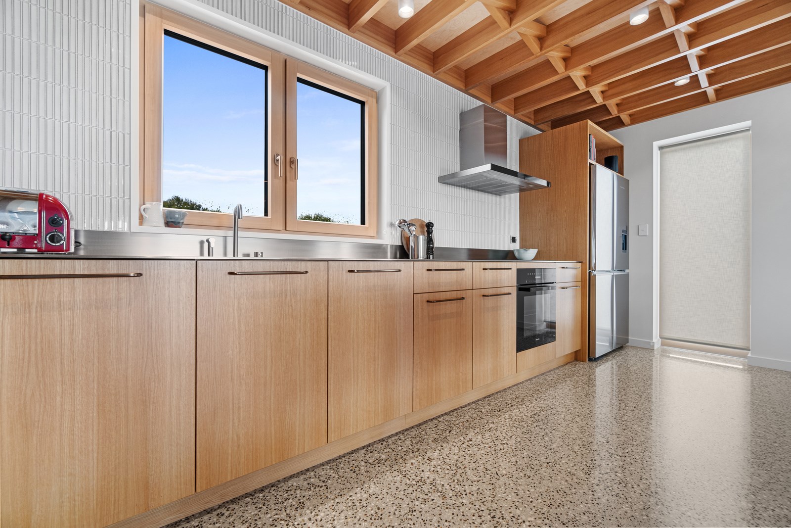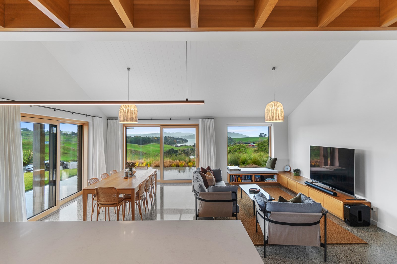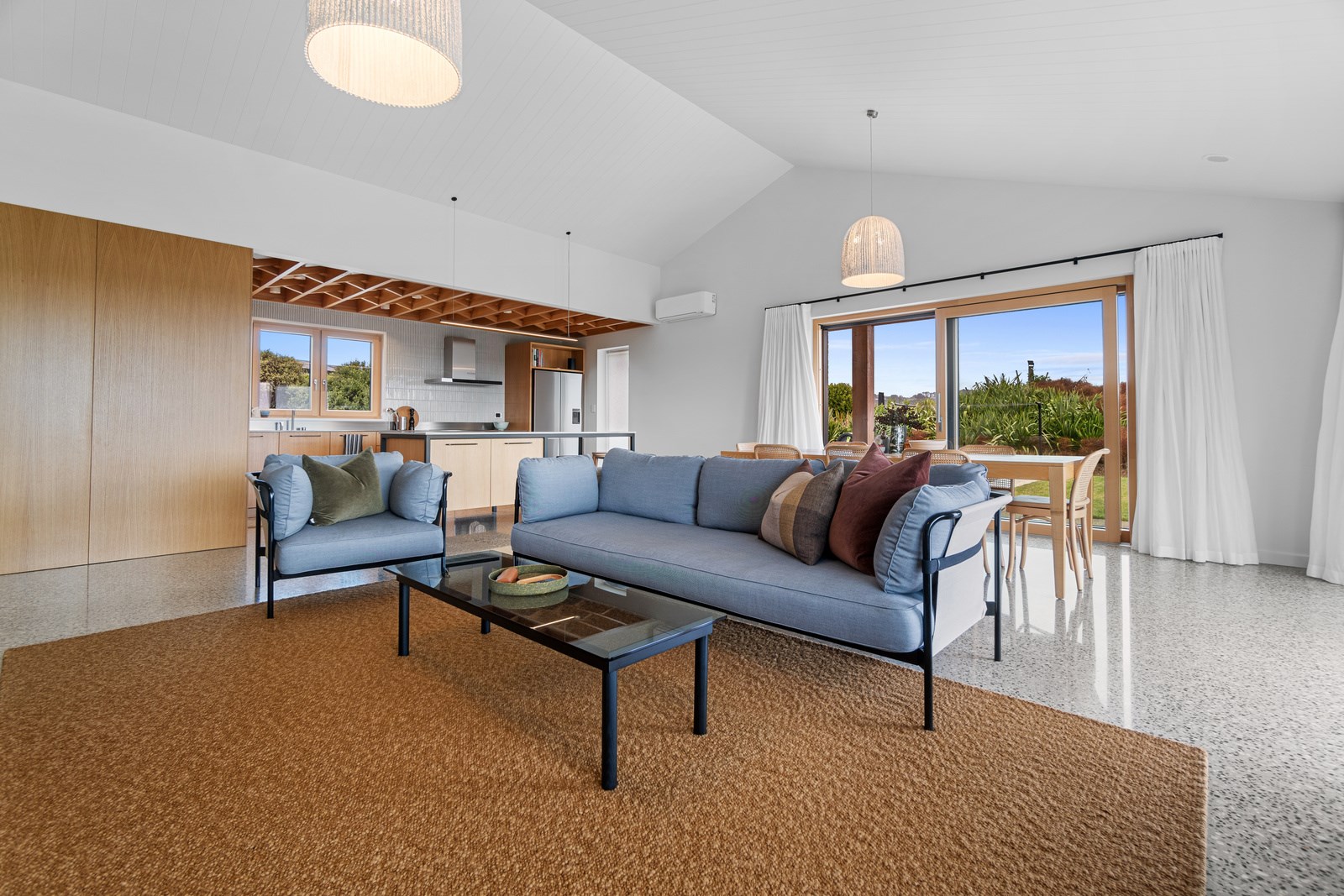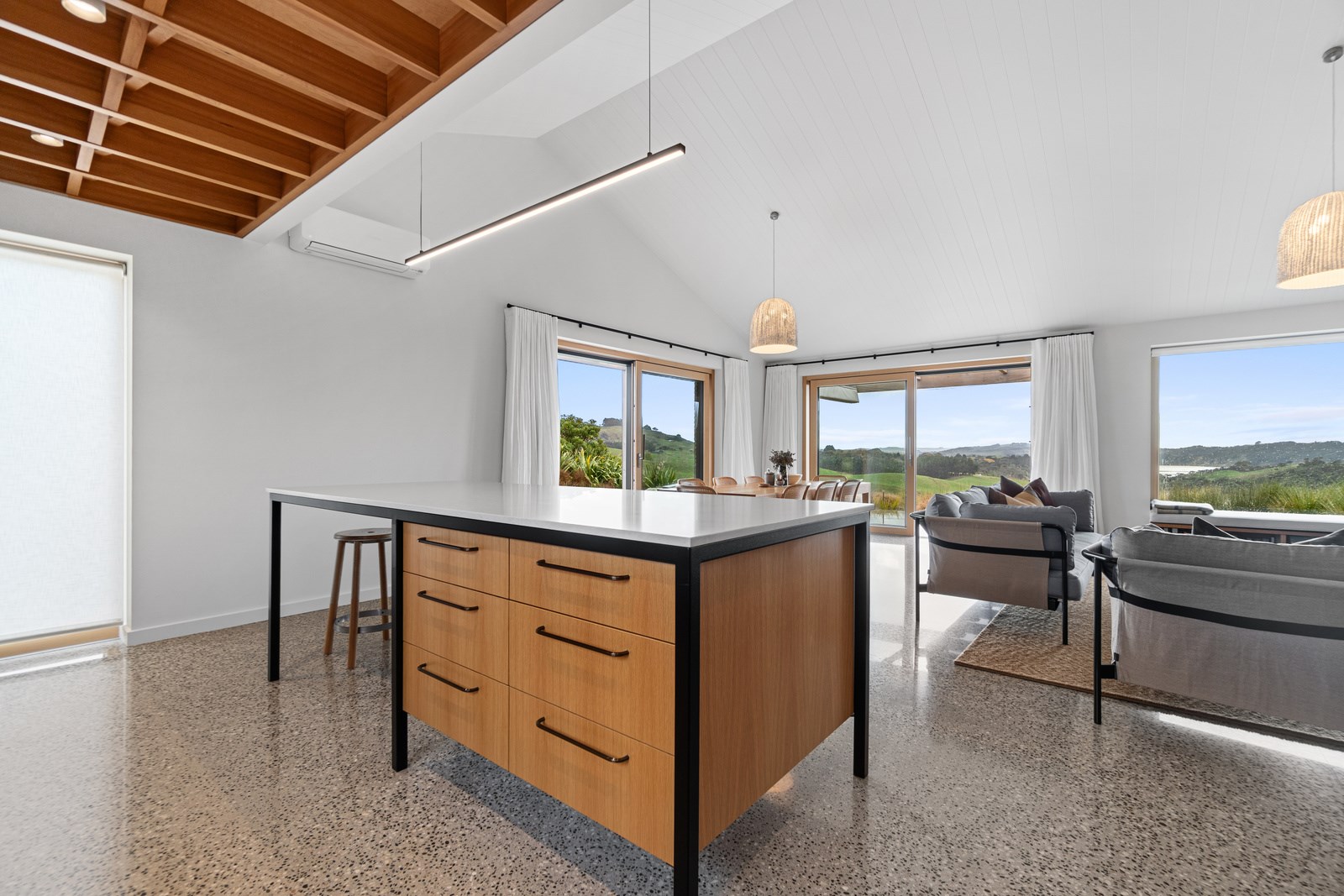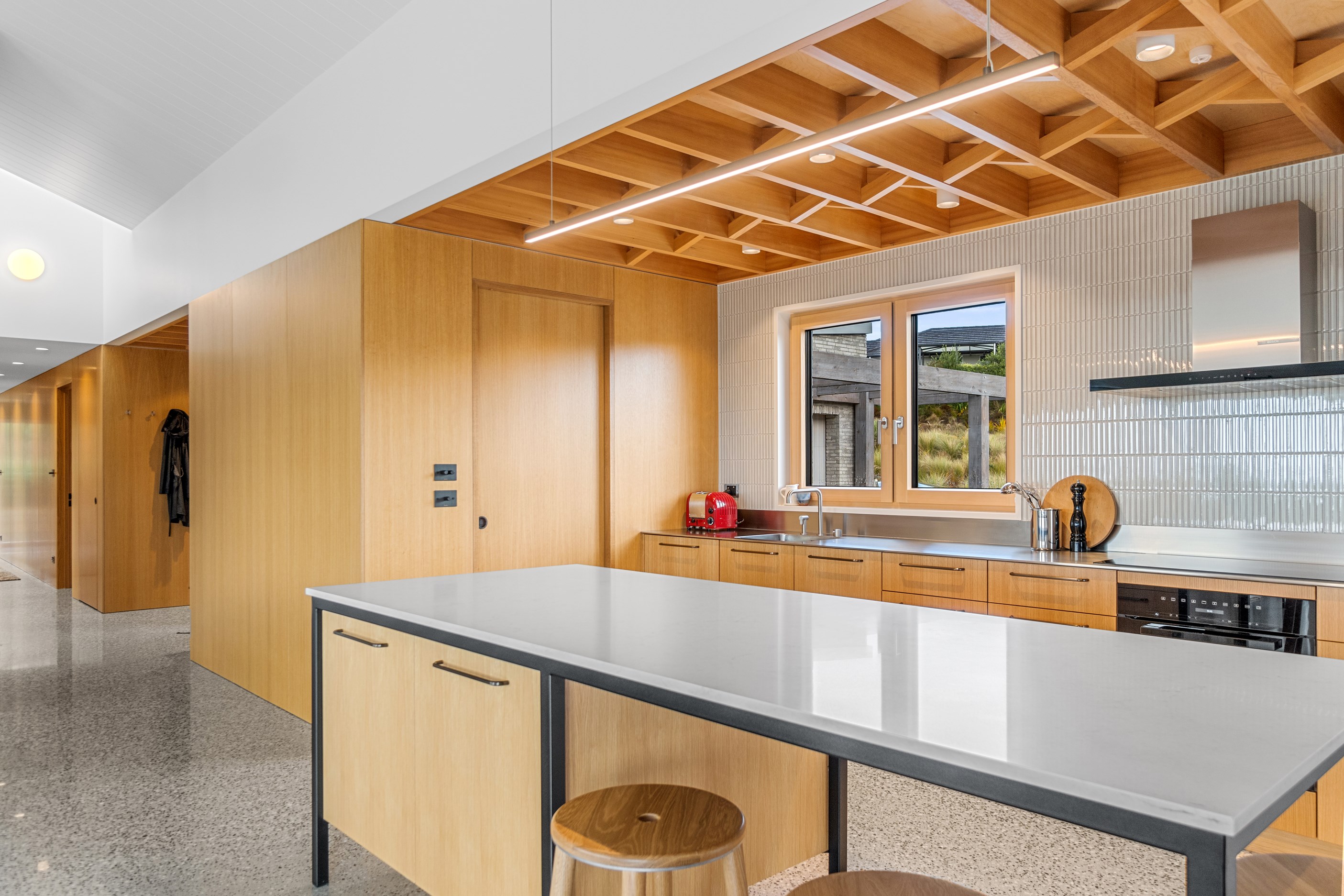 Years of planning went into this 221sqm three-bedroom home, named Āhuru, and it shows. The architect-designed, recently certified, Passive House above Raglan Harbour is a showcase of energy efficiency, sustainability, craftsmanship, bespoke details and fresh, pared-back style. Once the owners had decided on their plans, the project was put in the hands of Brown Construction, who have the regional eHaus licence. The team concentrate on high-performance builds that step lightly on the land. This project required detailed methods and adherence to Passive House design and building principles. Solar energy, gathered from 24 panels and stored by a Tesla Powerwall, runs energy-efficient appliances to assist in maintaining a constant indoor temperature.