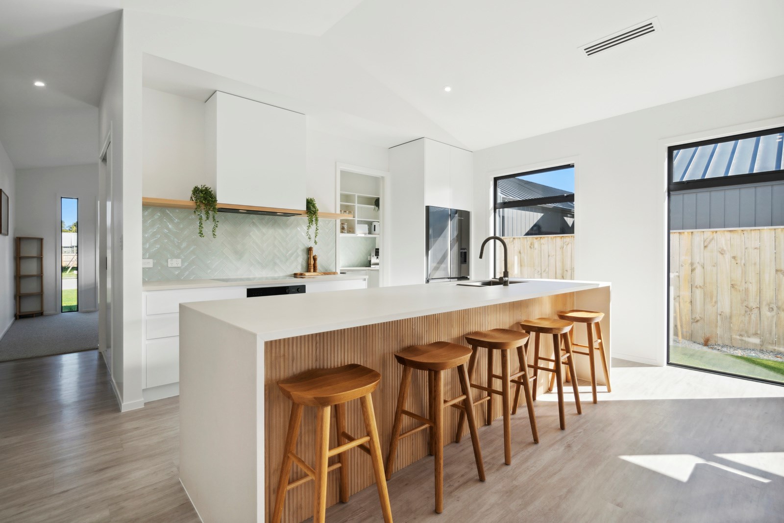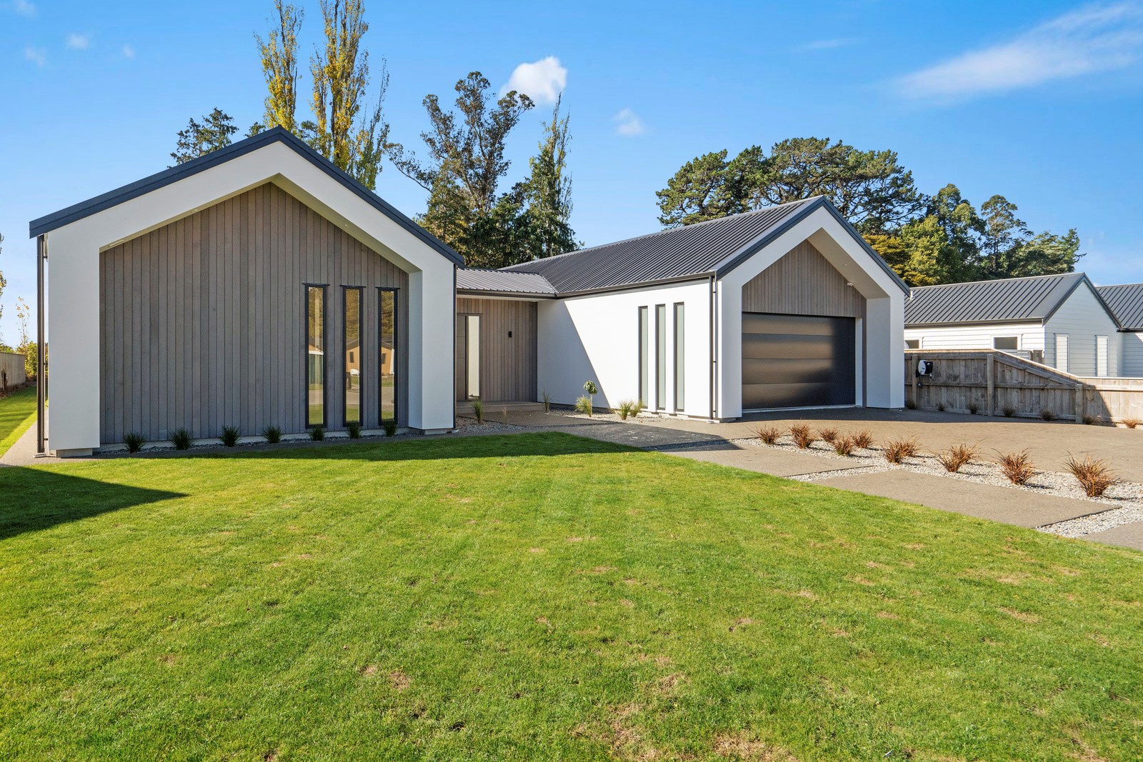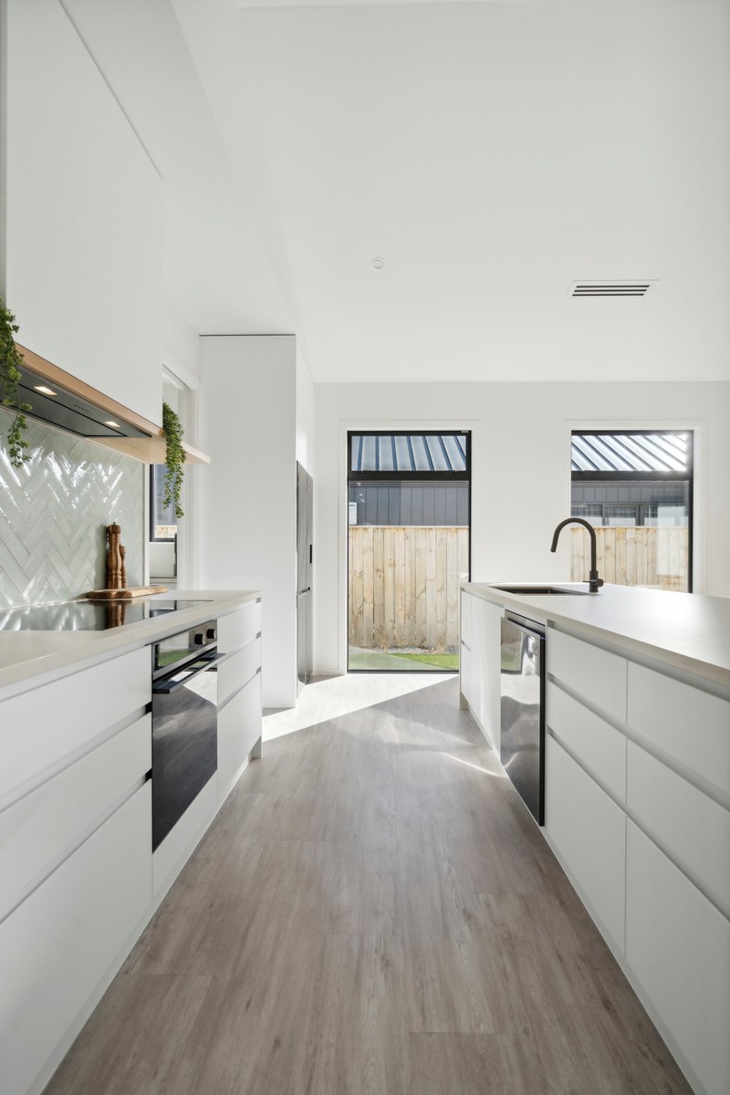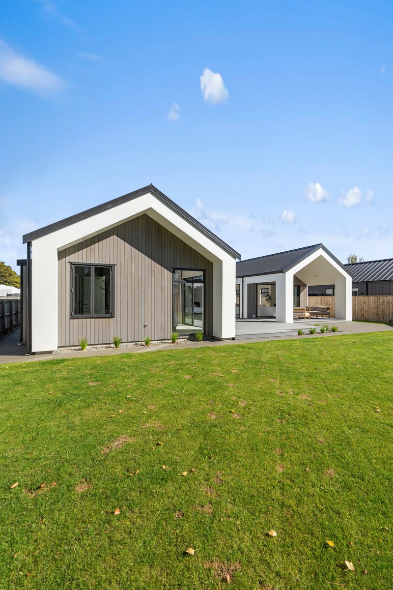 Holidaying in Greytown becomes even more charming with this four-bedroom, two-bathroom retreat that is the perfect blend of sophistication and comfort in one of New Zealand’s most beautiful small towns. Rockcote and cedar finishes to the exterior provide durability and indicate the high level of design detail. Large windows fill the home with natural light and a gas fire with plaster finish provides warmth and ambience in the open-plan living area. A mint green splashback and wood-finished island bench make the kitchen pop out from the white walls, taking that contemporary charm up another level.