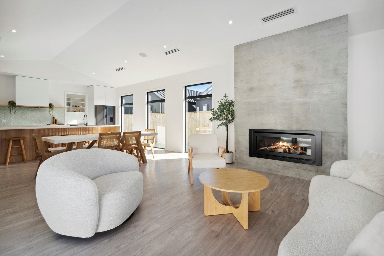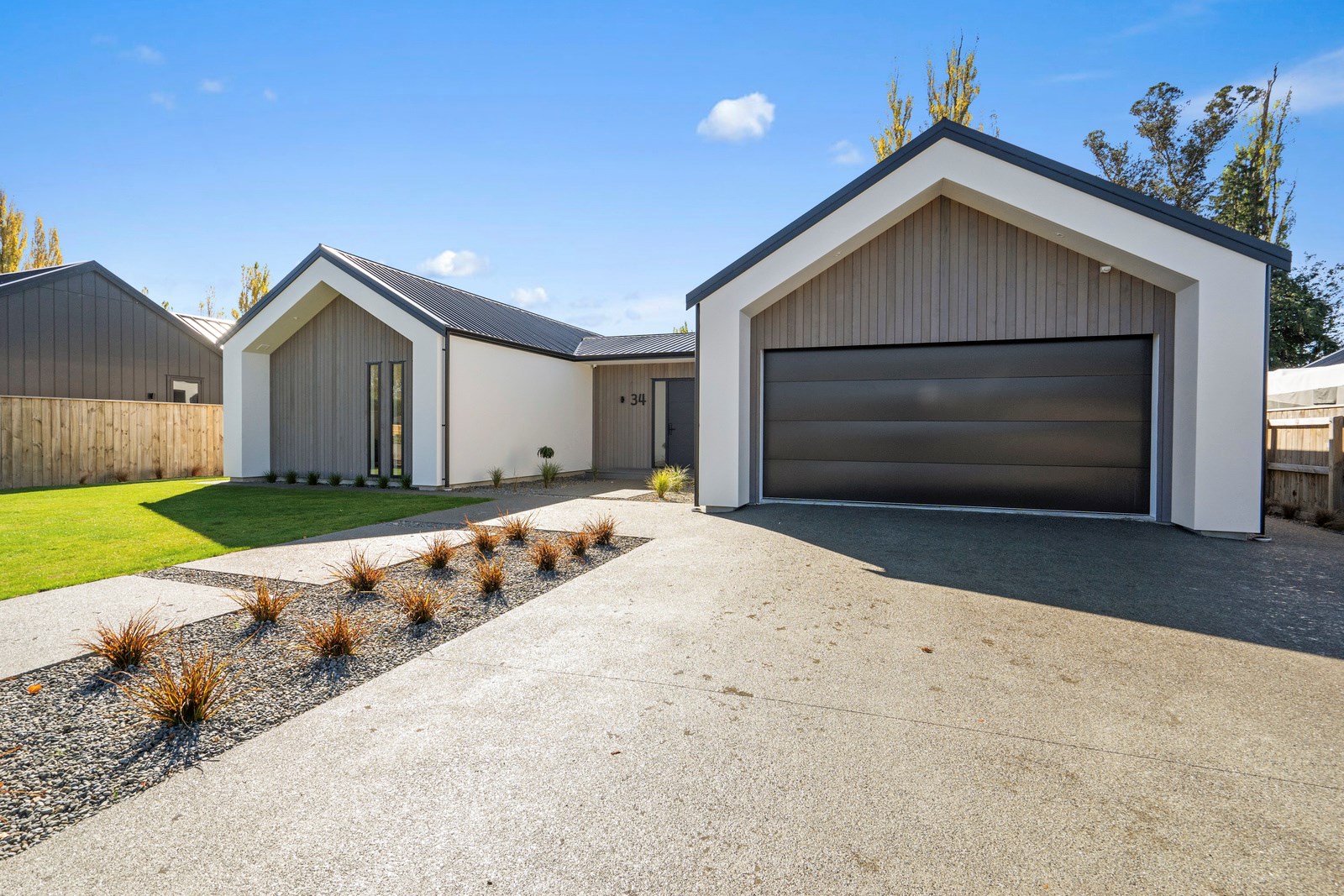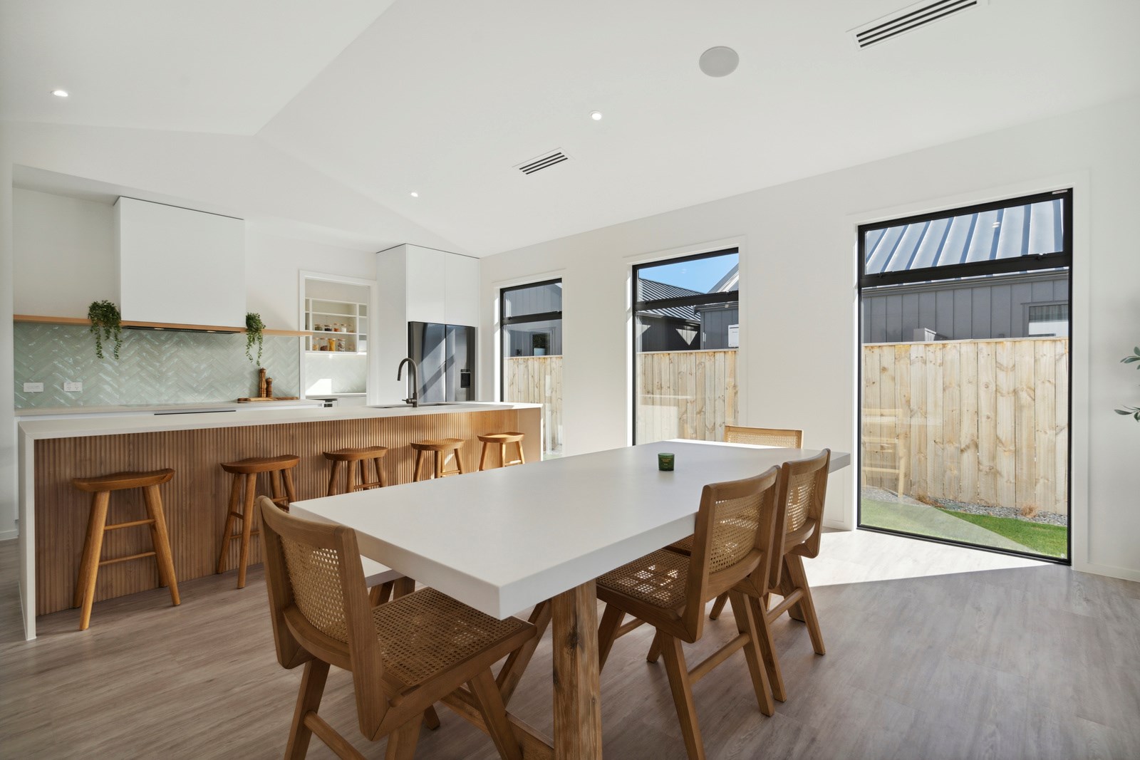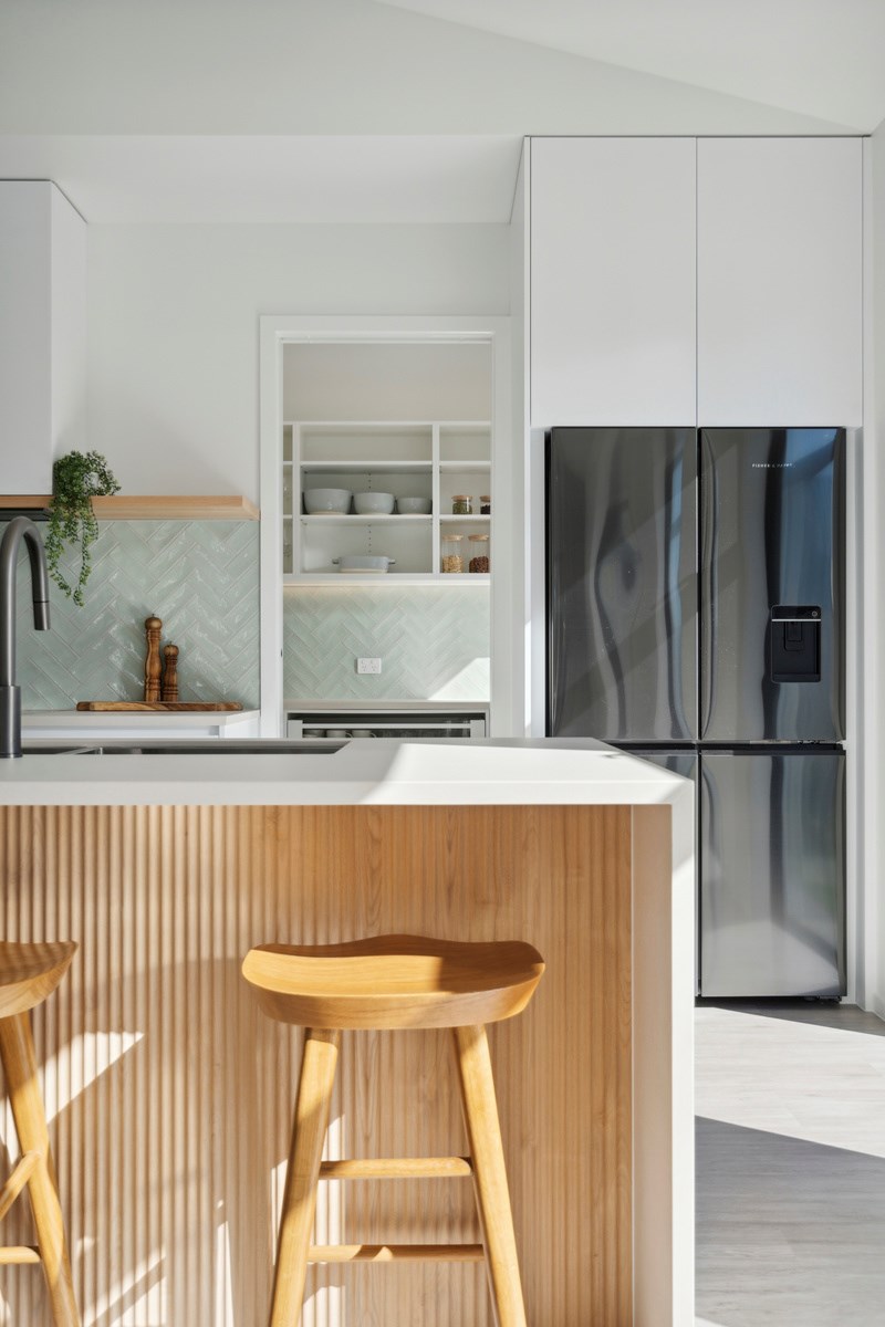 Holidaying in Greytown becomes even more charming with this four-bedroom, two-bathroom retreat that is the perfect blend of sophistication and comfort in one of New Zealand’s most beautiful small towns. Rockcote and cedar finishes to the exterior provide durability and indicate the high level of design detail. Large windows fill the home with natural light and a gas fire with plaster finish provides warmth and ambience in the open-plan living area. A mint green splashback and wood-finished island bench make the kitchen pop out from the white walls, taking that contemporary charm up another level.