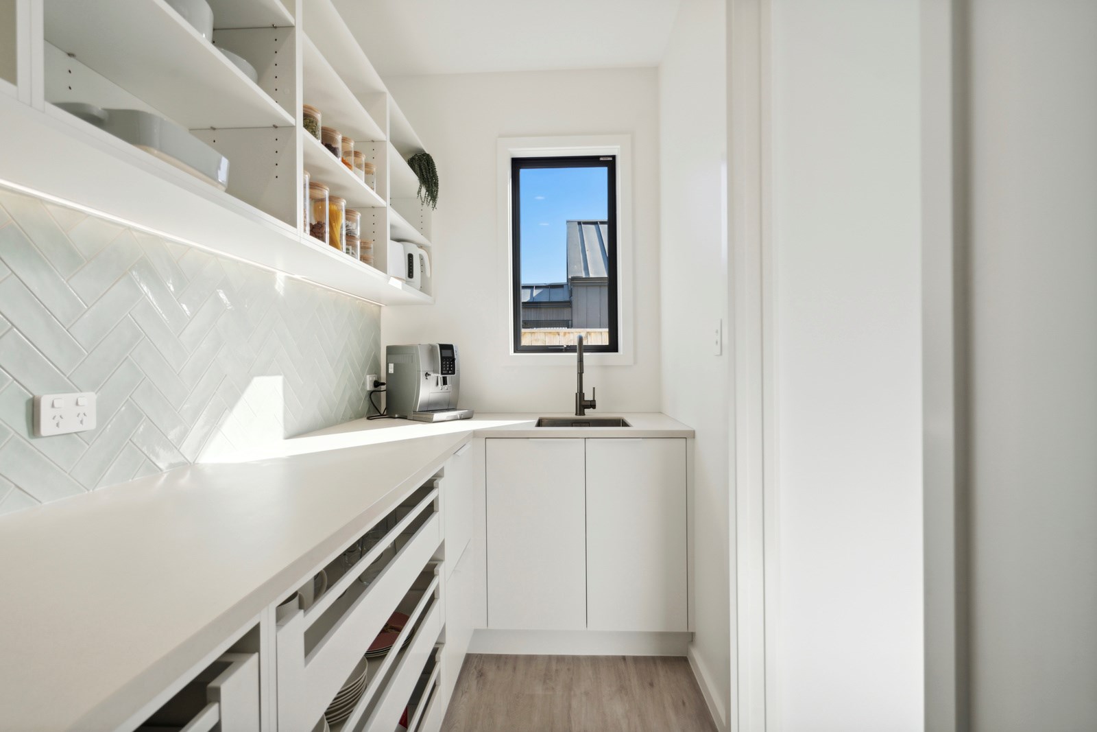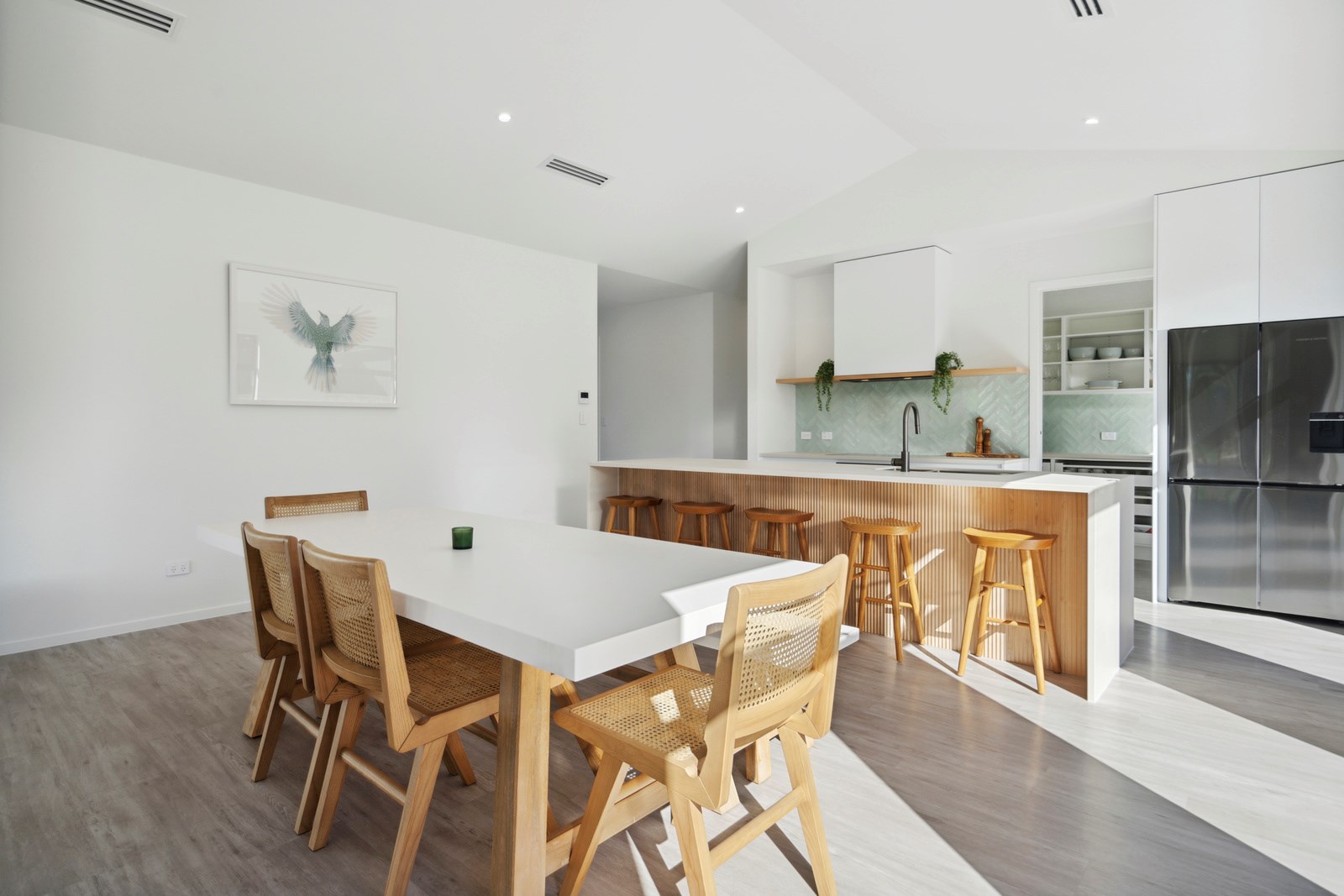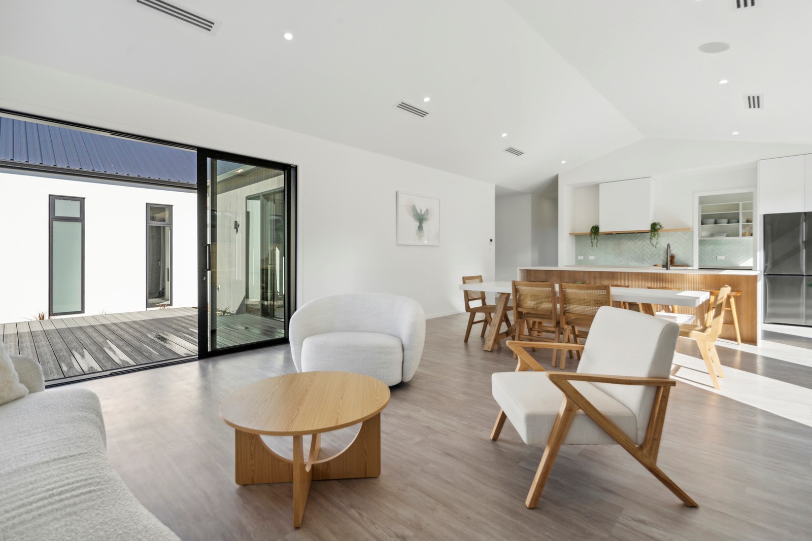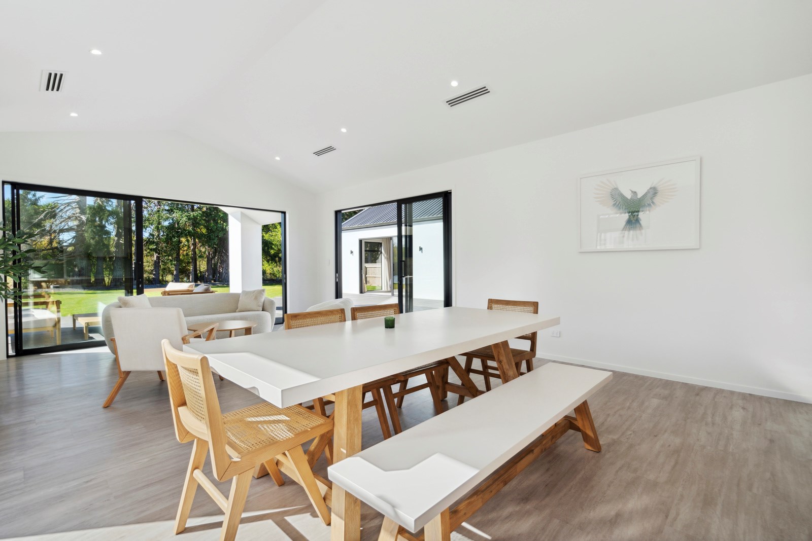 Holidaying in Greytown becomes even more charming with this four-bedroom, two-bathroom retreat that is the perfect blend of sophistication and comfort in one of New Zealand’s most beautiful small towns. Rockcote and cedar finishes to the exterior provide durability and indicate the high level of design detail. Large windows fill the home with natural light and a gas fire with plaster finish provides warmth and ambience in the open-plan living area. A mint green splashback and wood-finished island bench make the kitchen pop out from the white walls, taking that contemporary charm up another level.
