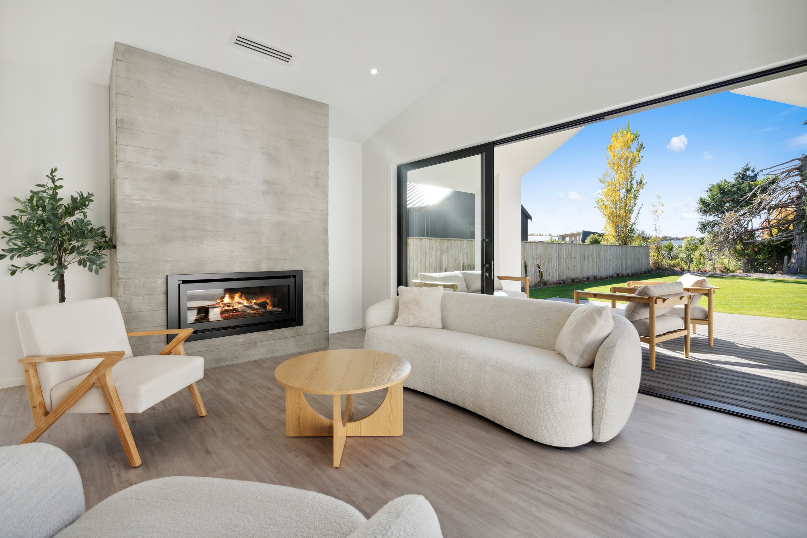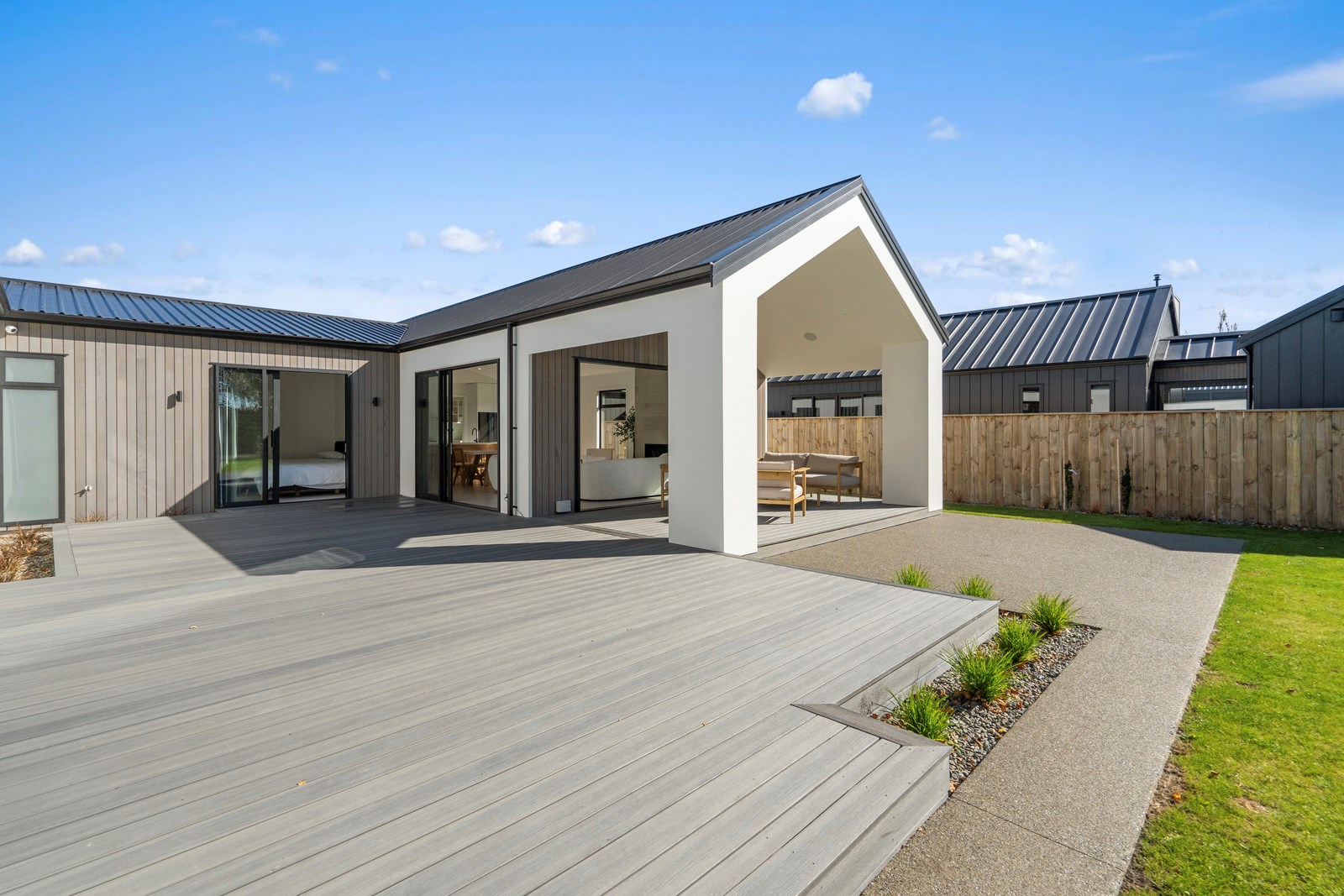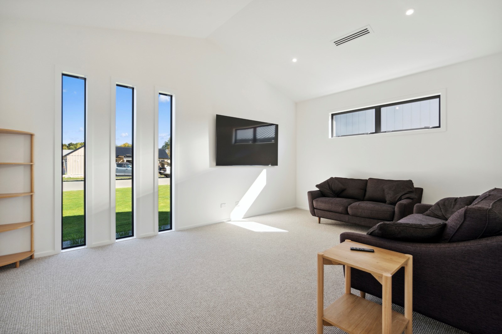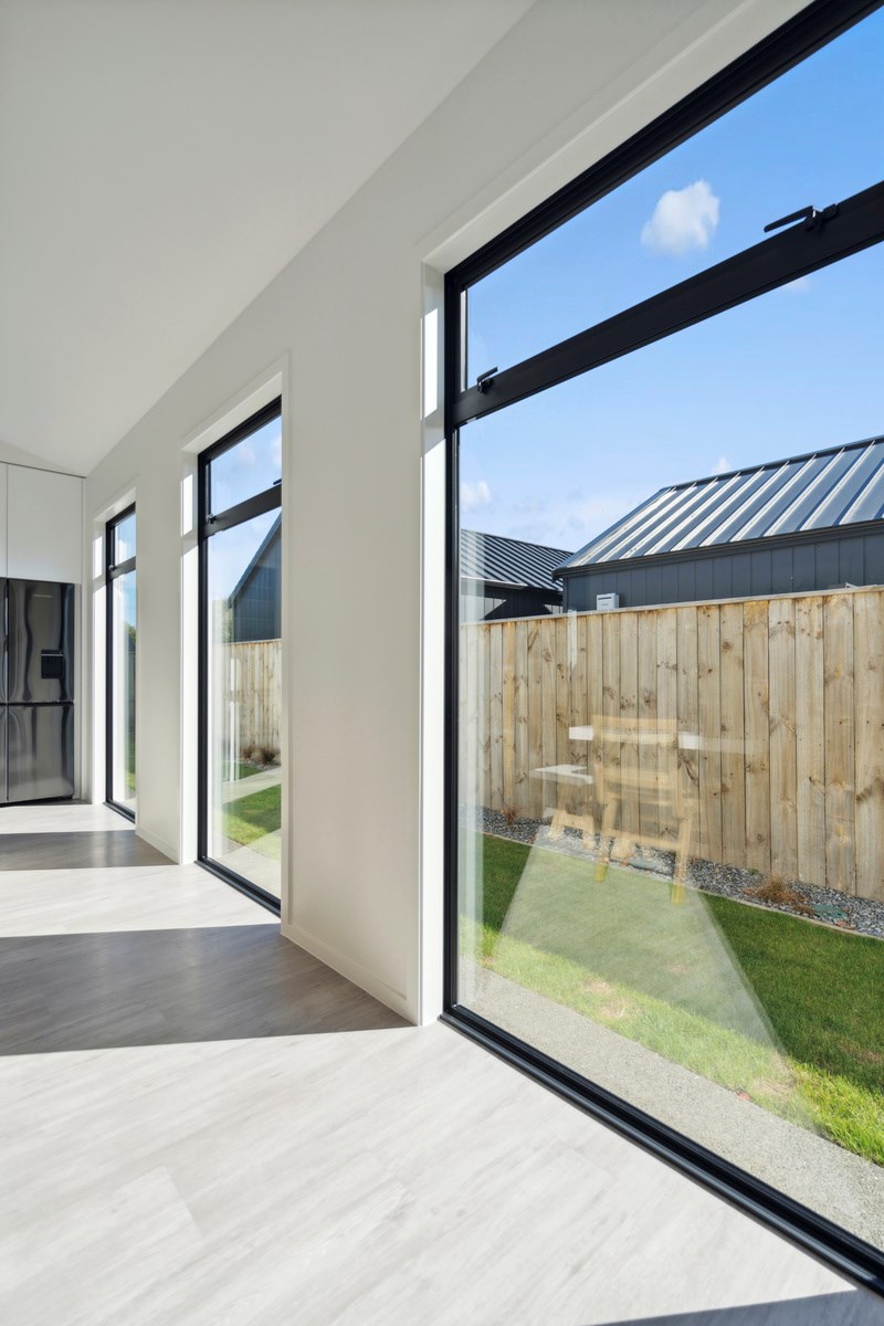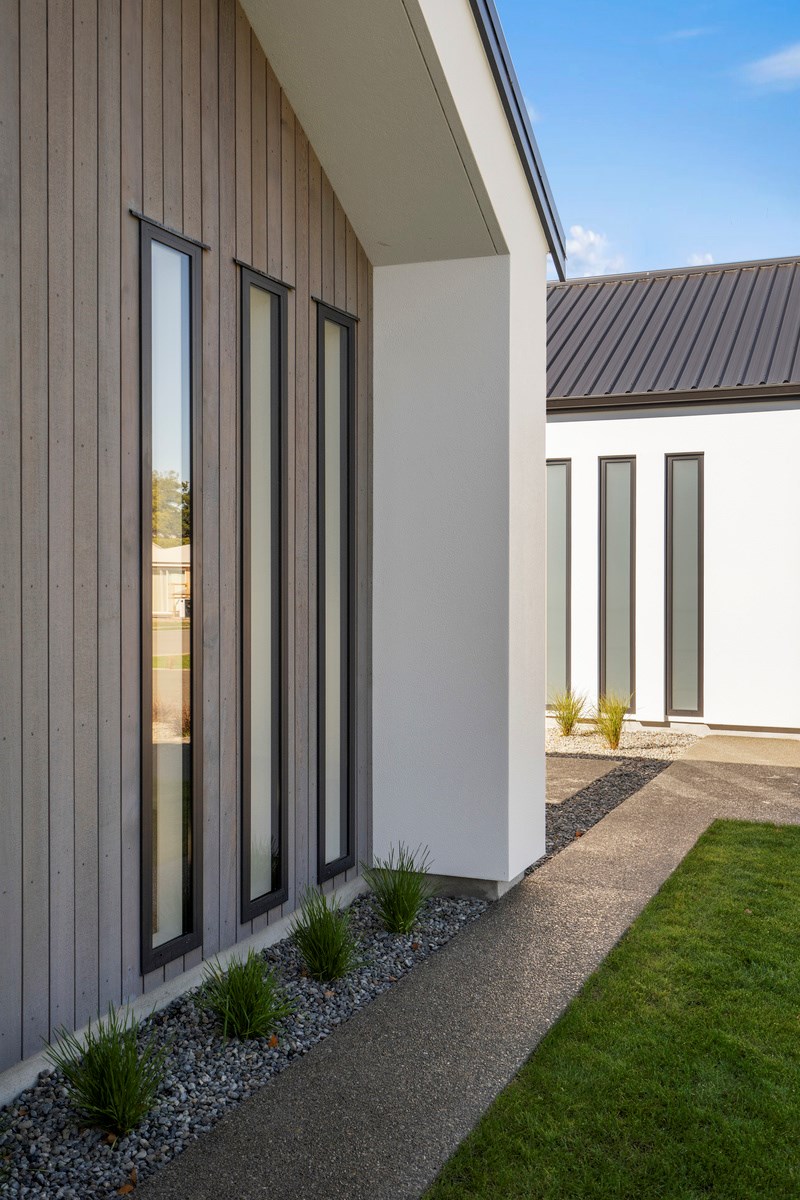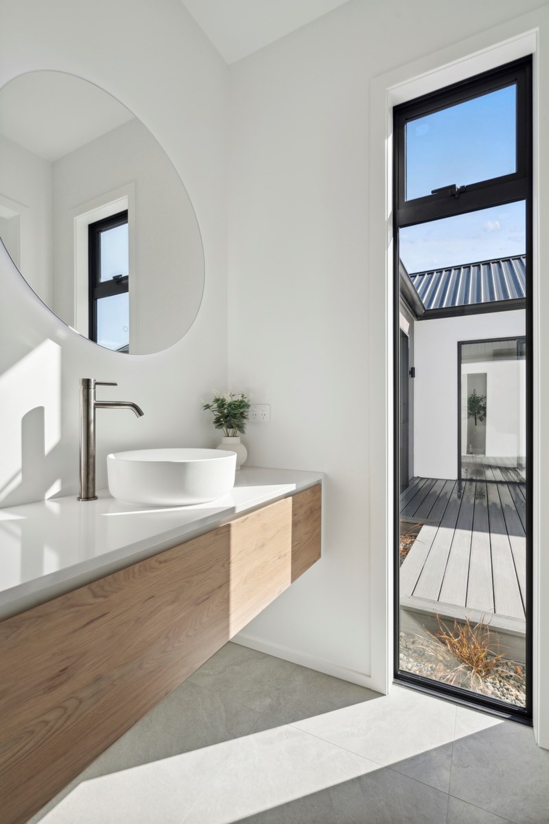 A separate TV room with slot windows to the street ensures a private space to break out to and watch TV. By cleverly repeating these windows on the garage wall, it works to provide a pleasing sense of symmetry. When it comes to outdoor living, there are options on two sides of the living area – under the portico on one side or tucked in on decking that flows from living over to the main bedroom on the other. This home is designed to take in the sunshine and views of the Tararua Ranges from many vantage points including, perhaps, the bath in the main suite.