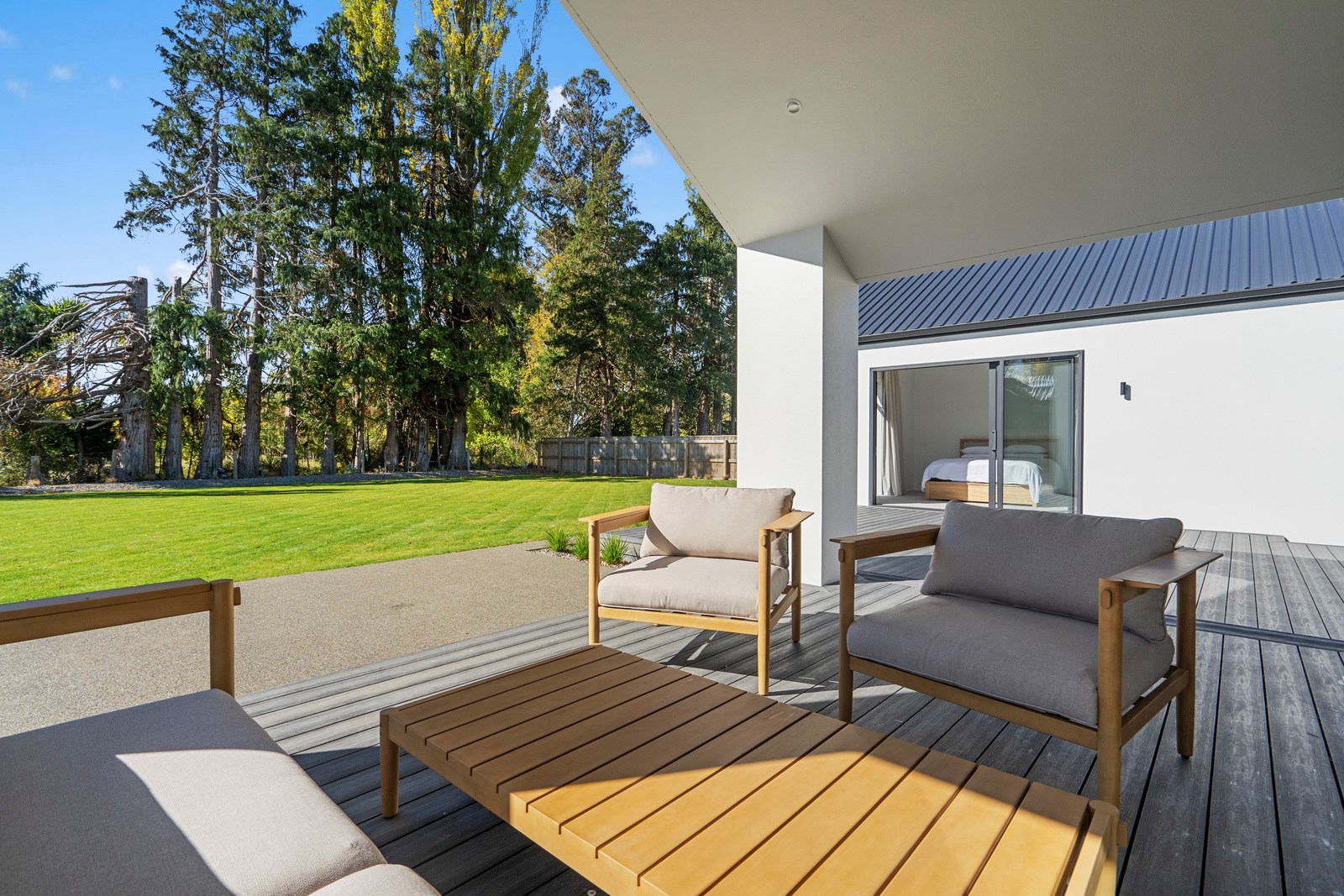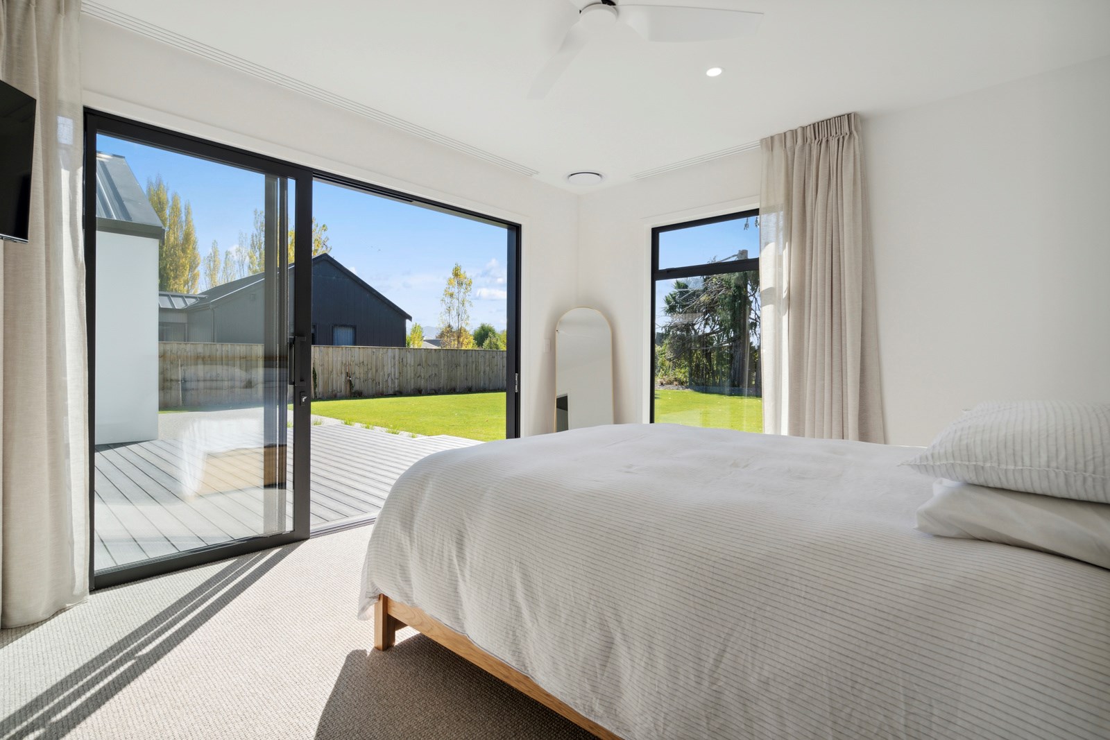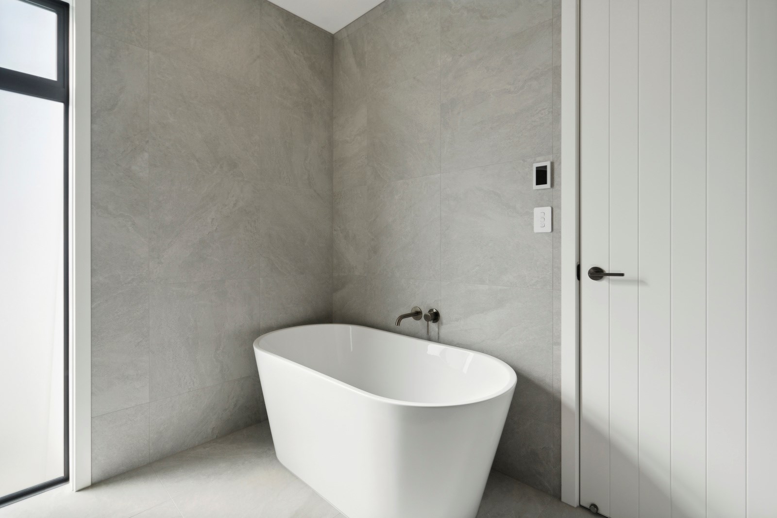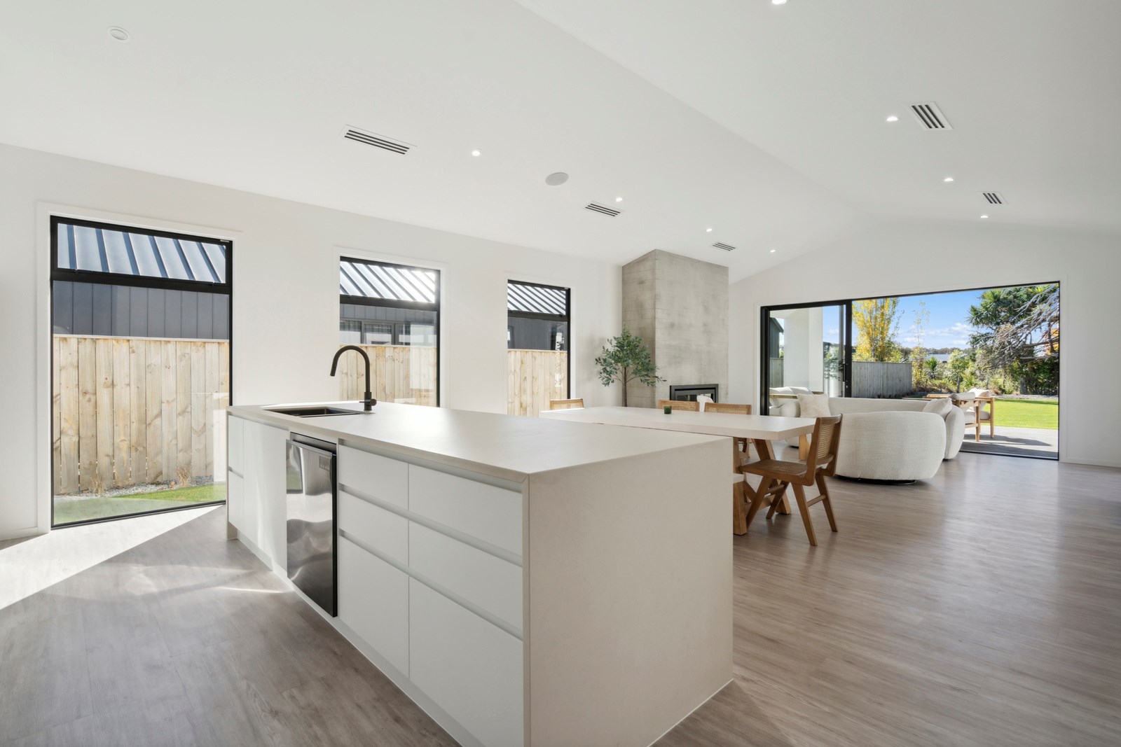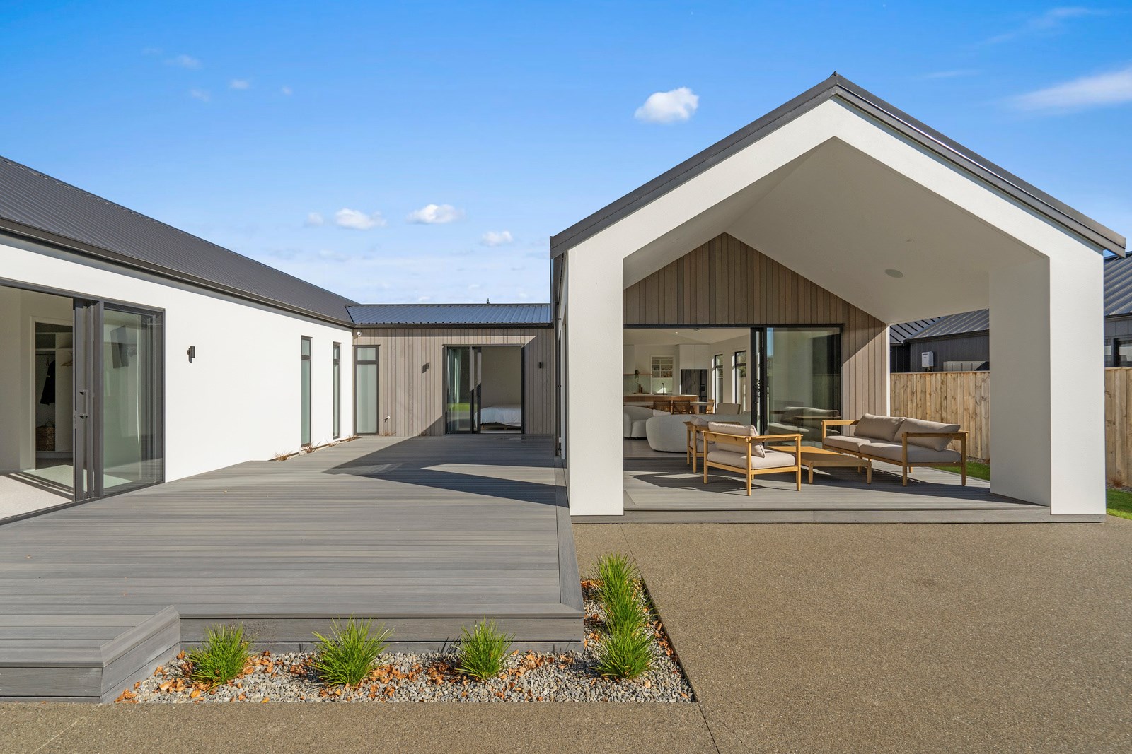 A separate TV room with slot windows to the street ensures a private space to break out to and watch TV. By cleverly repeating these windows on the garage wall, it works to provide a pleasing sense of symmetry. When it comes to outdoor living, there are options on two sides of the living area – under the portico on one side or tucked in on decking that flows from living over to the main bedroom on the other. This home is designed to take in the sunshine and views of the Tararua Ranges from many vantage points including, perhaps, the bath in the main suite.
