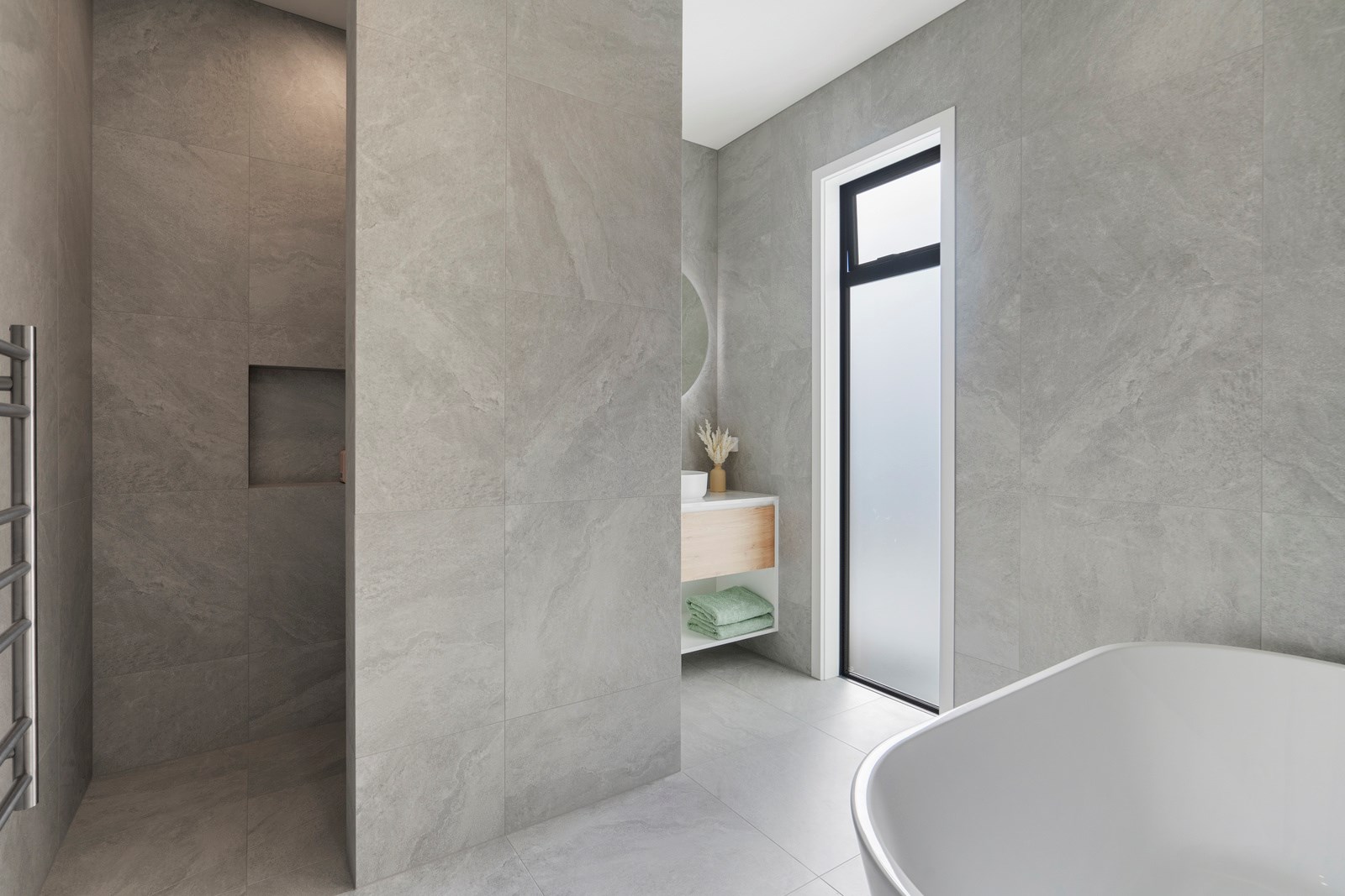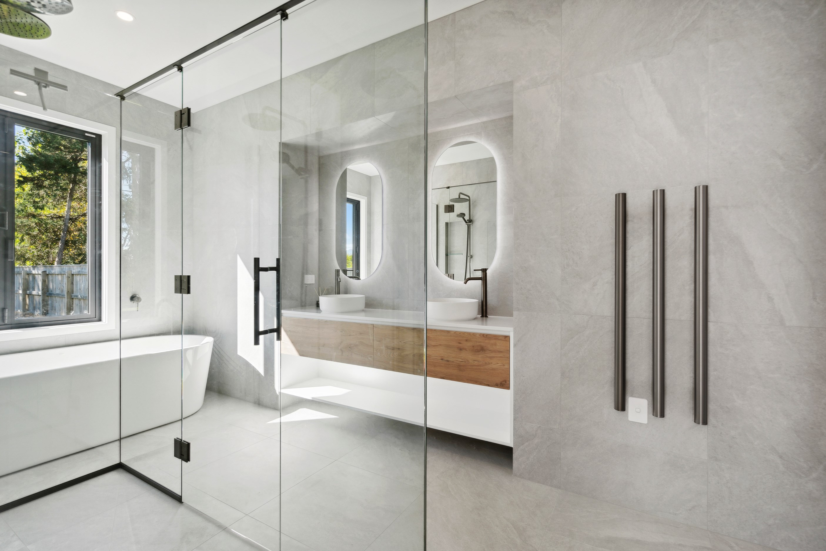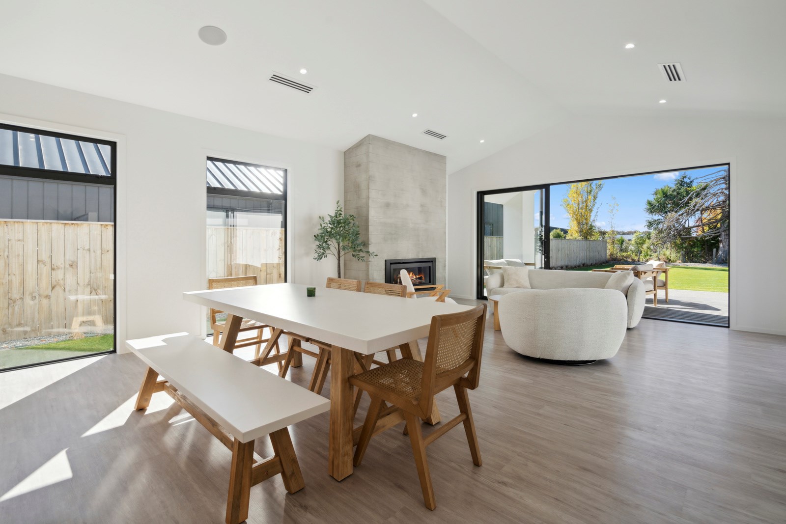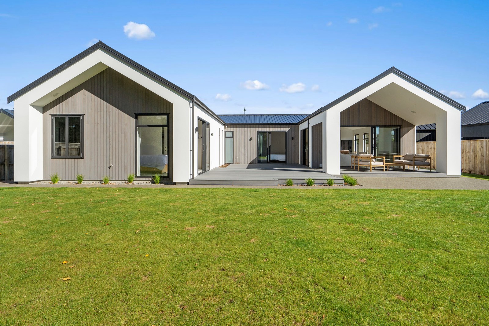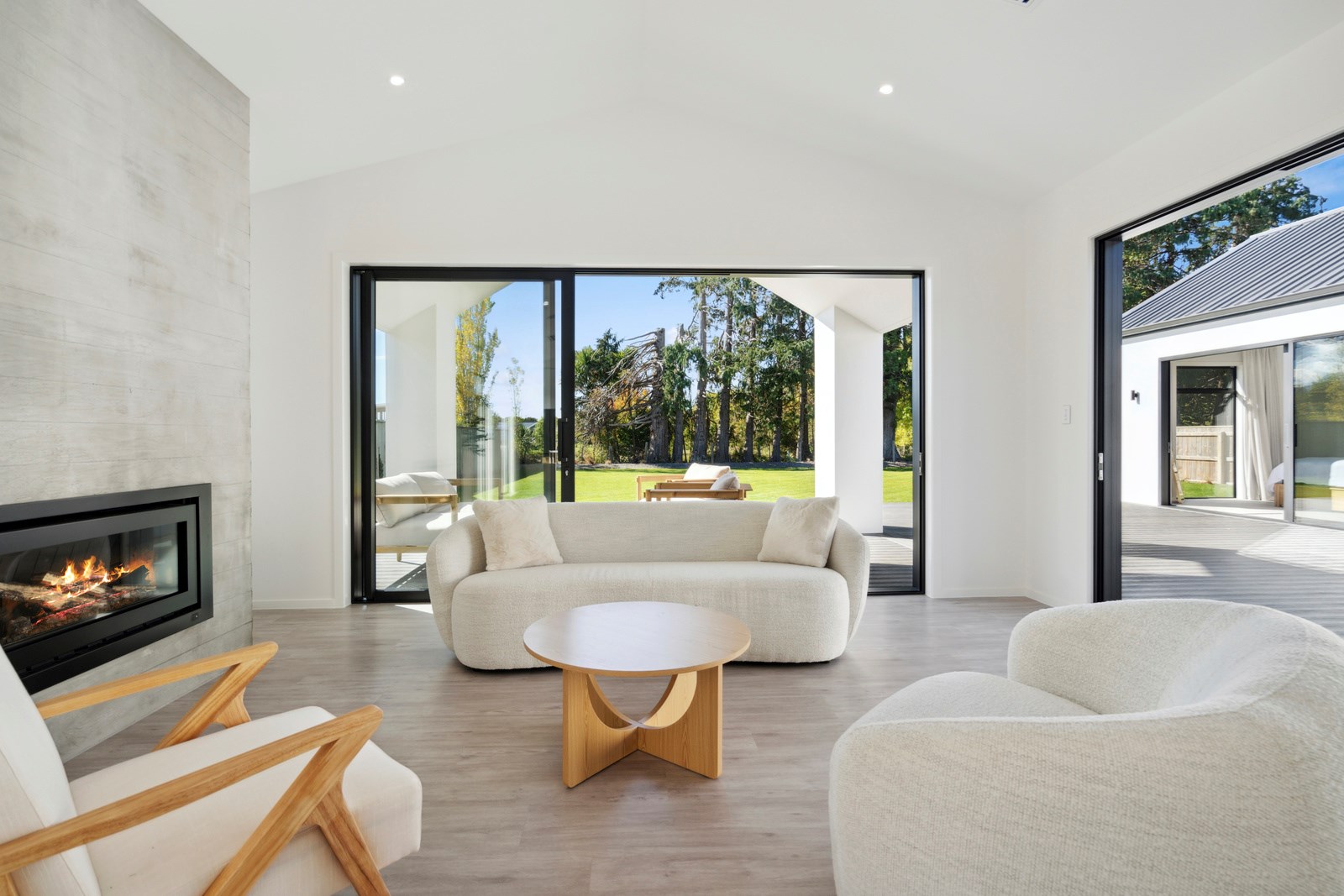 A separate TV room with slot windows to the street ensures a private space to break out to and watch TV. By cleverly repeating these windows on the garage wall, it works to provide a pleasing sense of symmetry. When it comes to outdoor living, there are options on two sides of the living area – under the portico on one side or tucked in on decking that flows from living over to the main bedroom on the other. This home is designed to take in the sunshine and views of the Tararua Ranges from many vantage points including, perhaps, the bath in the main suite.