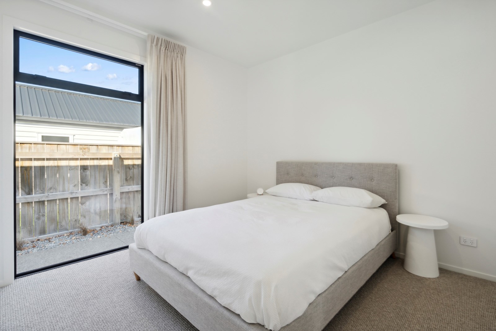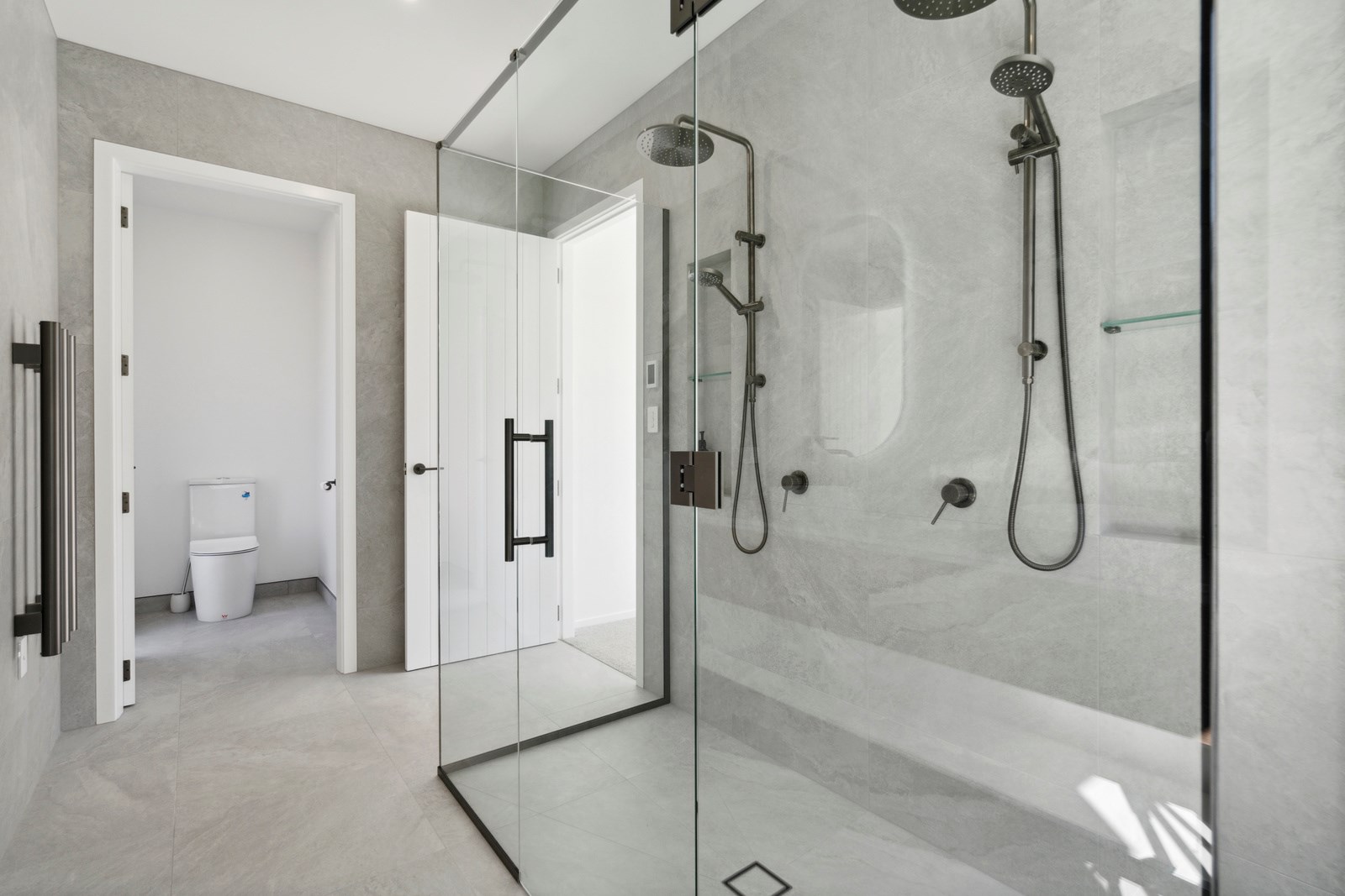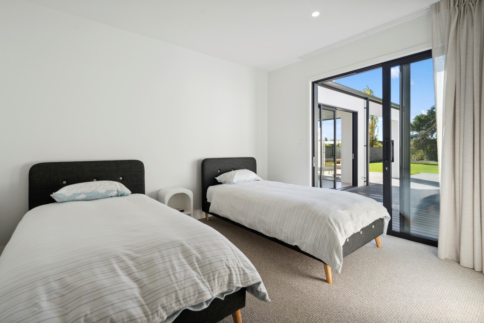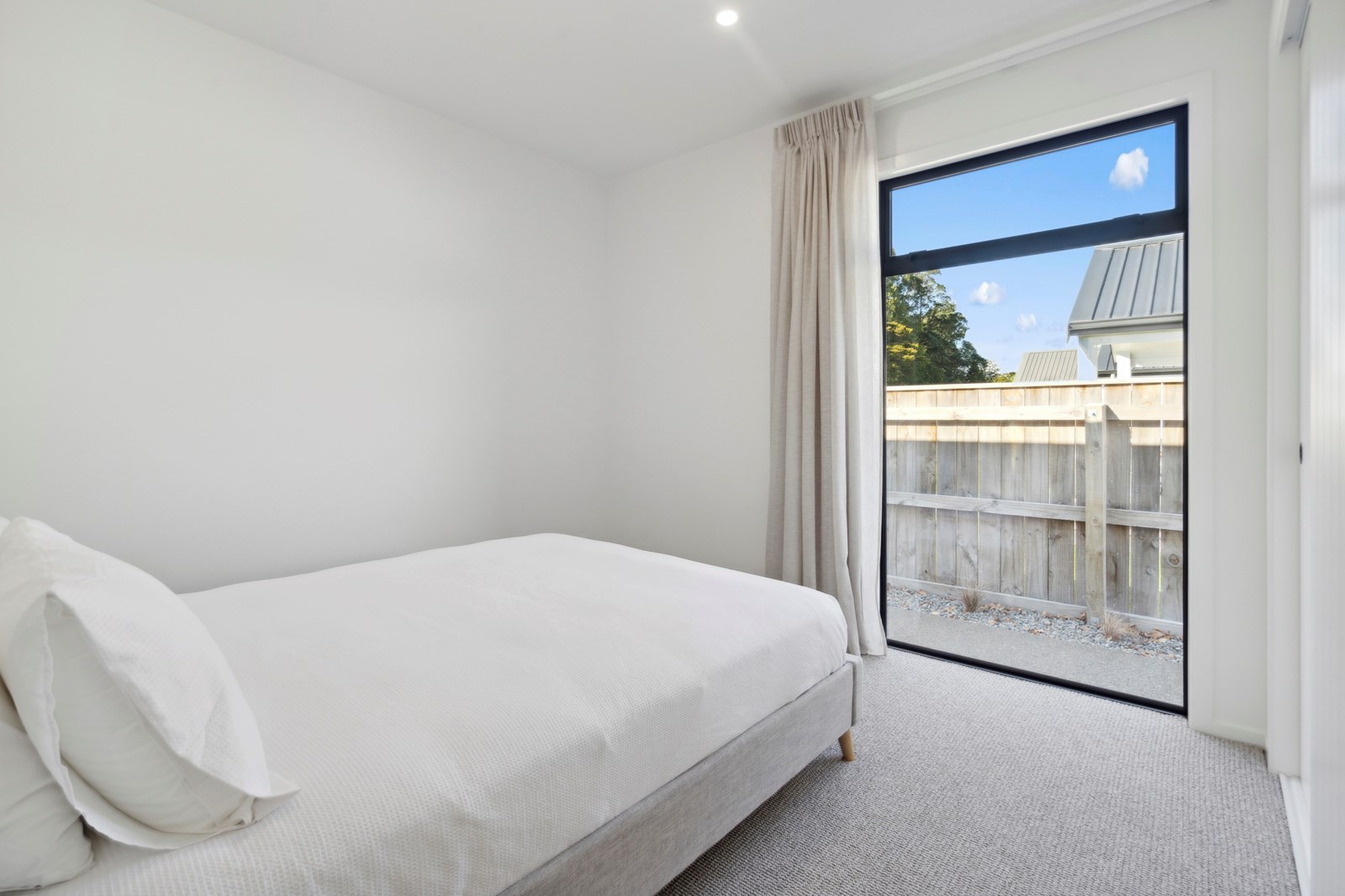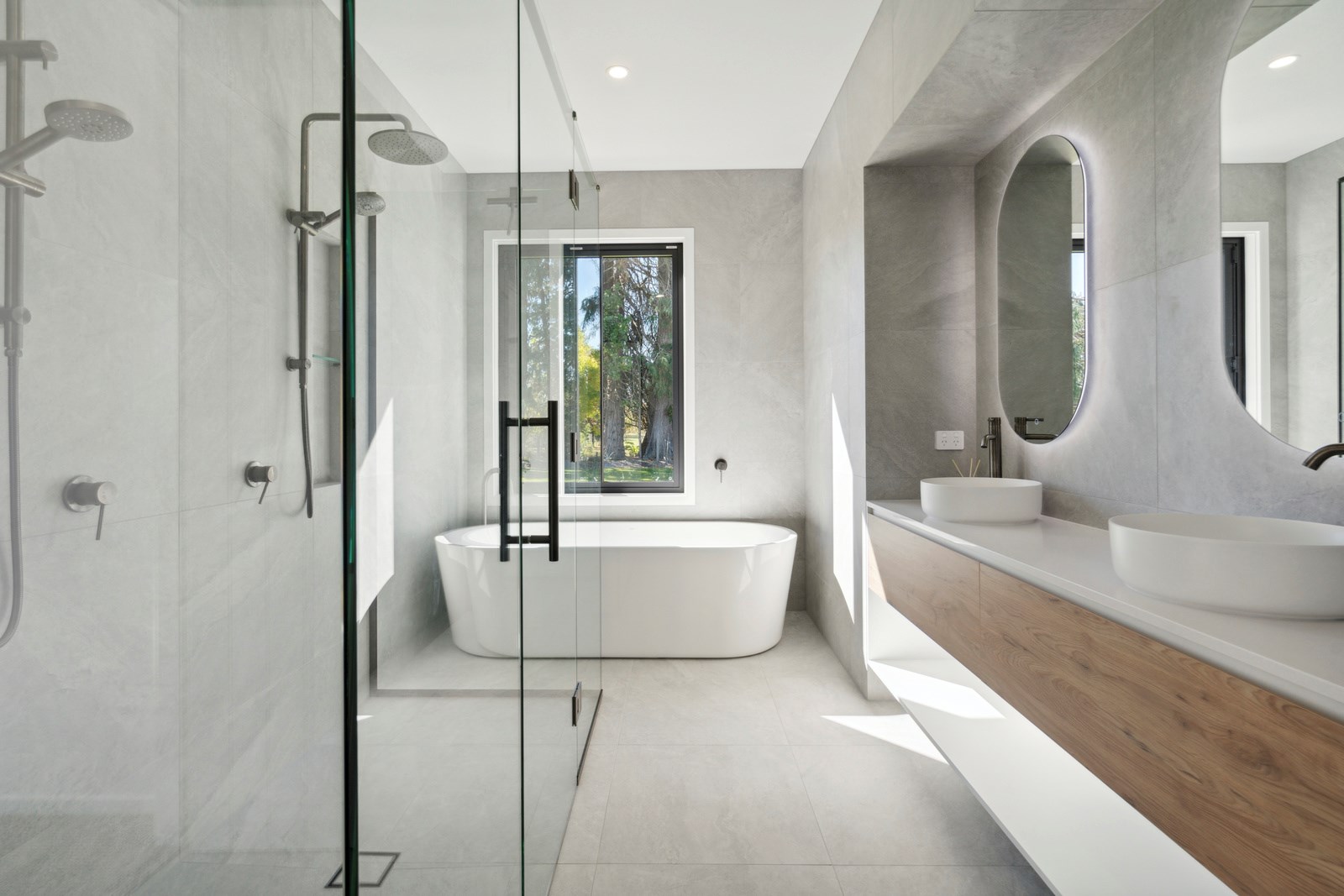 A separate TV room with slot windows to the street ensures a private space to break out to and watch TV. By cleverly repeating these windows on the garage wall, it works to provide a pleasing sense of symmetry. When it comes to outdoor living, there are options on two sides of the living area – under the portico on one side or tucked in on decking that flows from living over to the main bedroom on the other. This home is designed to take in the sunshine and views of the Tararua Ranges from many vantage points including, perhaps, the bath in the main suite.