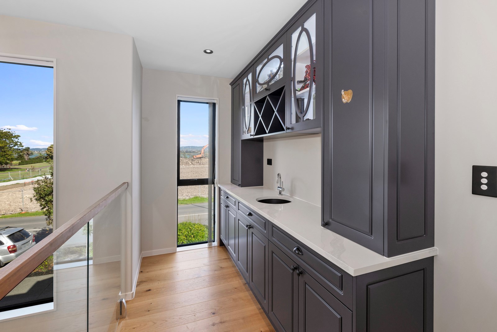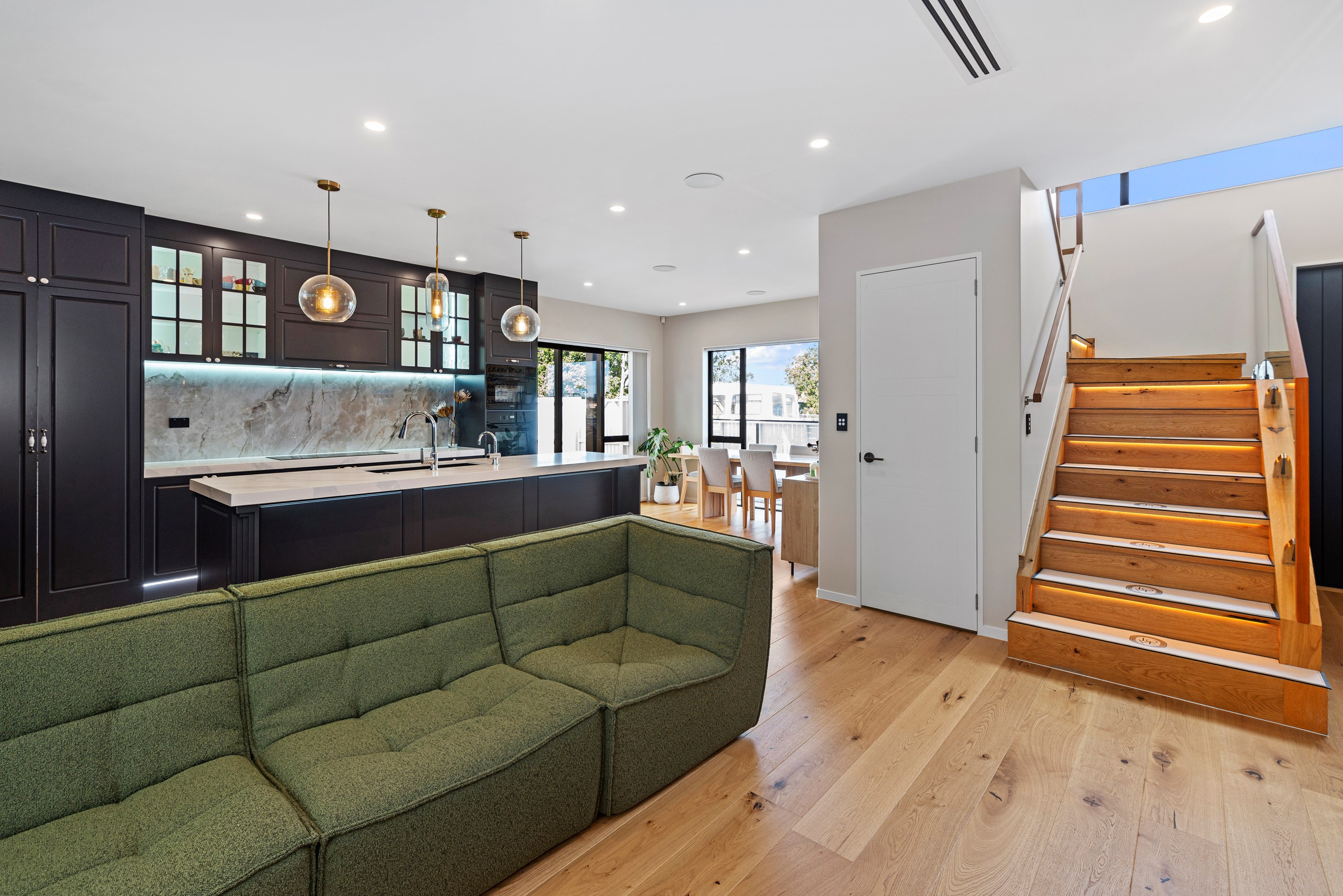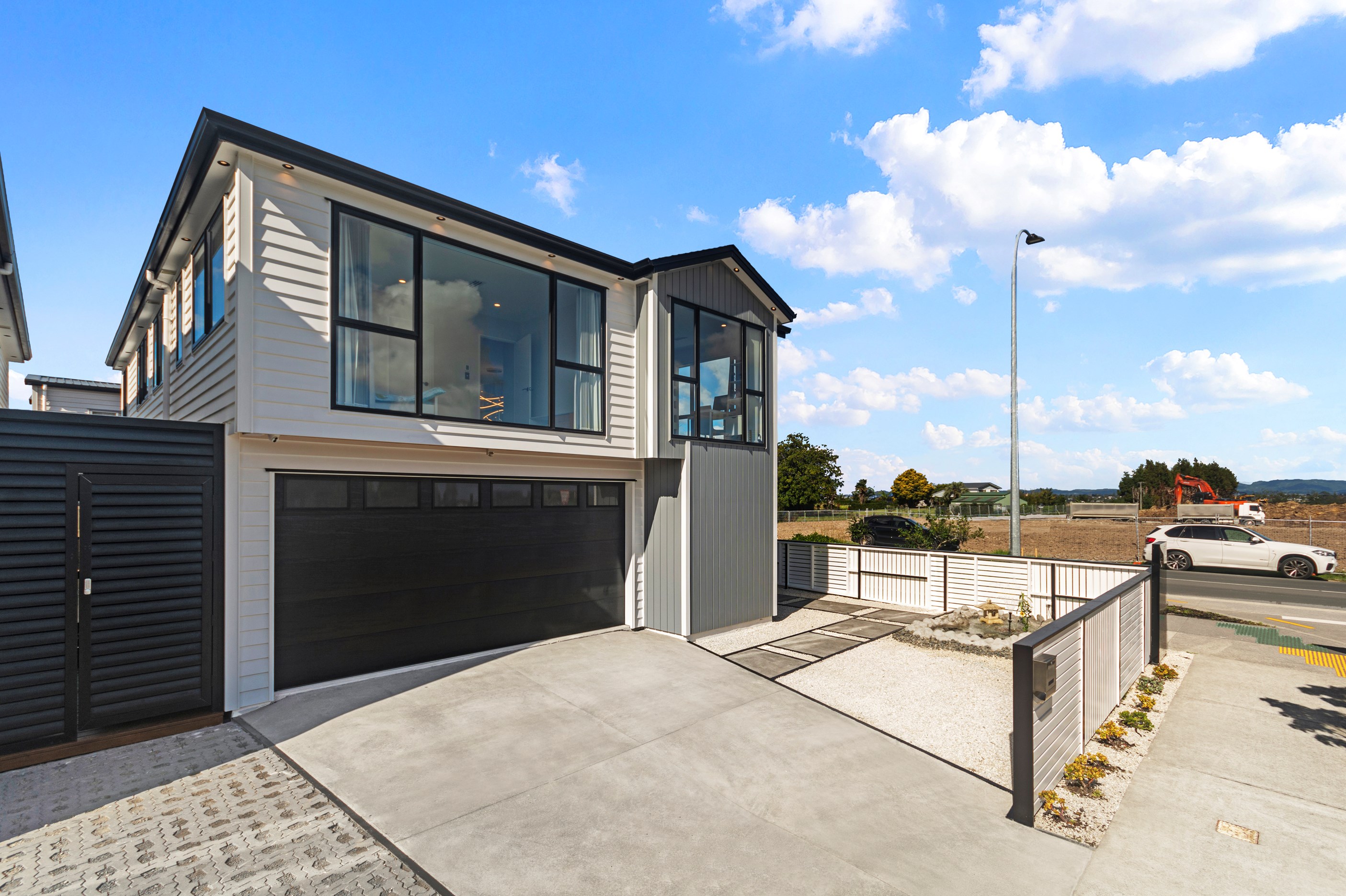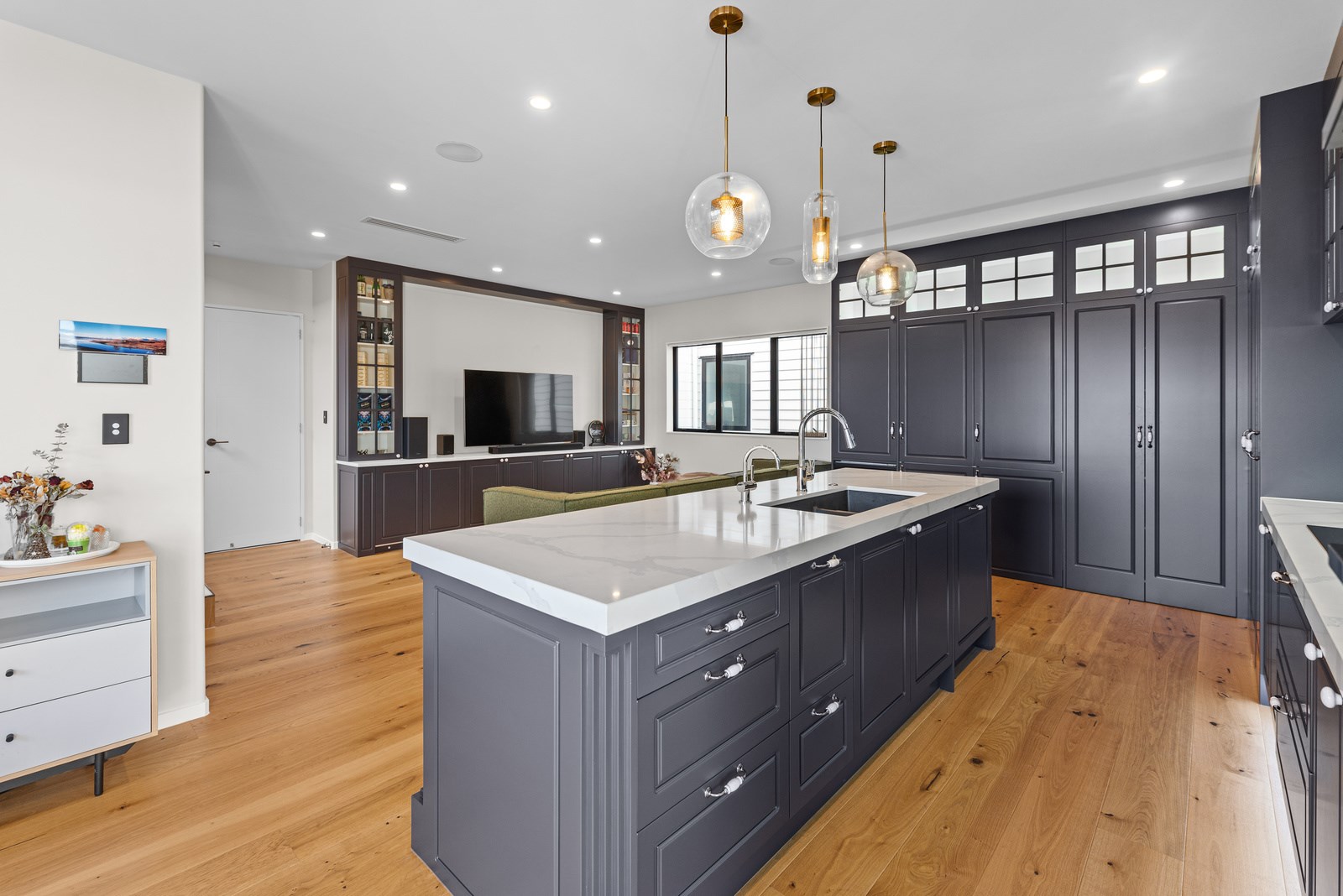 Being situated on a corner site gives this two-storey home the luxury of having the front entrance on a separate face to the garage and driveway, which creates a pleasant arrival for visitors and good separation from other homes within the Hobsonville development. Pitch changes in the roofline, a mix of dark cedar and light weatherboard cladding, and downlights strung around the soffit create visual appeal day and night. Expansive dark kitchen cabinetry creates an impressive focal point inside against the marbled countertops and splashback. Step through to the scullery and the same cabinetry profile features in white. Timber floors bring warmth to the kitchen, living, dining and entry, and timber stairs with glass balustrades lead to the second floor.