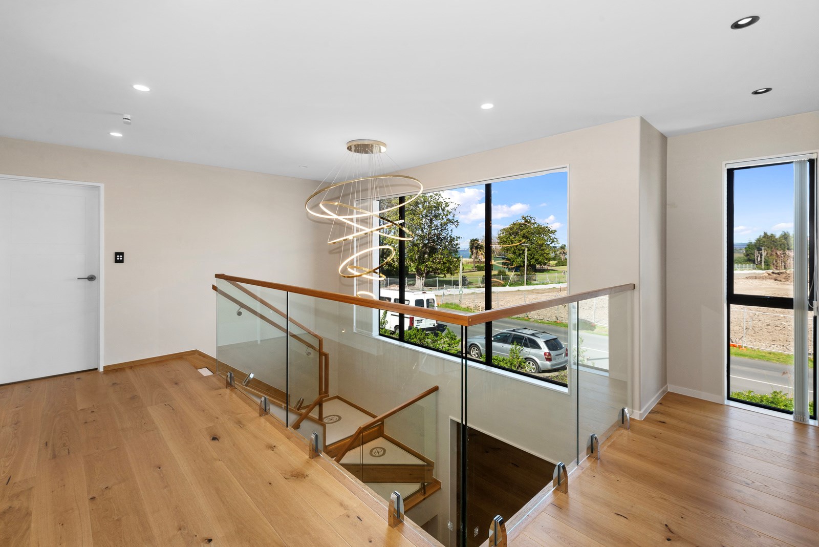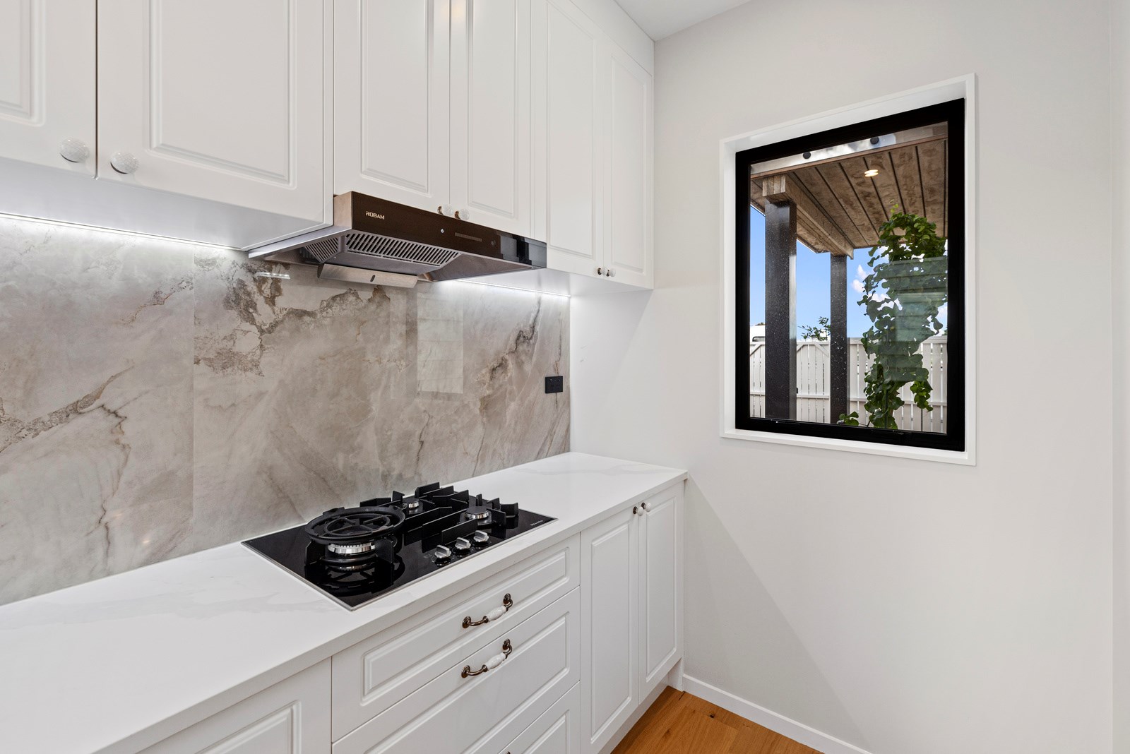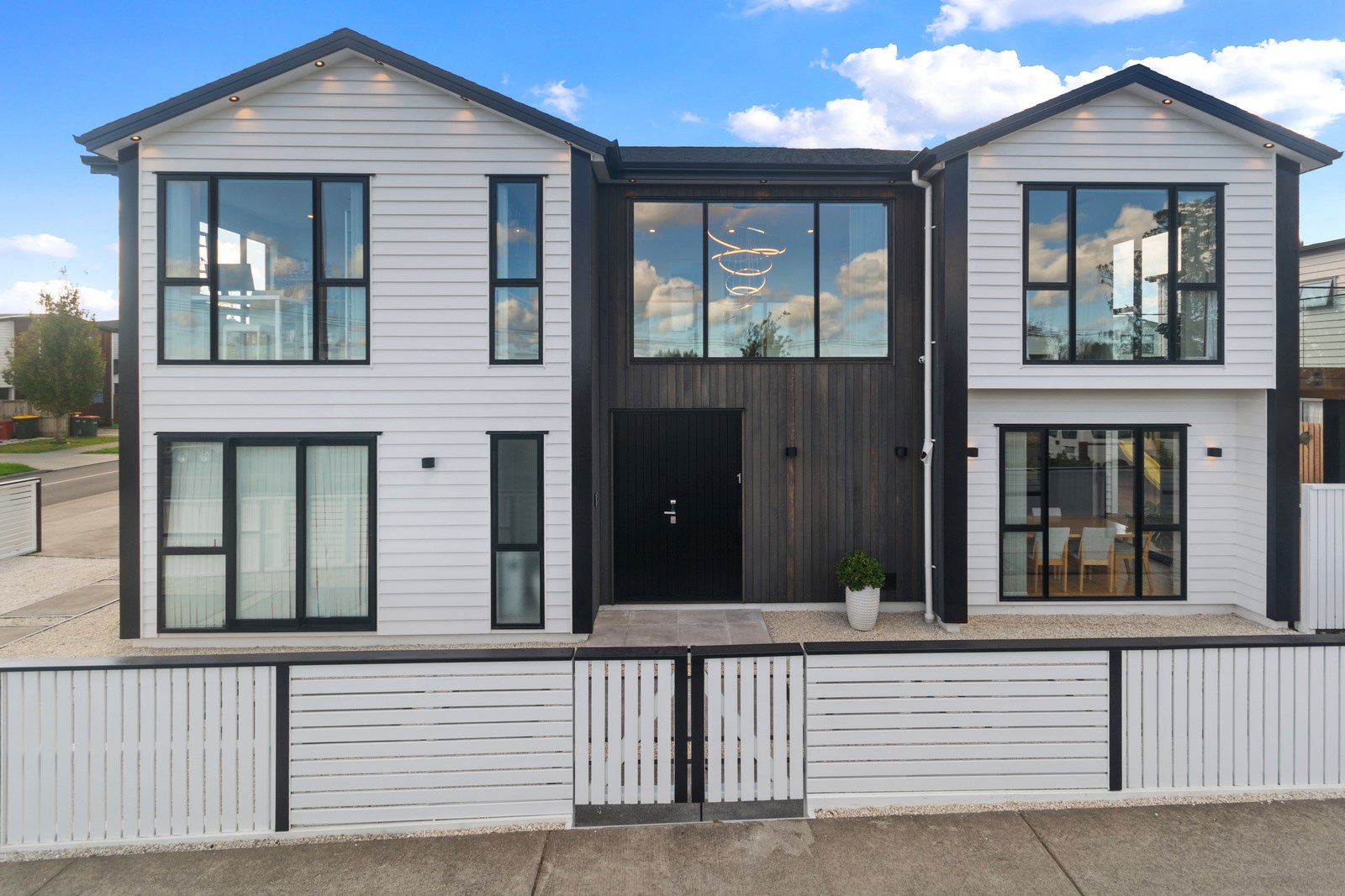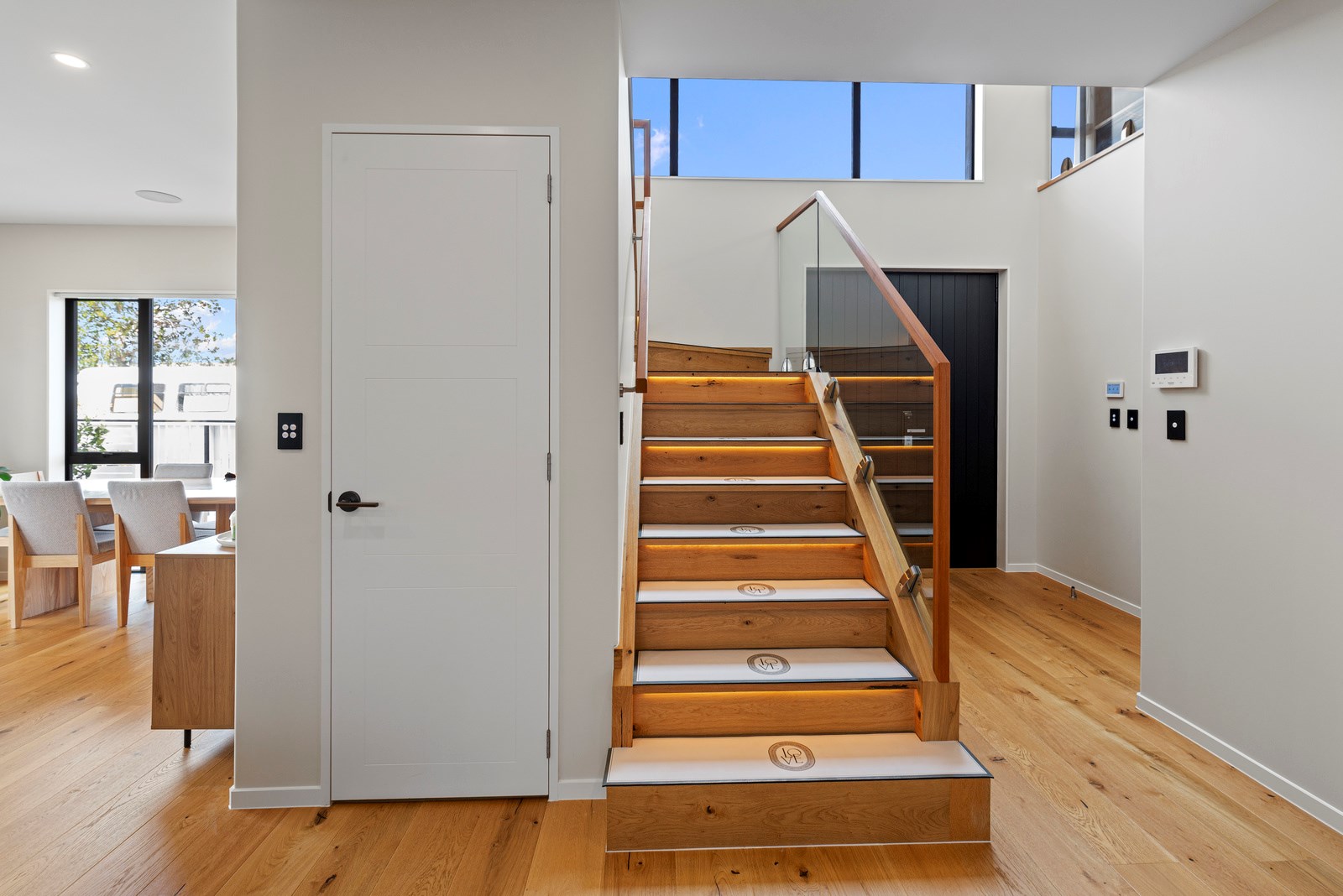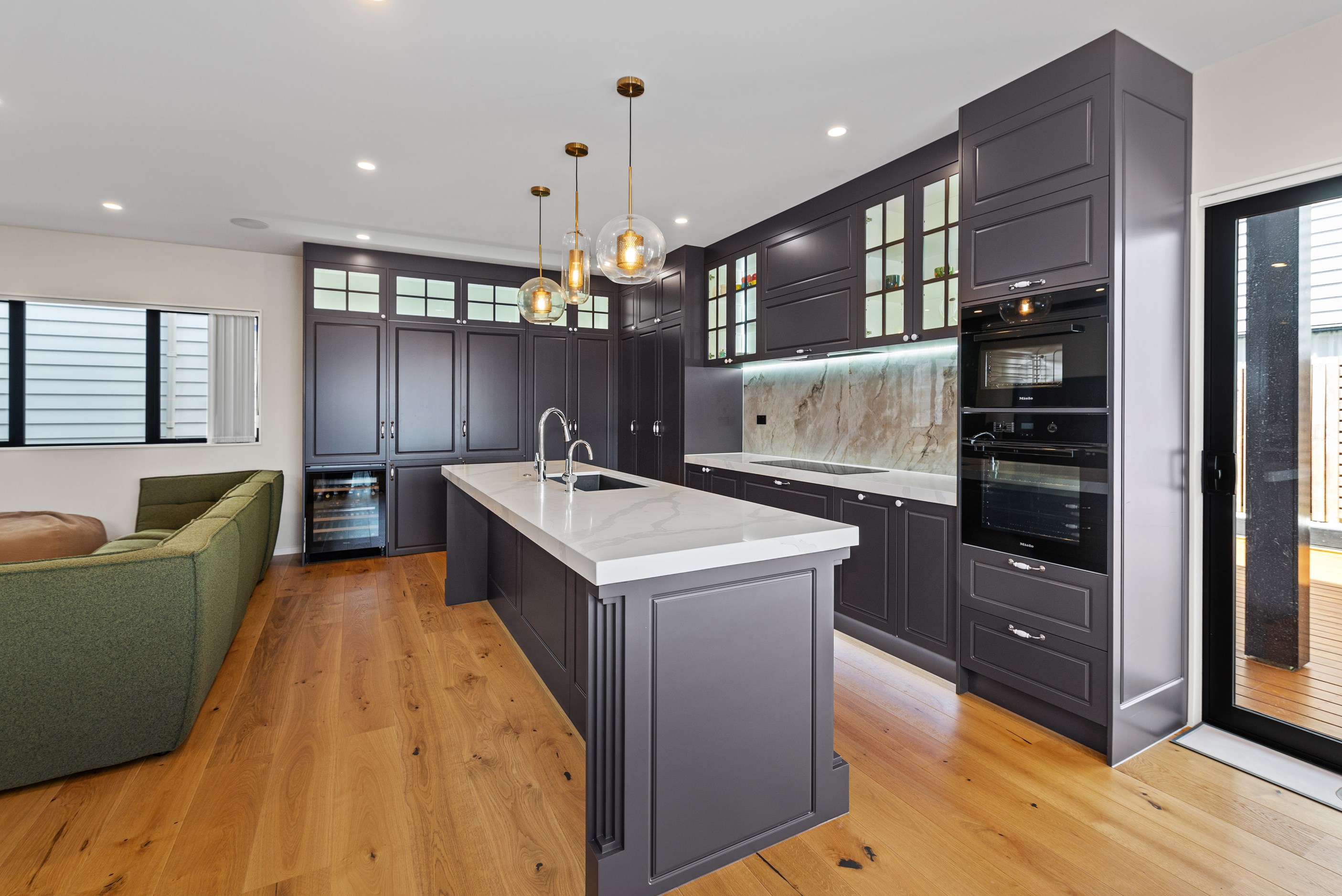 Being situated on a corner site gives this two-storey home the luxury of having the front entrance on a separate face to the garage and driveway, which creates a pleasant arrival for visitors and good separation from other homes within the Hobsonville development. Pitch changes in the roofline, a mix of dark cedar and light weatherboard cladding, and downlights strung around the soffit create visual appeal day and night. Expansive dark kitchen cabinetry creates an impressive focal point inside against the marbled countertops and splashback. Step through to the scullery and the same cabinetry profile features in white. Timber floors bring warmth to the kitchen, living, dining and entry, and timber stairs with glass balustrades lead to the second floor.