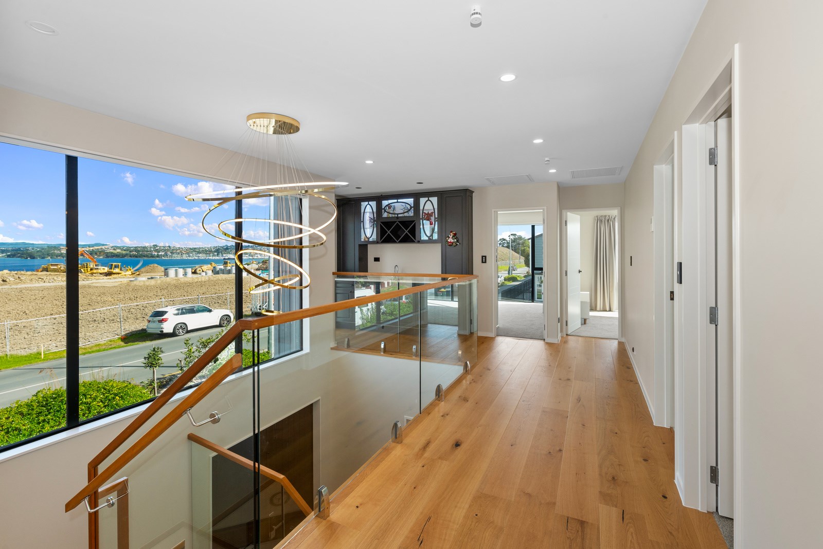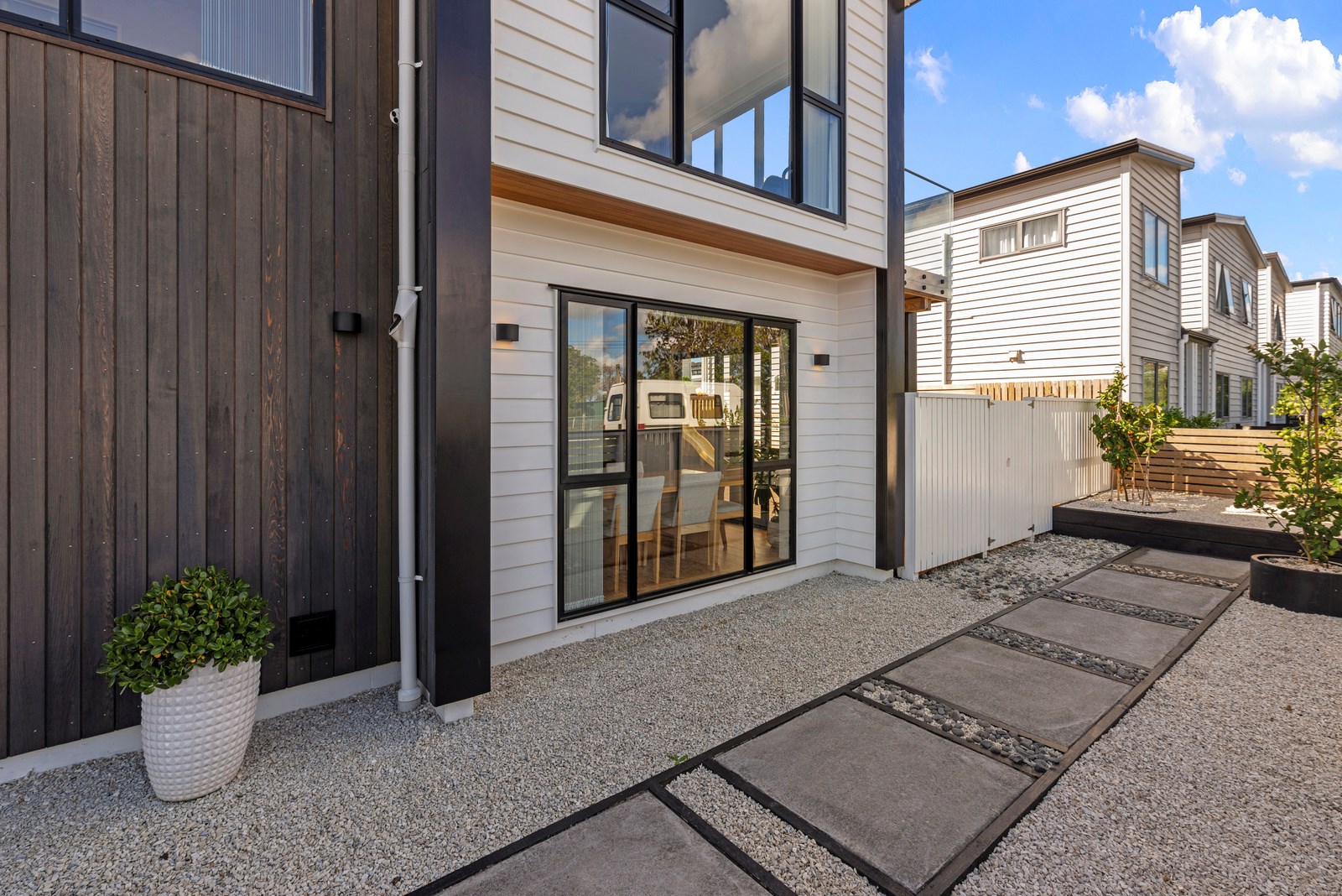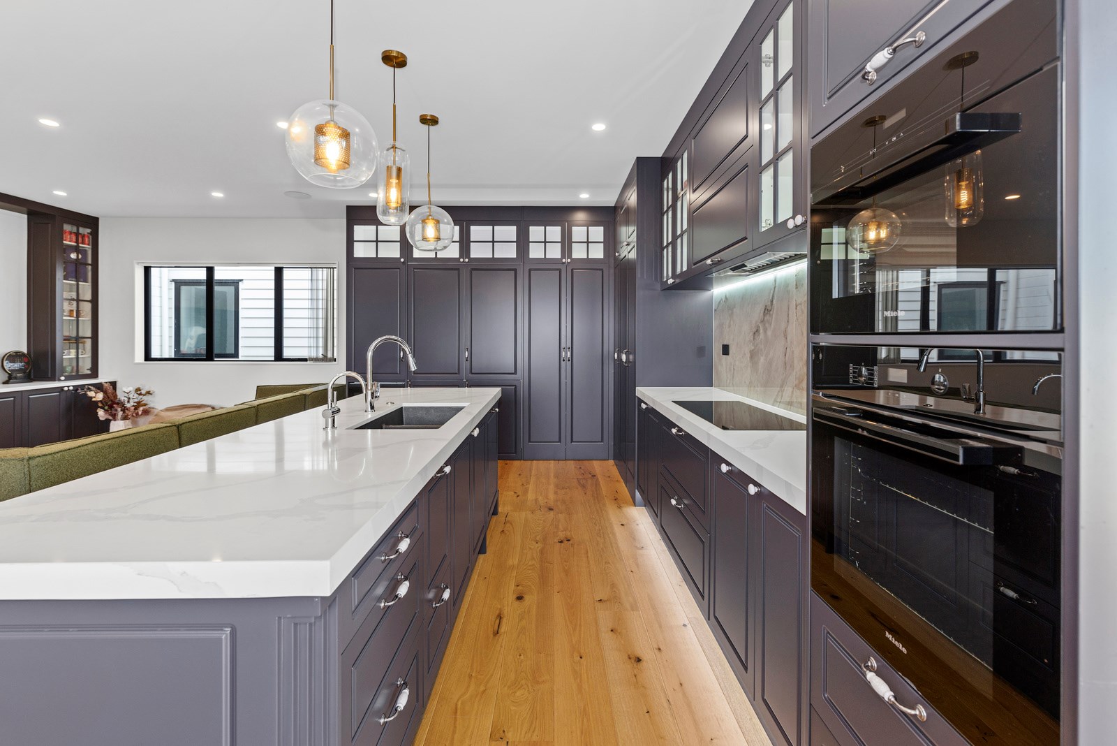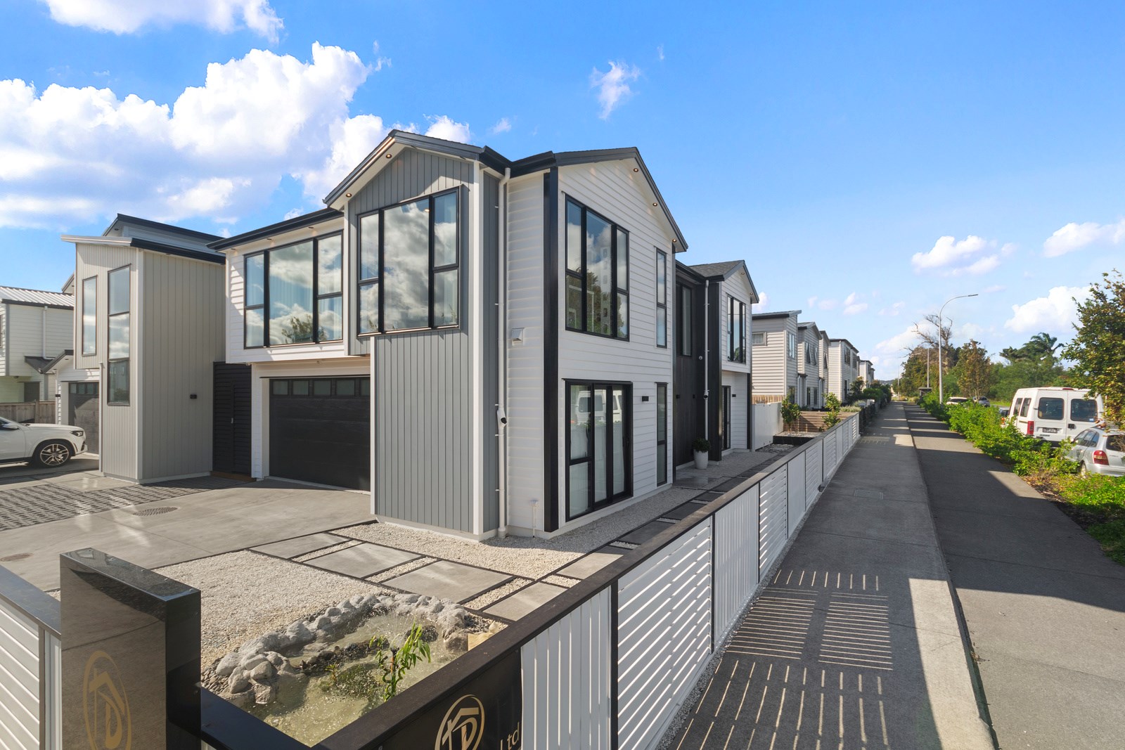 Being situated on a corner site gives this two-storey home the luxury of having the front entrance on a separate face to the garage and driveway, which creates a pleasant arrival for visitors and good separation from other homes within the Hobsonville development. Pitch changes in the roofline, a mix of dark cedar and light weatherboard cladding, and downlights strung around the soffit create visual appeal day and night. Expansive dark kitchen cabinetry creates an impressive focal point inside against the marbled countertops and splashback. Step through to the scullery and the same cabinetry profile features in white. Timber floors bring warmth to the kitchen, living, dining and entry, and timber stairs with glass balustrades lead to the second floor.