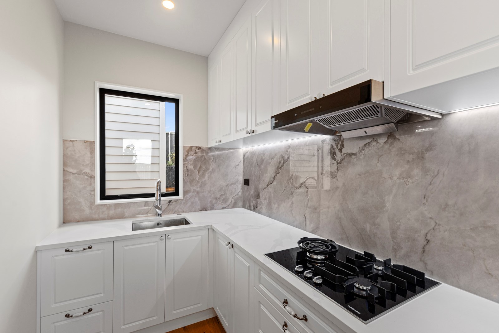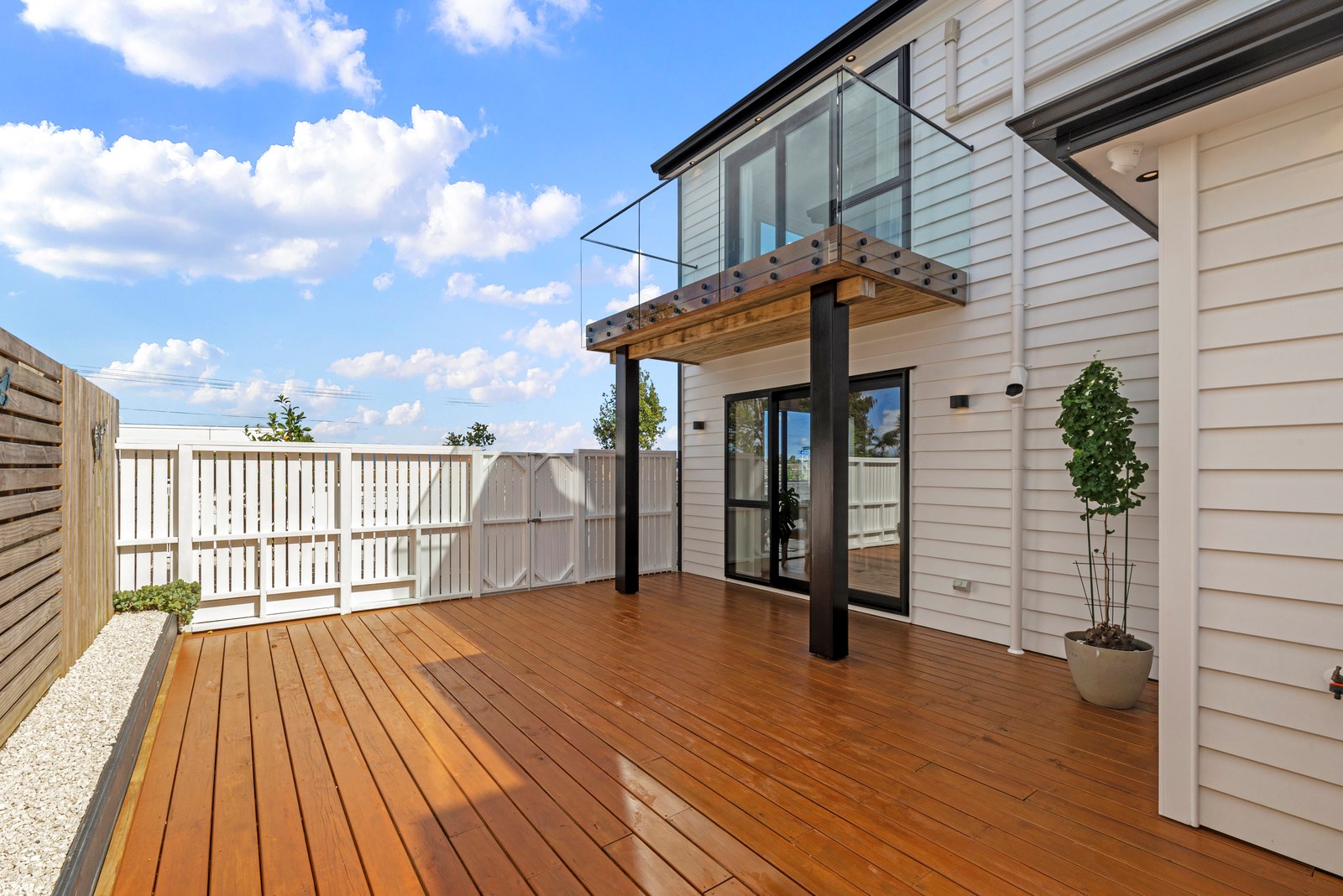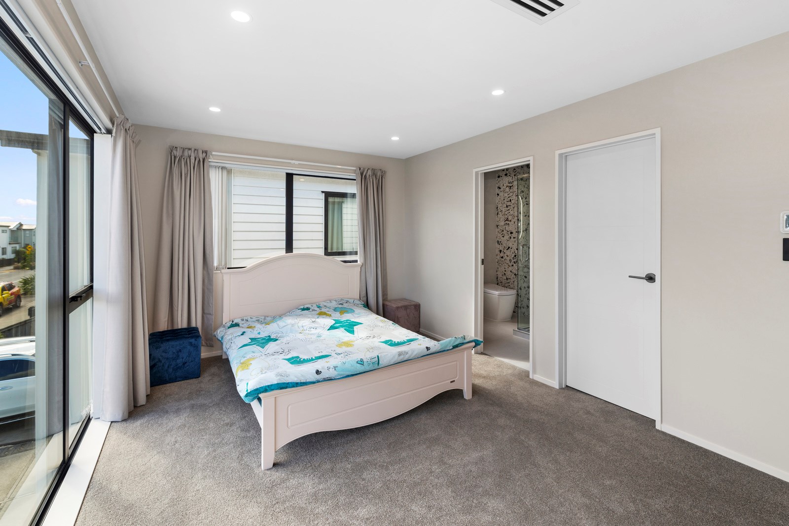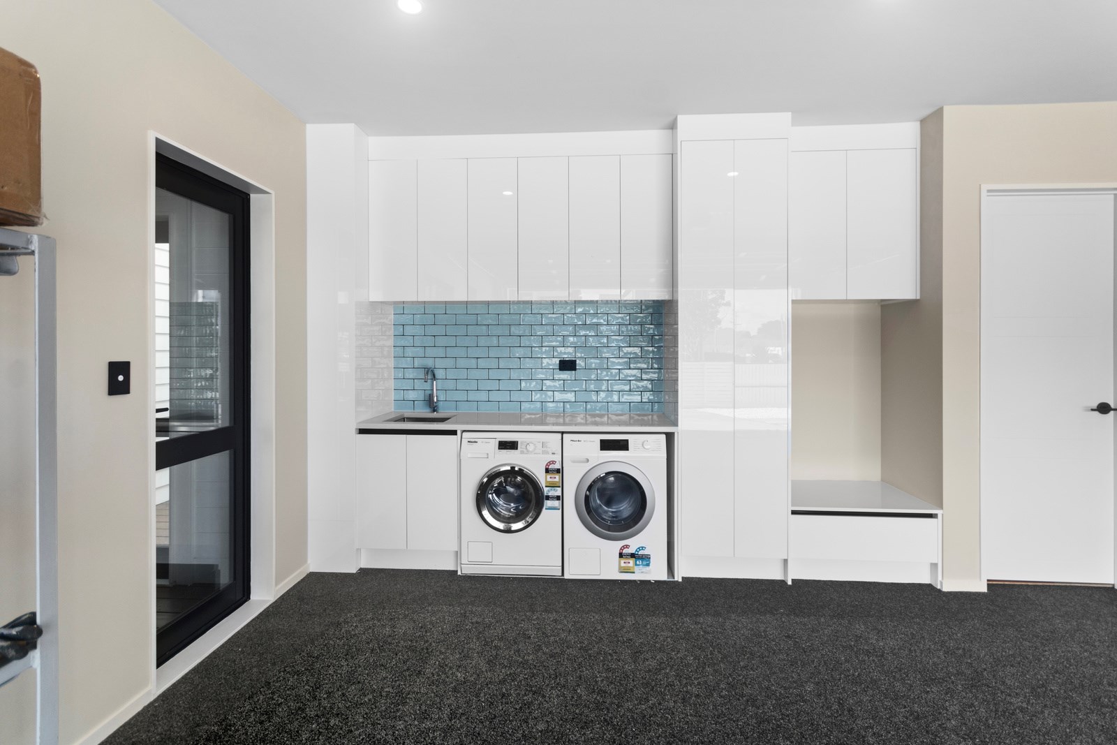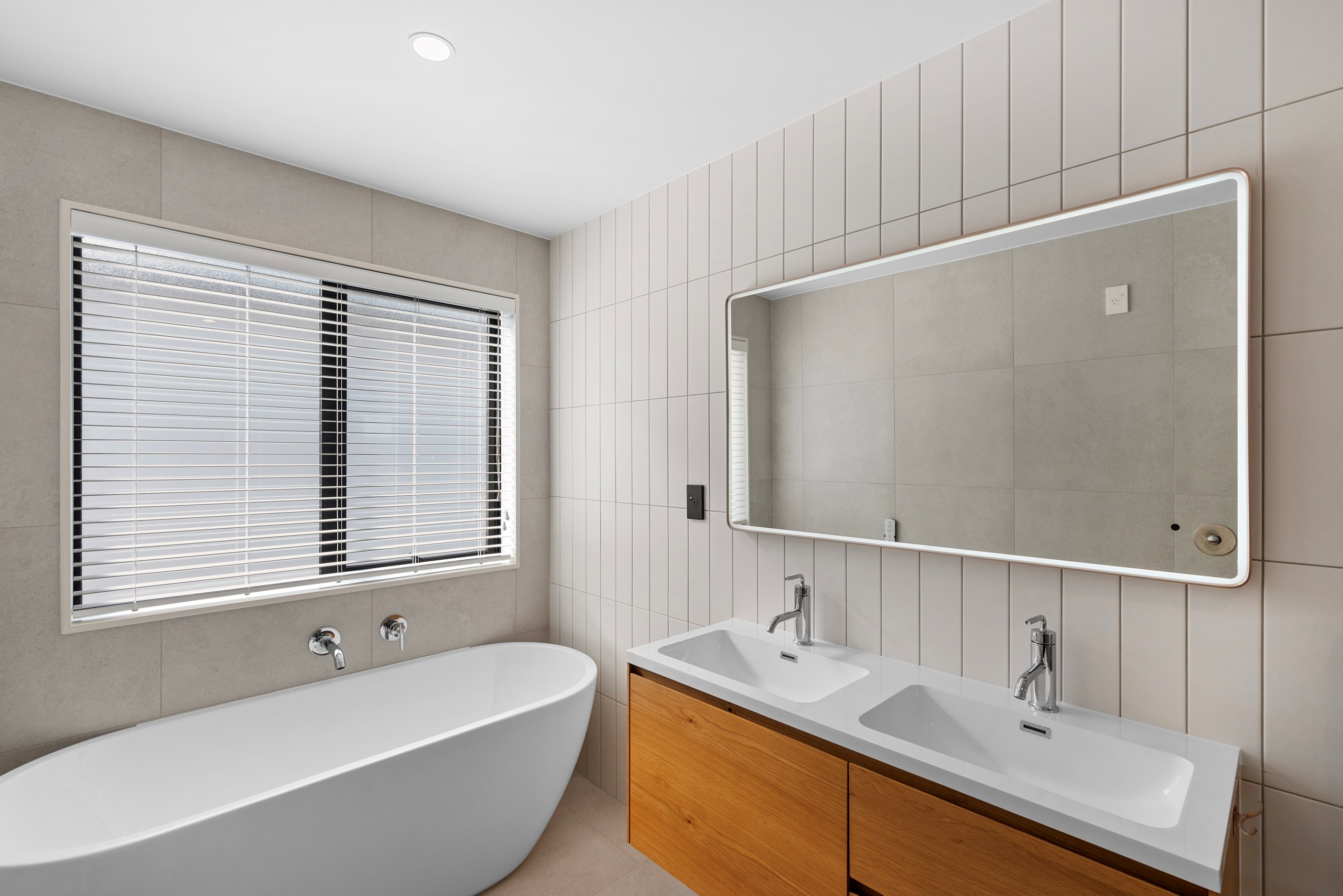 Being situated on a corner site gives this two-storey home the luxury of having the front entrance on a separate face to the garage and driveway, which creates a pleasant arrival for visitors and good separation from other homes within the Hobsonville development. Pitch changes in the roofline, a mix of dark cedar and light weatherboard cladding, and downlights strung around the soffit create visual appeal day and night. Expansive dark kitchen cabinetry creates an impressive focal point inside against the marbled countertops and splashback. Step through to the scullery and the same cabinetry profile features in white. Timber floors bring warmth to the kitchen, living, dining and entry, and timber stairs with glass balustrades lead to the second floor.