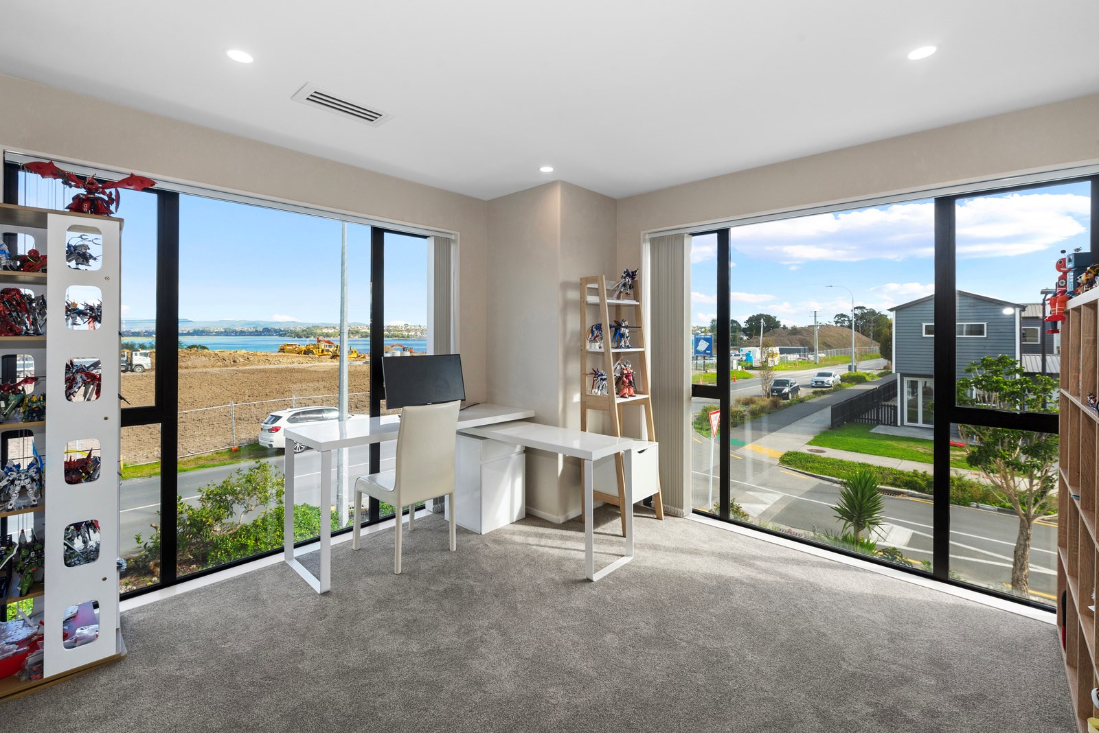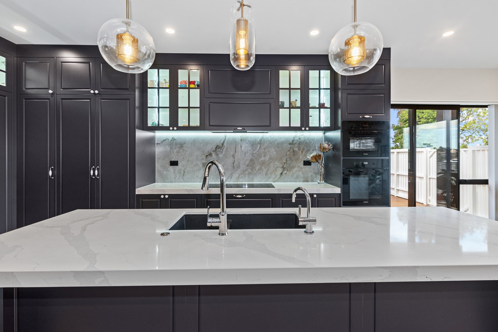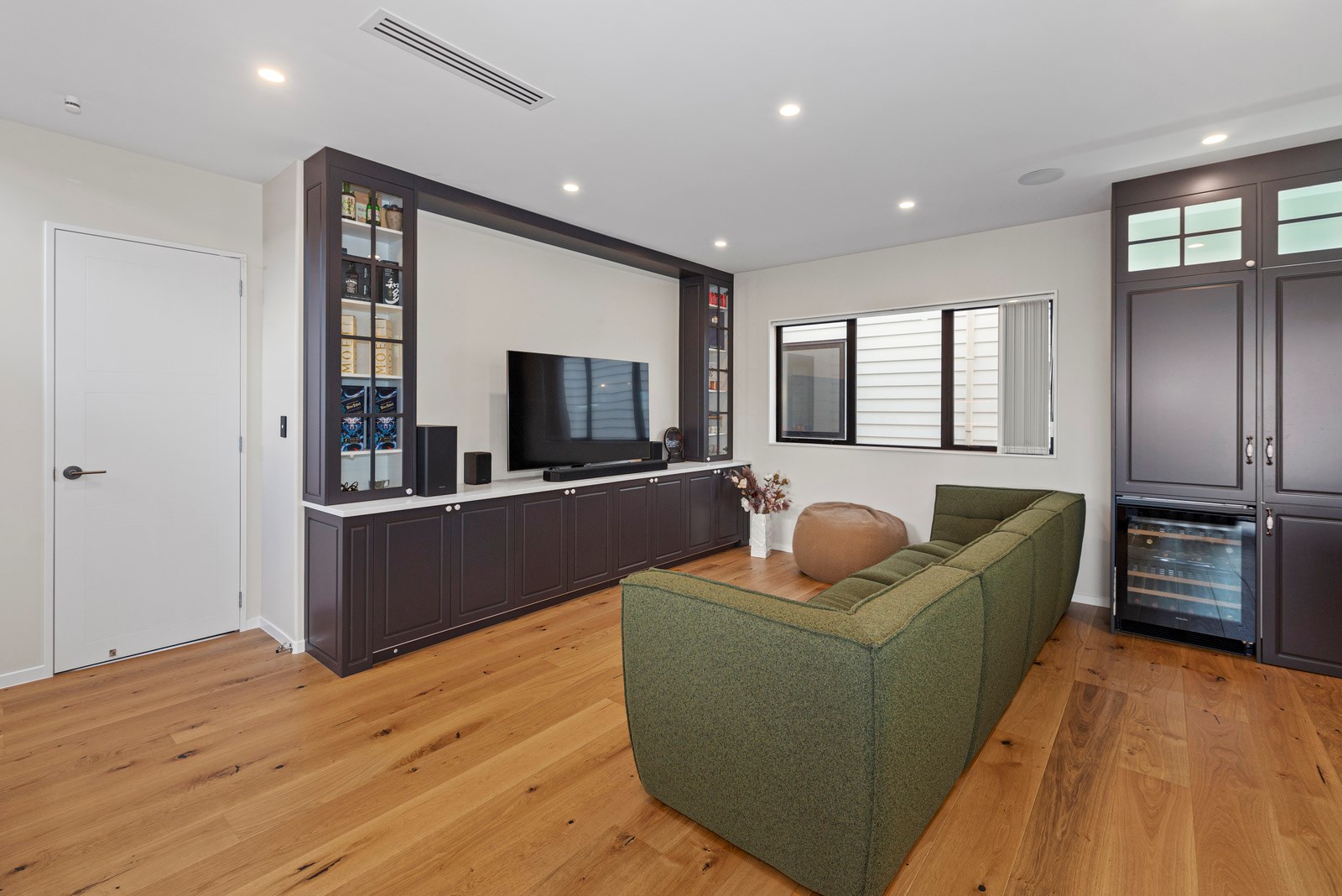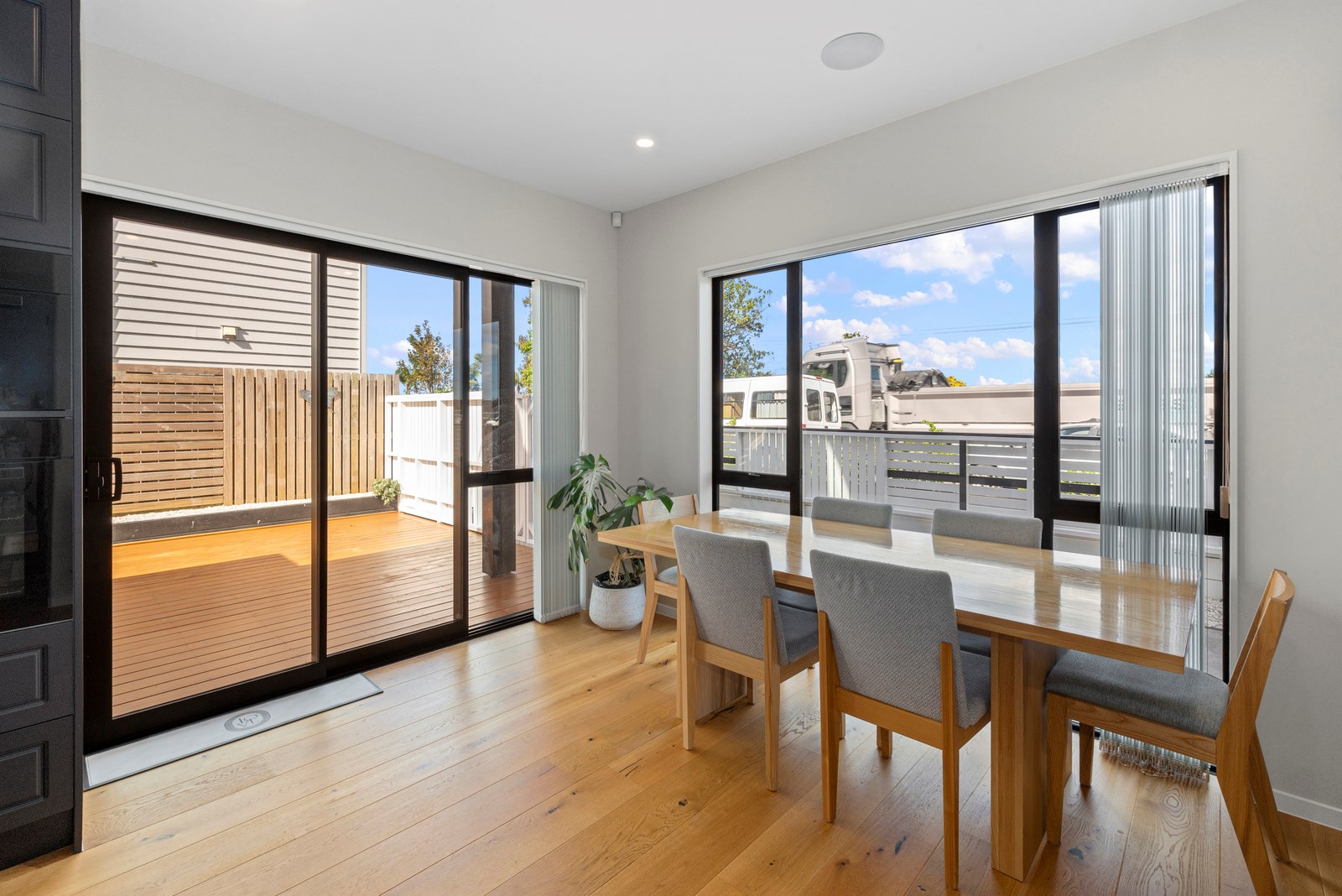 Being situated on a corner site gives this two-storey home the luxury of having the front entrance on a separate face to the garage and driveway, which creates a pleasant arrival for visitors and good separation from other homes within the Hobsonville development. Pitch changes in the roofline, a mix of dark cedar and light weatherboard cladding, and downlights strung around the soffit create visual appeal day and night. Expansive dark kitchen cabinetry creates an impressive focal point inside against the marbled countertops and splashback. Step through to the scullery and the same cabinetry profile features in white. Timber floors bring warmth to the kitchen, living, dining and entry, and timber stairs with glass balustrades lead to the second floor.
