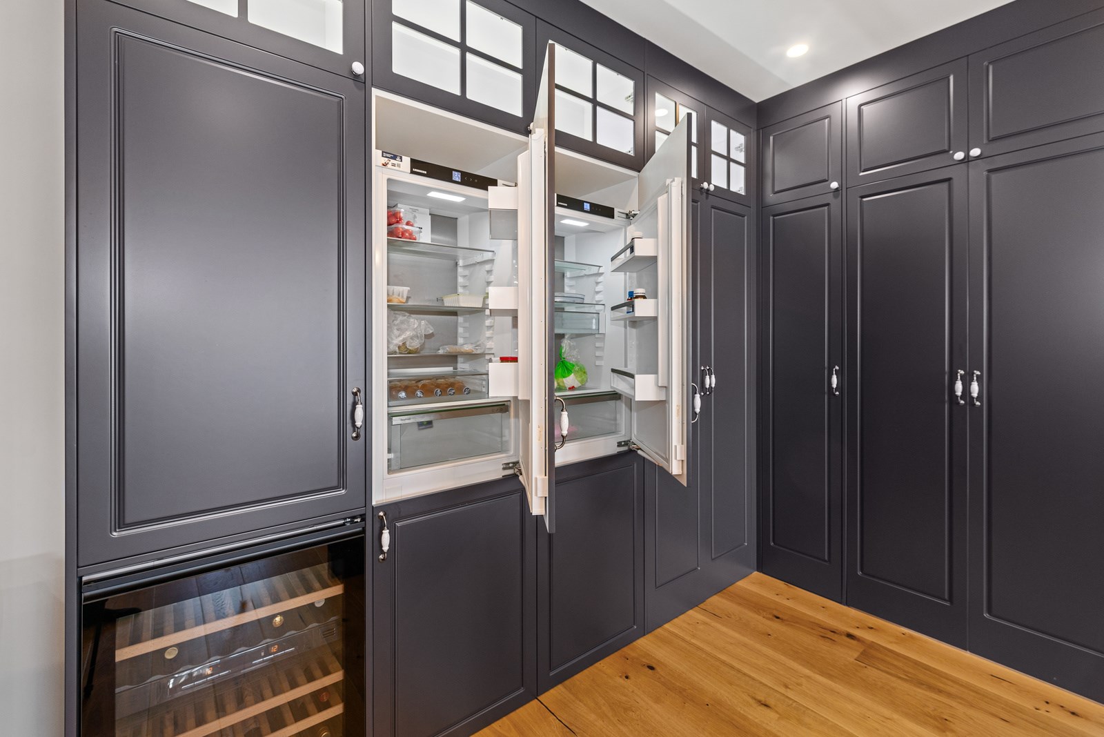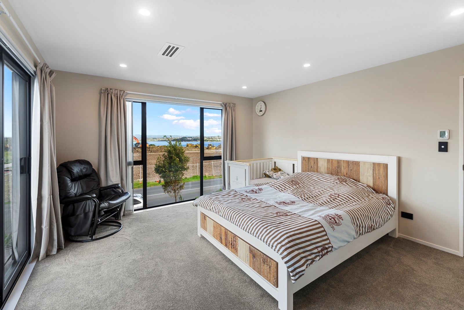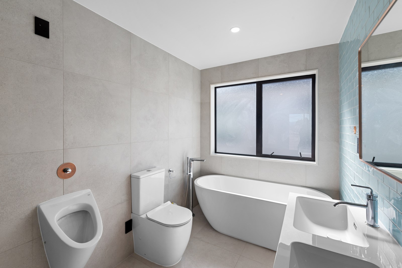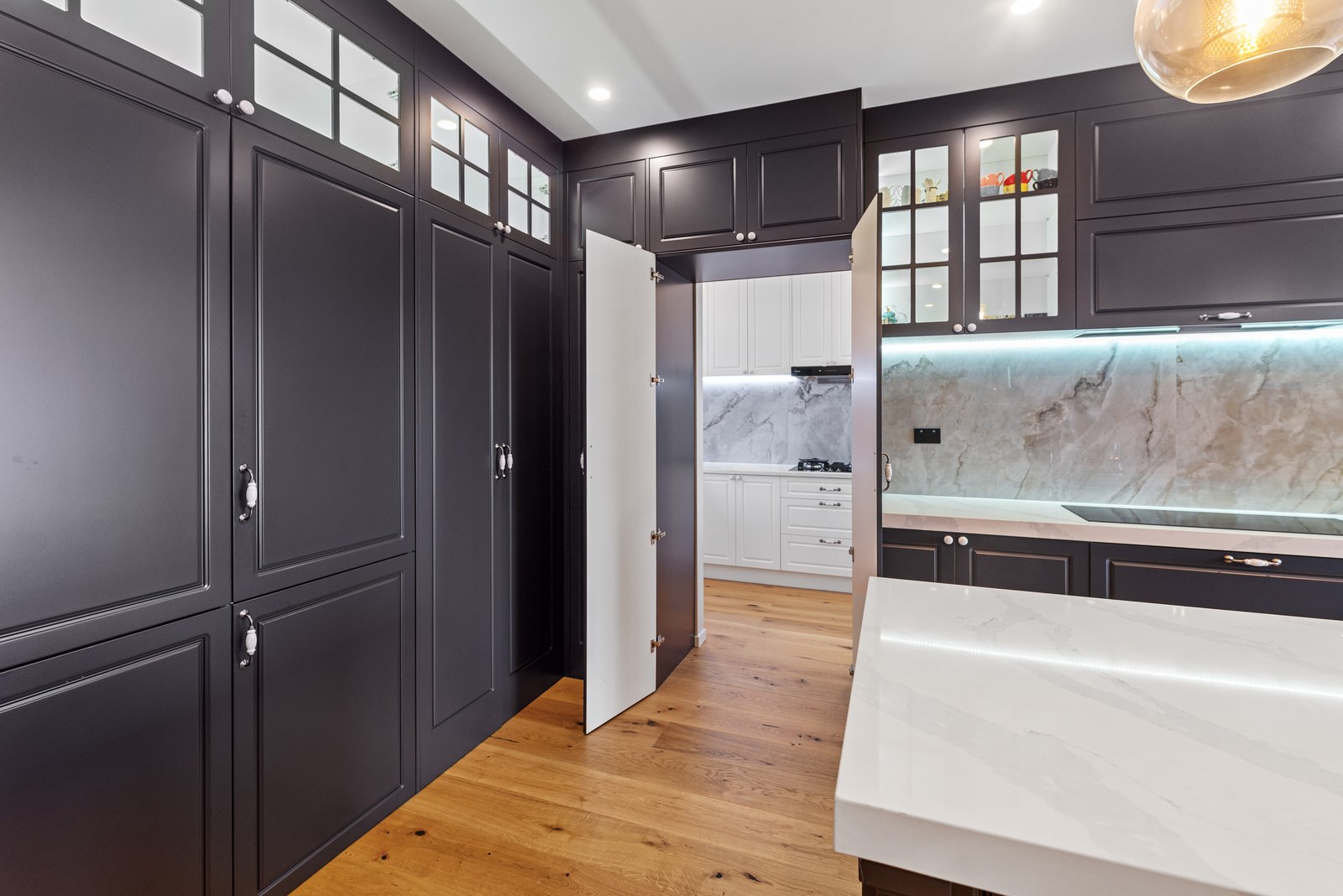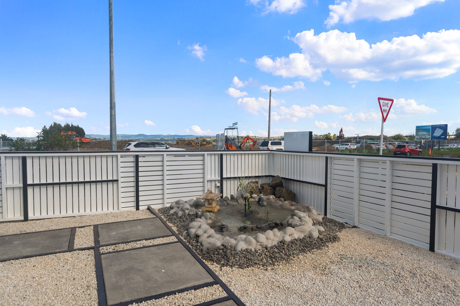 Being situated on a corner site gives this two-storey home the luxury of having the front entrance on a separate face to the garage and driveway, which creates a pleasant arrival for visitors and good separation from other homes within the Hobsonville development. Pitch changes in the roofline, a mix of dark cedar and light weatherboard cladding, and downlights strung around the soffit create visual appeal day and night. Expansive dark kitchen cabinetry creates an impressive focal point inside against the marbled countertops and splashback. Step through to the scullery and the same cabinetry profile features in white. Timber floors bring warmth to the kitchen, living, dining and entry, and timber stairs with glass balustrades lead to the second floor.
