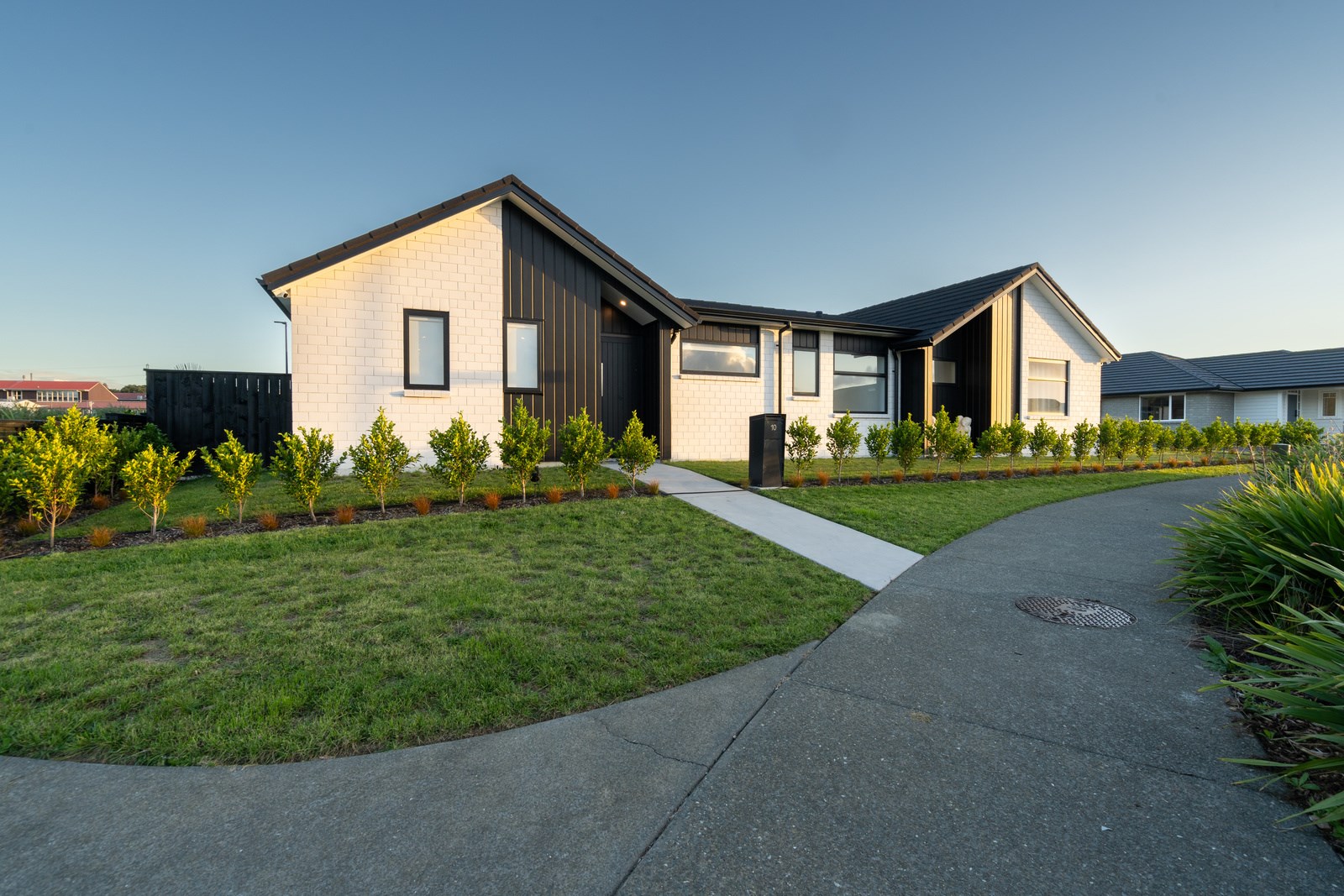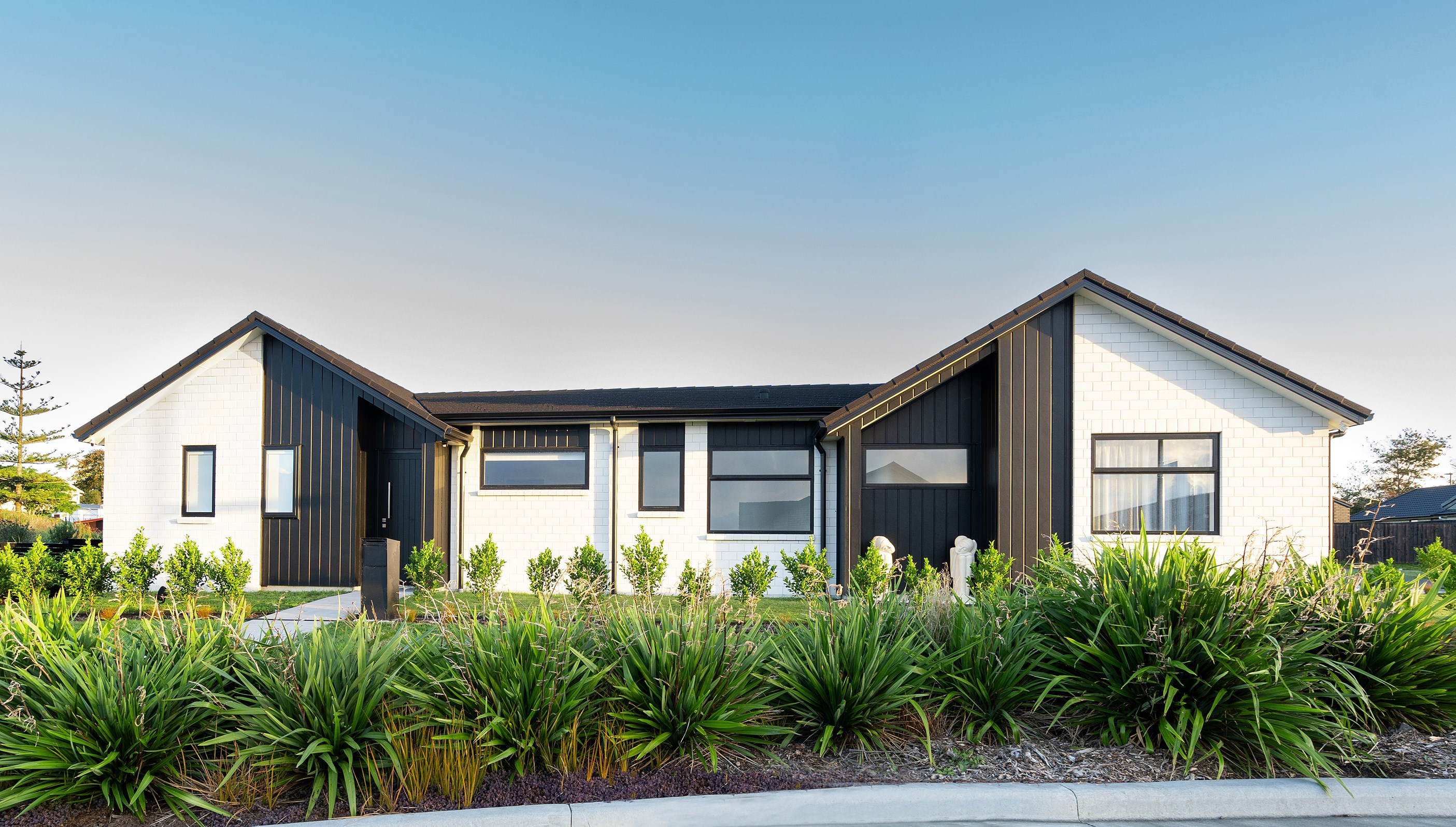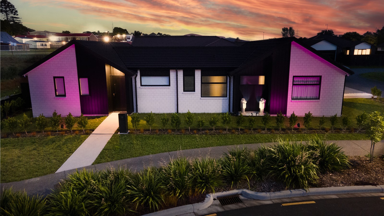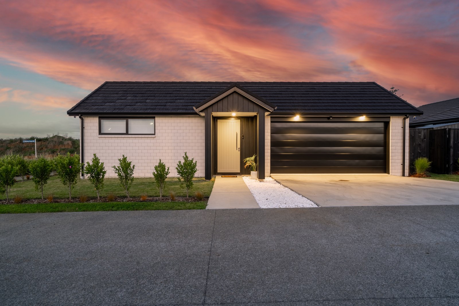 The family bathroom with a bath services two other bedrooms, while the main bedroom boasts a thoughtfully designed ensuite that cleverly separates toilet and shower behind a wall, keeping them out of sight from the bedroom. In harmony with the interior, white brick with black weatherboard accents clad the exterior of this attractive home that sits serenely on a corner site in the community of Paerata Rise. Come evening, exterior lighting gives the white walls a pink glow and a spirited persona.