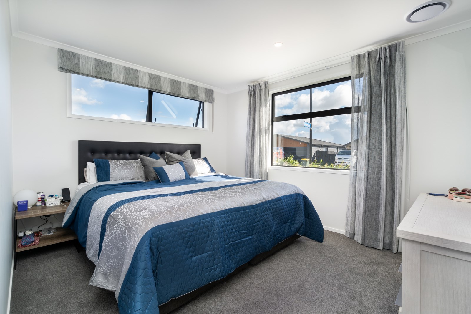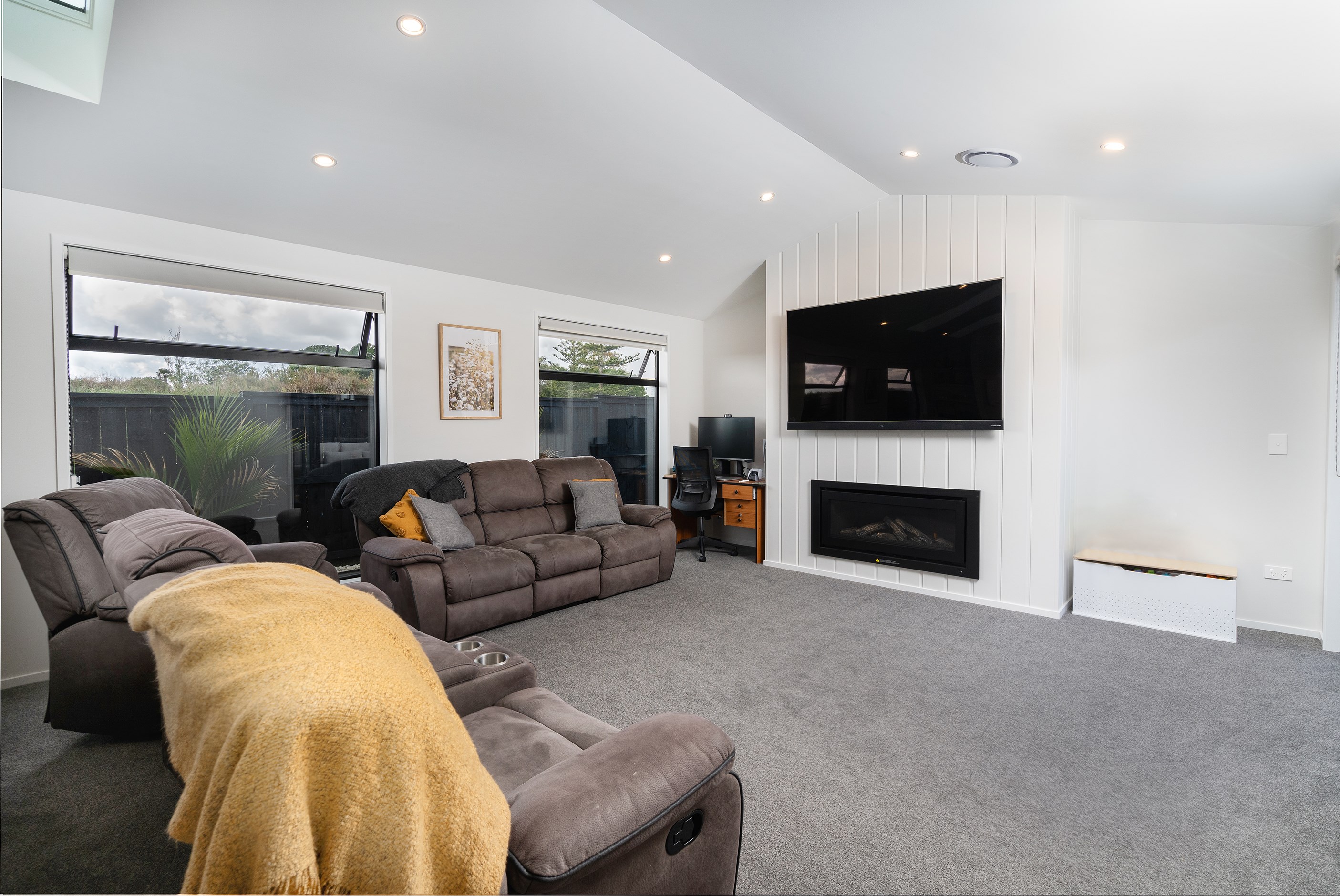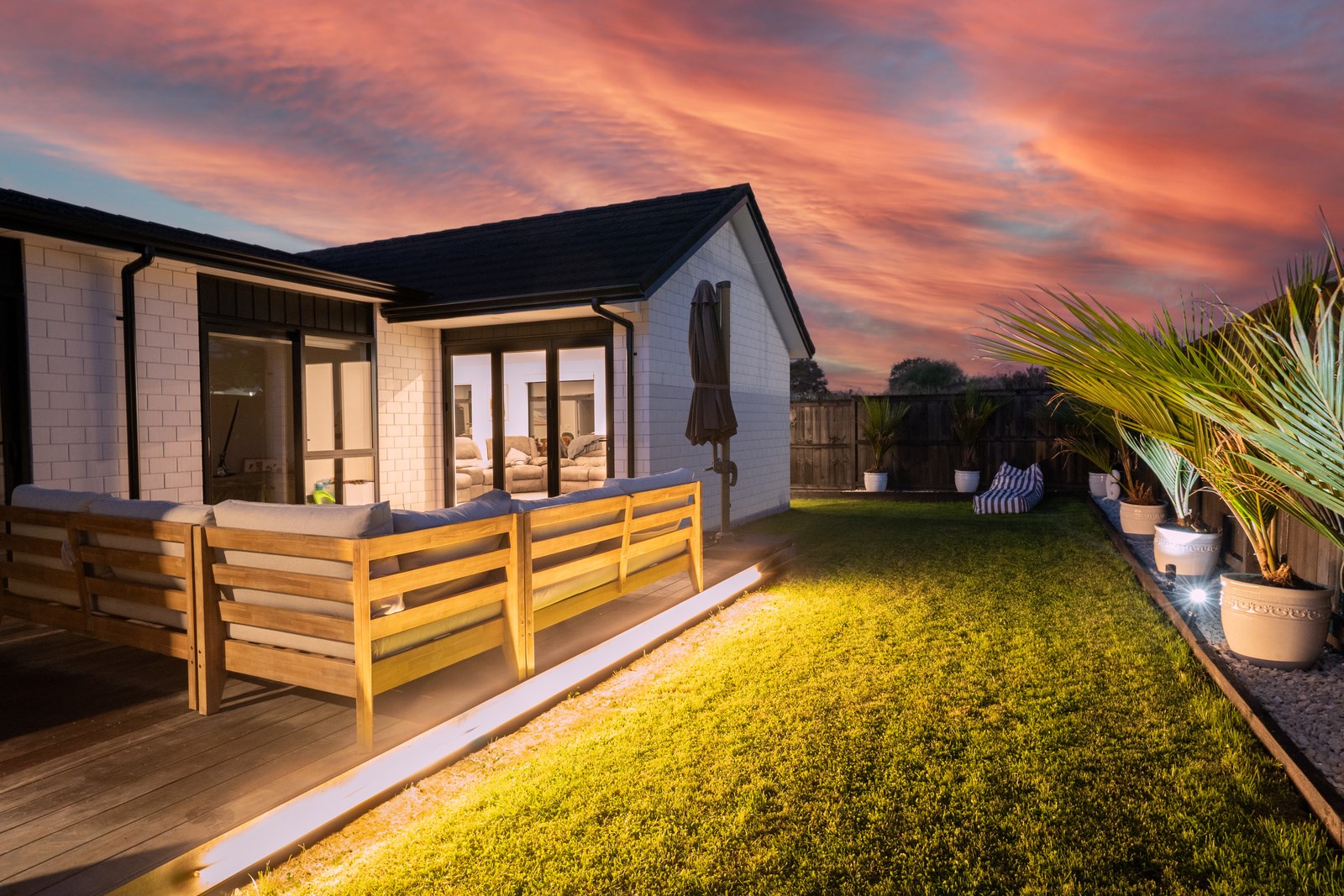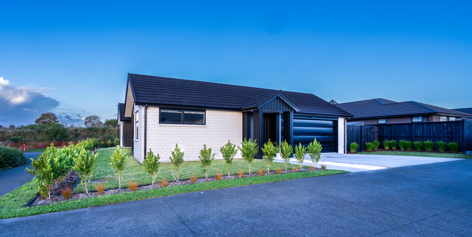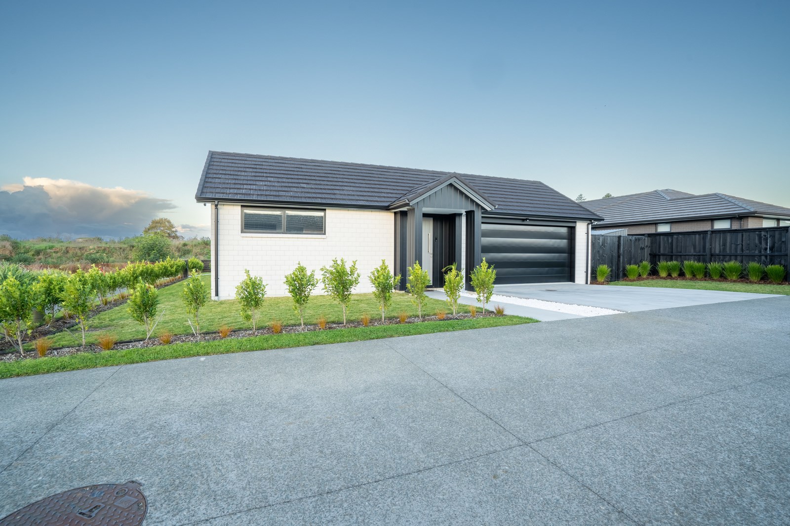The family bathroom with a bath services two other bedrooms, while the main bedroom boasts a thoughtfully designed ensuite that cleverly separates toilet and shower behind a wall, keeping them out of sight from the bedroom. In harmony with the interior, white brick with black weatherboard accents clad the exterior of this attractive home that sits serenely on a corner site in the community of Paerata Rise. Come evening, exterior lighting gives the white walls a pink glow and a spirited persona.