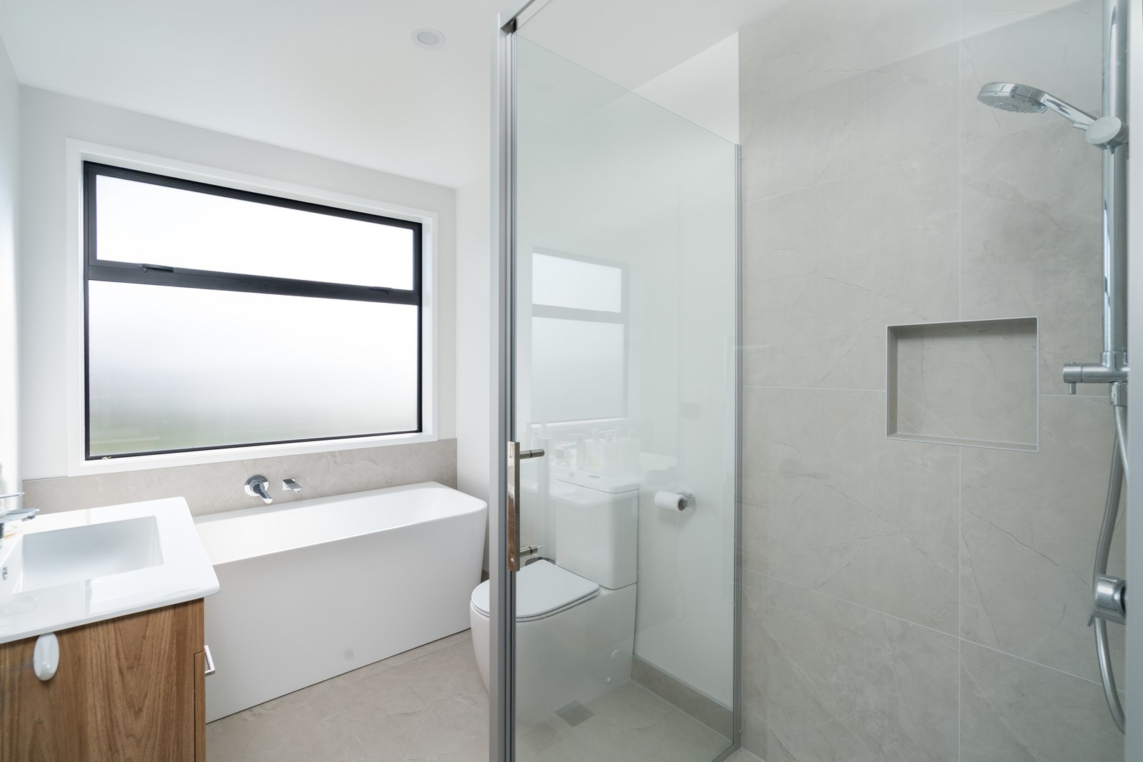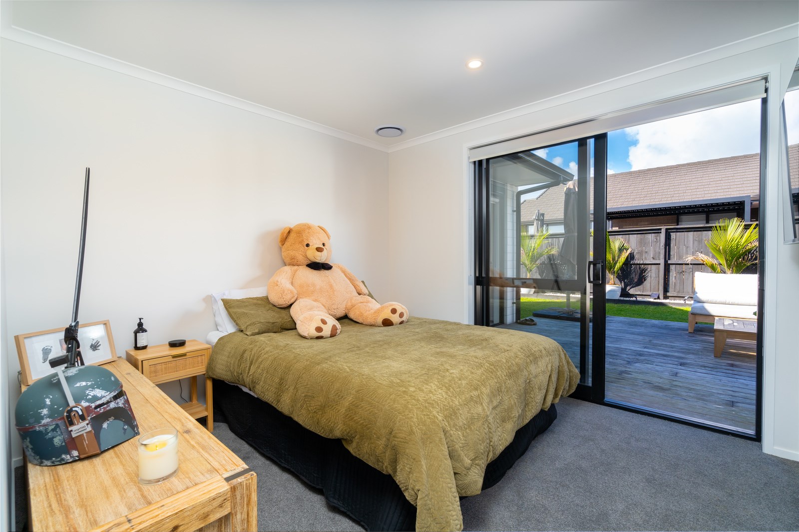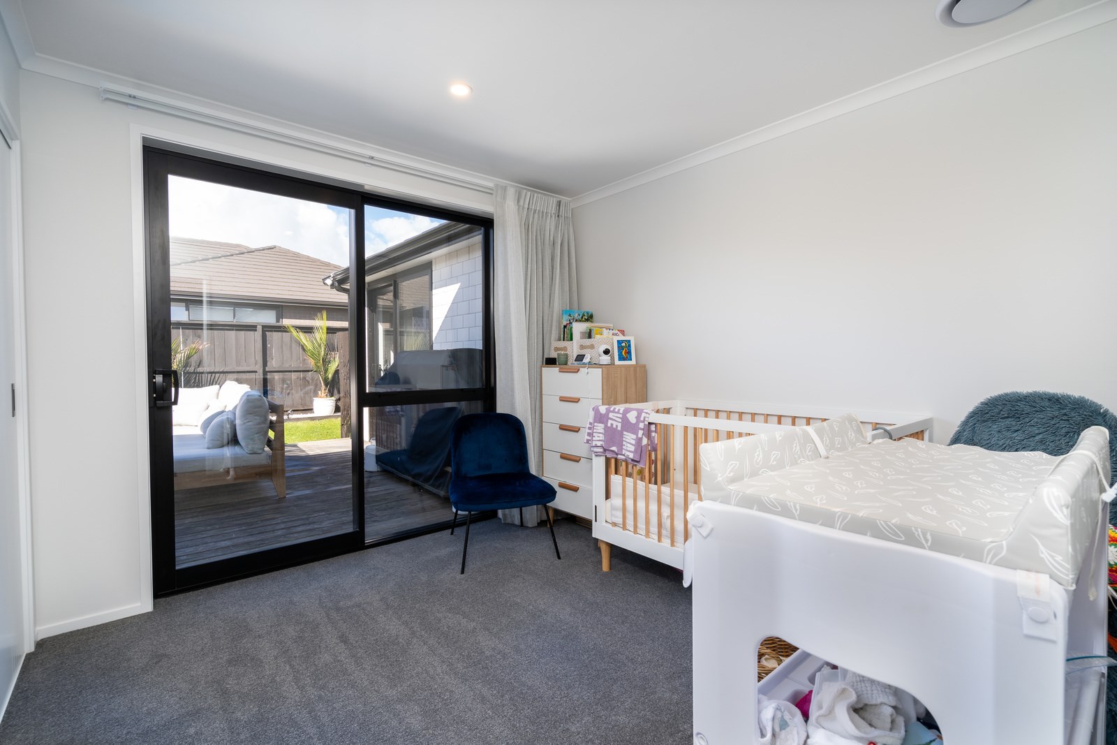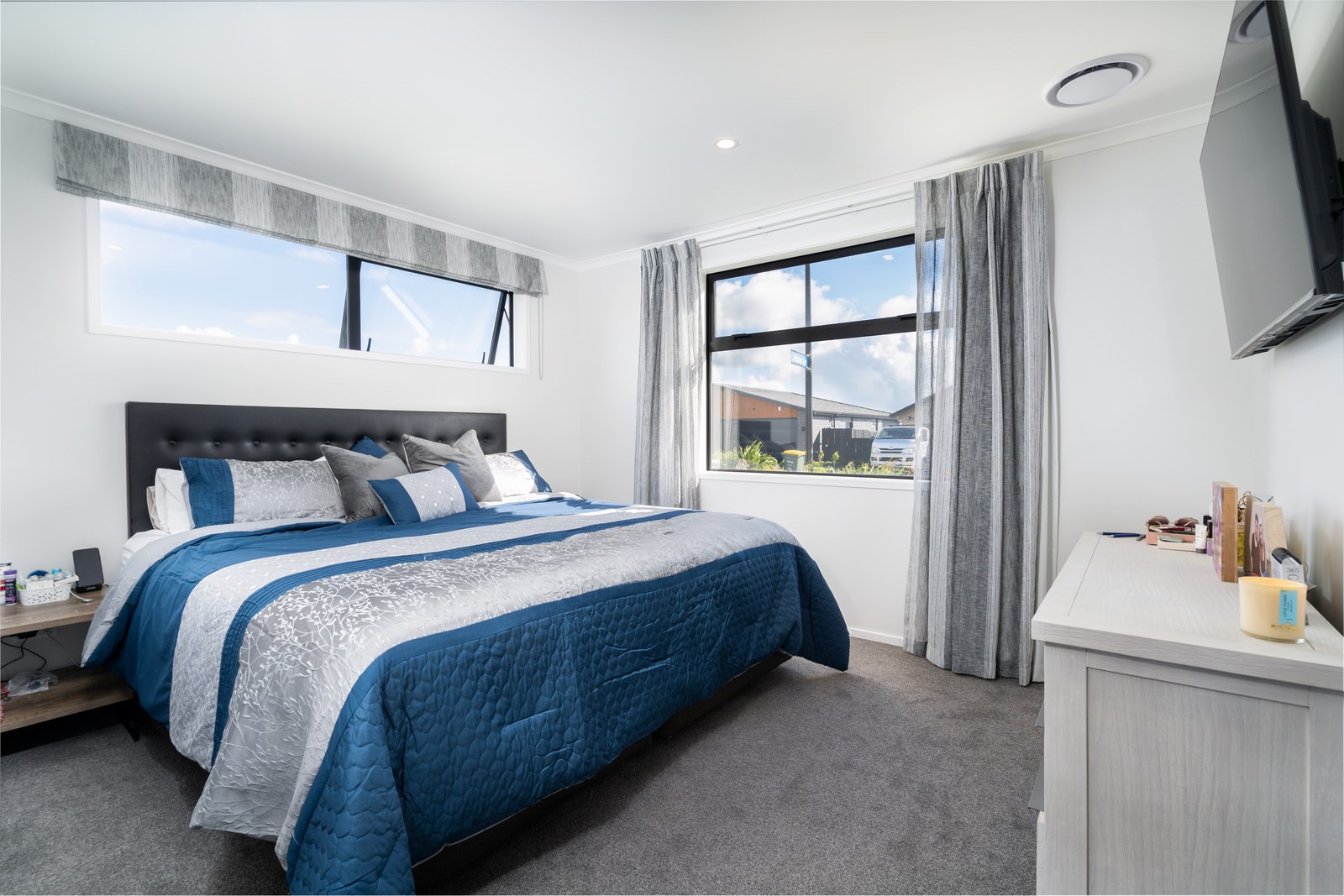 The family bathroom with a bath services two other bedrooms, while the main bedroom boasts a thoughtfully designed ensuite that cleverly separates toilet and shower behind a wall, keeping them out of sight from the bedroom. In harmony with the interior, white brick with black weatherboard accents clad the exterior of this attractive home that sits serenely on a corner site in the community of Paerata Rise. Come evening, exterior lighting gives the white walls a pink glow and a spirited persona.