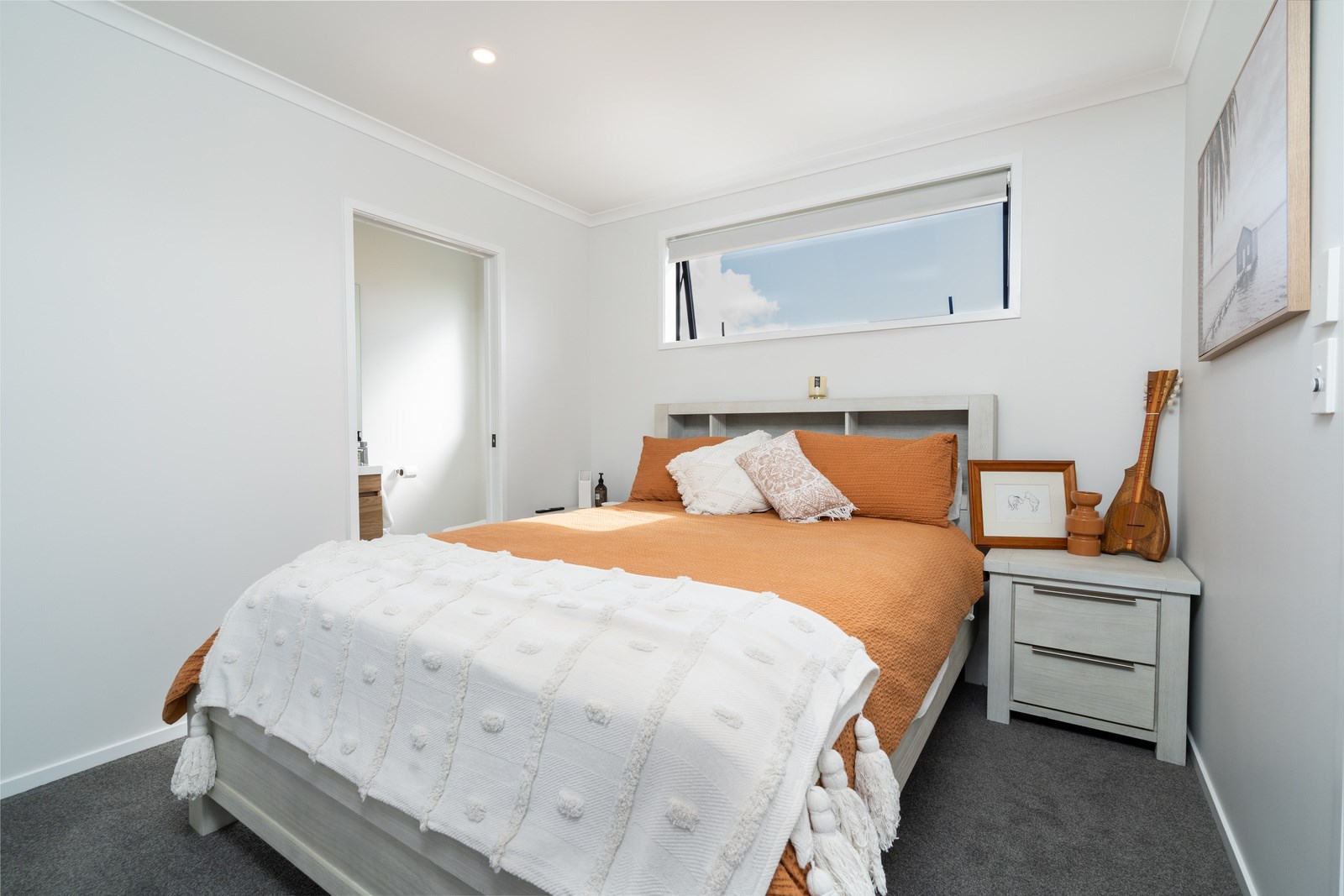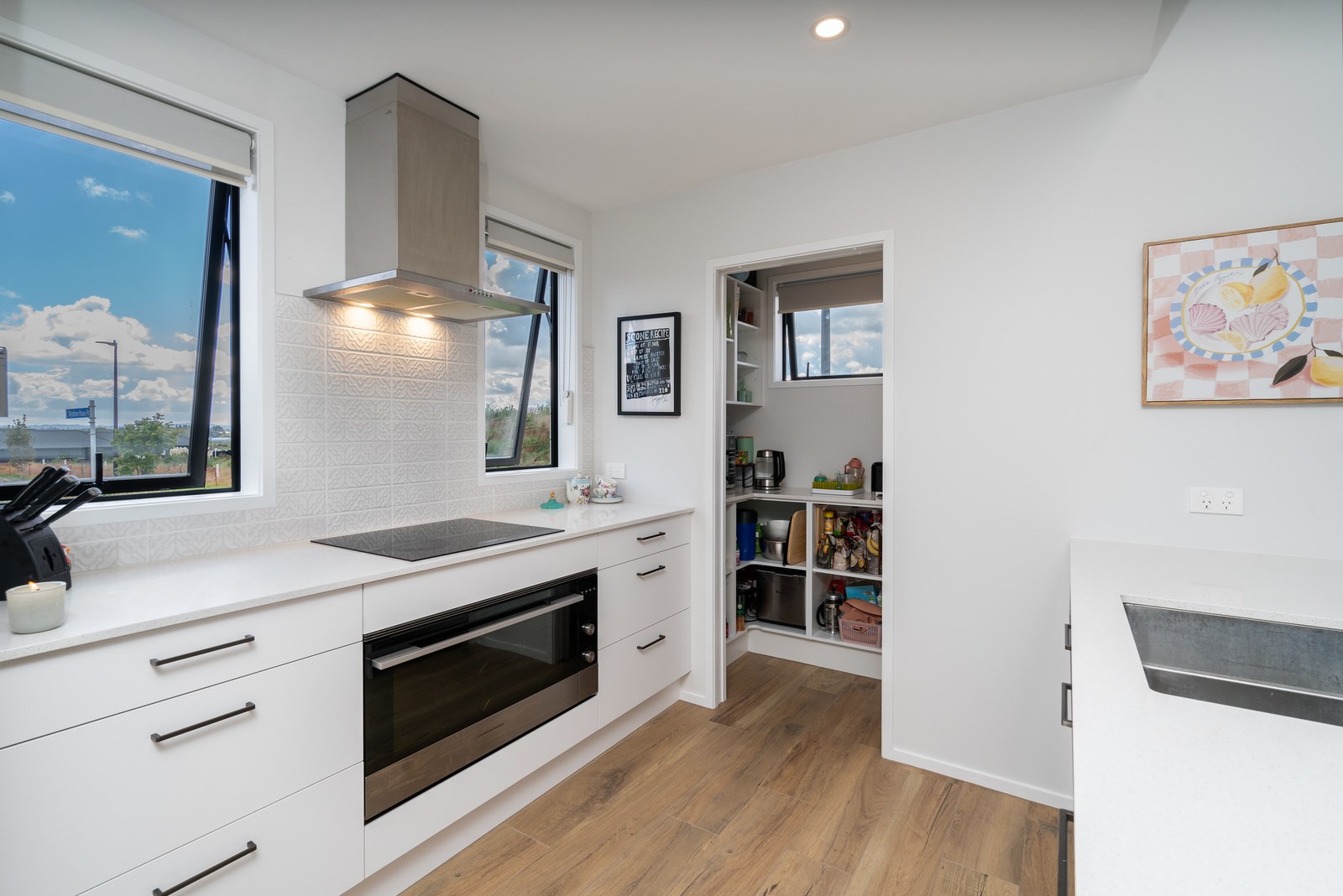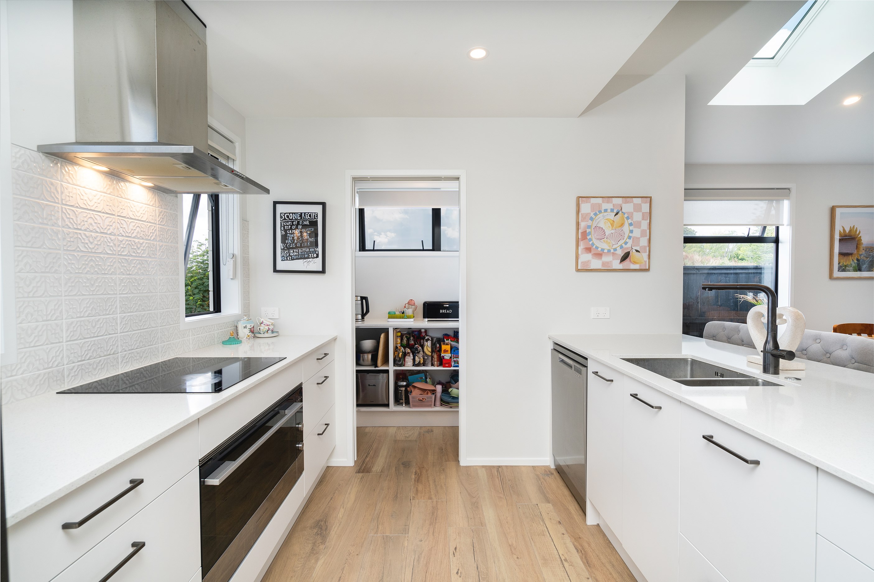 This classic-style home is elevated with the bold use of white and contrasting black, both outside and in. This creates a wonderful sense of cohesiveness and flow throughout the interior where the black accents work to bring the crisp white colour scheme to life. While being very much part of the open-plan living, the kitchen is set back with a scullery and peninsula bench enclosing the space. Comfortable seating for four along the bench make this a place to gather, enjoying drinks from the bar area within the scullery, without getting in the way of the cook. High scissor-truss ceilings and two large skylights flood the living and dining space with light and bifolds bring the outside in. Having the luxury of three bathrooms means extended family and friends can enjoy the privacy of their own ensuite when staying.