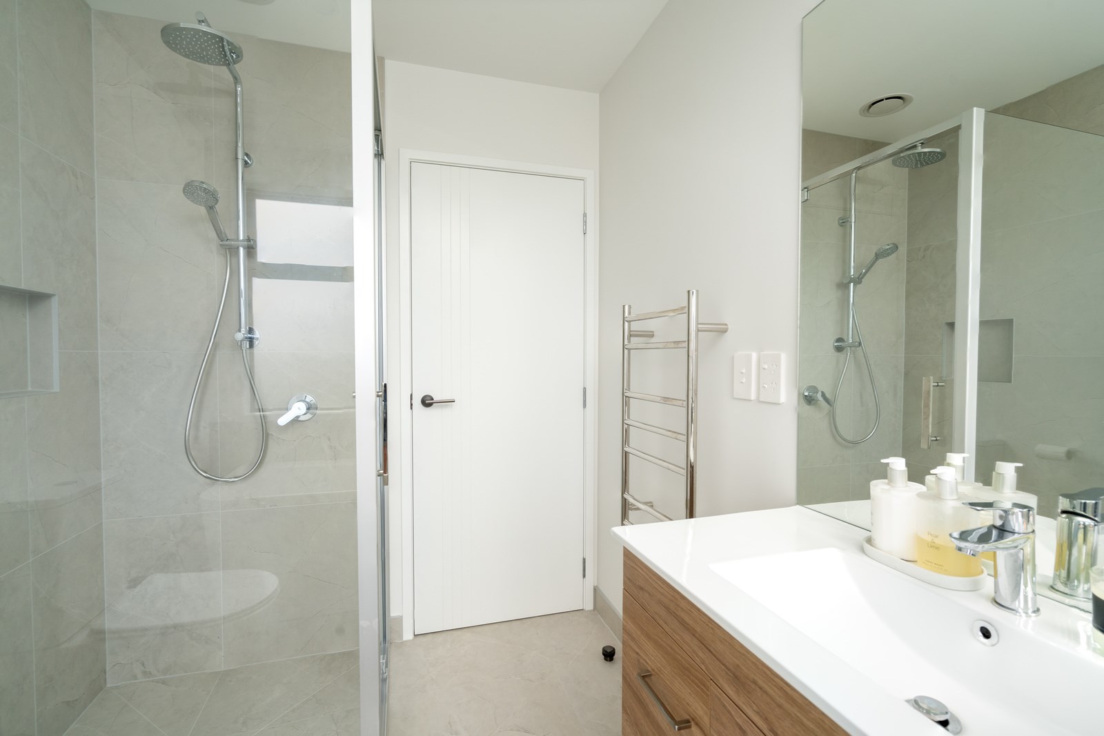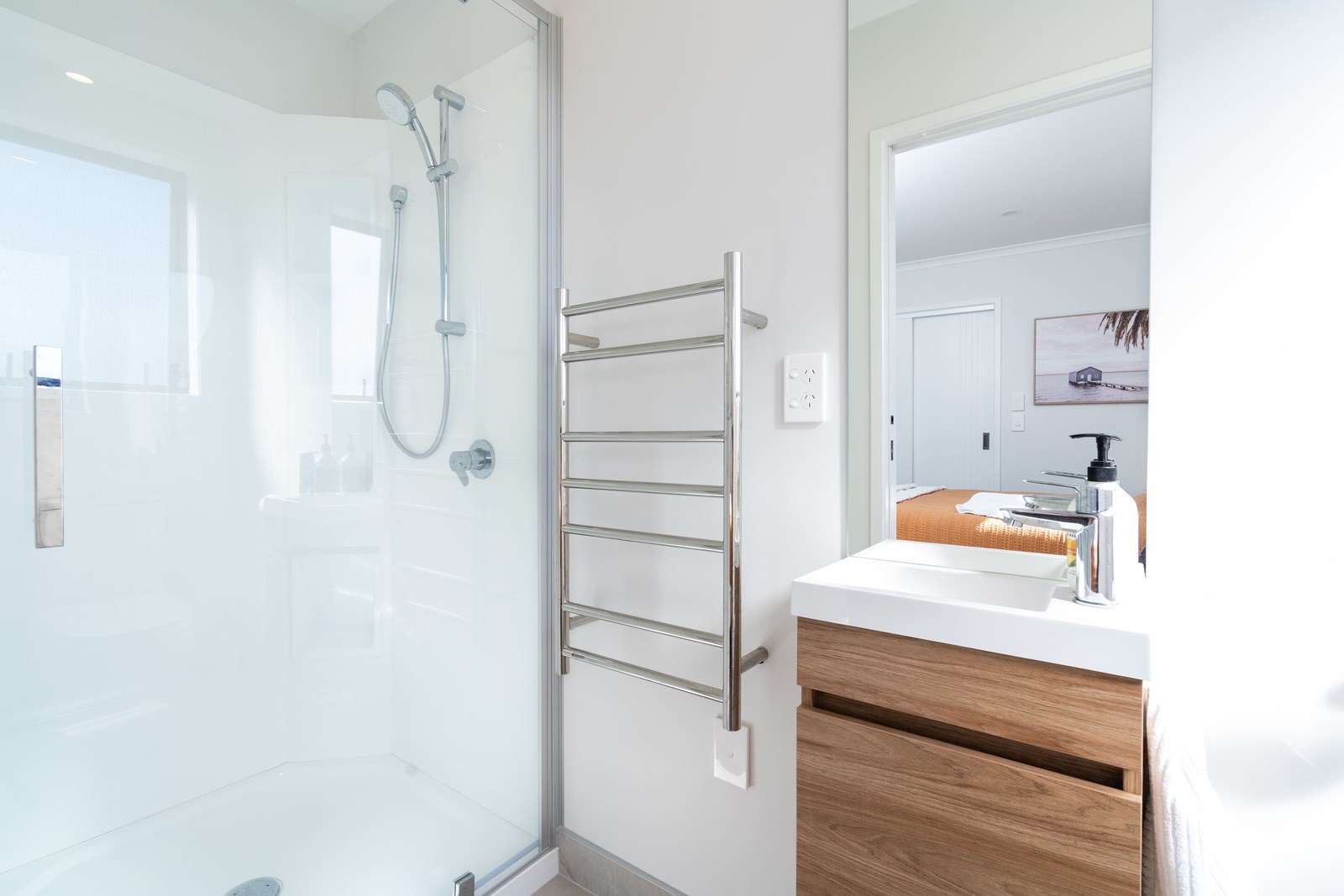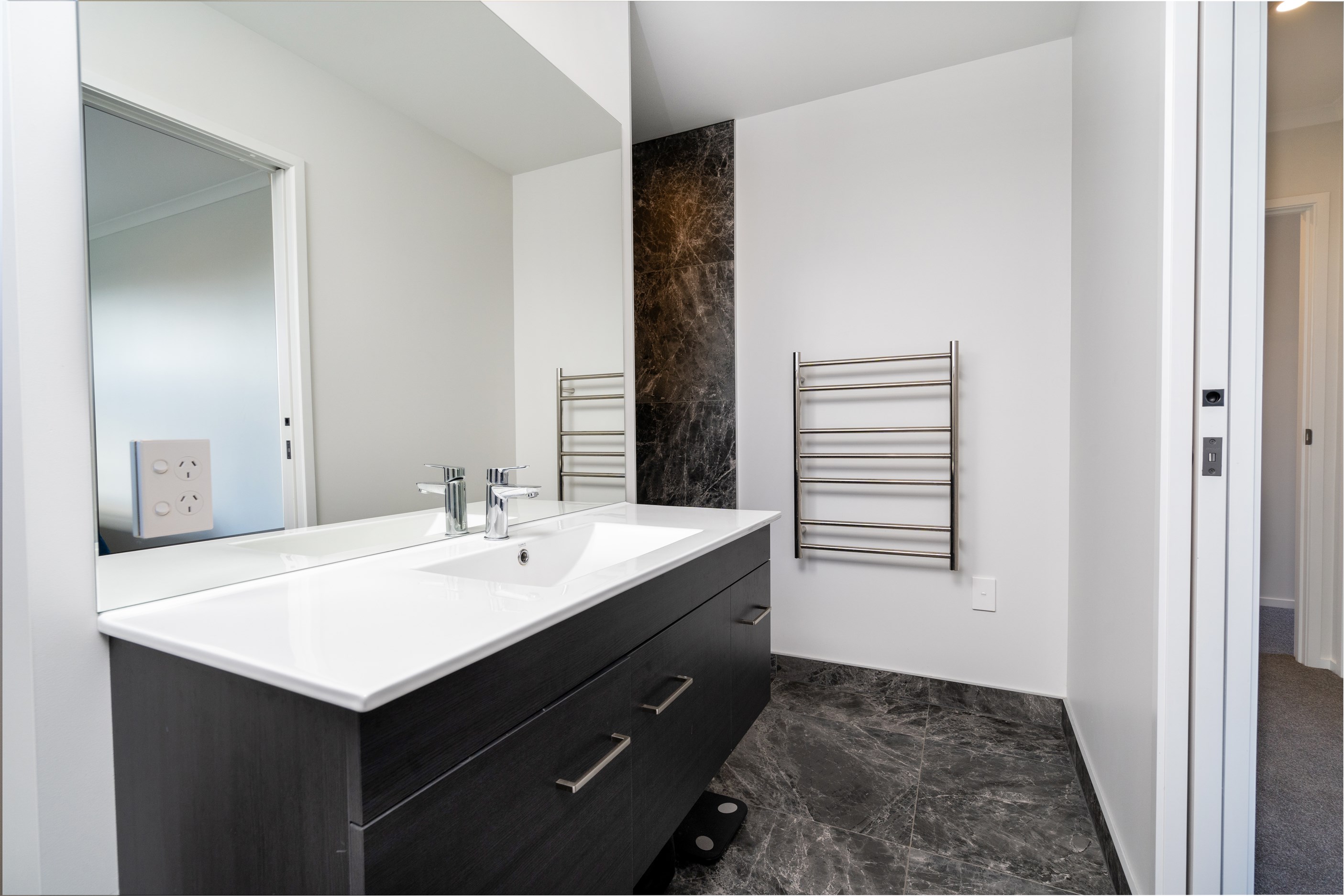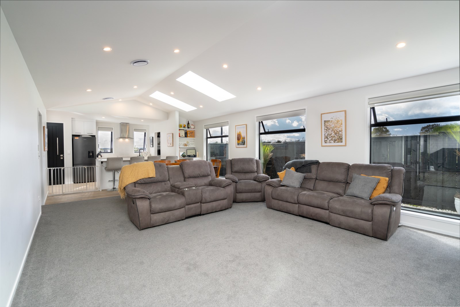 This classic-style home is elevated with the bold use of white and contrasting black, both outside and in. This creates a wonderful sense of cohesiveness and flow throughout the interior where the black accents work to bring the crisp white colour scheme to life. While being very much part of the open-plan living, the kitchen is set back with a scullery and peninsula bench enclosing the space. Comfortable seating for four along the bench make this a place to gather, enjoying drinks from the bar area within the scullery, without getting in the way of the cook. High scissor-truss ceilings and two large skylights flood the living and dining space with light and bifolds bring the outside in. Having the luxury of three bathrooms means extended family and friends can enjoy the privacy of their own ensuite when staying.