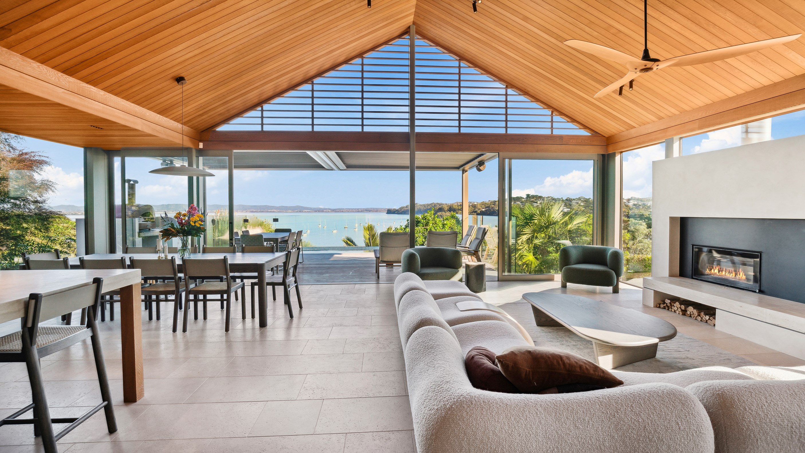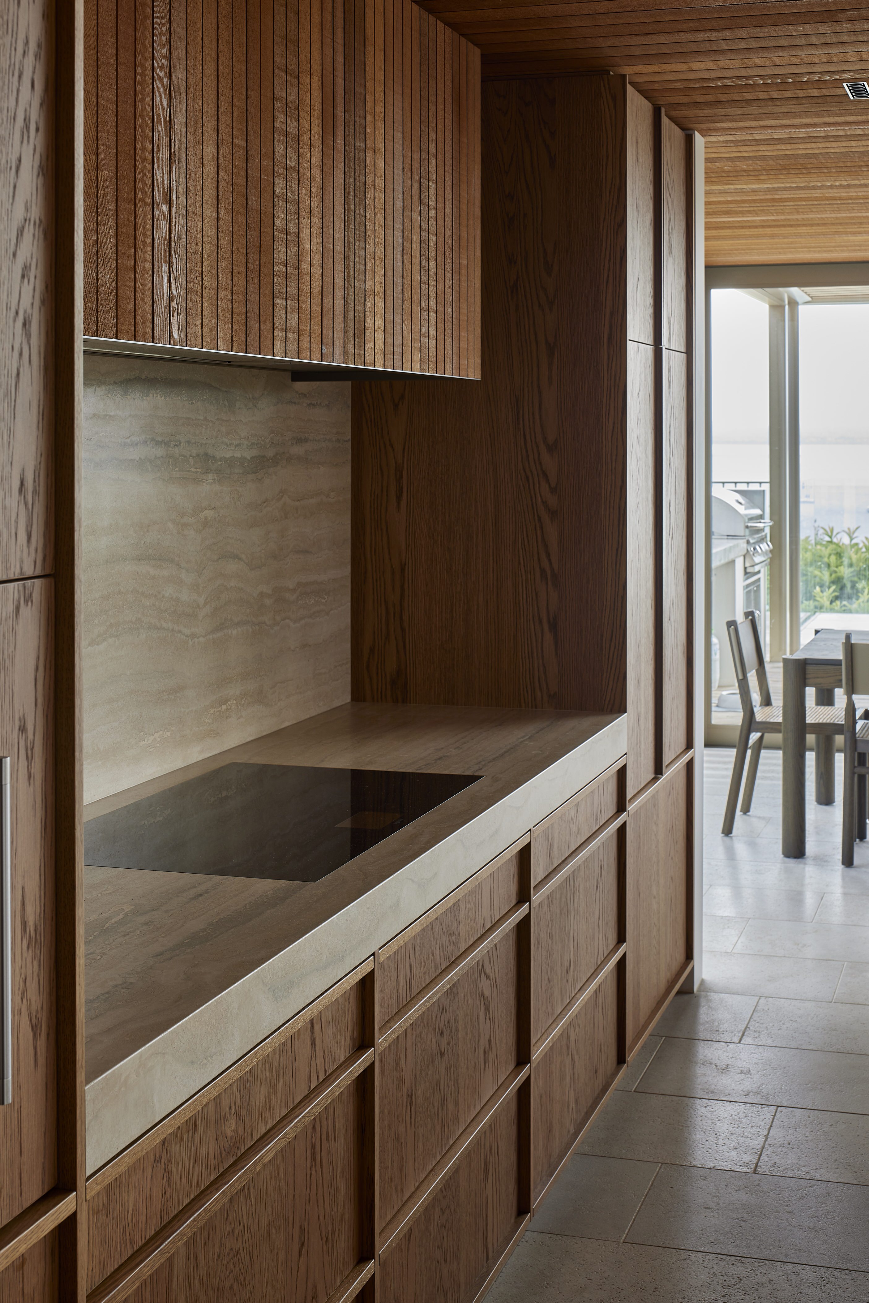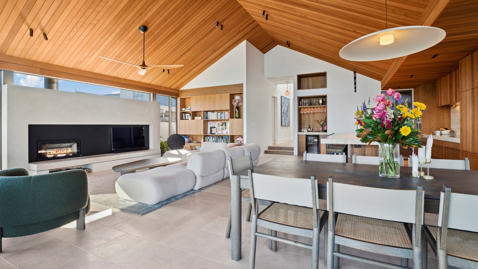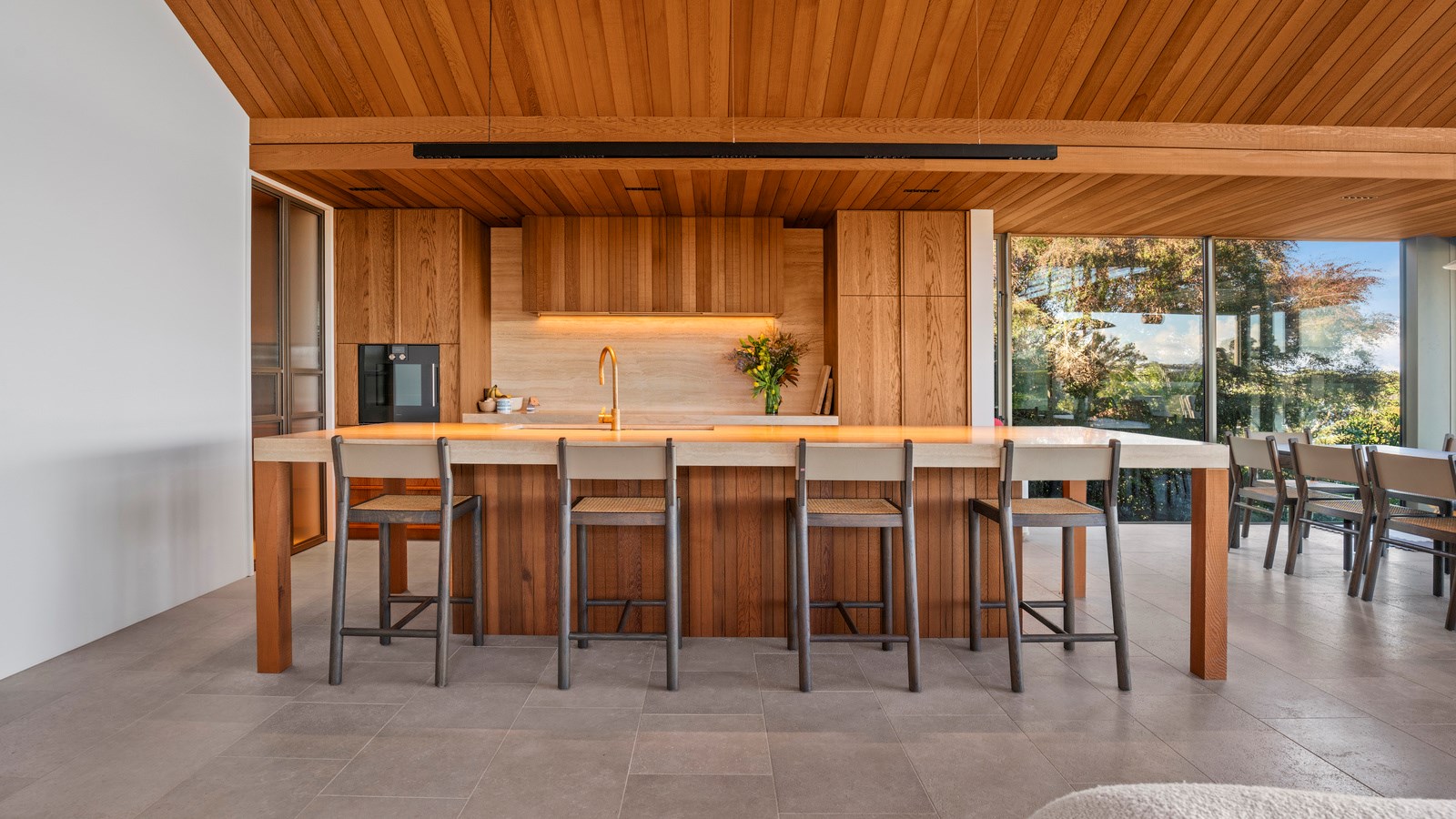 The list of highlights in this beautiful open-plan space is long. In the kitchen and scullery, you’ll notice planked oak cabinetry and solid travertine benchtops and floors. Around the corner are built-in shelves and cabinets made from more of the oak. Lightly bronzed joinery and roof louvres above the deck only add to the sense of harmony; a wood-burning fire is both practical and beautiful. That’s not all that’s had the meticulous Create + Construct treatment in this four-bedroom home. Bathrooms have been lavished with luxury features – quartzite stone tops, planked oak vanities and reeded glass screens. Craftsmanship is evident elsewhere, too, in the villa fretwork, cladding, joinery and super-sized double garage – all of which settles easily into the established bush.