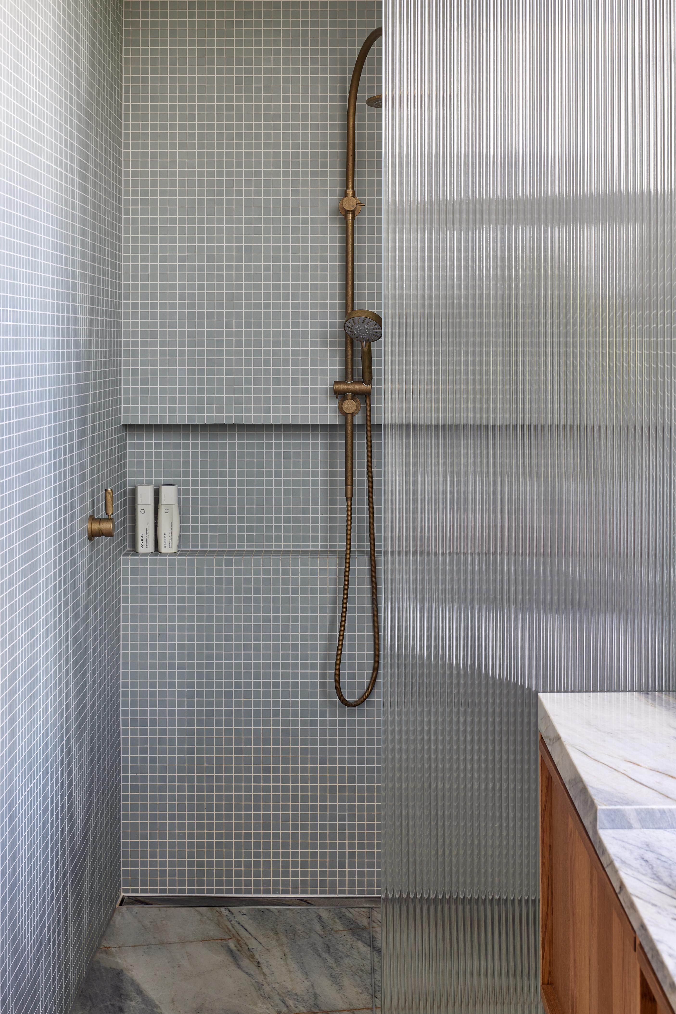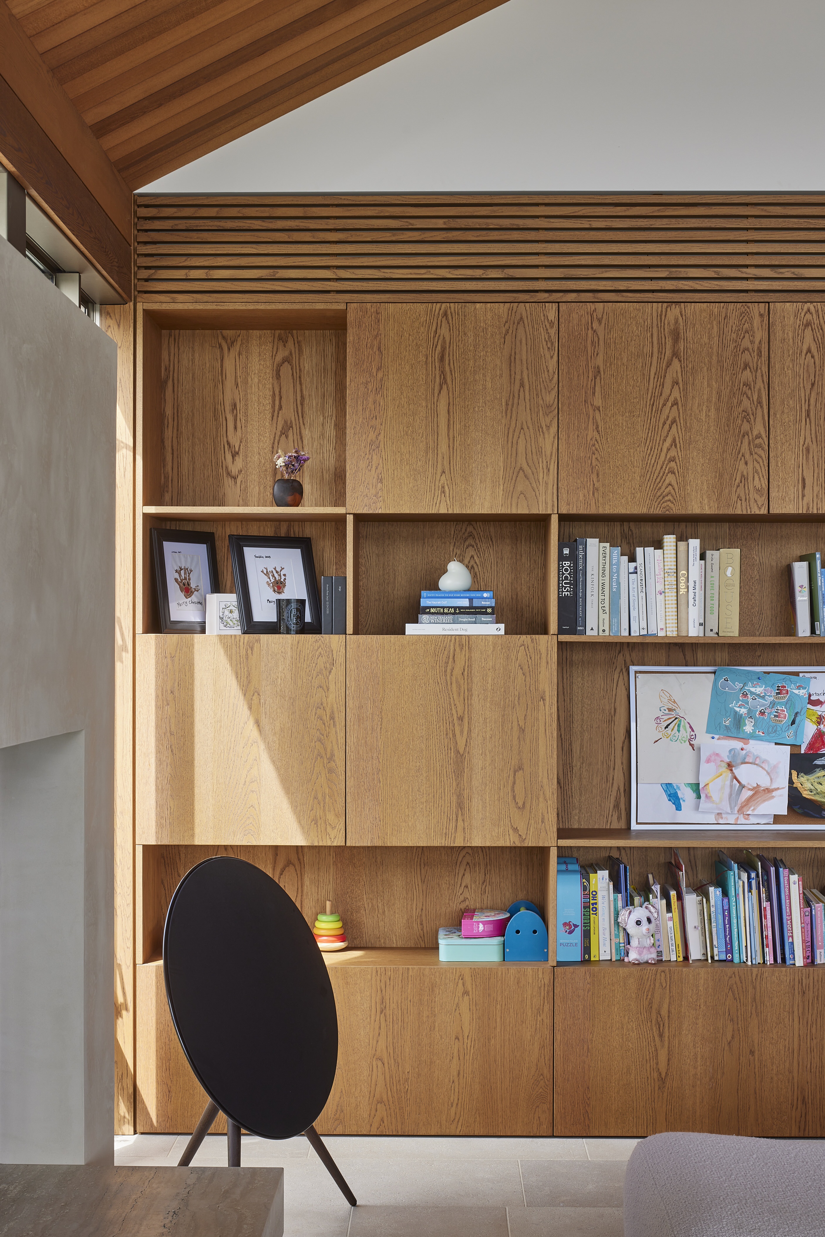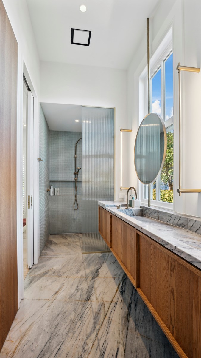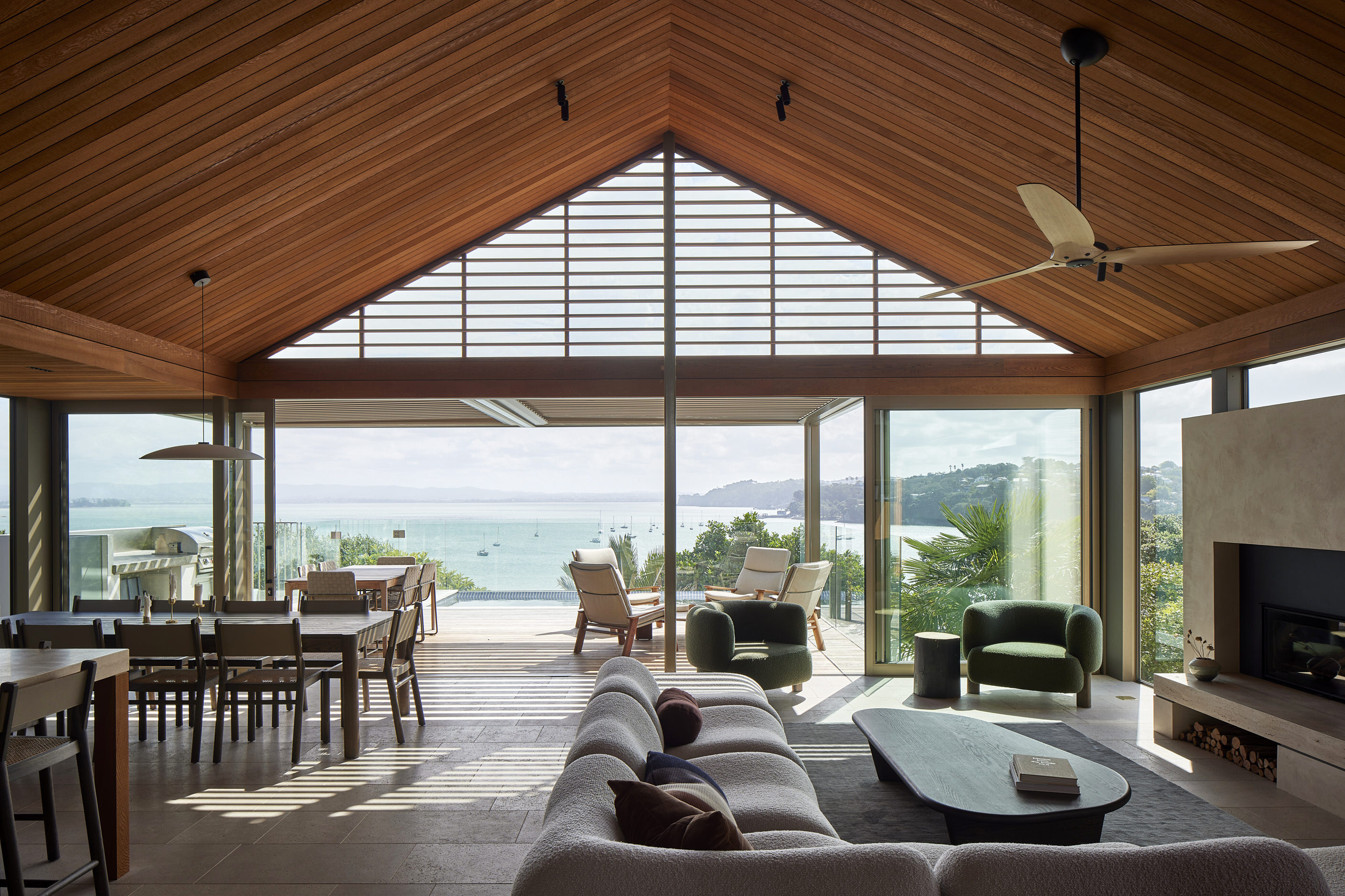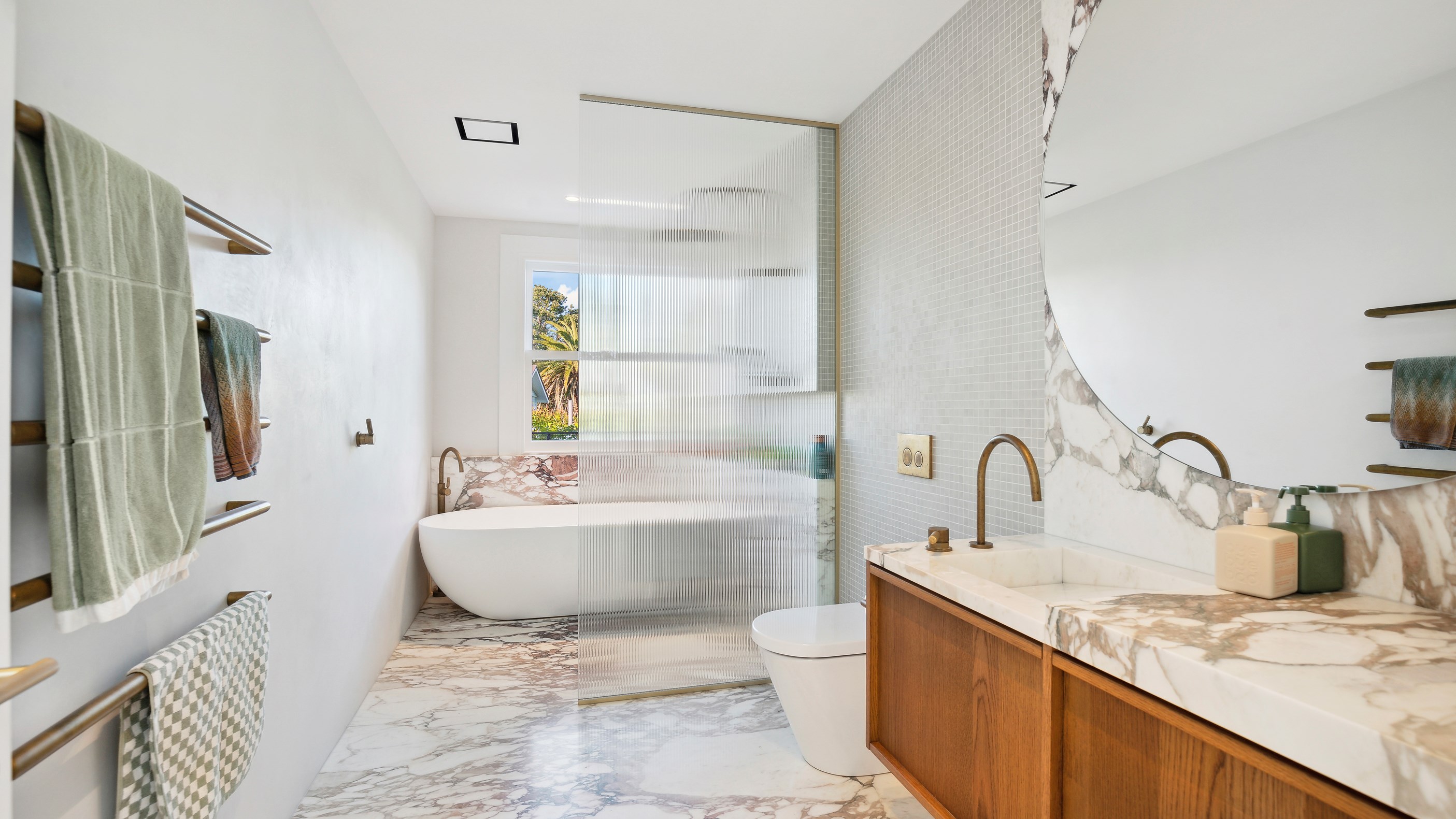 The list of highlights in this beautiful open-plan space is long. In the kitchen and scullery, you’ll notice planked oak cabinetry and solid travertine benchtops and floors. Around the corner are built-in shelves and cabinets made from more of the oak. Lightly bronzed joinery and roof louvres above the deck only add to the sense of harmony; a wood-burning fire is both practical and beautiful. That’s not all that’s had the meticulous Create + Construct treatment in this four-bedroom home. Bathrooms have been lavished with luxury features – quartzite stone tops, planked oak vanities and reeded glass screens. Craftsmanship is evident elsewhere, too, in the villa fretwork, cladding, joinery and super-sized double garage – all of which settles easily into the established bush.