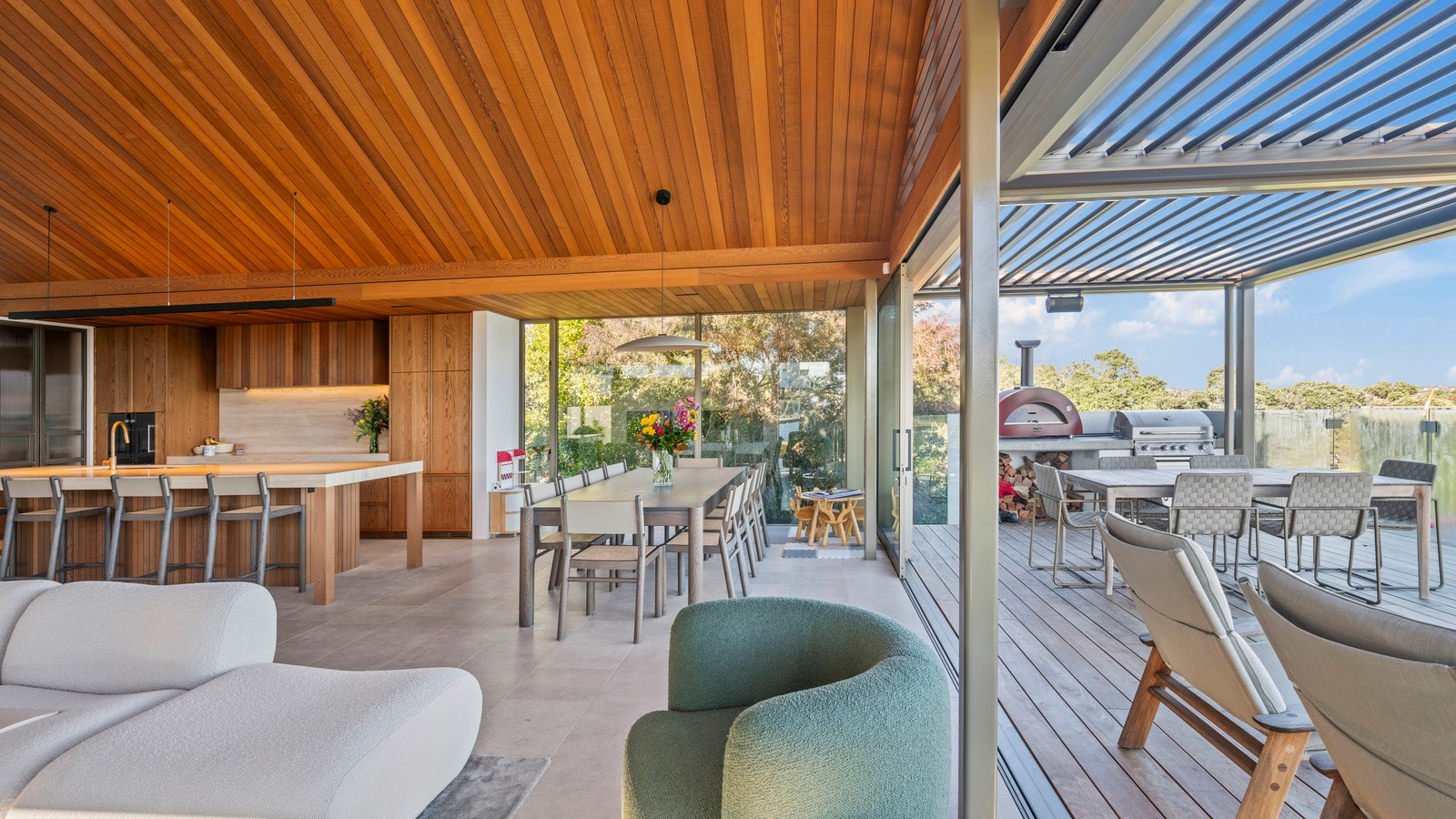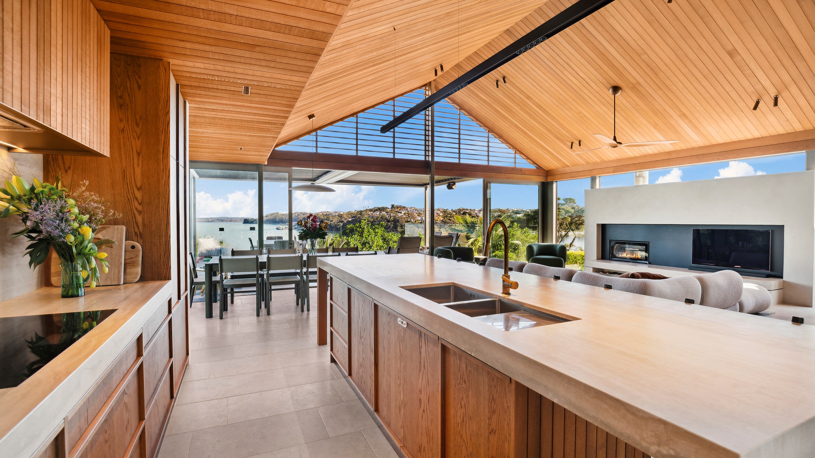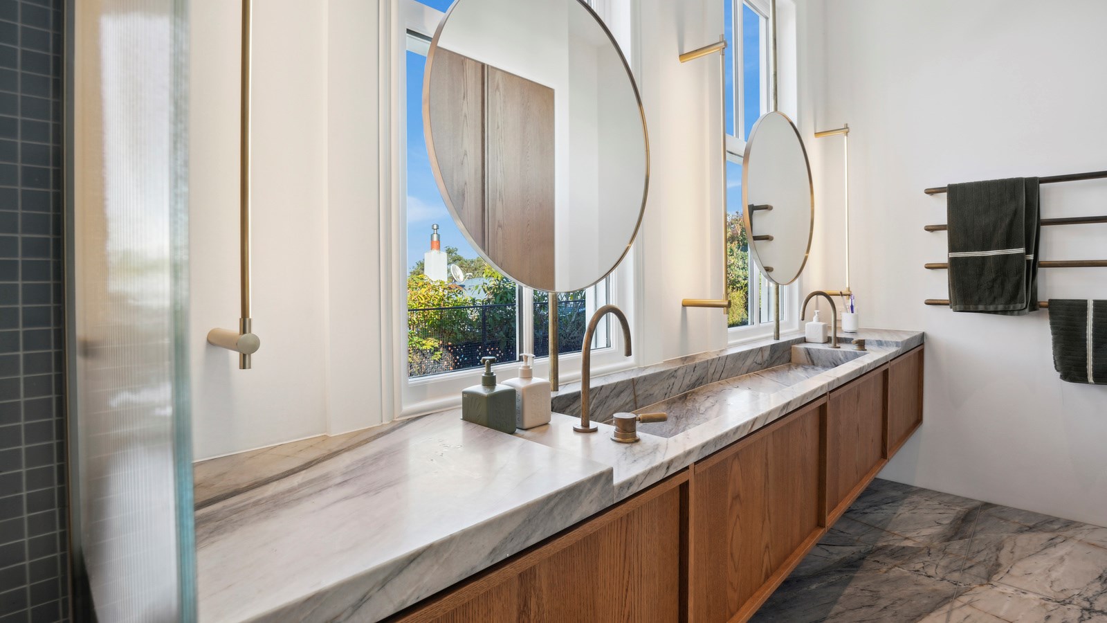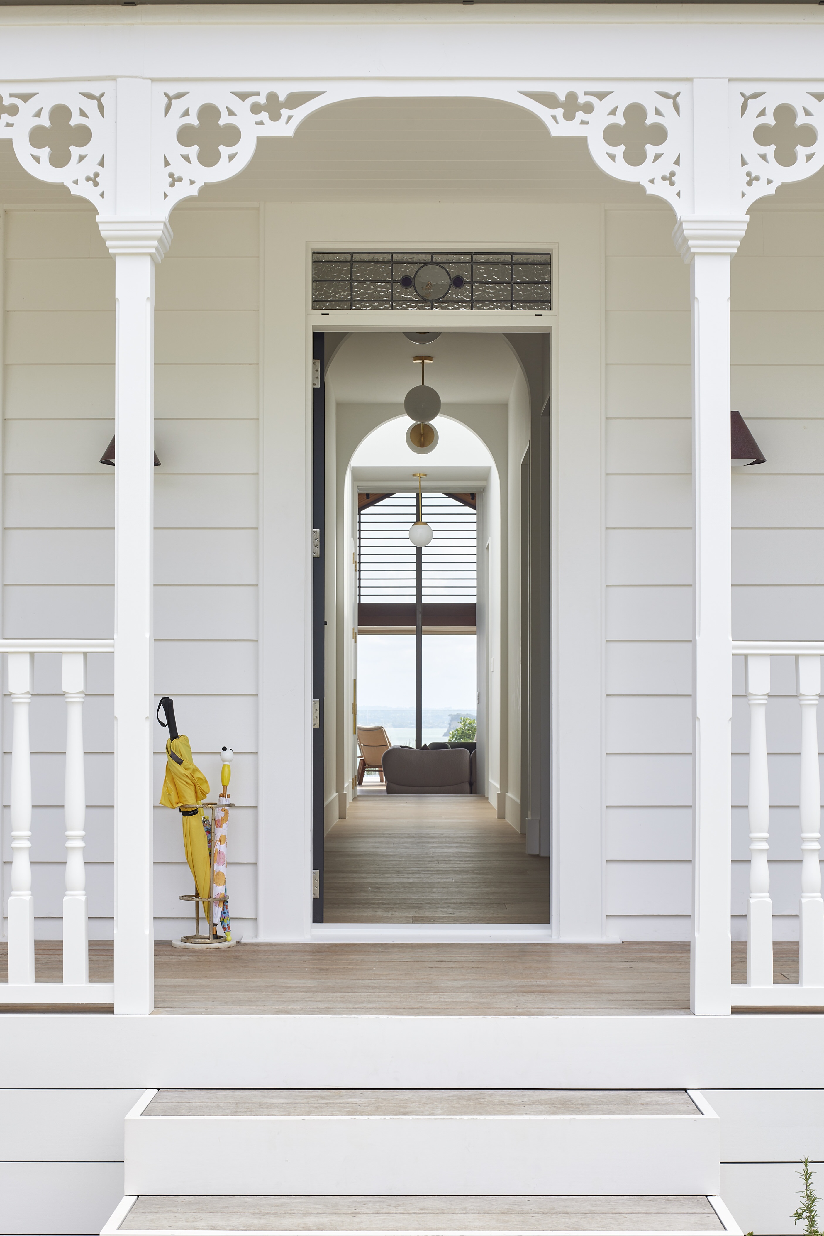 Heritage villa at the front, modern seaside retreat at the back. Expertly fused, they constitute something cohesive and special. This renovation and extension has enhanced the charm and elegance of the villa while crafting an addition with raked cedar ceilings and walls of glass that take in wide harbour views. The living spills onto a west-facing hardwood deck with barbecue for alfresco dining and relaxing. Below is a swimming pool. Talk about a luxury sanctuary in the suburbs. Inside, a milky palette provides continuity between old and new, and illuminated arches usher residents through to the sparkling new extension.
