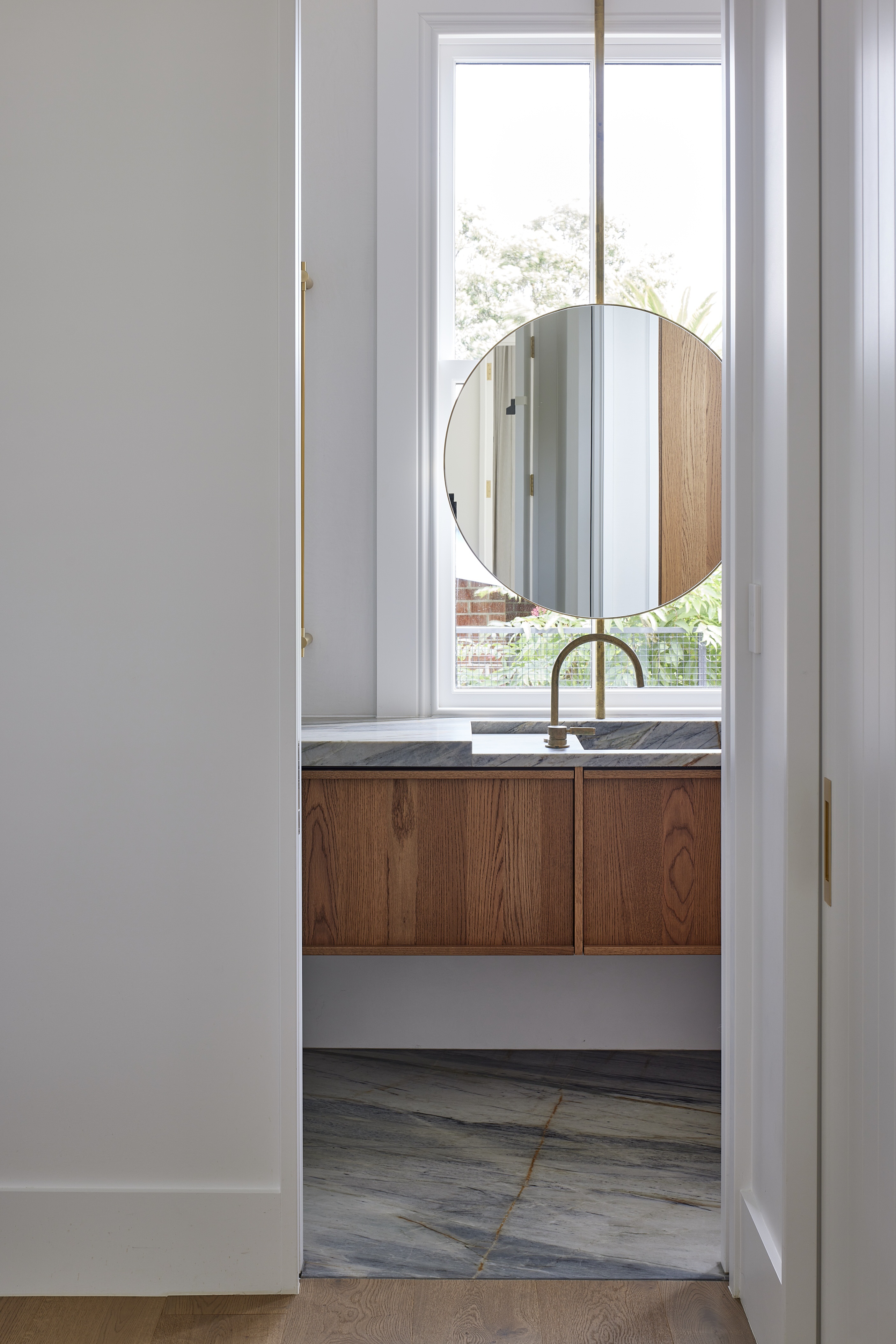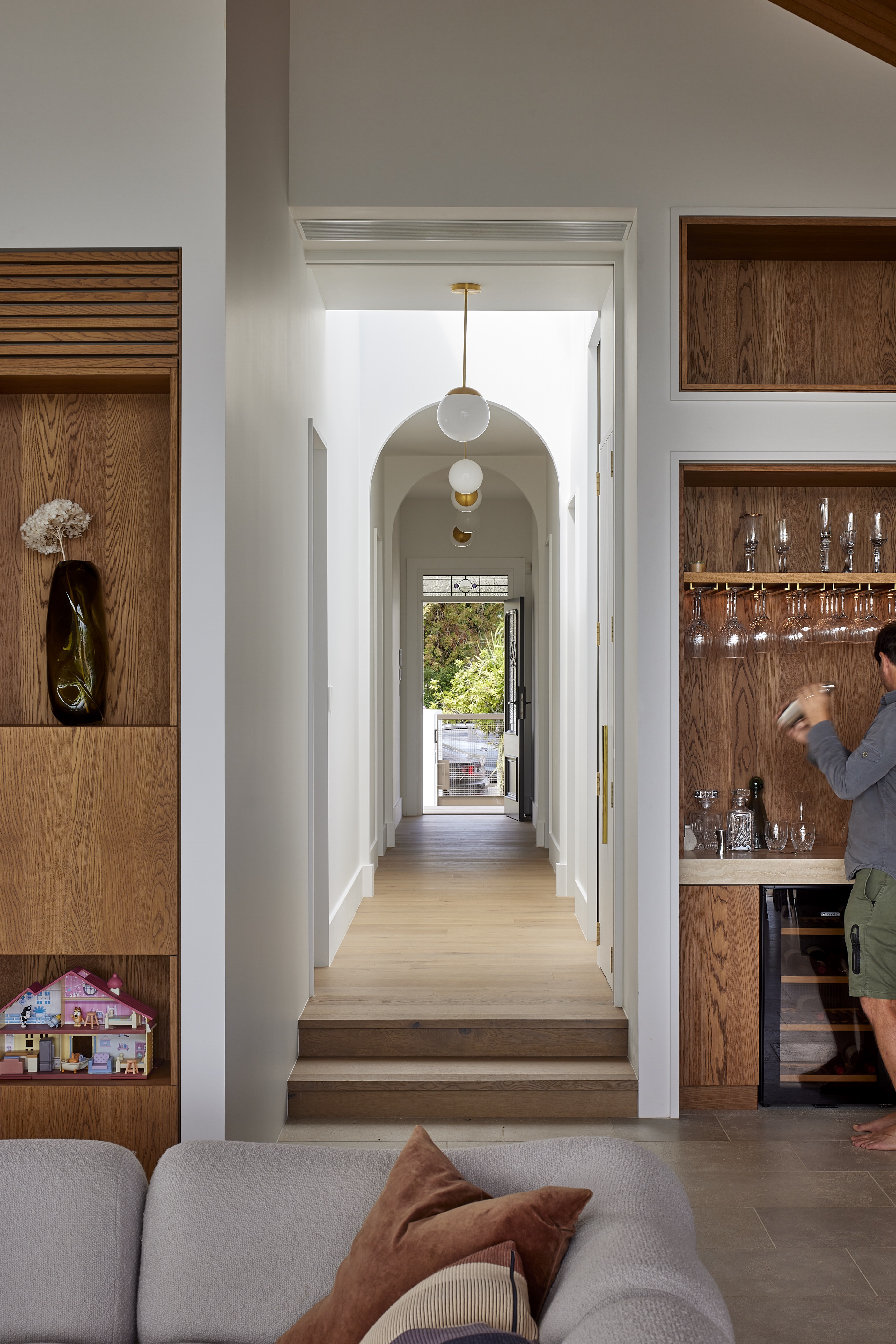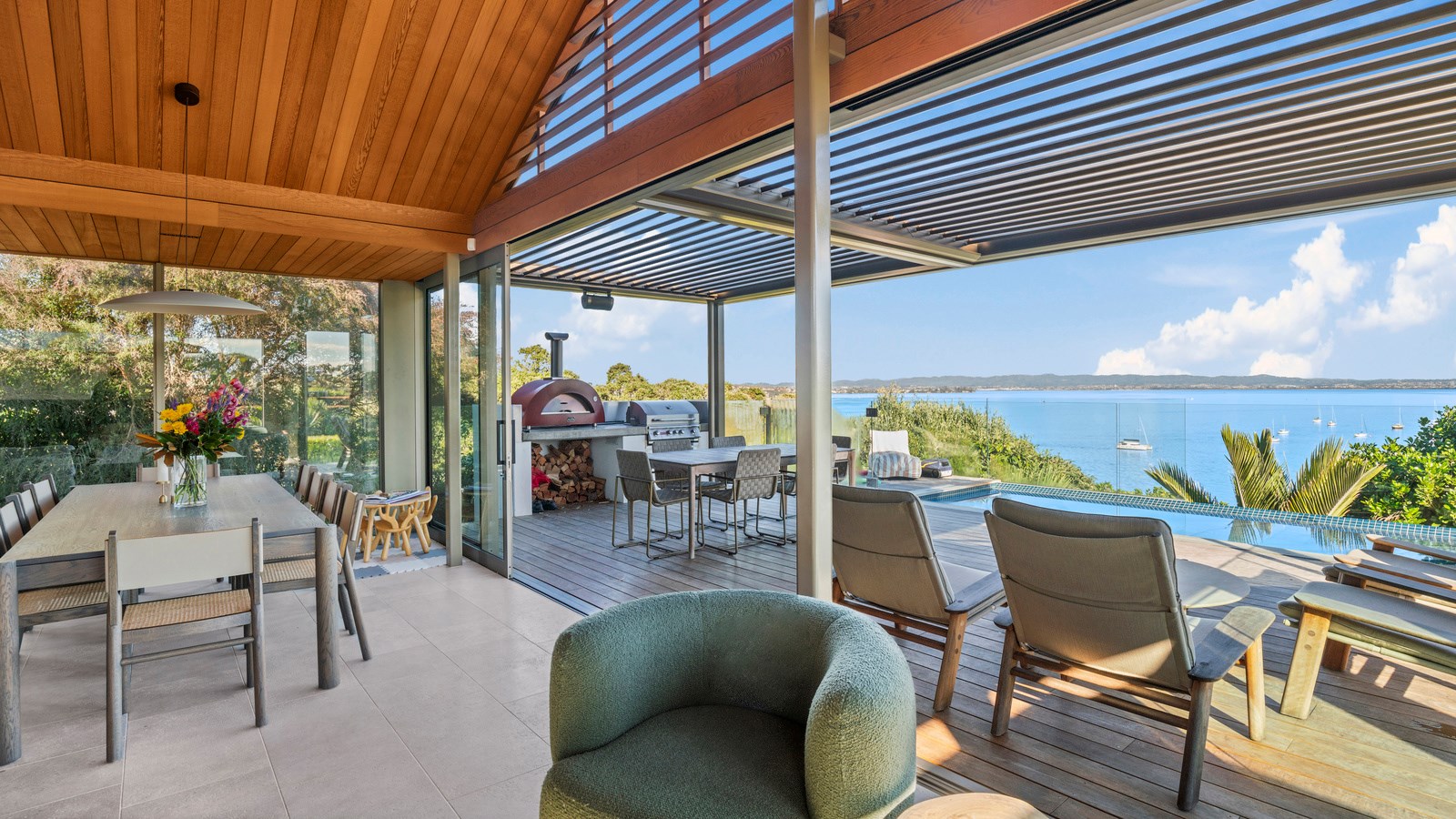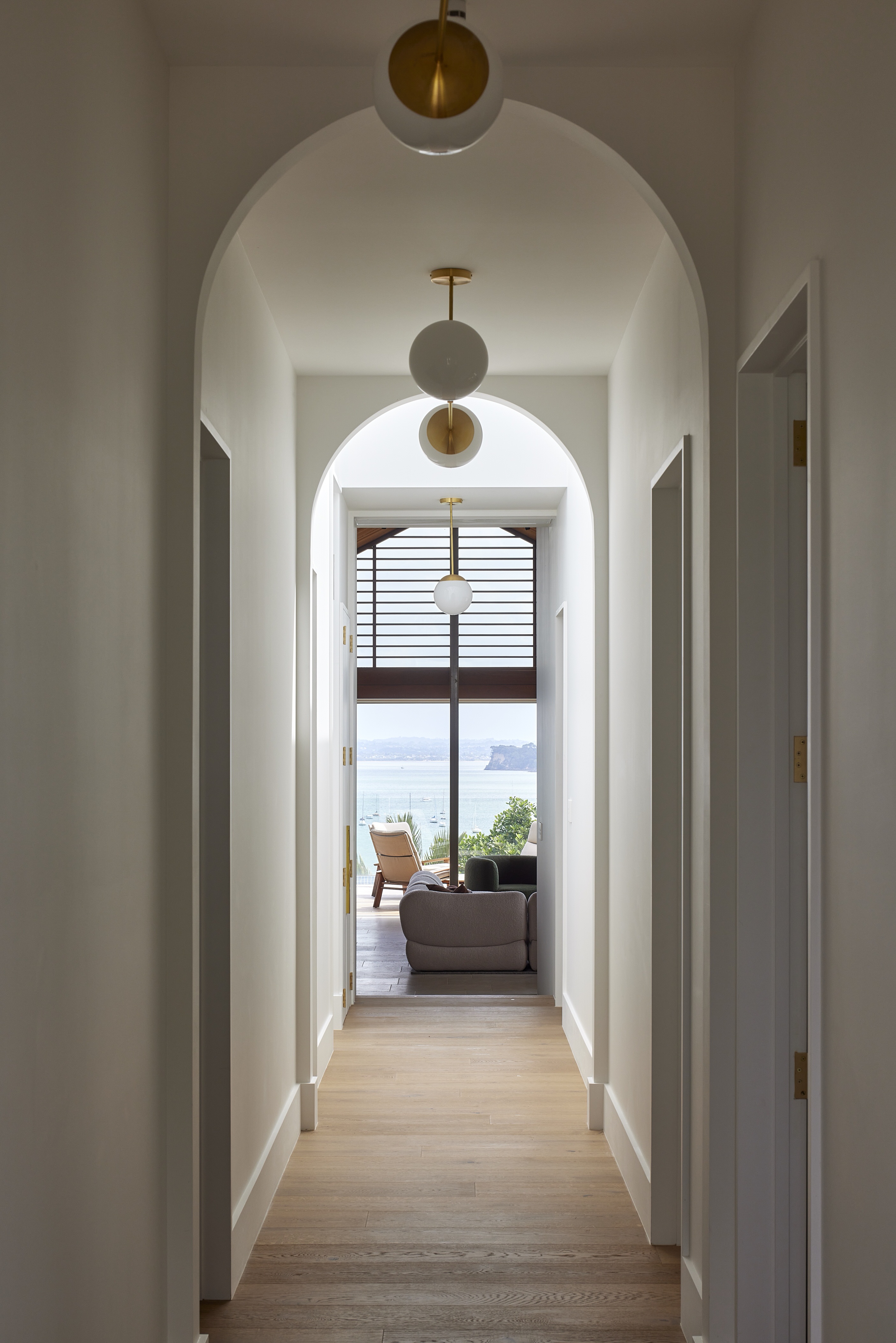 Heritage villa at the front, modern seaside retreat at the back. Expertly fused, they constitute something cohesive and special. This renovation and extension has enhanced the charm and elegance of the villa while crafting an addition with raked cedar ceilings and walls of glass that take in wide harbour views. The living spills onto a west-facing hardwood deck with barbecue for alfresco dining and relaxing. Below is a swimming pool. Talk about a luxury sanctuary in the suburbs. Inside, a milky palette provides continuity between old and new, and illuminated arches usher residents through to the sparkling new extension.
