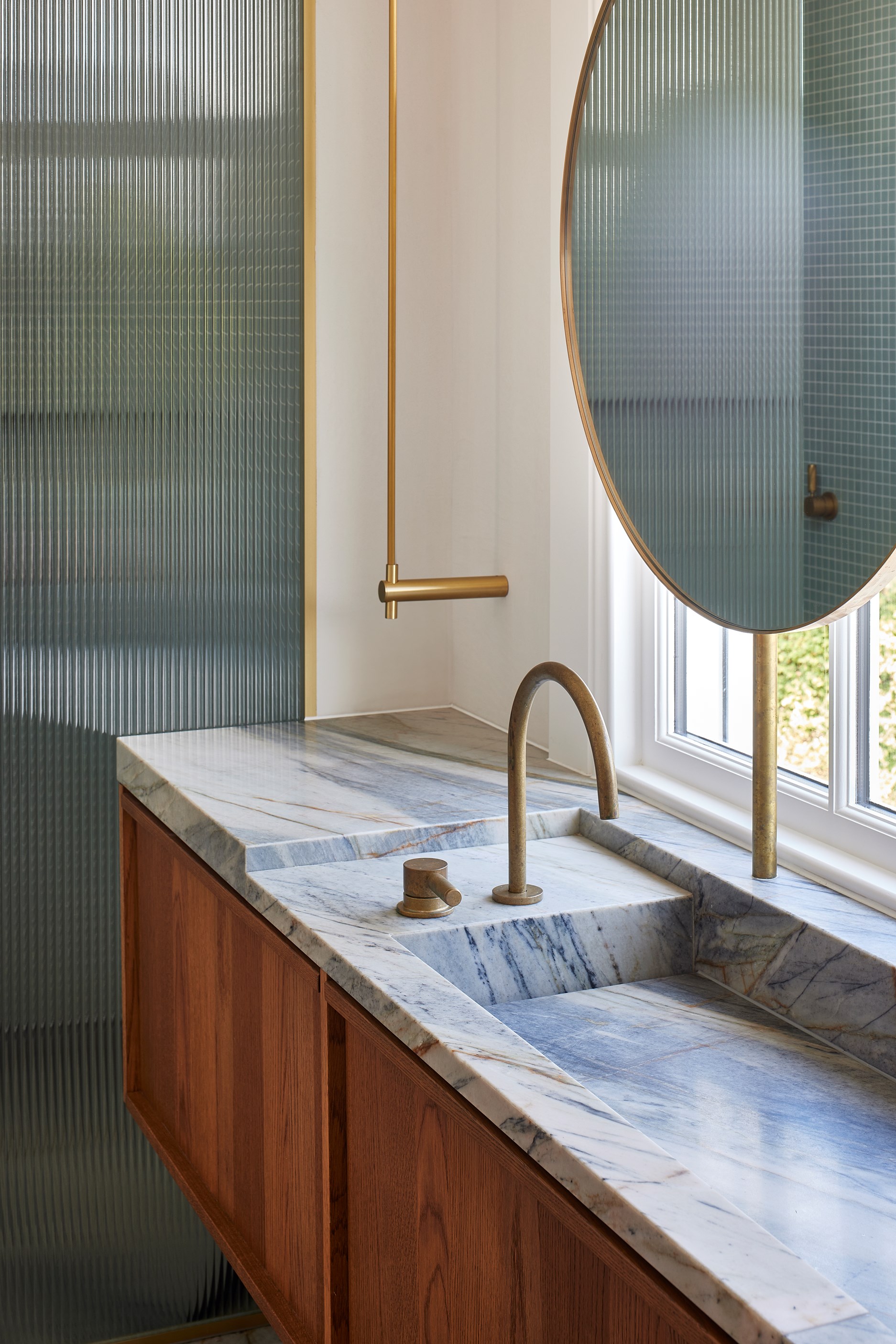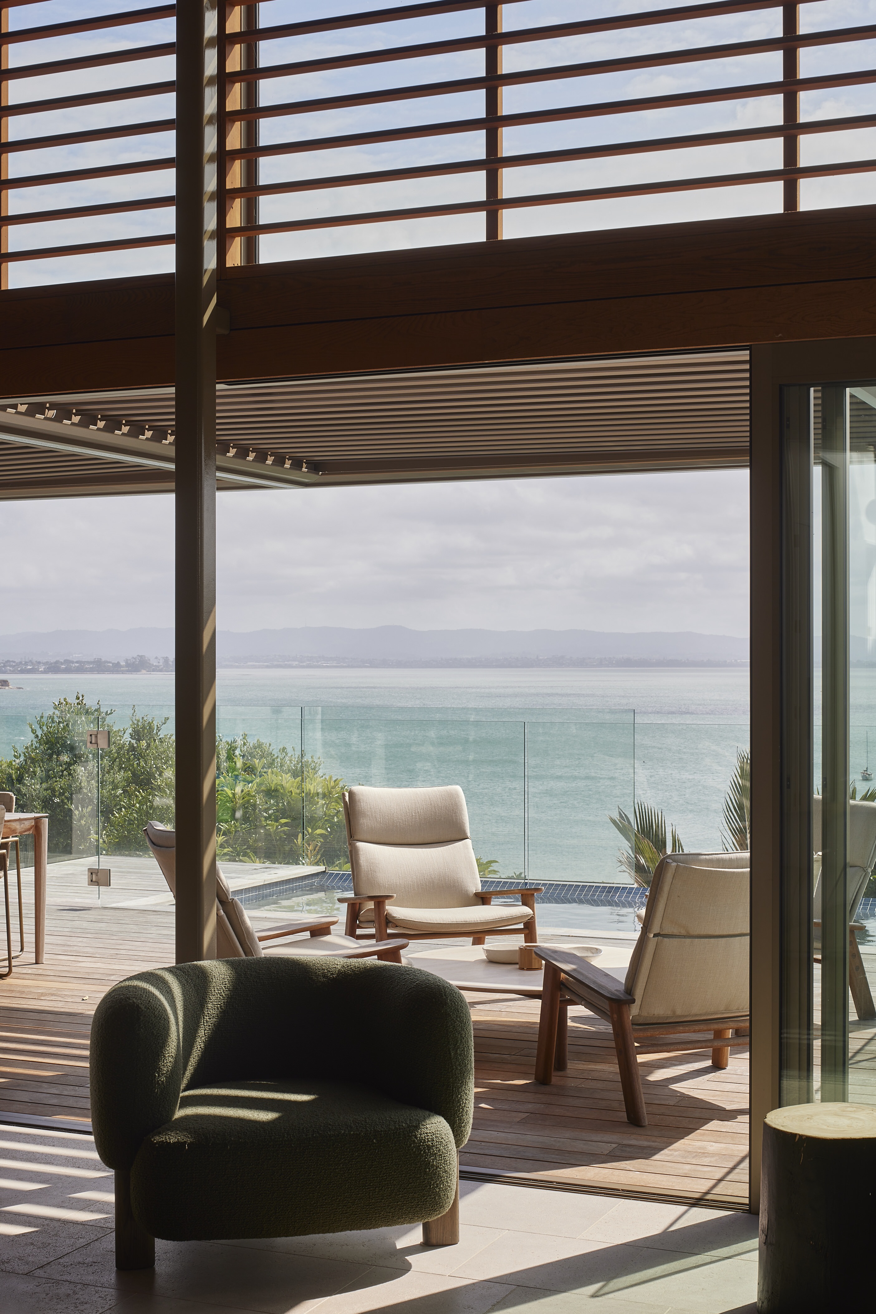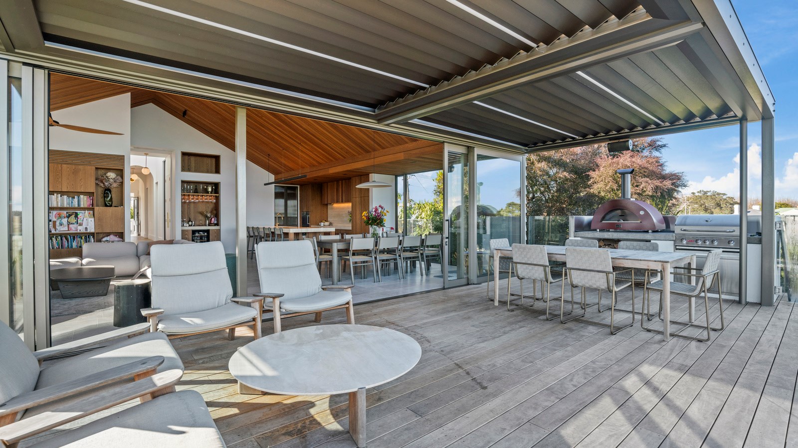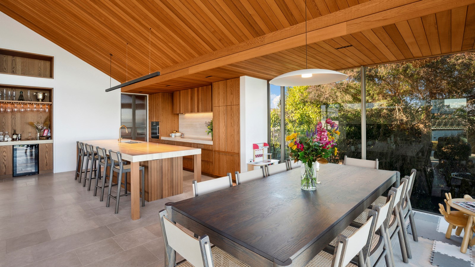 Heritage villa at the front, modern seaside retreat at the back. Expertly fused, they constitute something cohesive and special. This renovation and extension has enhanced the charm and elegance of the villa while crafting an addition with raked cedar ceilings and walls of glass that take in wide harbour views. The living spills onto a west-facing hardwood deck with barbecue for alfresco dining and relaxing. Below is a swimming pool. Talk about a luxury sanctuary in the suburbs. Inside, a milky palette provides continuity between old and new, and illuminated arches usher residents through to the sparkling new extension.