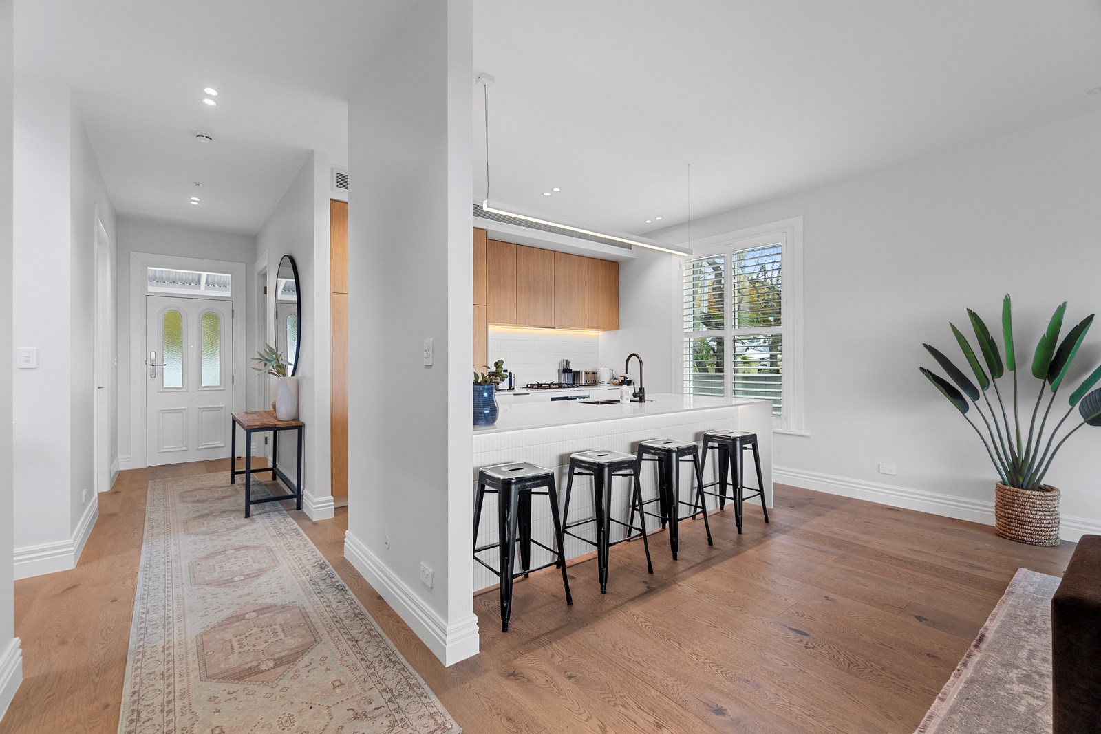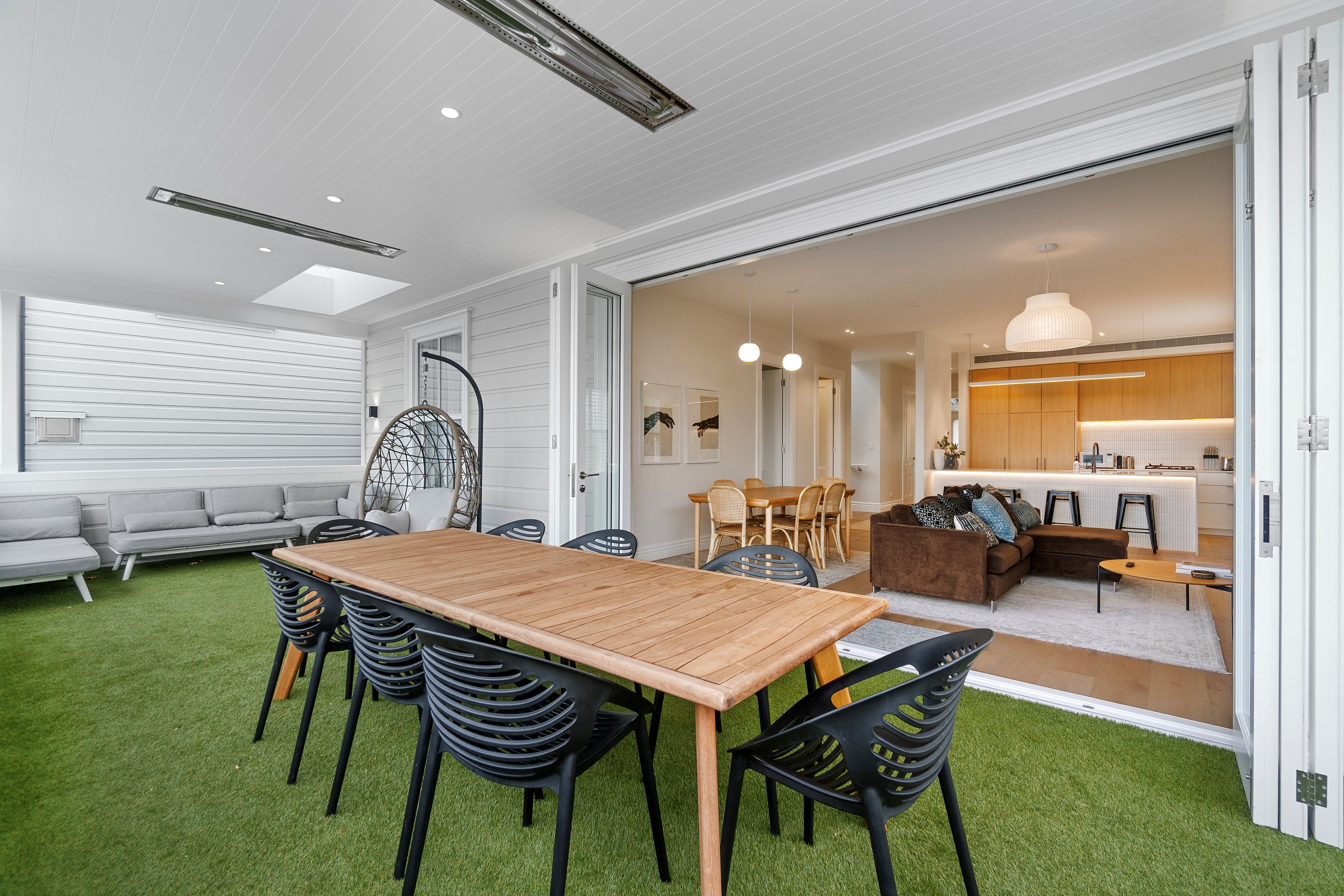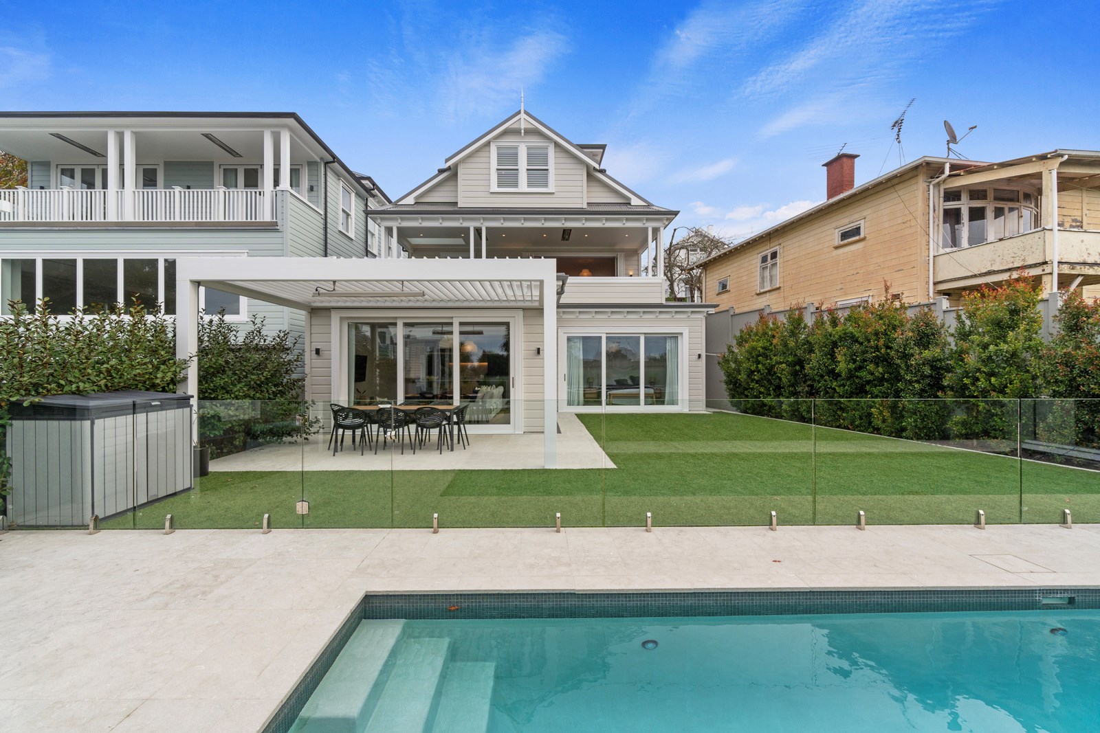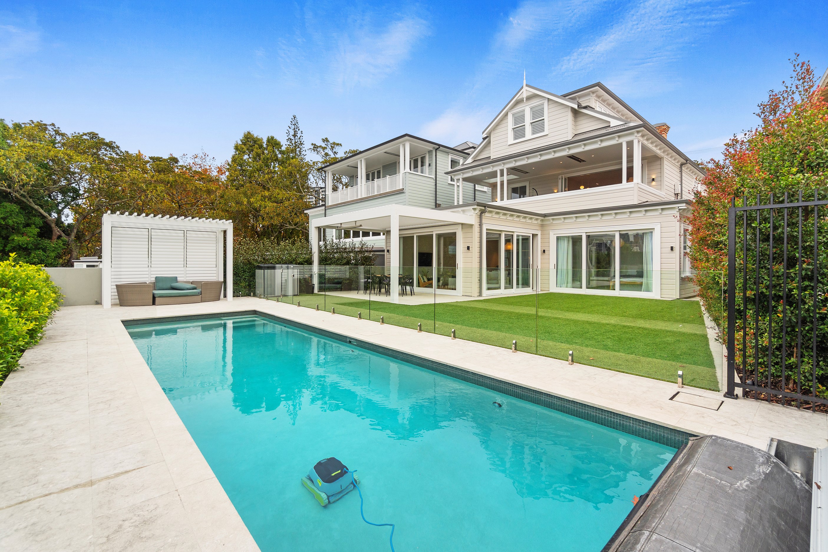 The rear of the property features an outdoor entertainment area with louvres from Aurae, a pergola with seating and a large 10m, fully heated and covered pool for the ultimate in any-weather get-togethers and lazy weekend afternoons. The large, flat lawn provides even more room for growing families to move. Fabulous French doors, light and airy spaces and a very modern designer kitchen contribute to its luxurious ambience. This modern take on colonial elegance will provide a spacious retreat for generations to come – as will its equally charming sister property next door.