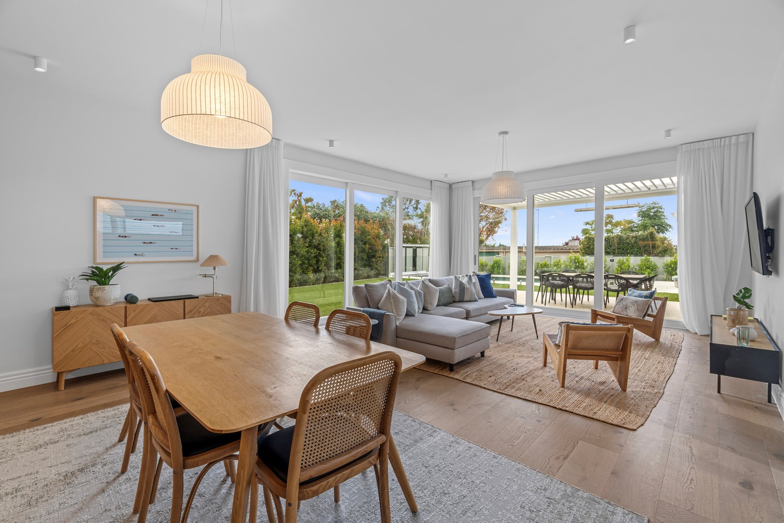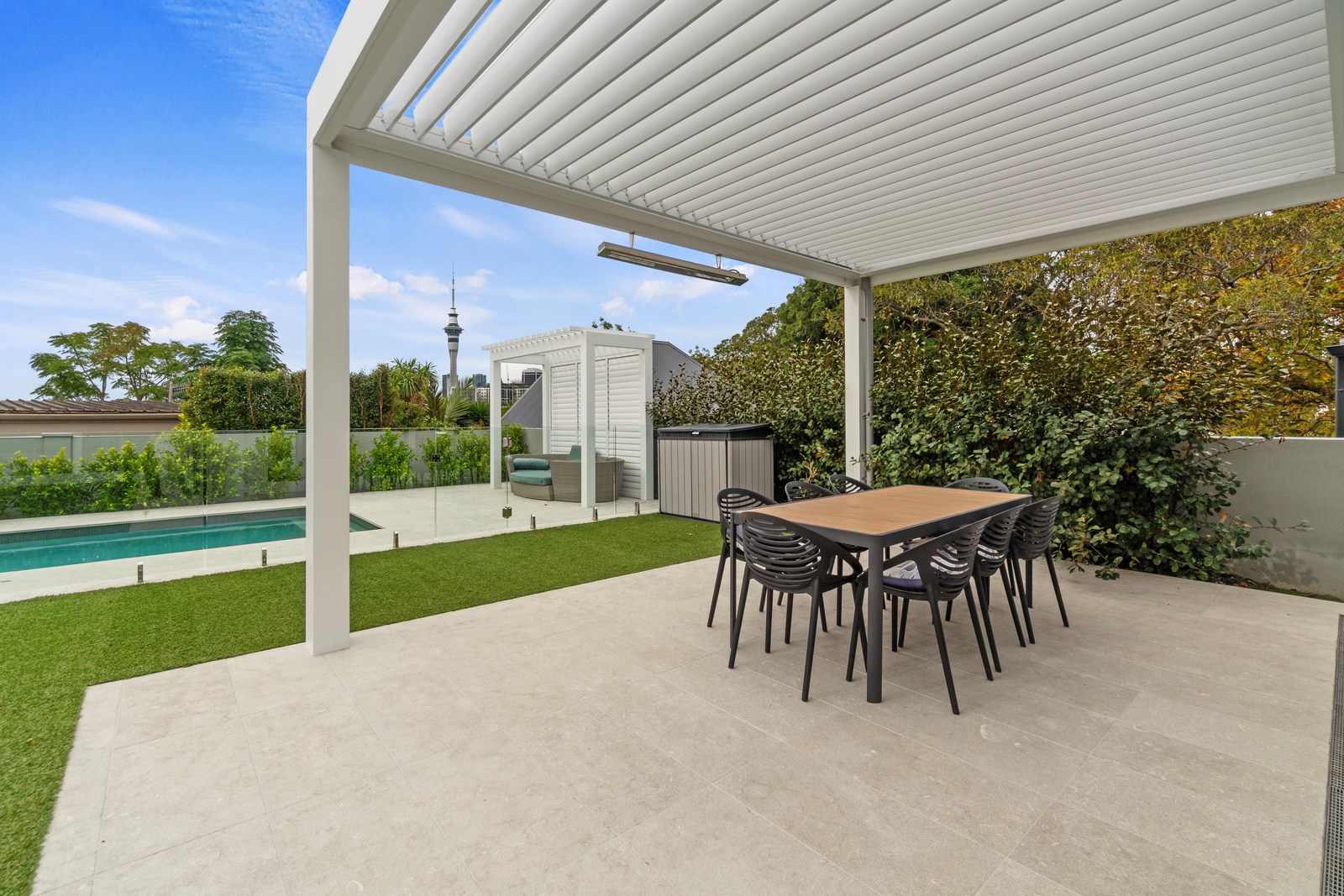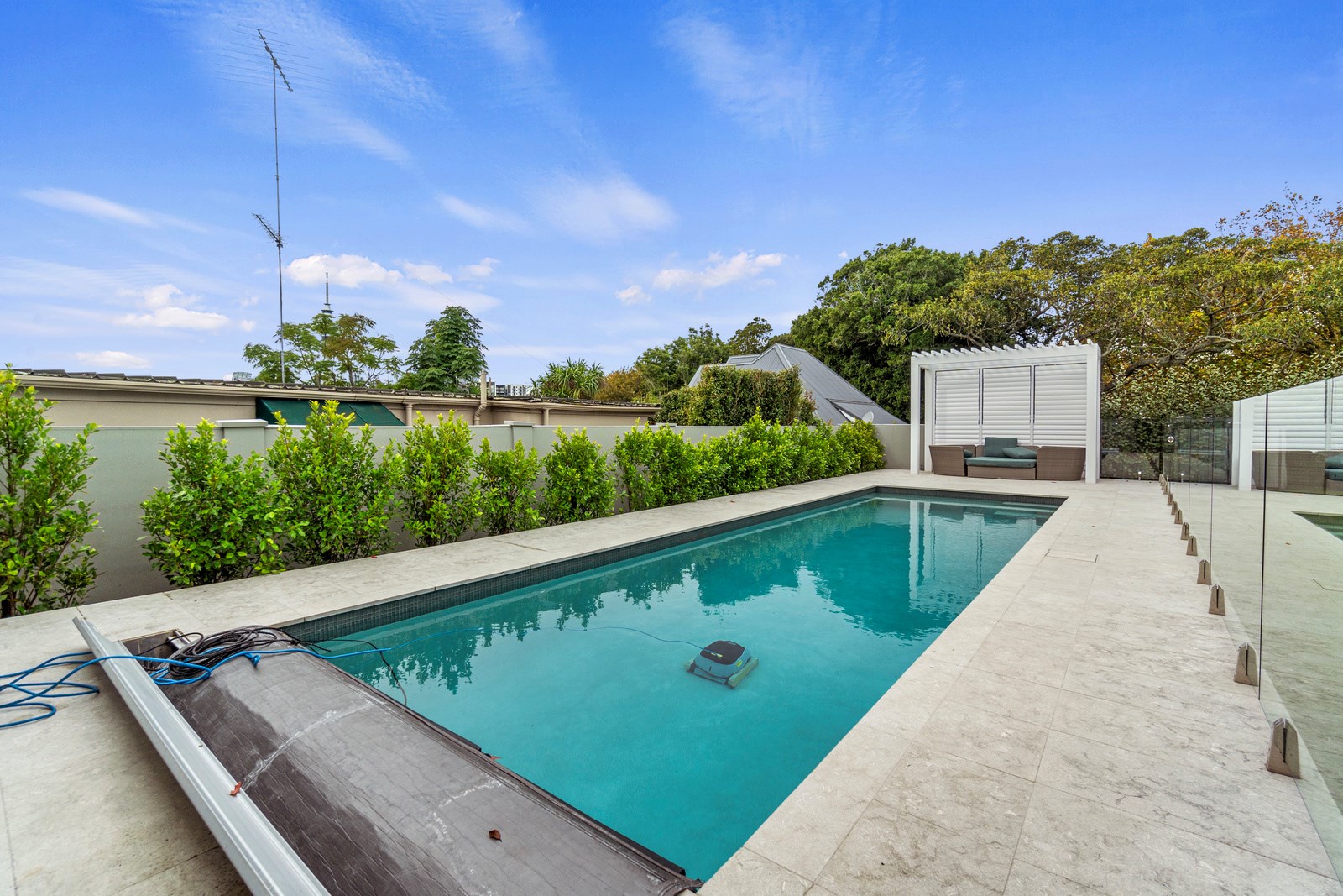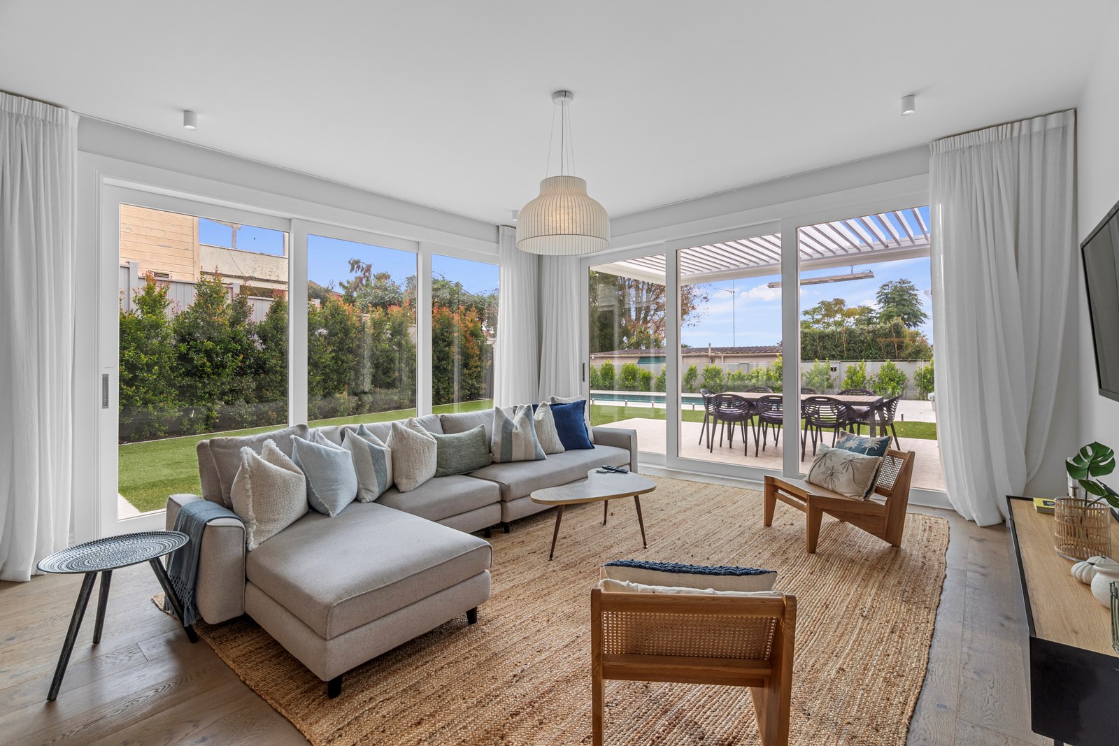 The rear of the property features an outdoor entertainment area with louvres from Aurae, a pergola with seating and a large 10m, fully heated and covered pool for the ultimate in any-weather get-togethers and lazy weekend afternoons. The large, flat lawn provides even more room for growing families to move. Fabulous French doors, light and airy spaces and a very modern designer kitchen contribute to its luxurious ambience. This modern take on colonial elegance will provide a spacious retreat for generations to come – as will its equally charming sister property next door.