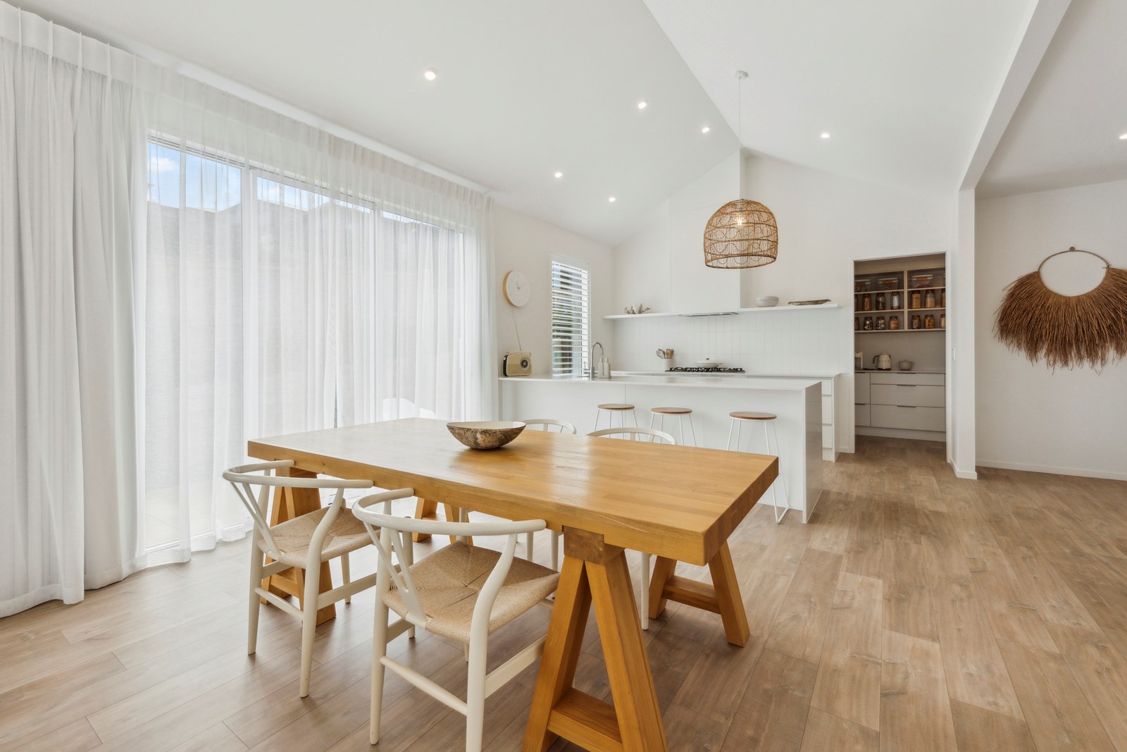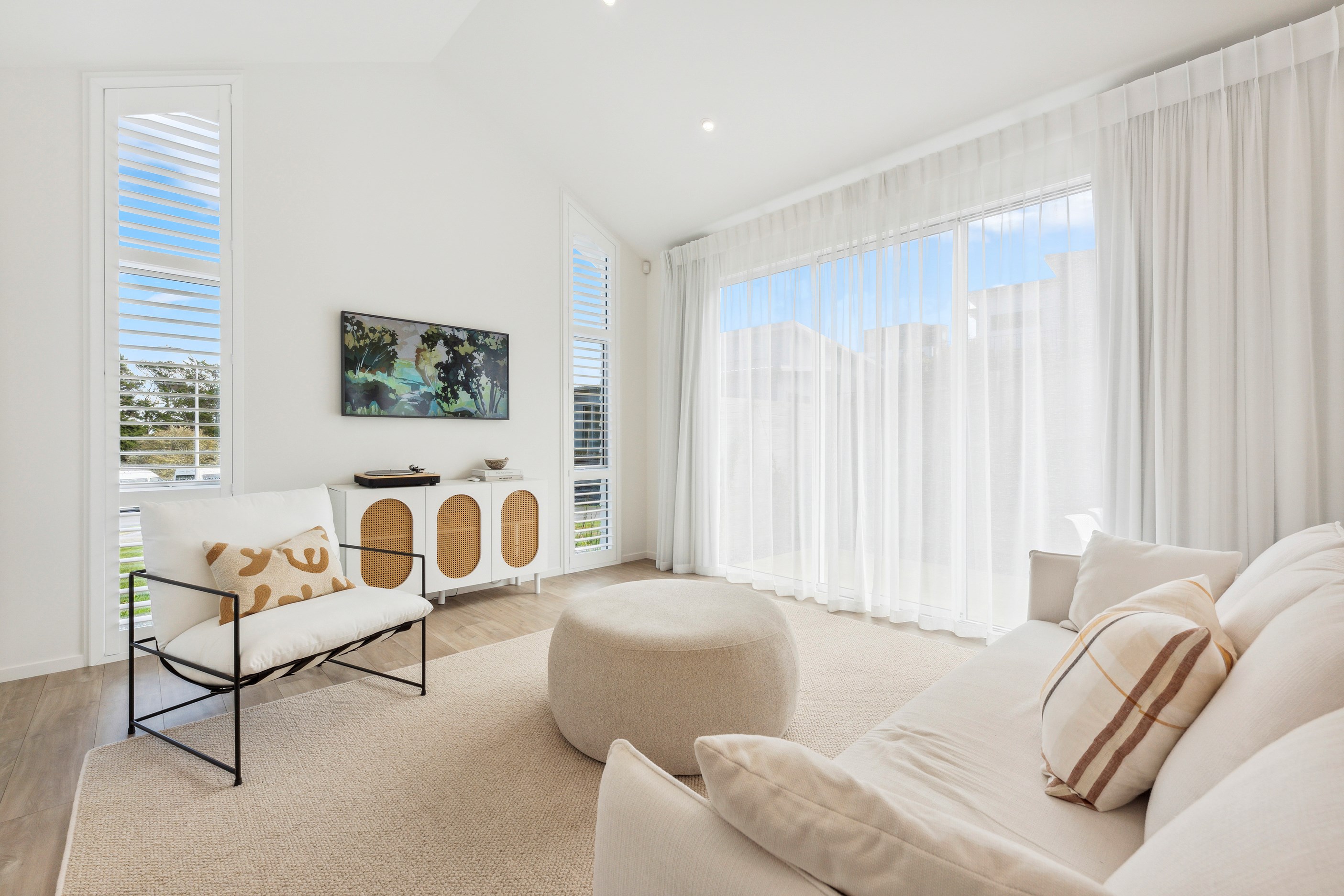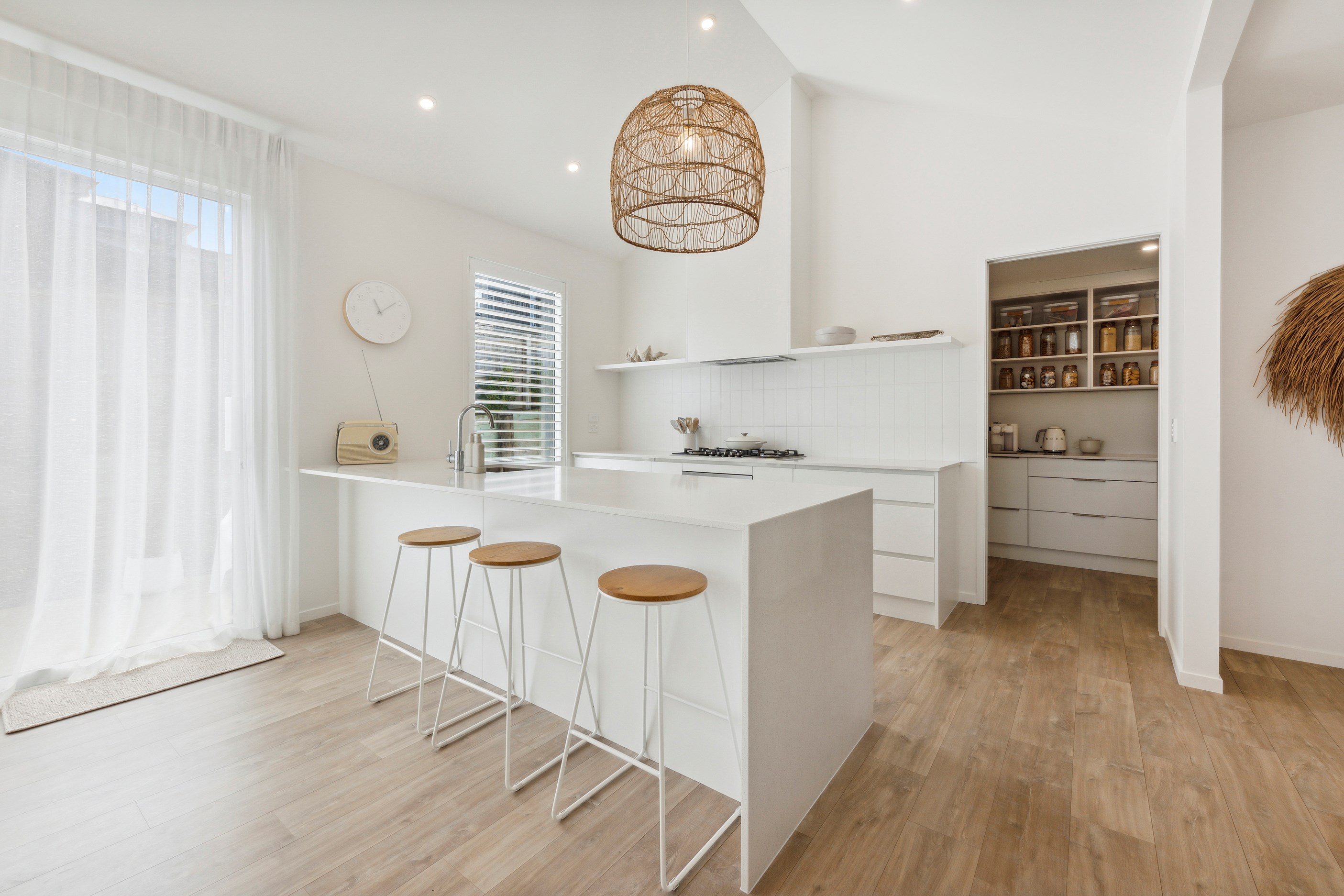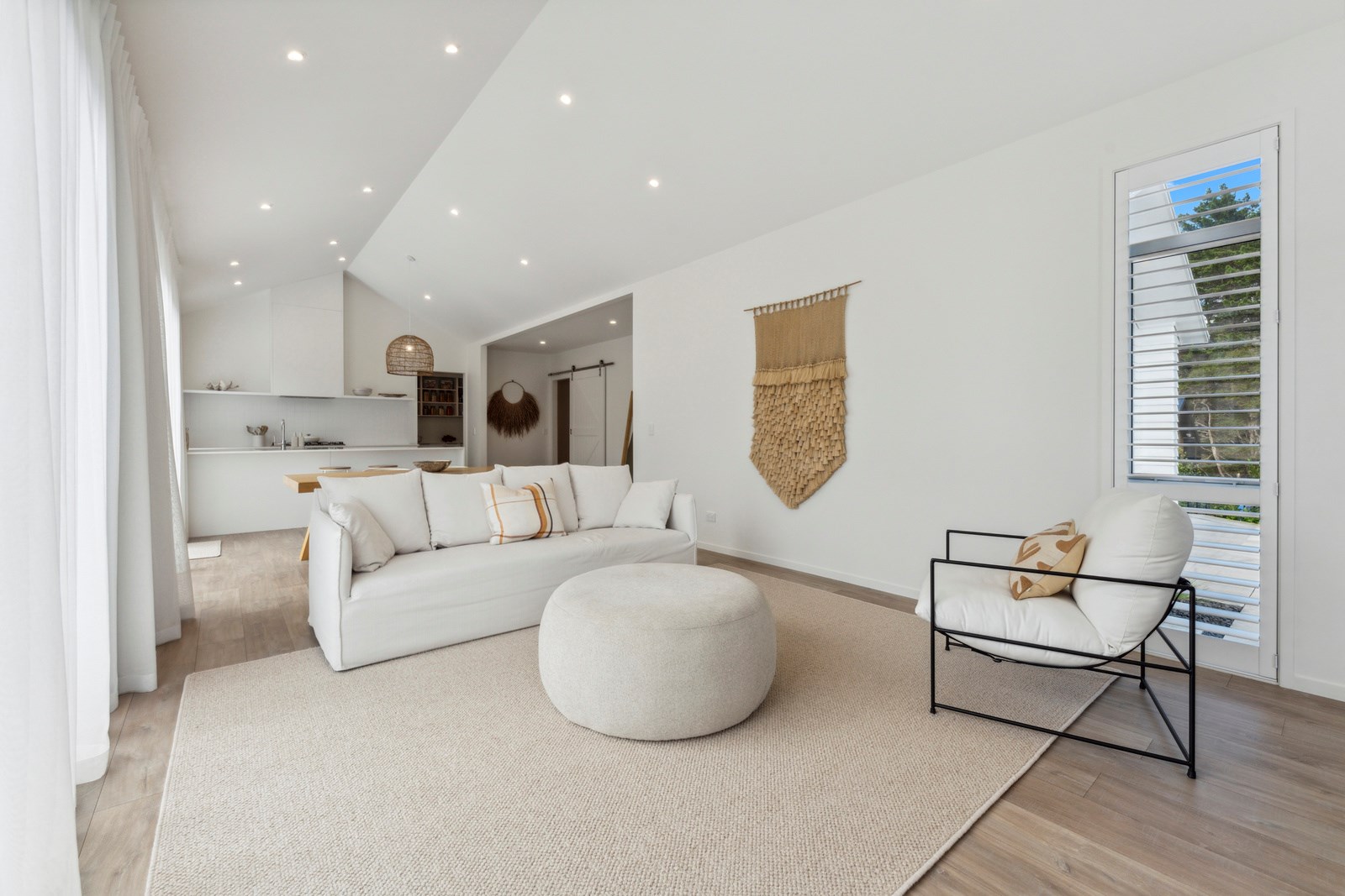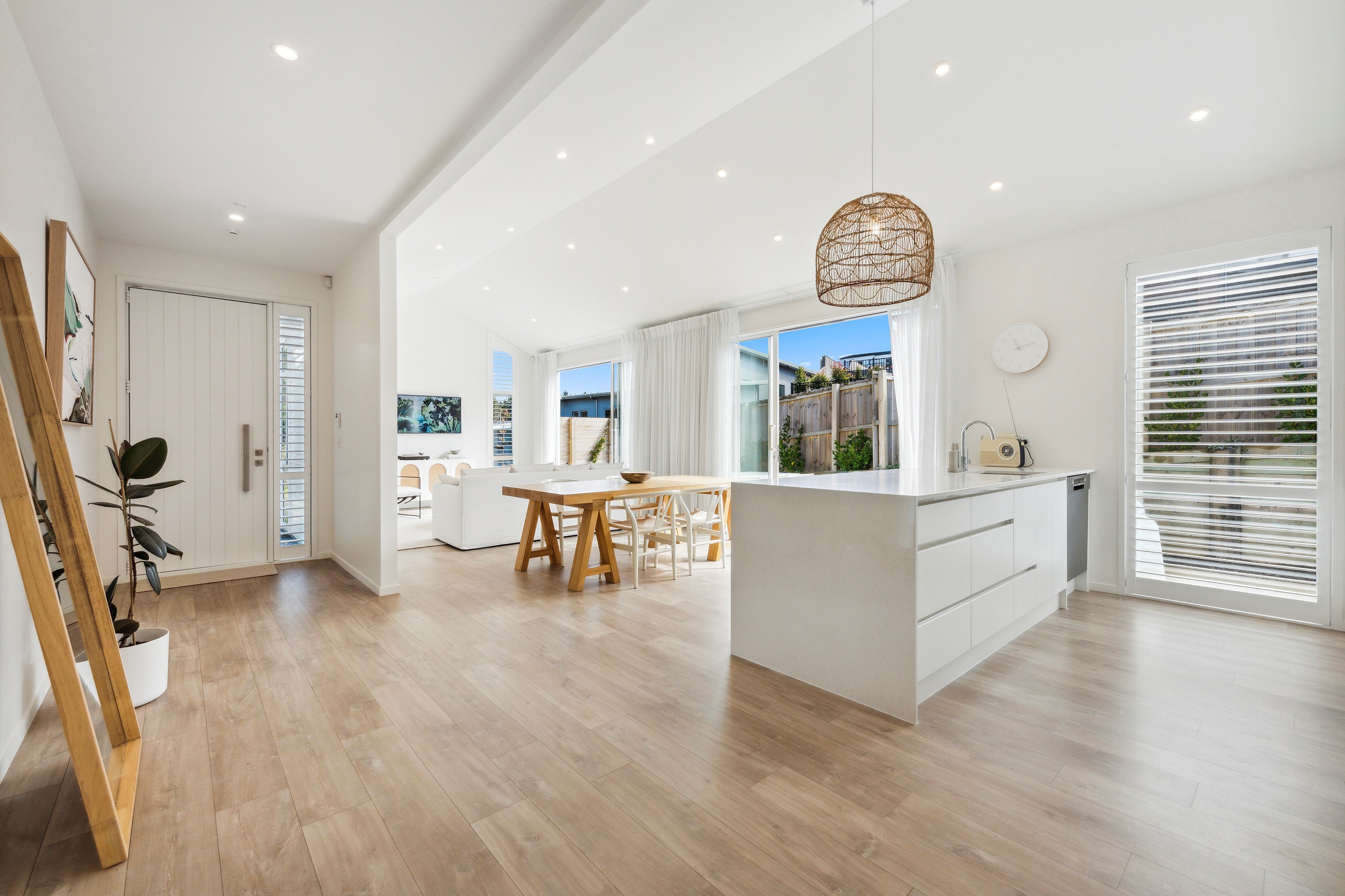 The very tight budget was paramount in the creation of this family home in East Auckland’s Maraetai. Working backwards, cost considerations had to be given to extensive earthworks, retaining walls, water tanks and specific plumbing and drainage requirements prior to any thought of how the house would look and feel. When it came to design, the brief was simple – three bedrooms, an office and open-plan living in a modern, maintenance-free house with lots of light. Palisade weatherboards and longrun roofing were chosen to embrace the conditions of the Pōhutukawa Coast location and provide clean lines. Full-height angled windows to the front facade provide balance between the house’s modern and classic characteristics. That balance is also evident in the kitchen, dining and lounge areas via the raised and raking ceilings and shuttered windows. Havanna Oak flooring continues through the barn-style door to a powder room, three bedrooms, two bathrooms, an office and internal garage.