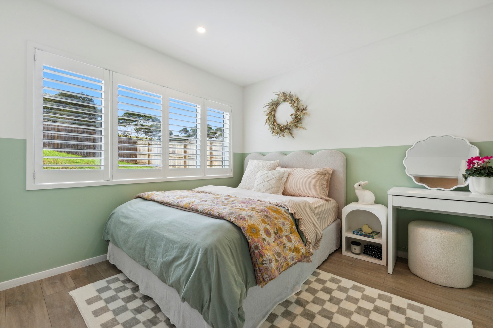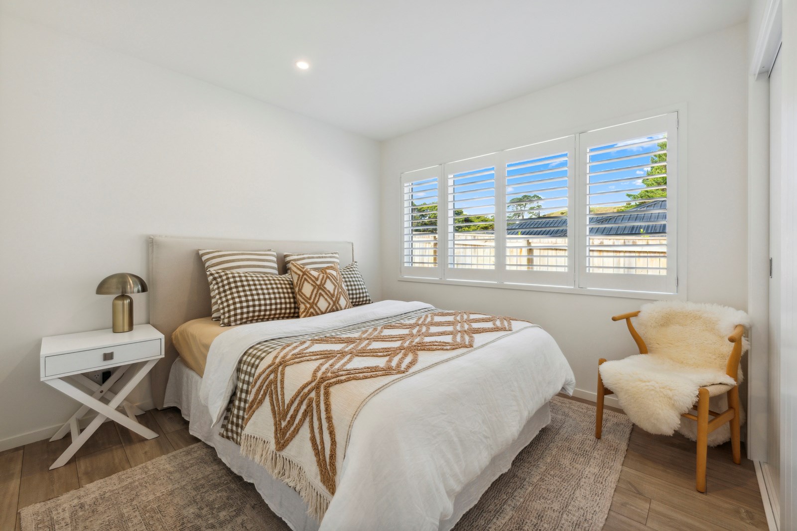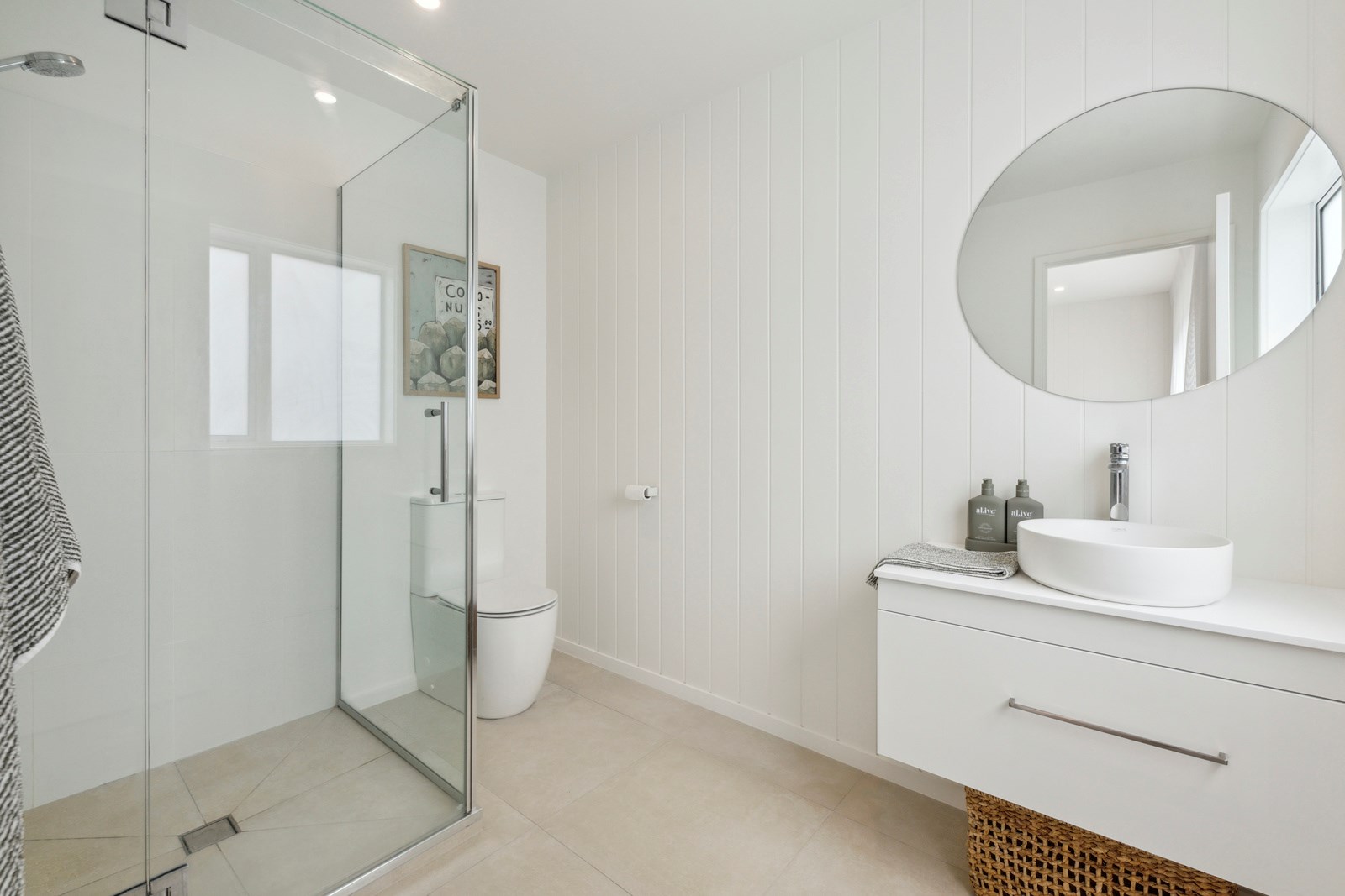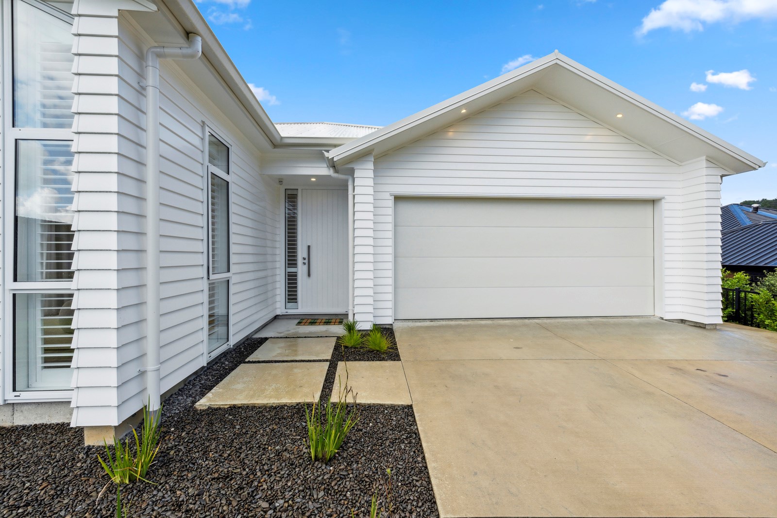 The very tight budget was paramount in the creation of this family home in East Auckland’s Maraetai. Working backwards, cost considerations had to be given to extensive earthworks, retaining walls, water tanks and specific plumbing and drainage requirements prior to any thought of how the house would look and feel. When it came to design, the brief was simple – three bedrooms, an office and open-plan living in a modern, maintenance-free house with lots of light. Palisade weatherboards and longrun roofing were chosen to embrace the conditions of the Pōhutukawa Coast location and provide clean lines. Full-height angled windows to the front facade provide balance between the house’s modern and classic characteristics. That balance is also evident in the kitchen, dining and lounge areas via the raised and raking ceilings and shuttered windows. Havanna Oak flooring continues through the barn-style door to a powder room, three bedrooms, two bathrooms, an office and internal garage.
